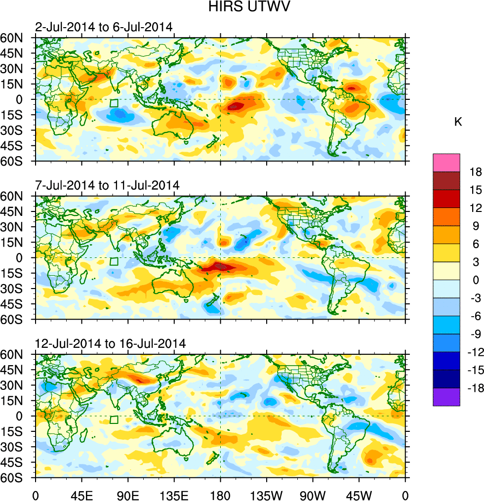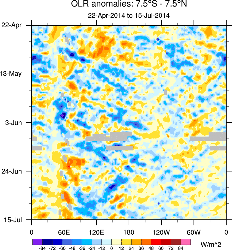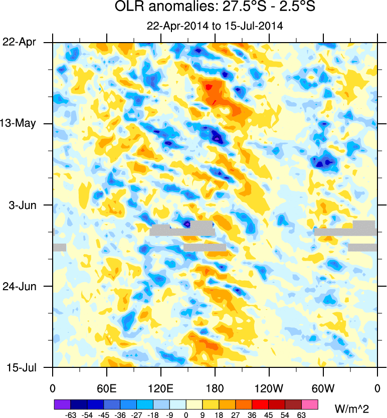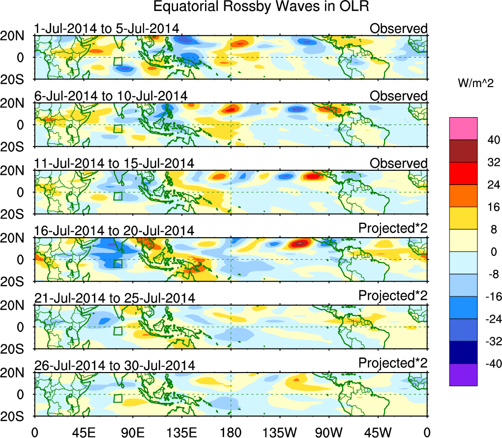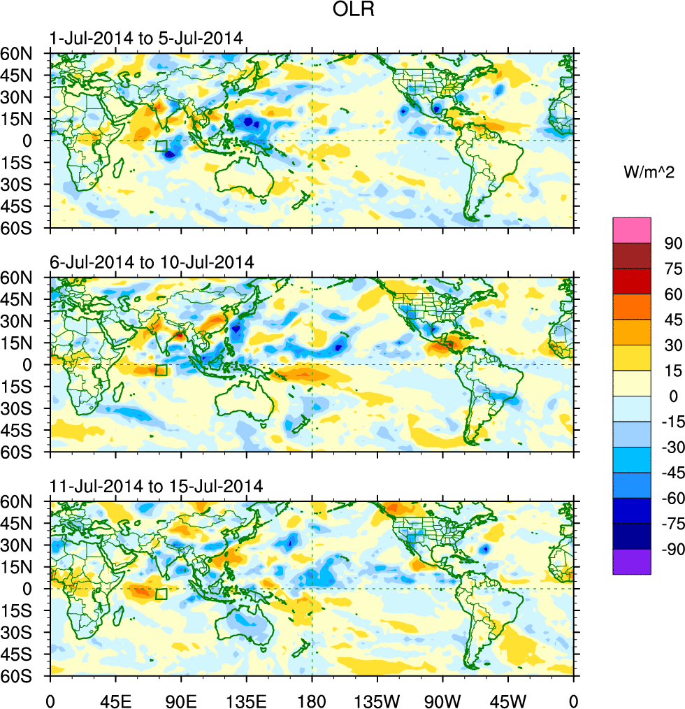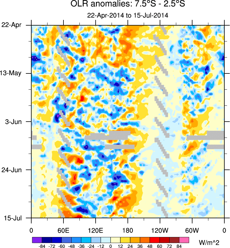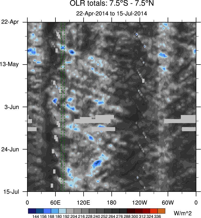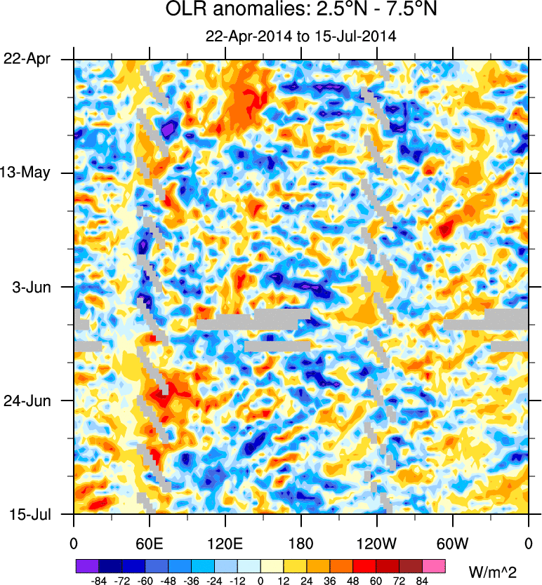 To identify tropical waves in near real-time, the OLR and UTWV data are filtered following Wheeler & Weickmann (2001 MWR). The daily anomalies are calculated using the first 3 harmonics of the seasonal cycle for 1979–2009. Missing values are then filled using linear interpolation in space and time. The most recent 365 days of anomalies are padded with 659 days of zeroes, and the result is filtered for each wave type.