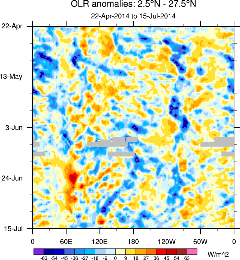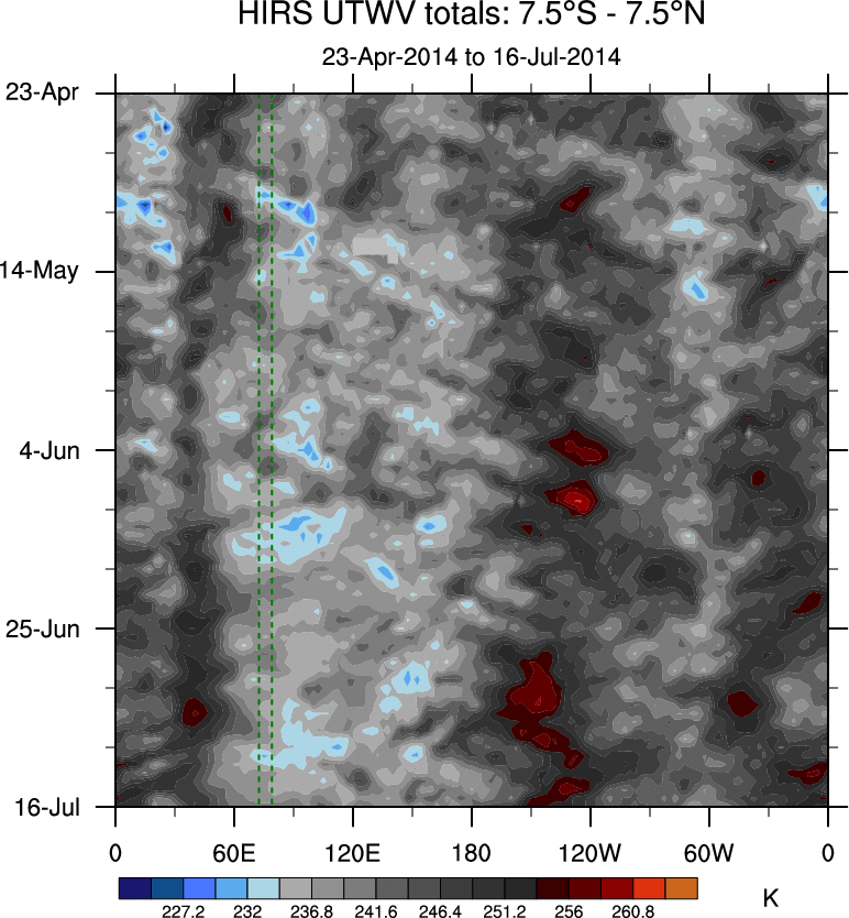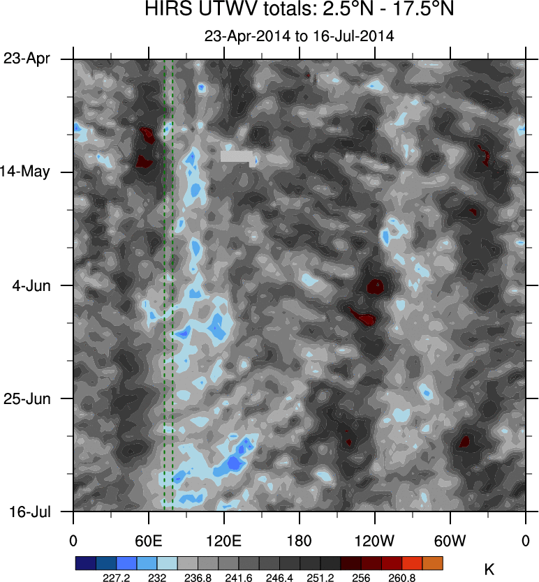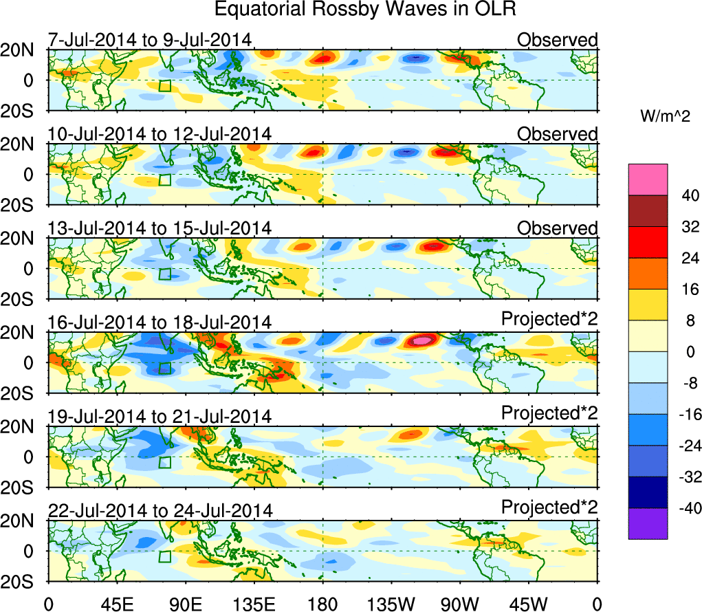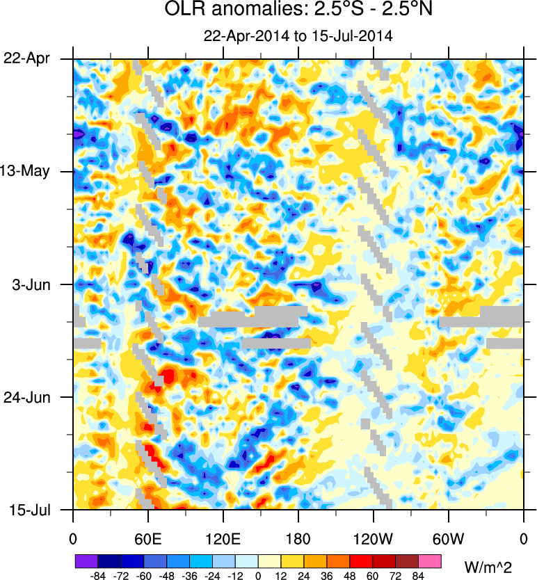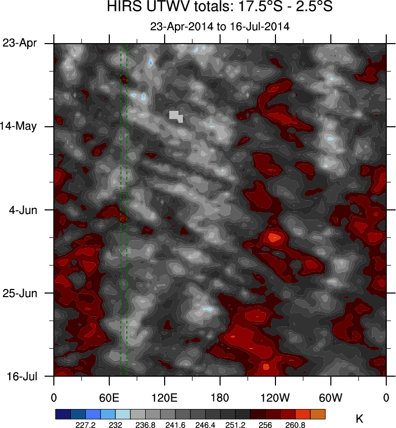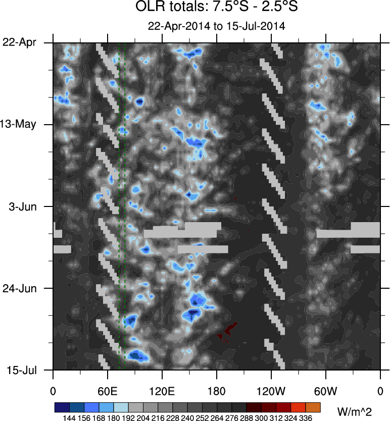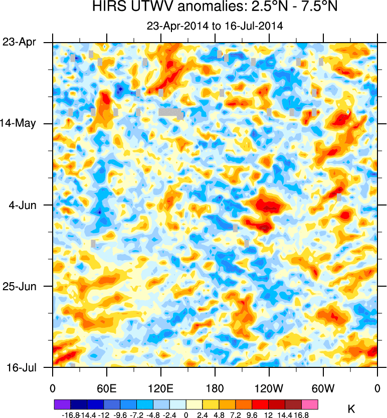 To identify tropical waves in near real-time, the OLR and UTWV data are filtered following Wheeler & Weickmann (2001 MWR). The daily anomalies are calculated using the first 3 harmonics of the seasonal cycle for 1979–2009. Missing values are then filled using linear interpolation in space and time. The most recent 365 days of anomalies are padded with 659 days of zeroes, and the result is filtered for each wave type.