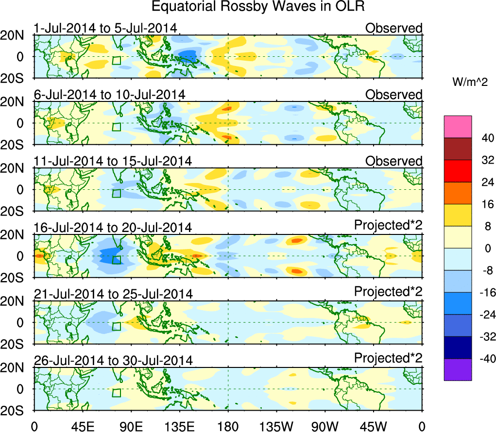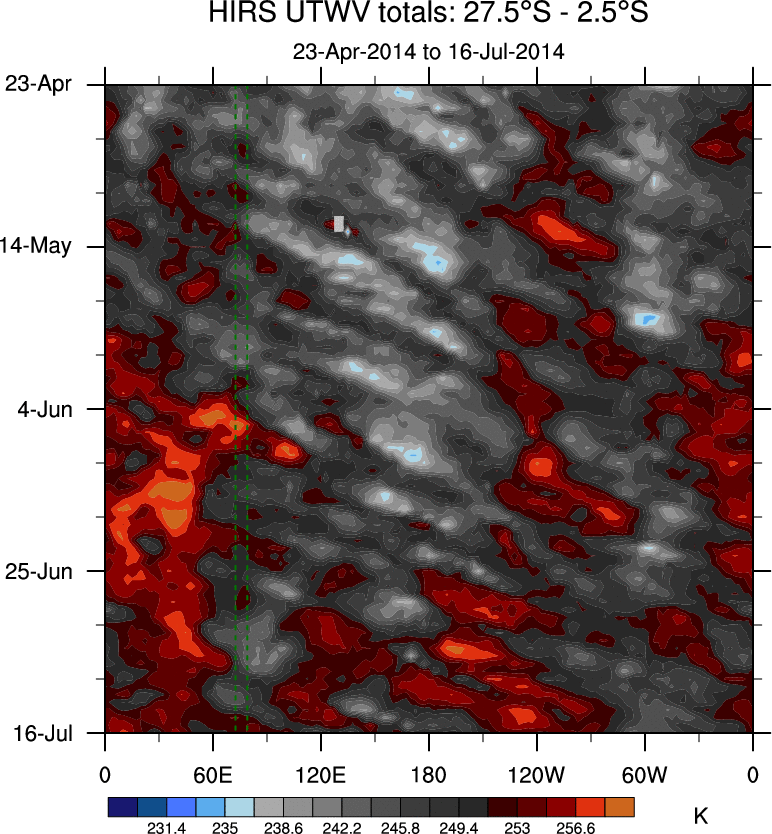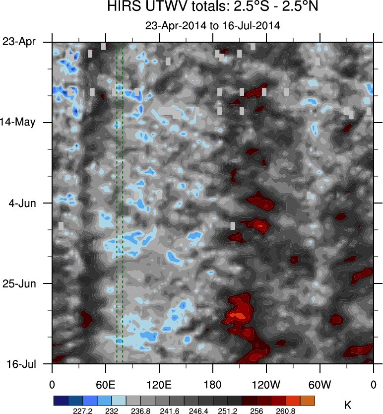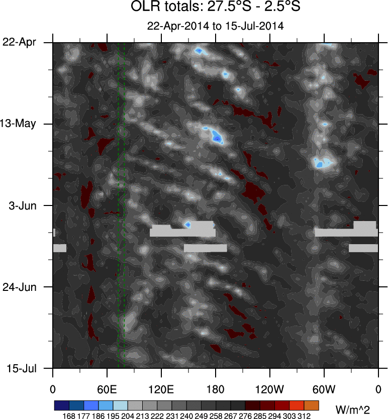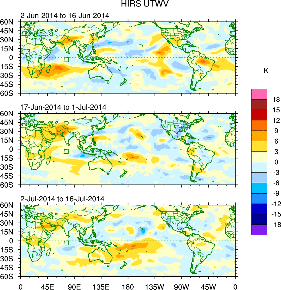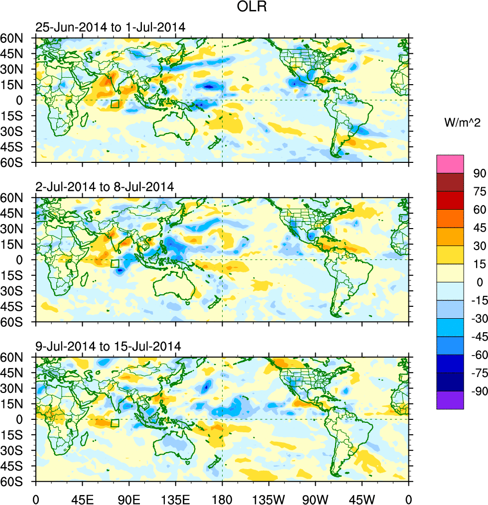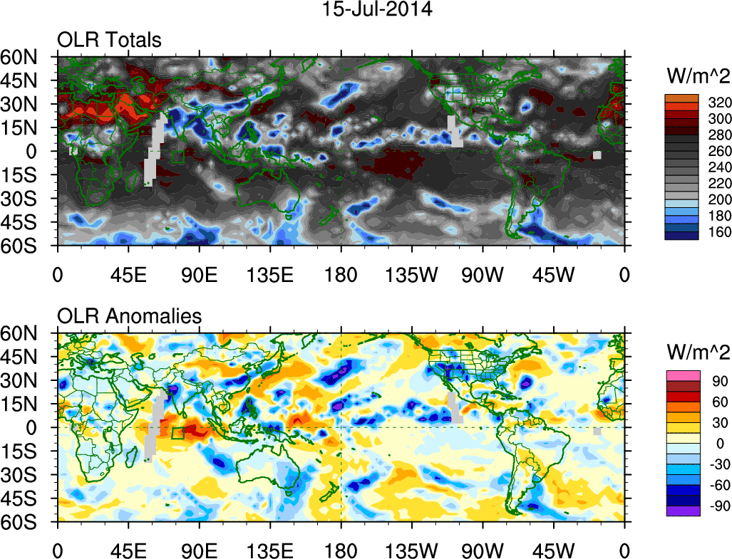 To identify tropical waves in near real-time, the OLR and UTWV data are filtered following Wheeler & Weickmann (2001 MWR). The daily anomalies are calculated using the first 3 harmonics of the seasonal cycle for 1979–2009. Missing values are then filled using linear interpolation in space and time. The most recent 365 days of anomalies are padded with 659 days of zeroes, and the result is filtered for each wave type.