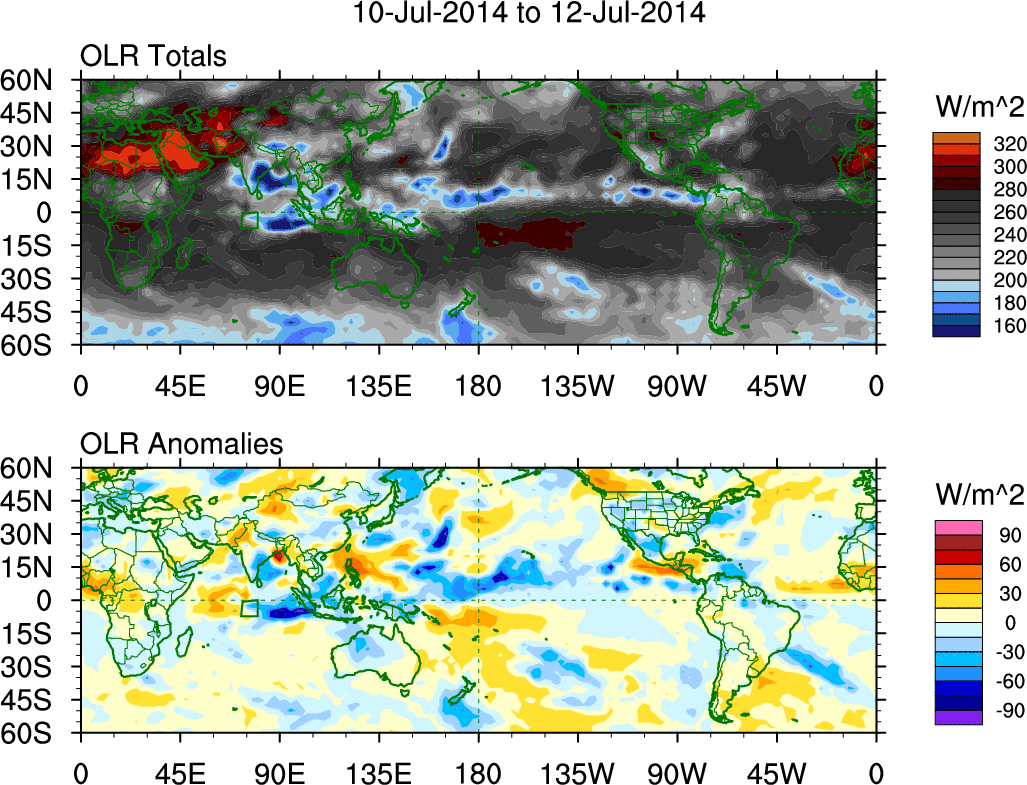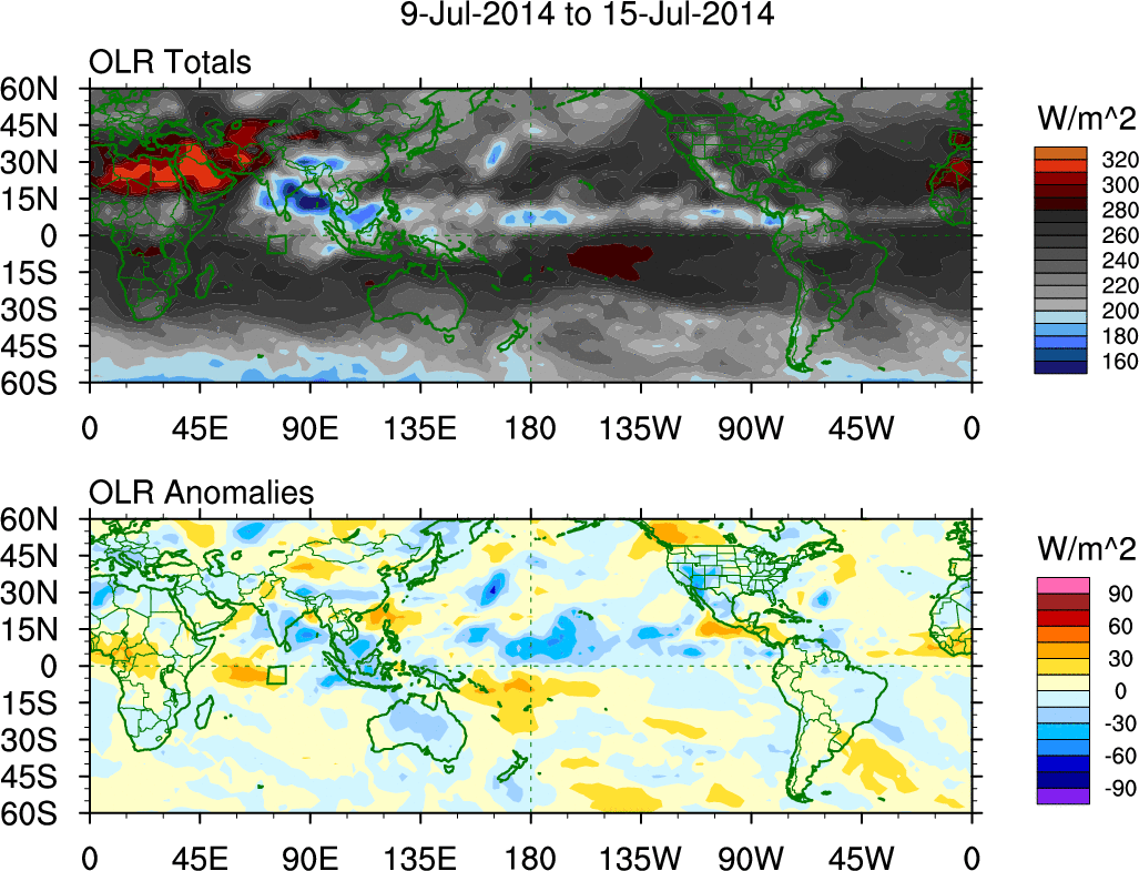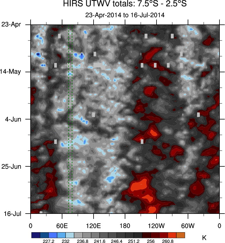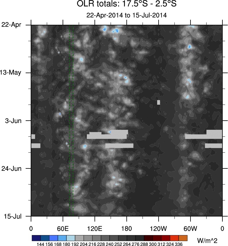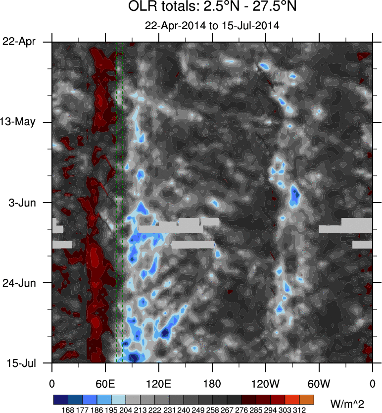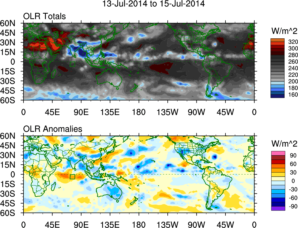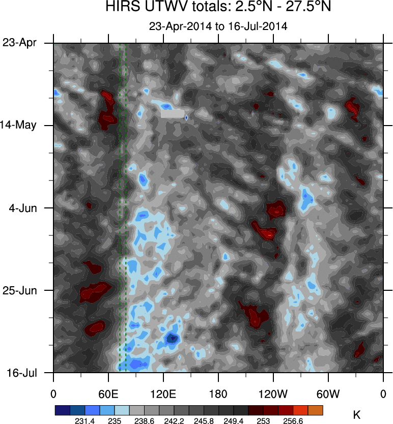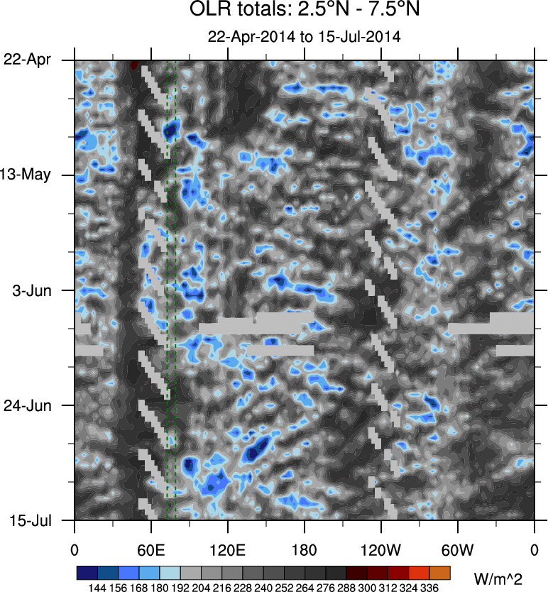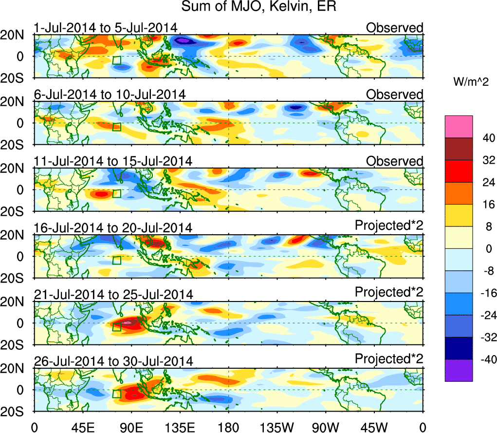 To identify tropical waves in near real-time, the OLR and UTWV data are filtered following Wheeler & Weickmann (2001 MWR). The daily anomalies are calculated using the first 3 harmonics of the seasonal cycle for 1979–2009. Missing values are then filled using linear interpolation in space and time. The most recent 365 days of anomalies are padded with 659 days of zeroes, and the result is filtered for each wave type.