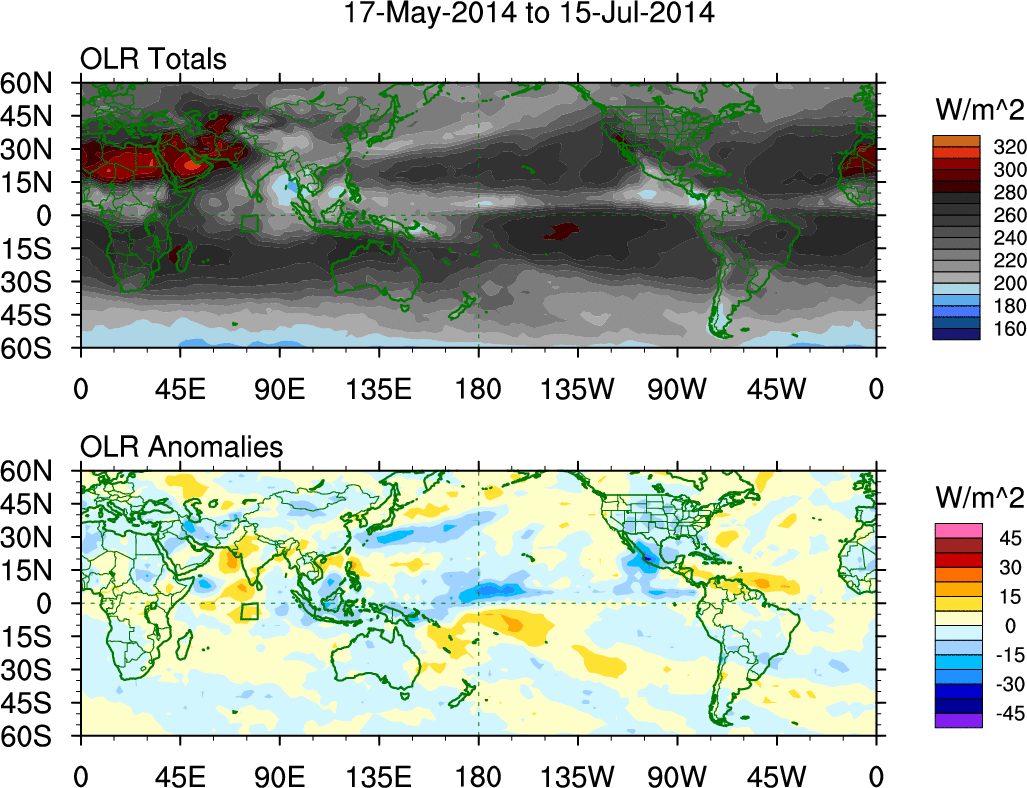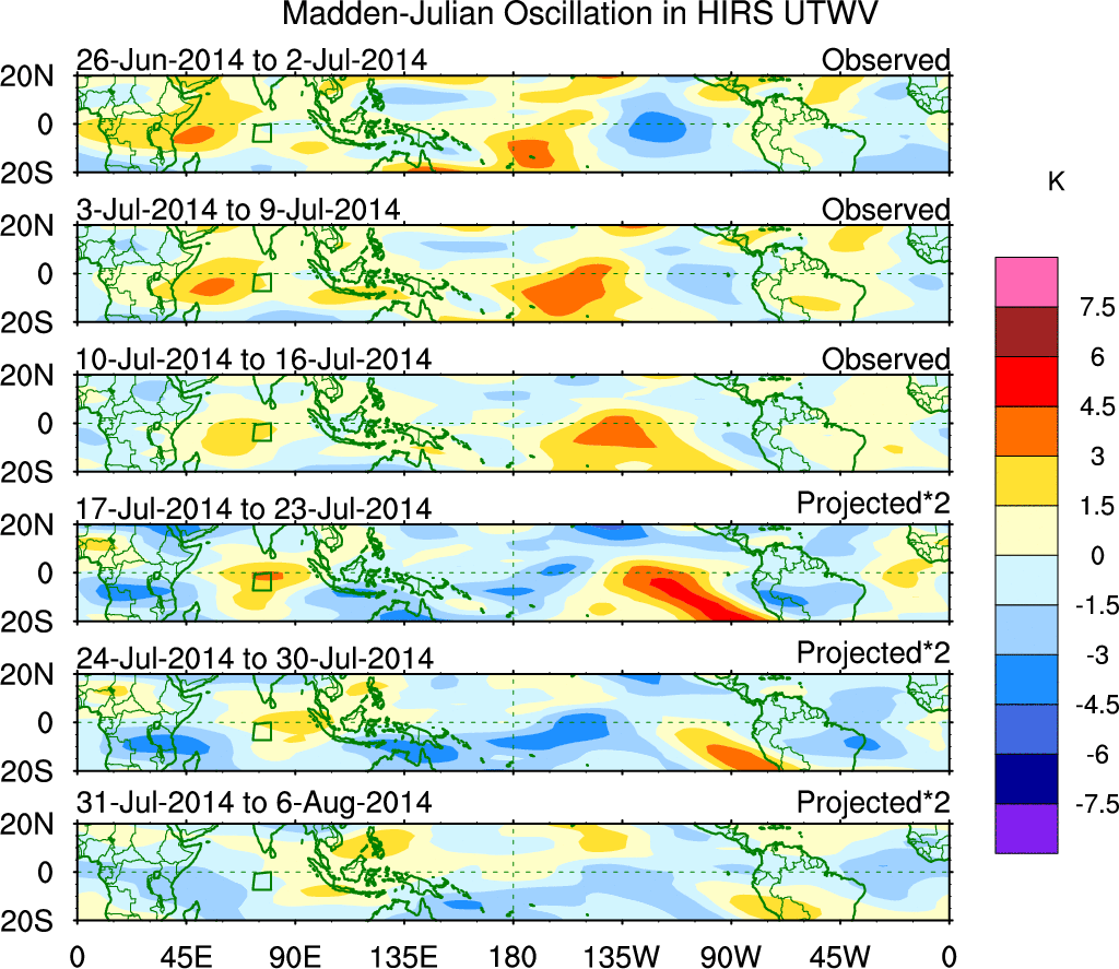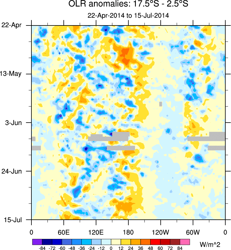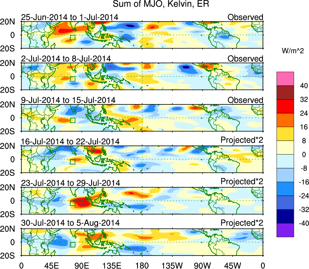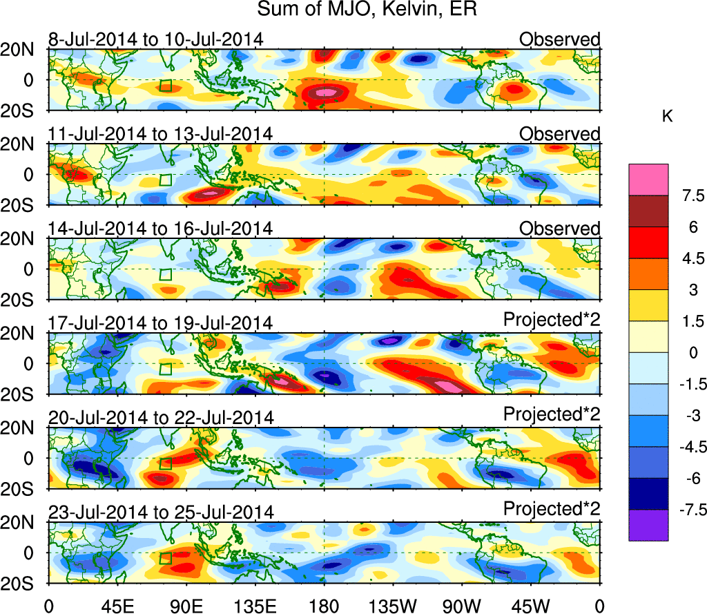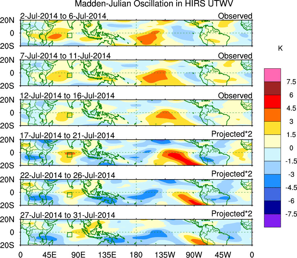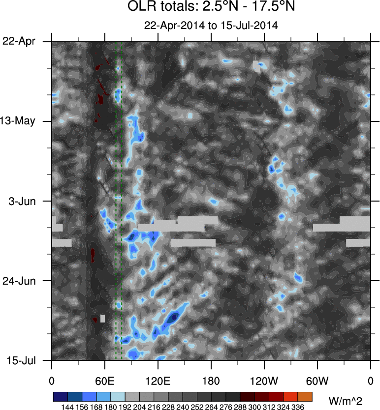 To identify tropical waves in near real-time, the OLR and UTWV data are filtered following Wheeler & Weickmann (2001 MWR). The daily anomalies are calculated using the first 3 harmonics of the seasonal cycle for 1979–2009. Missing values are then filled using linear interpolation in space and time. The most recent 365 days of anomalies are padded with 659 days of zeroes, and the result is filtered for each wave type.