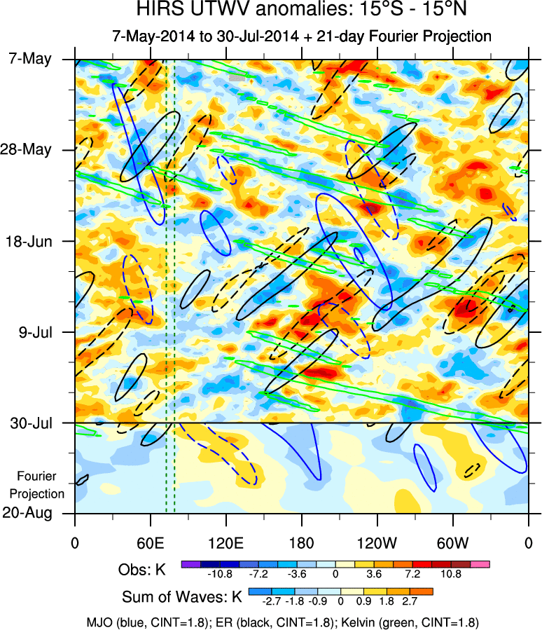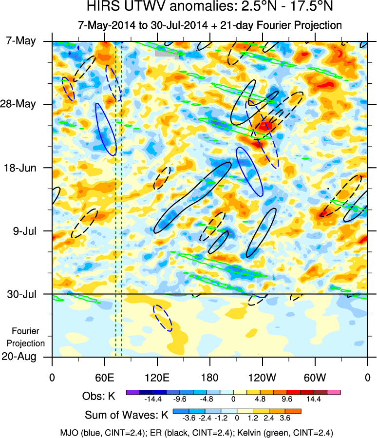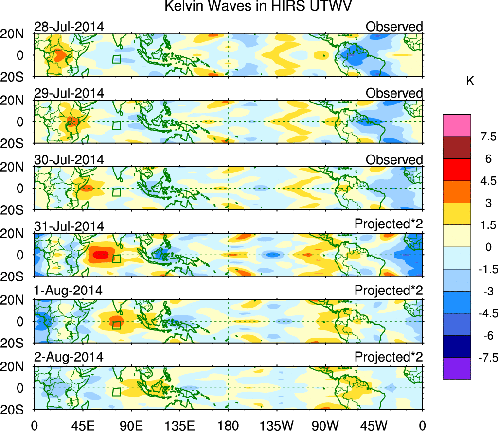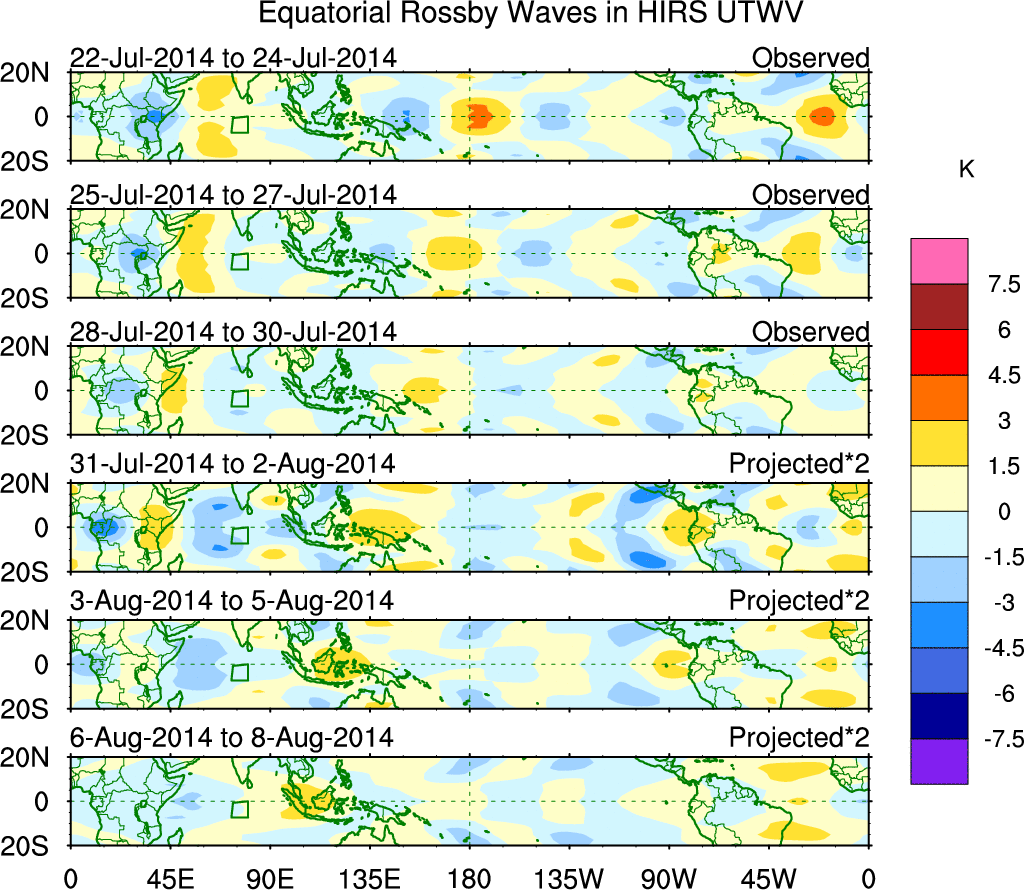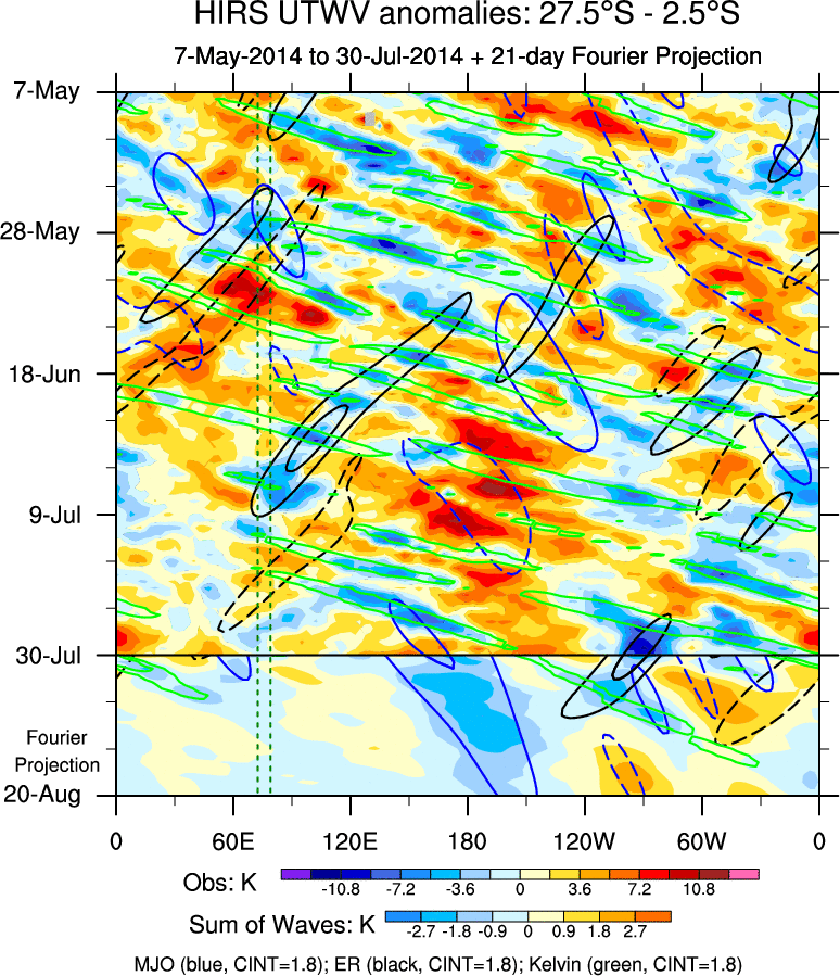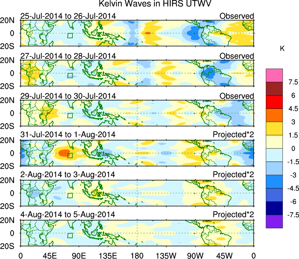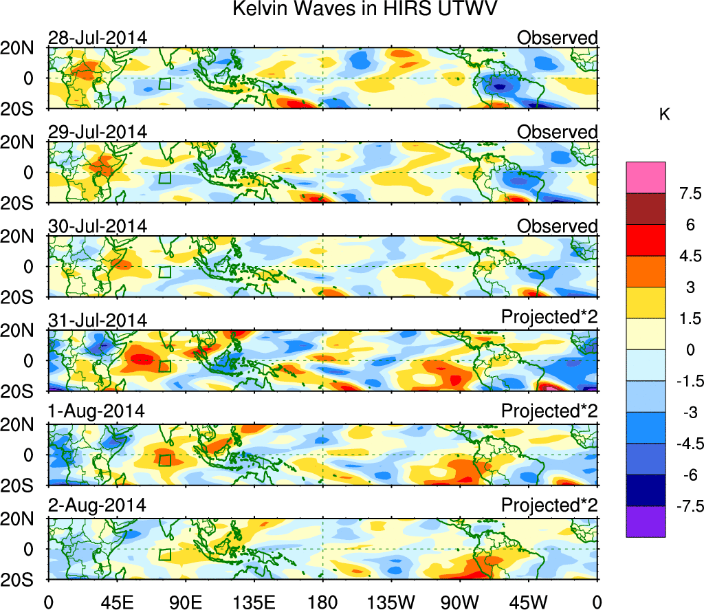 To identify tropical waves in near real-time, the OLR and UTWV data are filtered following Wheeler & Weickmann (2001 MWR). The daily anomalies are calculated using the first 3 harmonics of the seasonal cycle for 1979–2009. Missing values are then filled using linear interpolation in space and time. The most recent 365 days of anomalies are padded with 659 days of zeroes, and the result is filtered for each wave type.