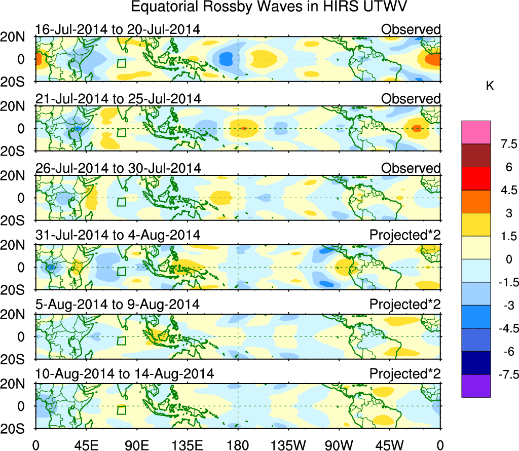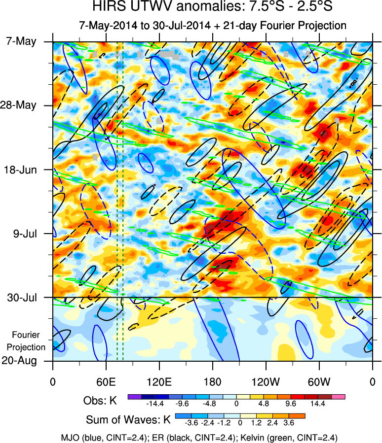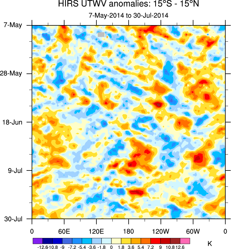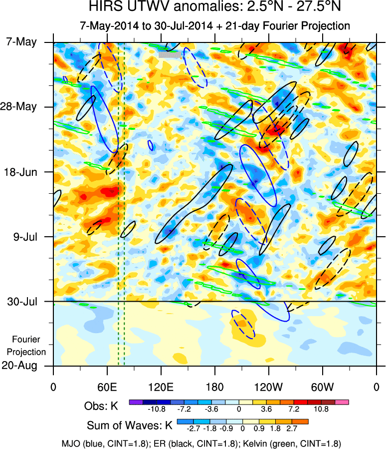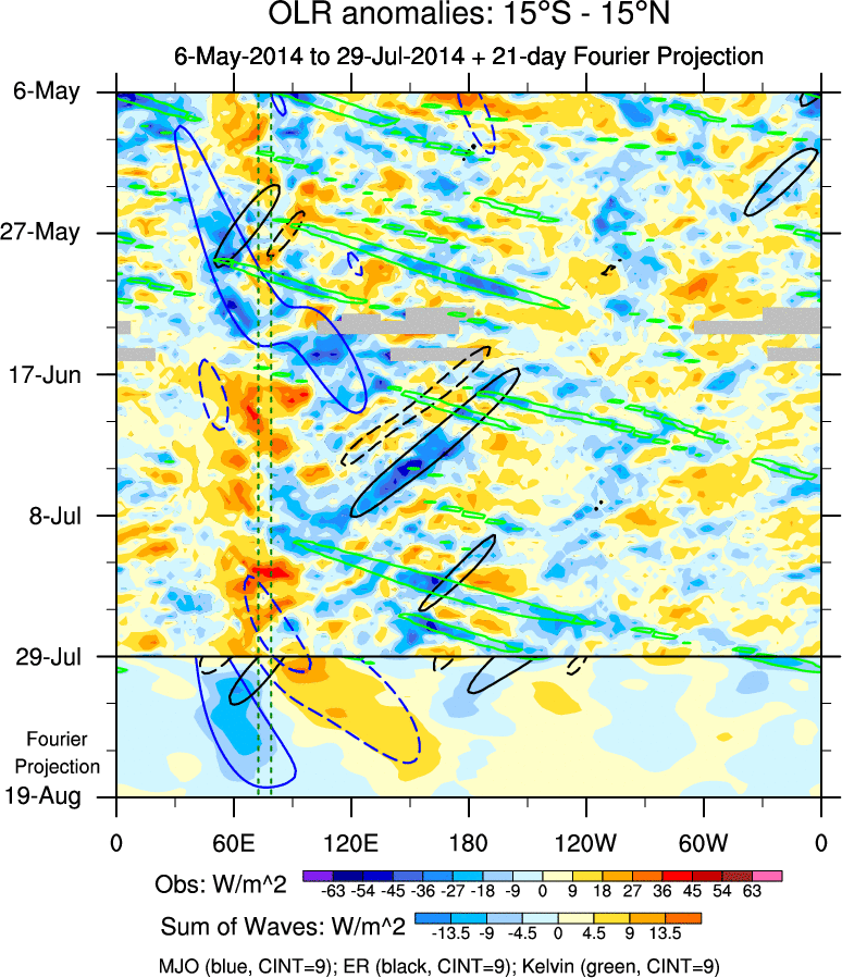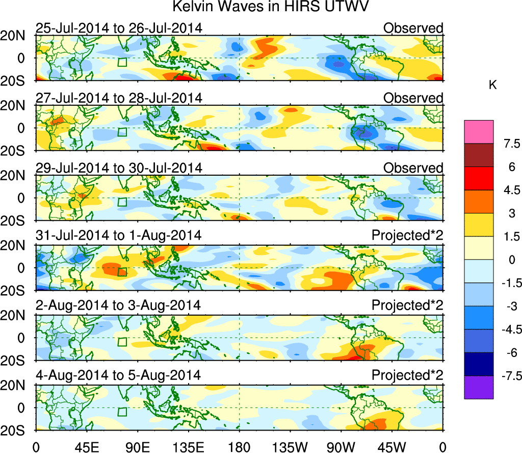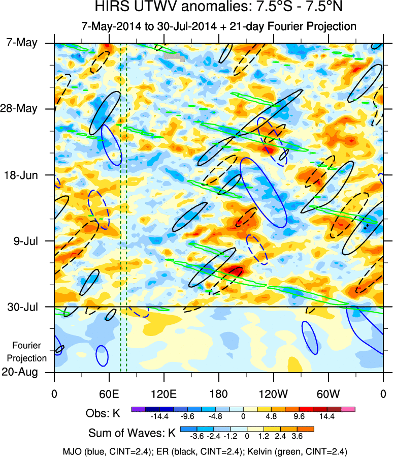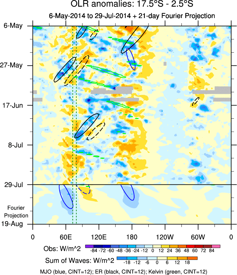 To identify tropical waves in near real-time, the OLR and UTWV data are filtered following Wheeler & Weickmann (2001 MWR). The daily anomalies are calculated using the first 3 harmonics of the seasonal cycle for 1979–2009. Missing values are then filled using linear interpolation in space and time. The most recent 365 days of anomalies are padded with 659 days of zeroes, and the result is filtered for each wave type.
