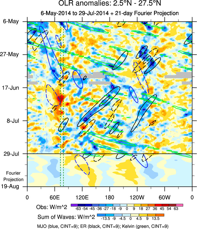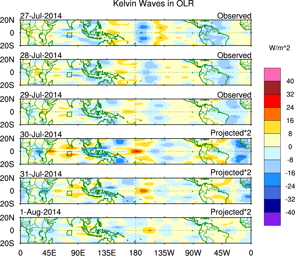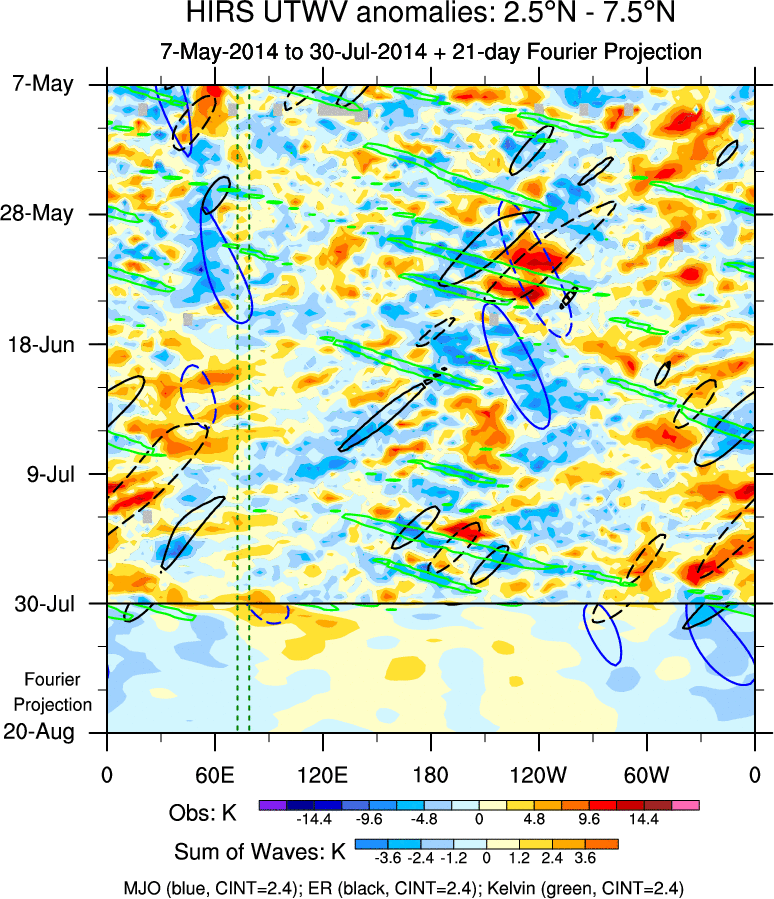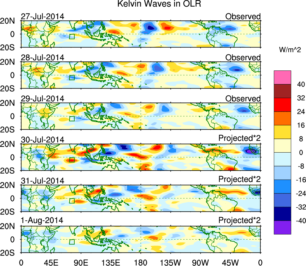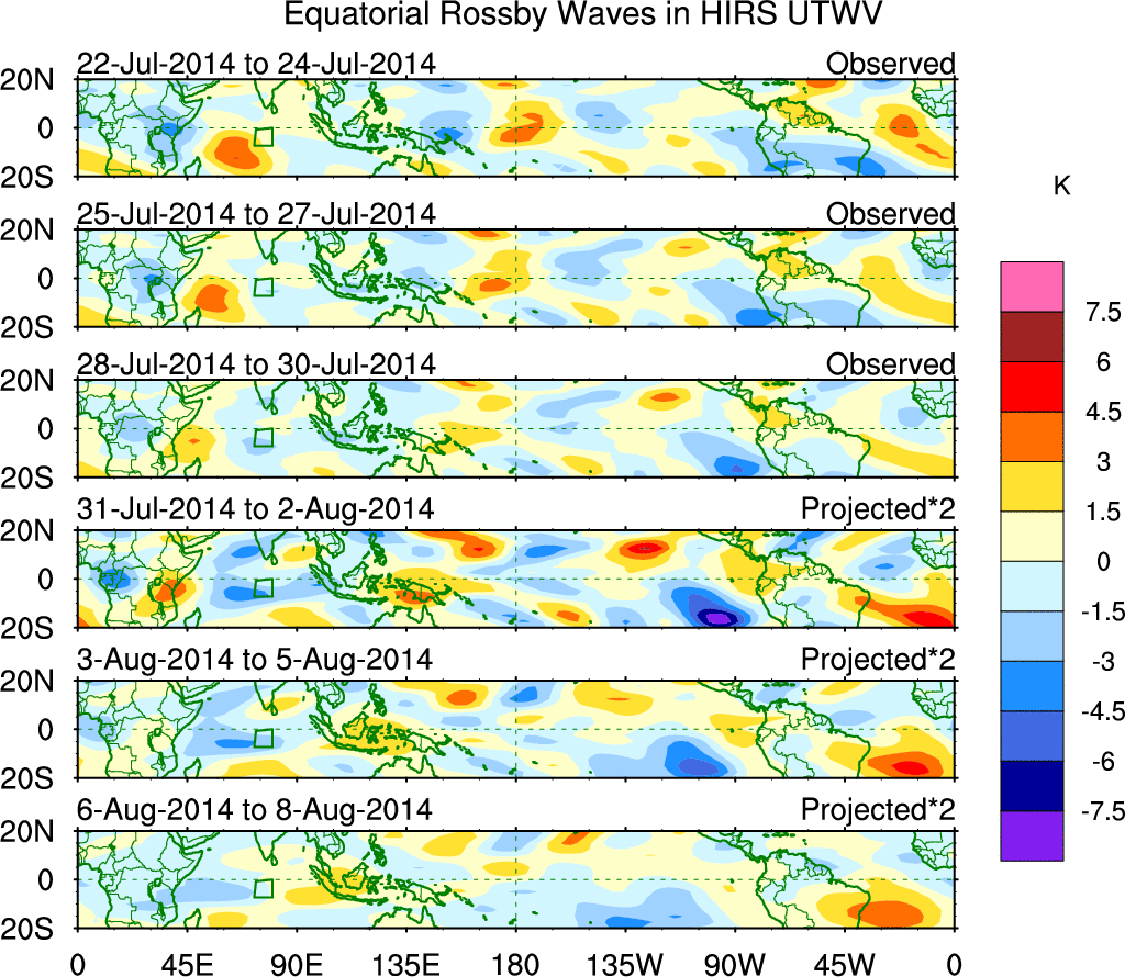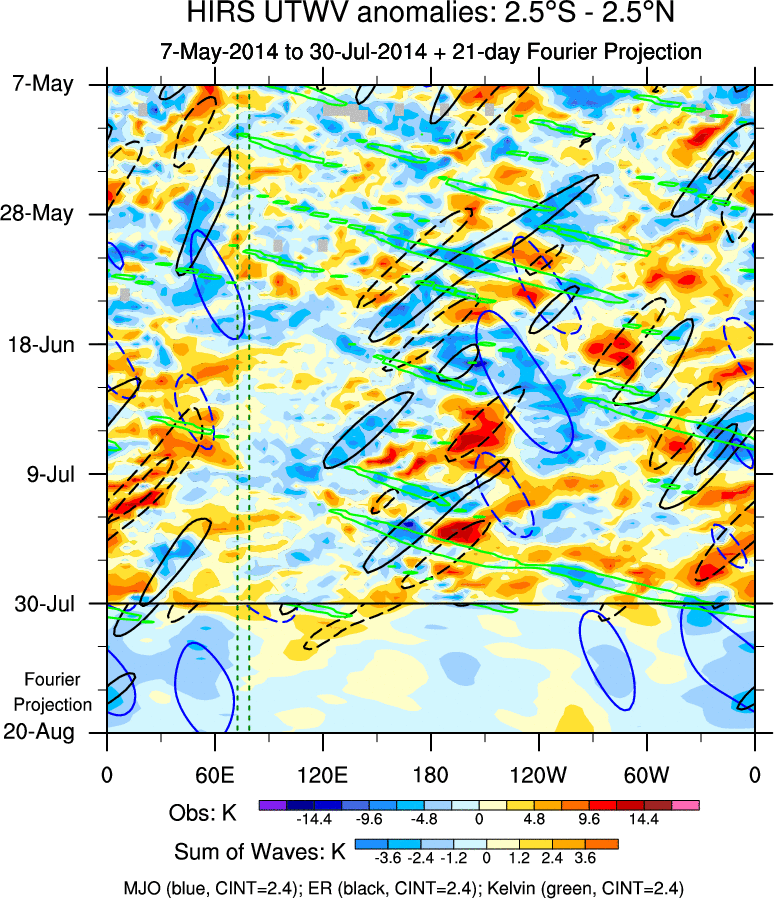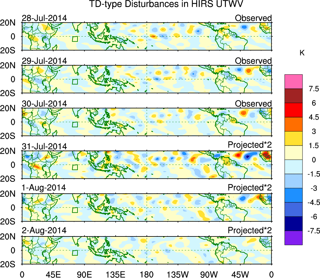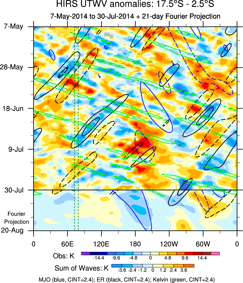 To identify tropical waves in near real-time, the OLR and UTWV data are filtered following Wheeler & Weickmann (2001 MWR). The daily anomalies are calculated using the first 3 harmonics of the seasonal cycle for 1979–2009. Missing values are then filled using linear interpolation in space and time. The most recent 365 days of anomalies are padded with 659 days of zeroes, and the result is filtered for each wave type.
