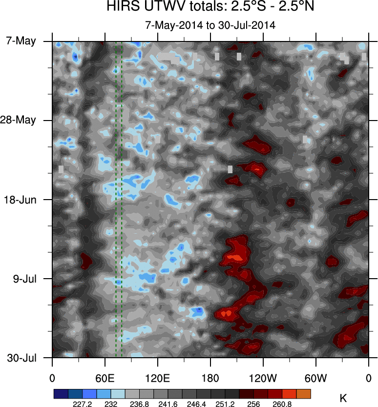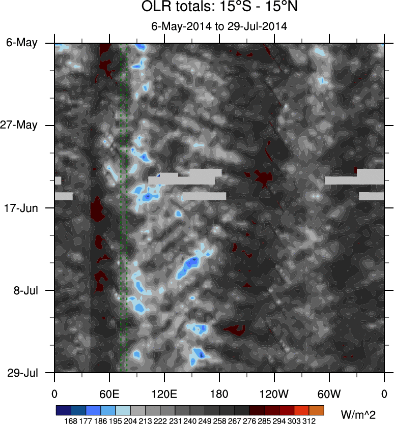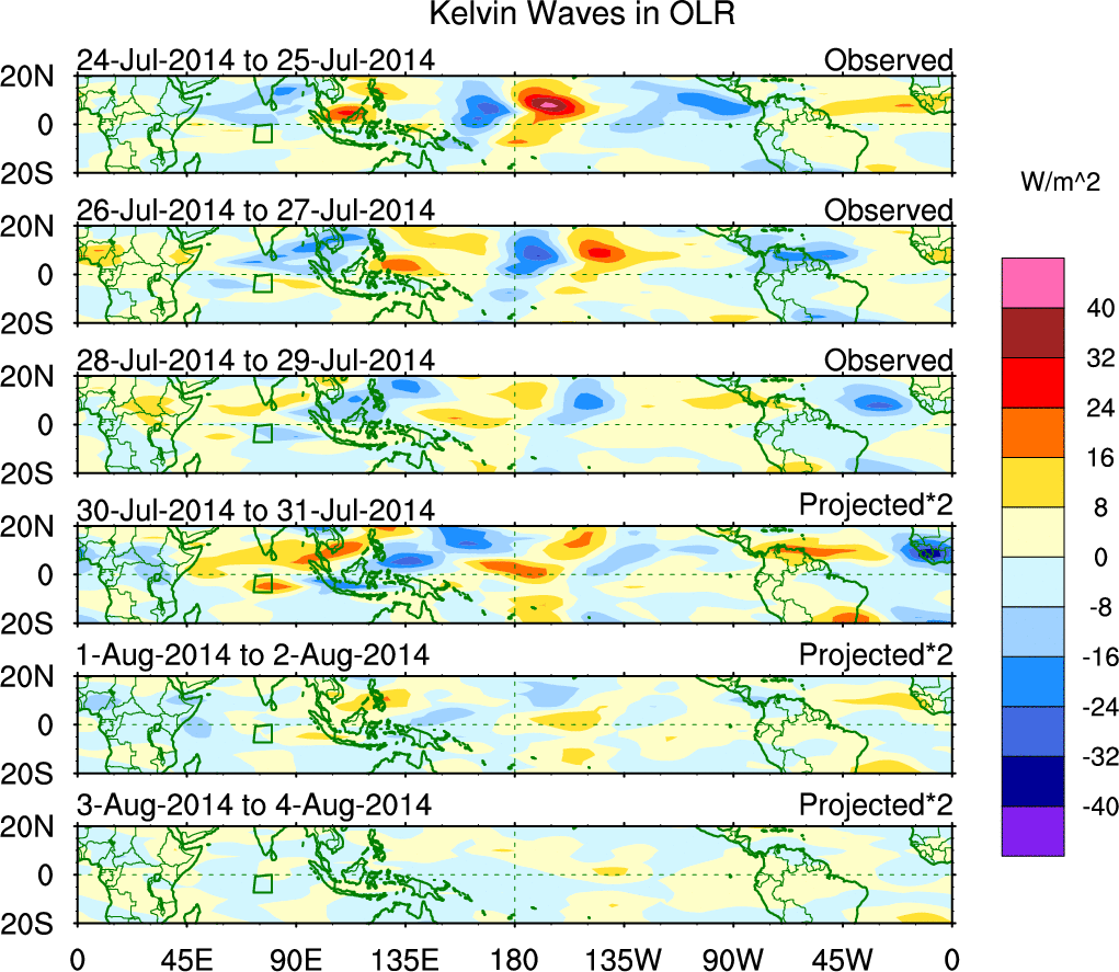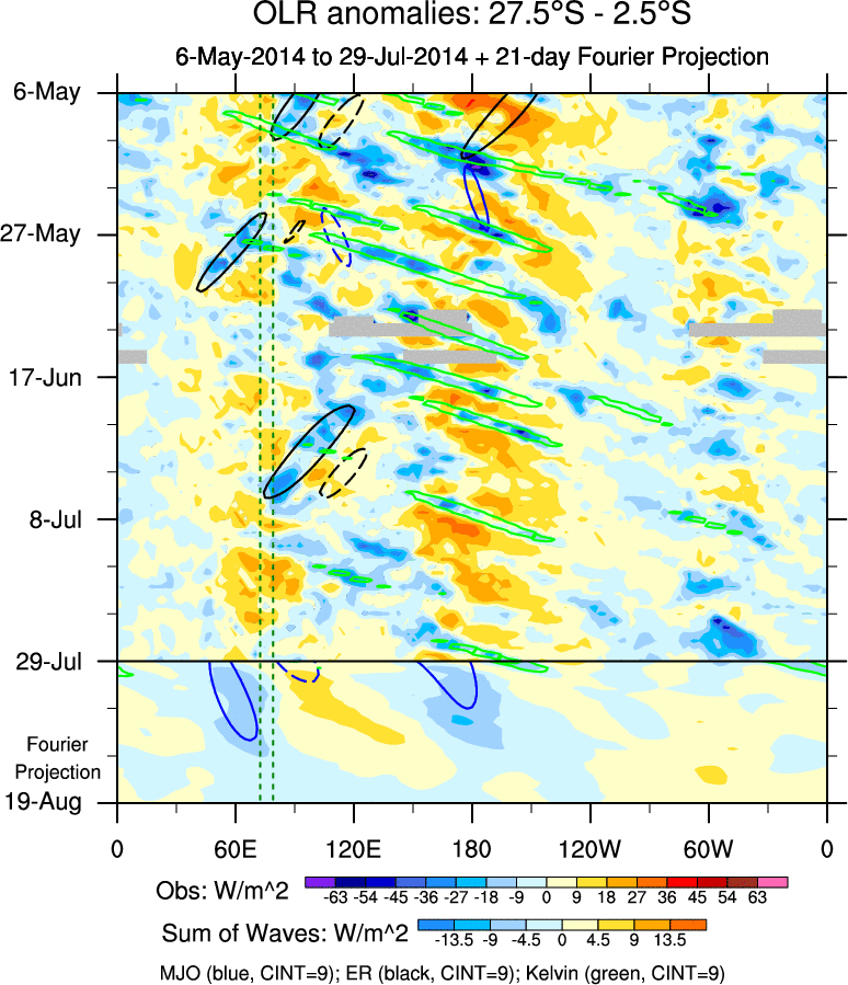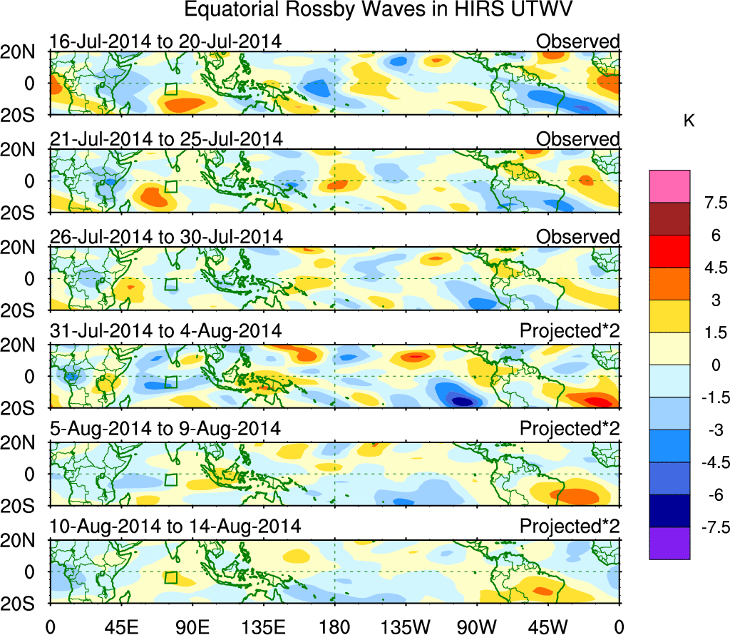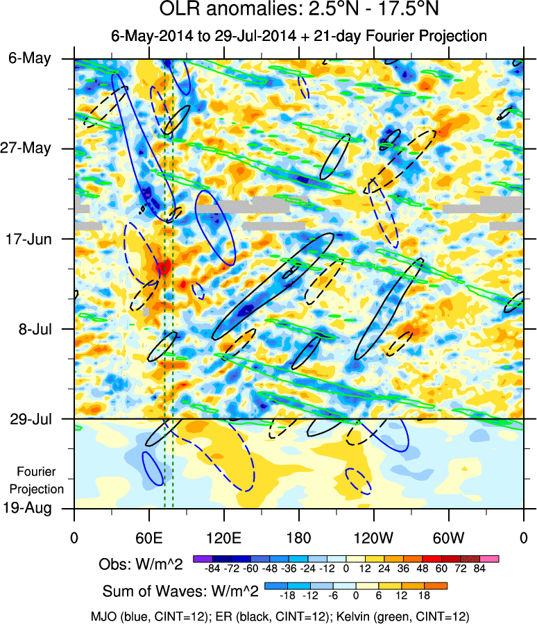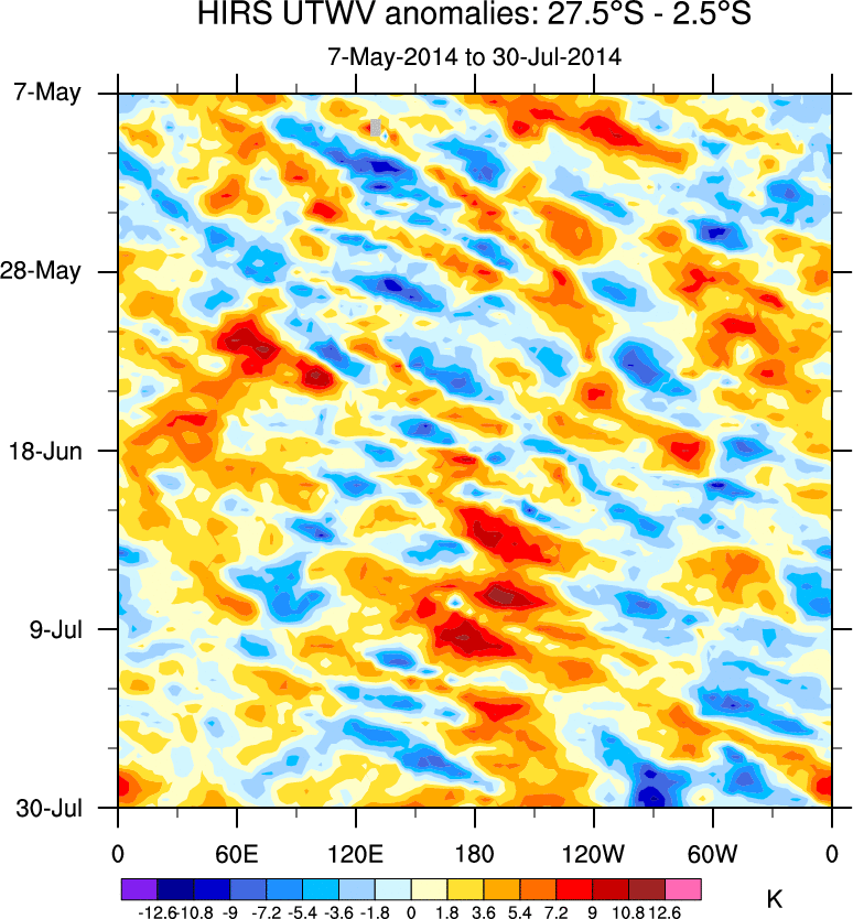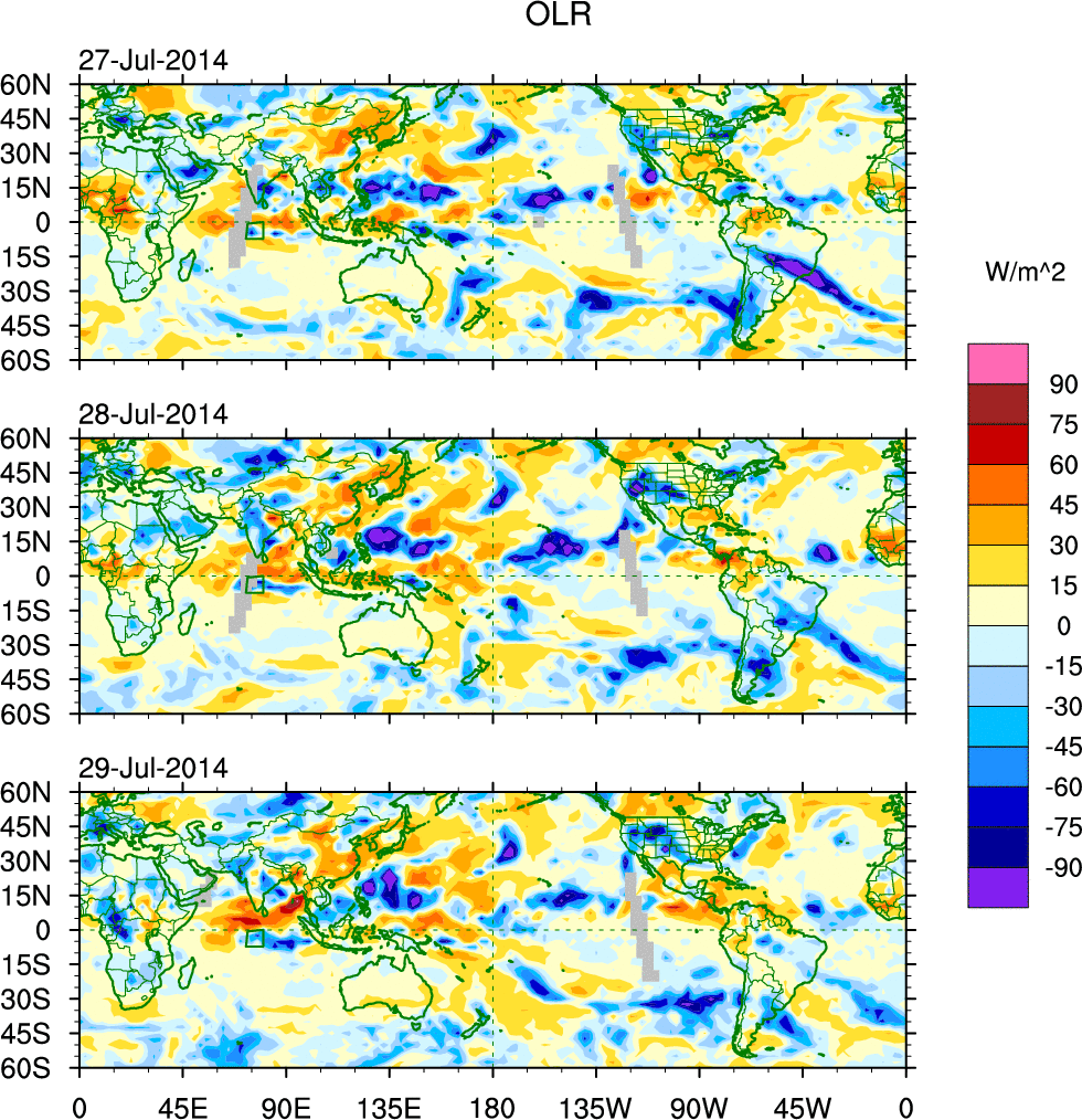 To identify tropical waves in near real-time, the OLR and UTWV data are filtered following Wheeler & Weickmann (2001 MWR). The daily anomalies are calculated using the first 3 harmonics of the seasonal cycle for 1979–2009. Missing values are then filled using linear interpolation in space and time. The most recent 365 days of anomalies are padded with 659 days of zeroes, and the result is filtered for each wave type.