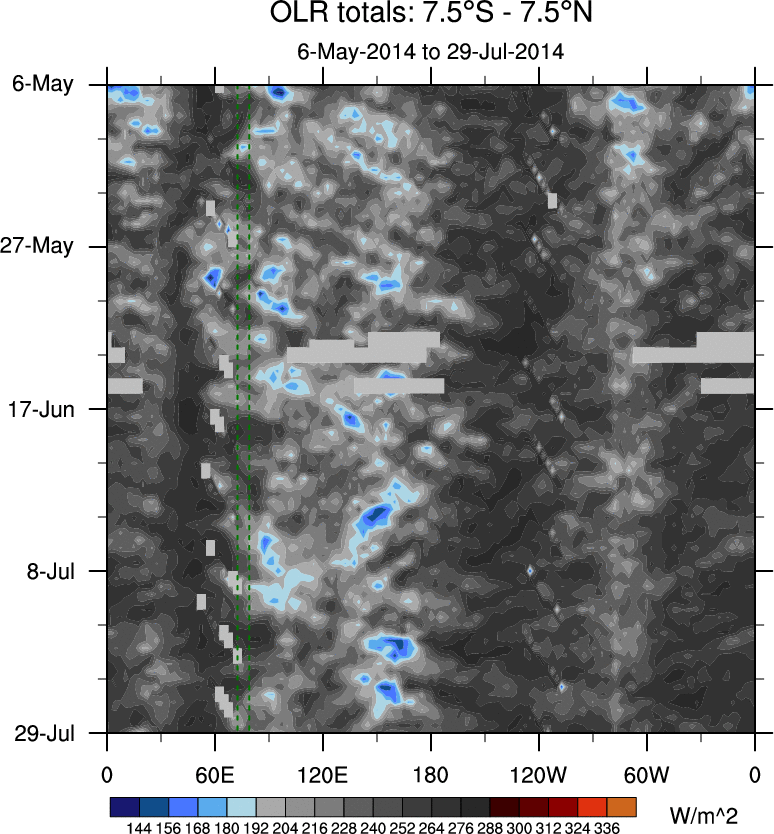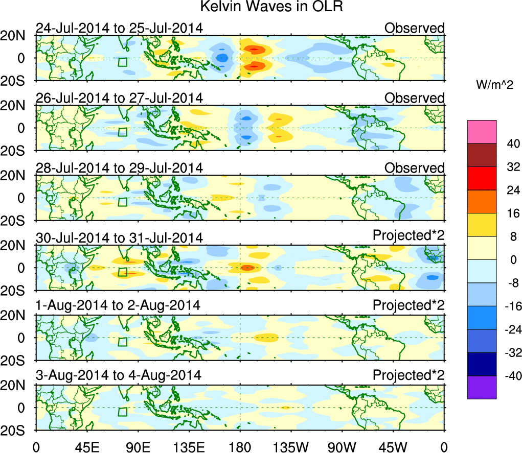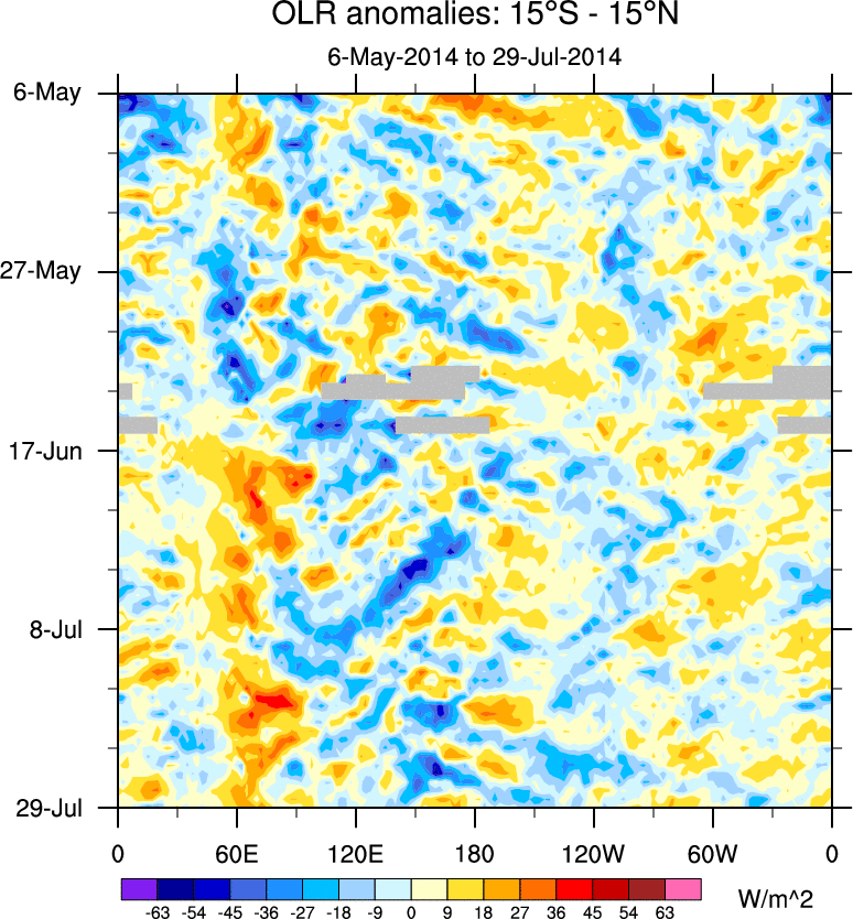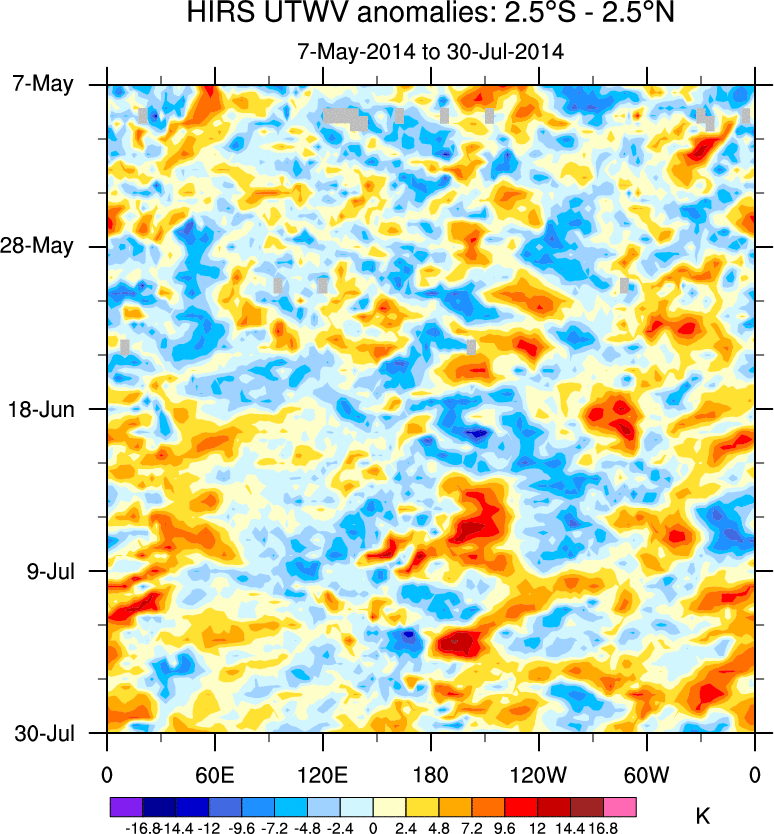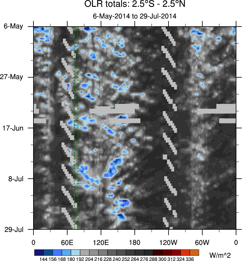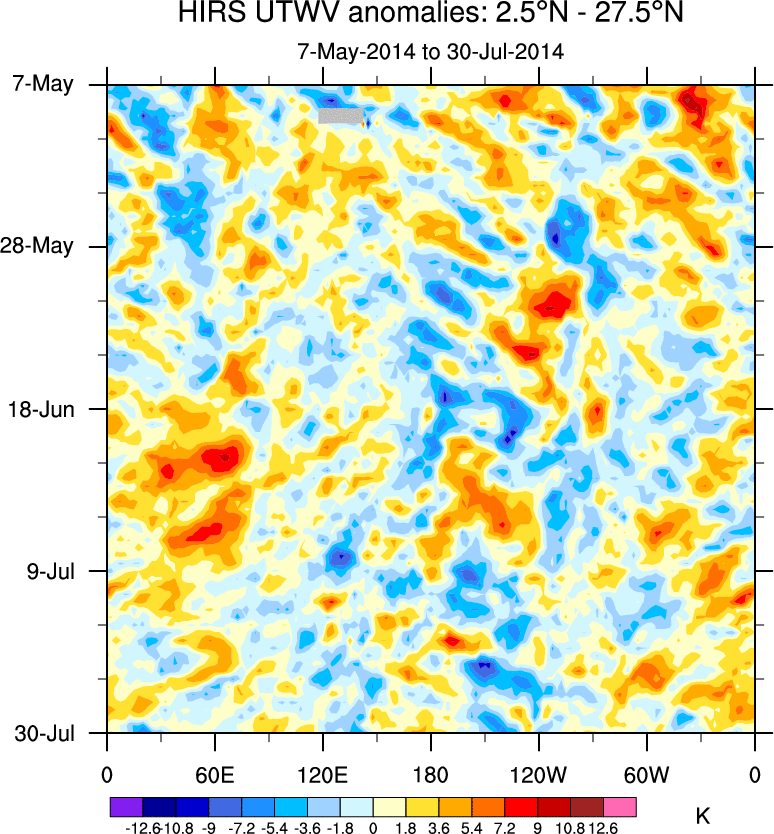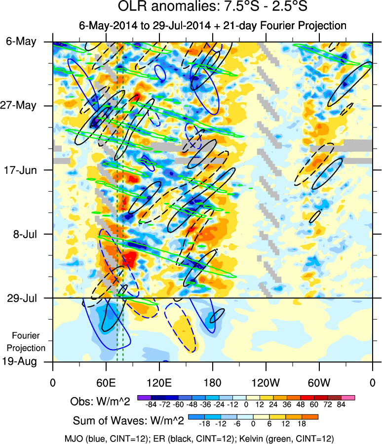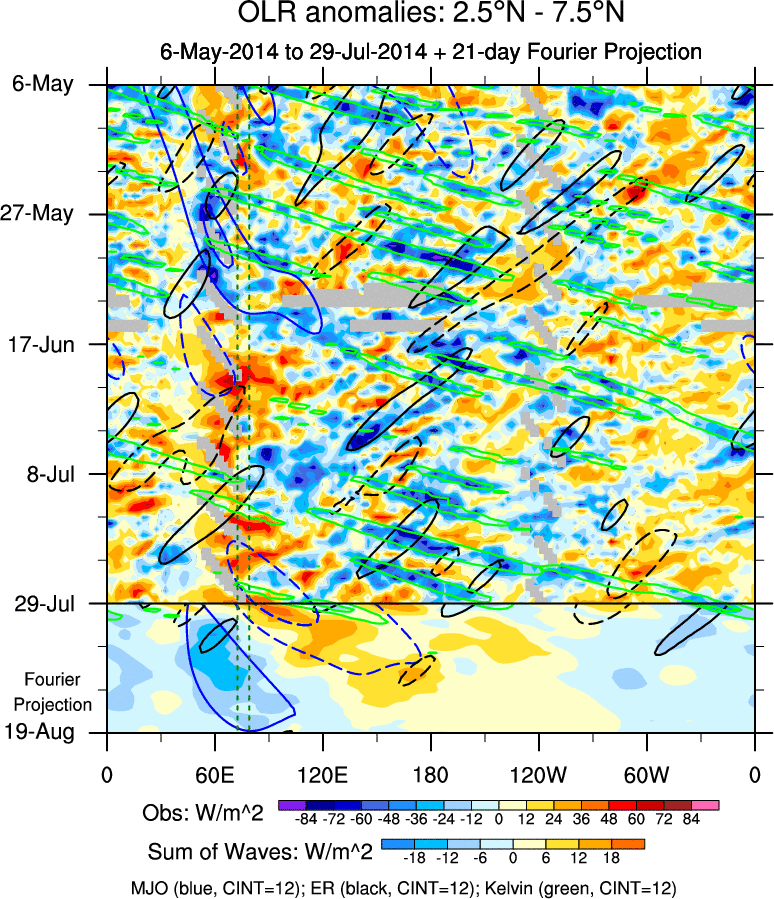 To identify tropical waves in near real-time, the OLR and UTWV data are filtered following Wheeler & Weickmann (2001 MWR). The daily anomalies are calculated using the first 3 harmonics of the seasonal cycle for 1979–2009. Missing values are then filled using linear interpolation in space and time. The most recent 365 days of anomalies are padded with 659 days of zeroes, and the result is filtered for each wave type.