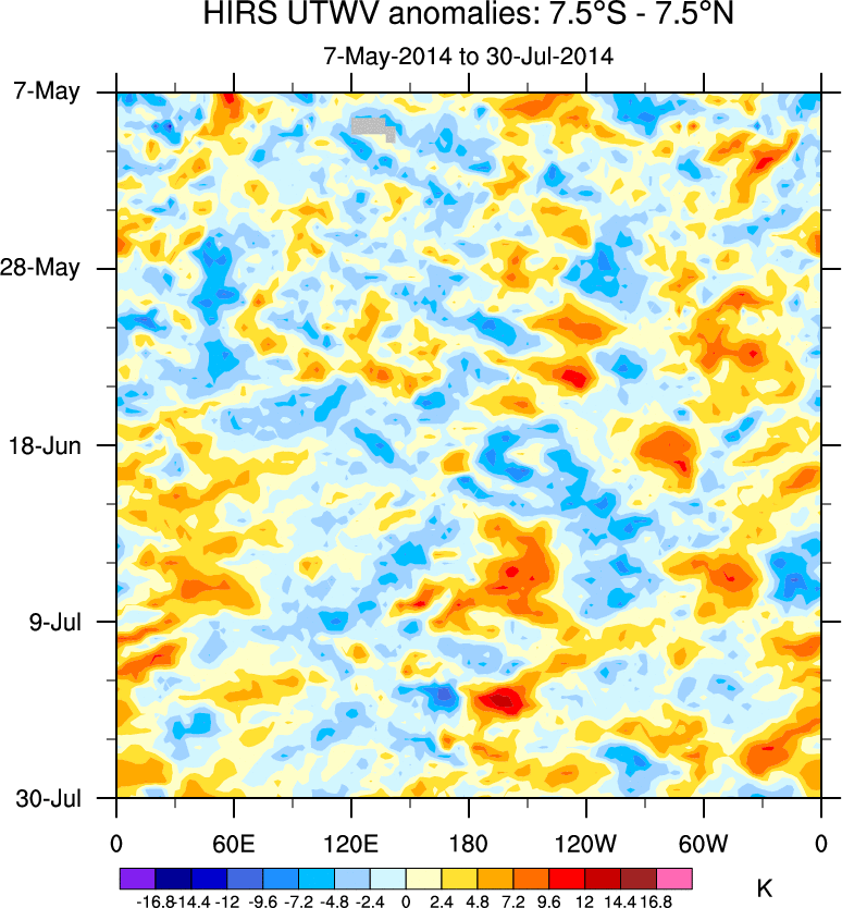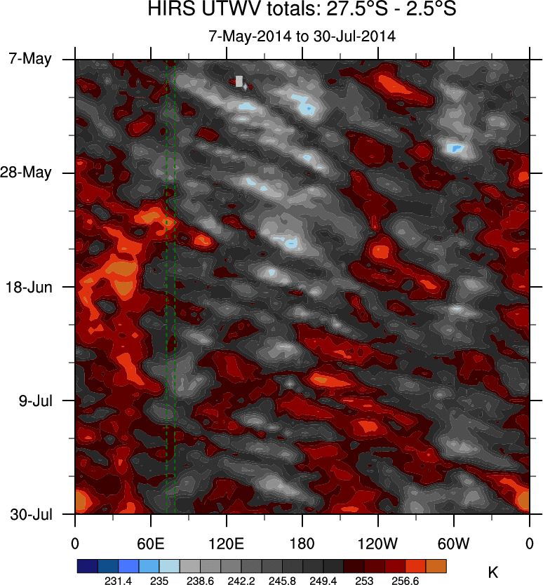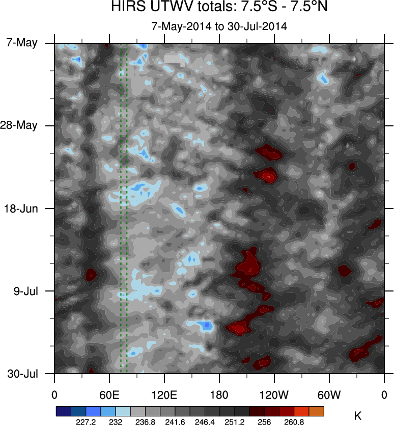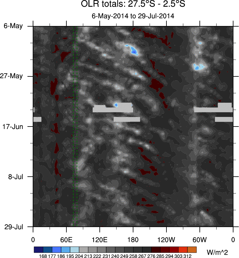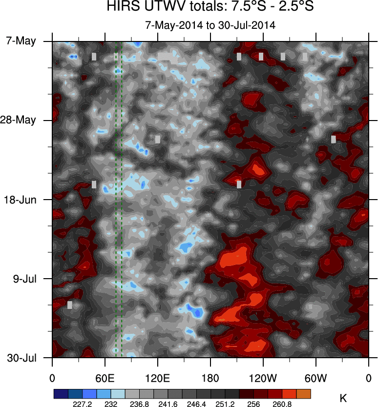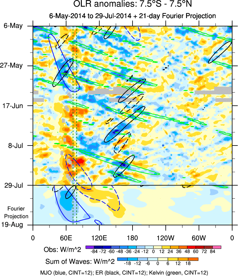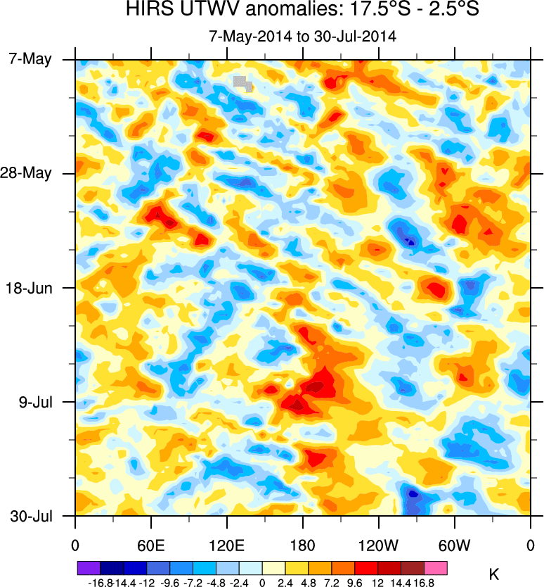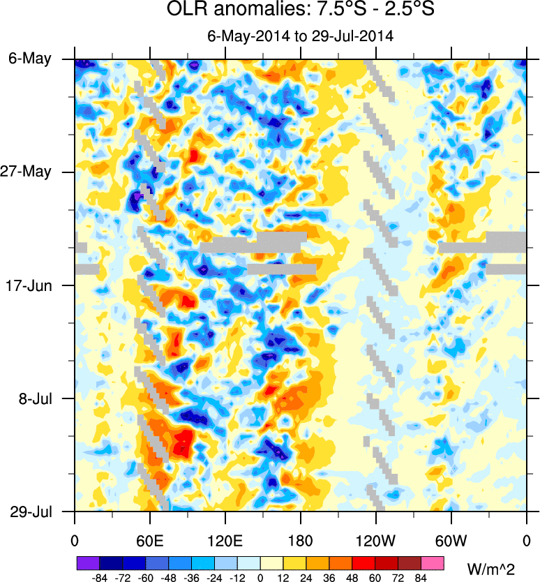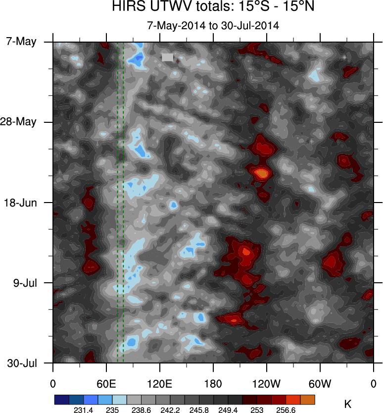 To identify tropical waves in near real-time, the OLR and UTWV data are filtered following Wheeler & Weickmann (2001 MWR). The daily anomalies are calculated using the first 3 harmonics of the seasonal cycle for 1979–2009. Missing values are then filled using linear interpolation in space and time. The most recent 365 days of anomalies are padded with 659 days of zeroes, and the result is filtered for each wave type.