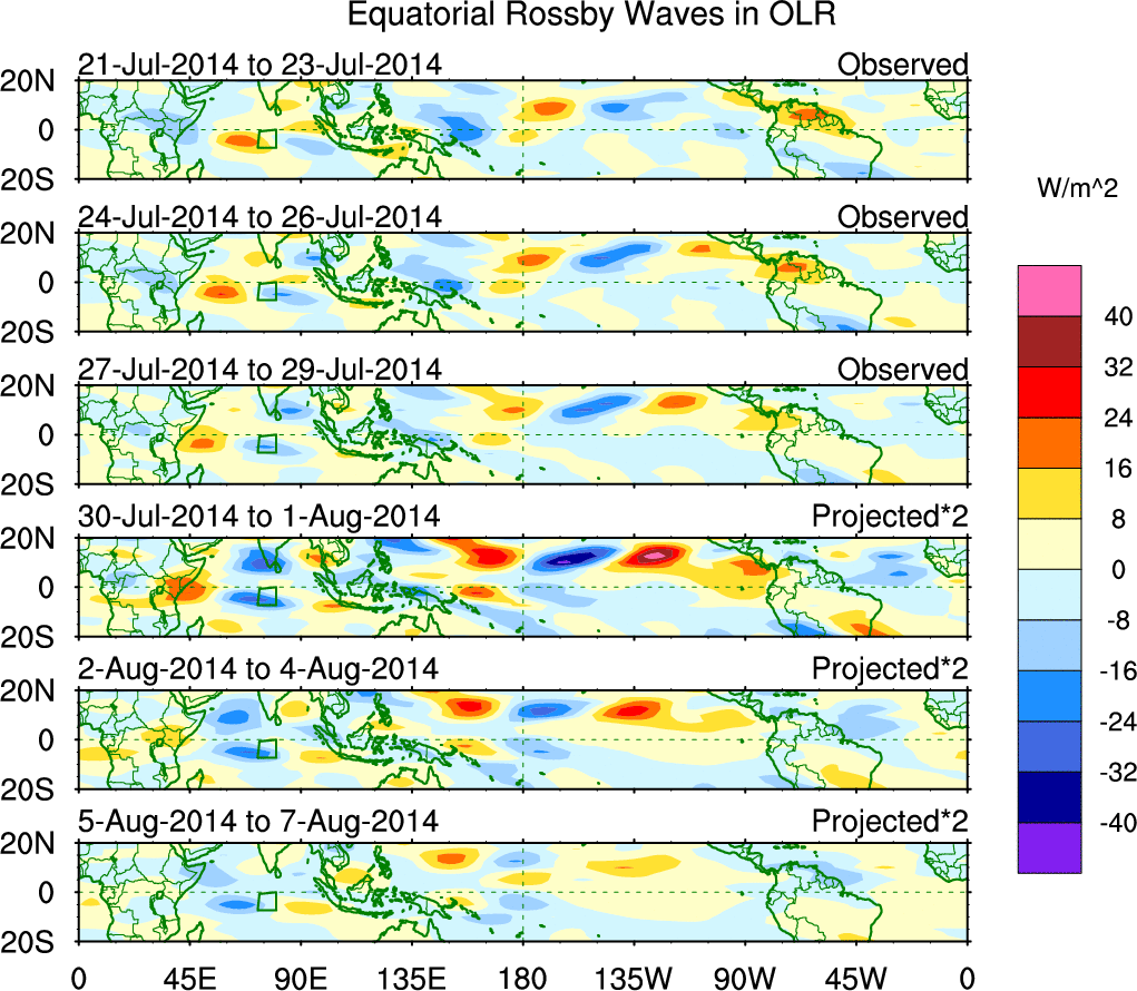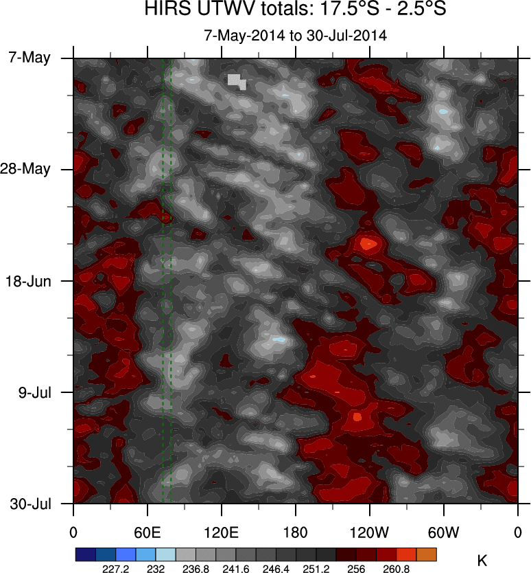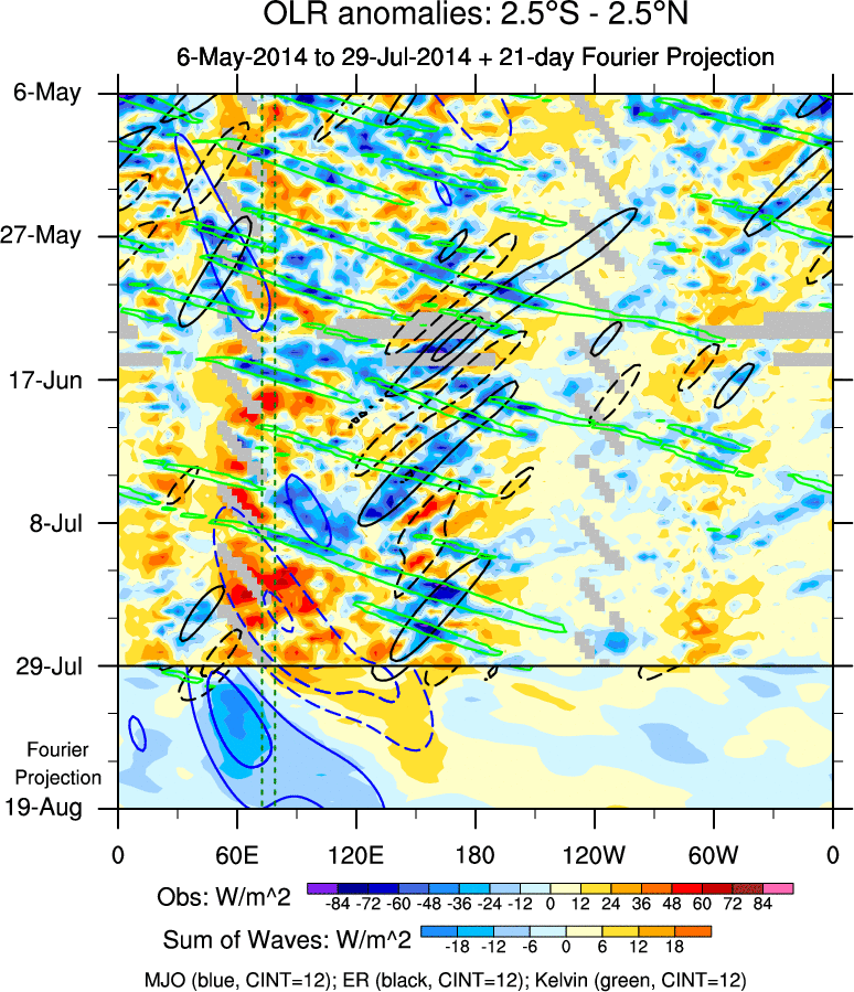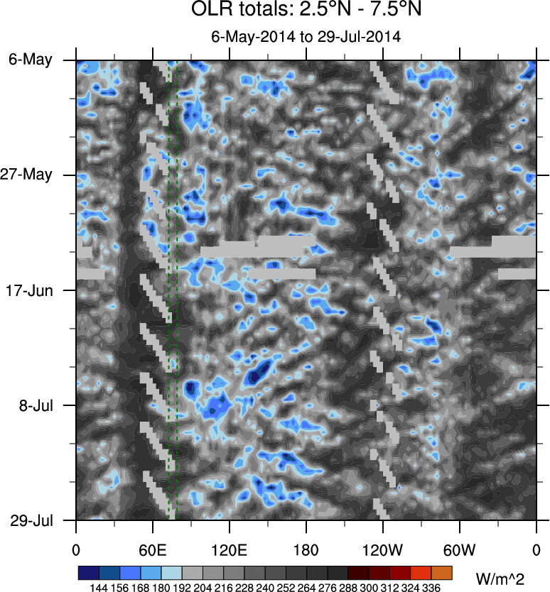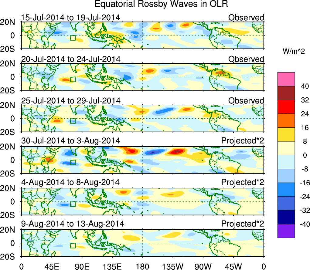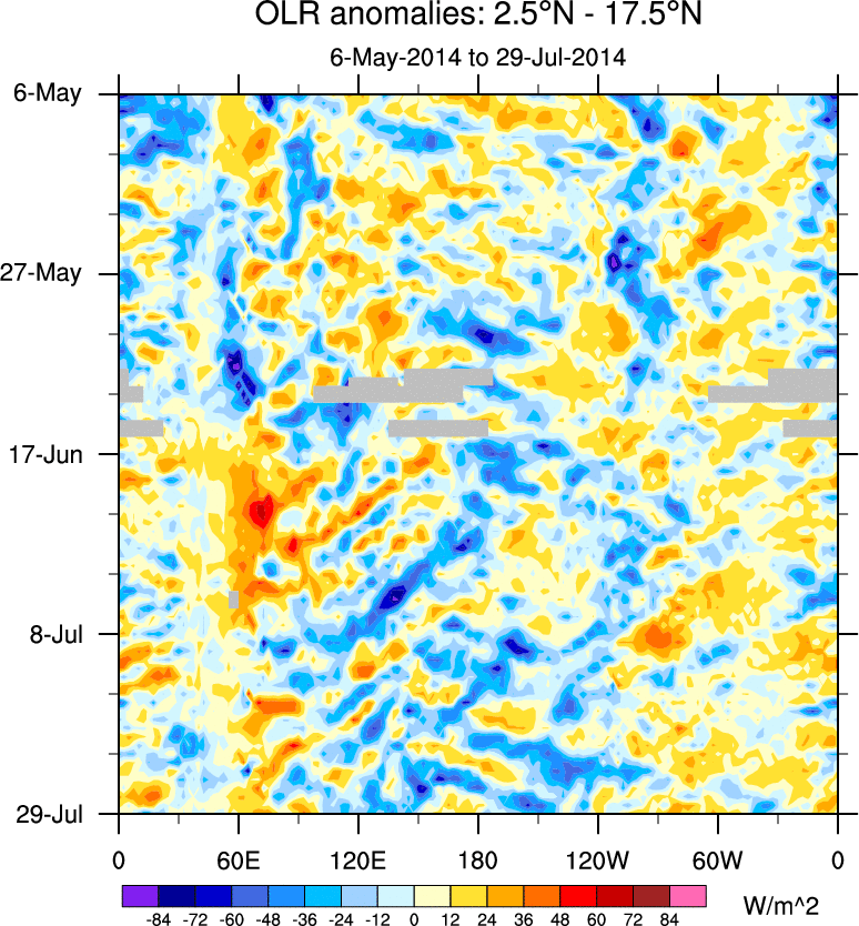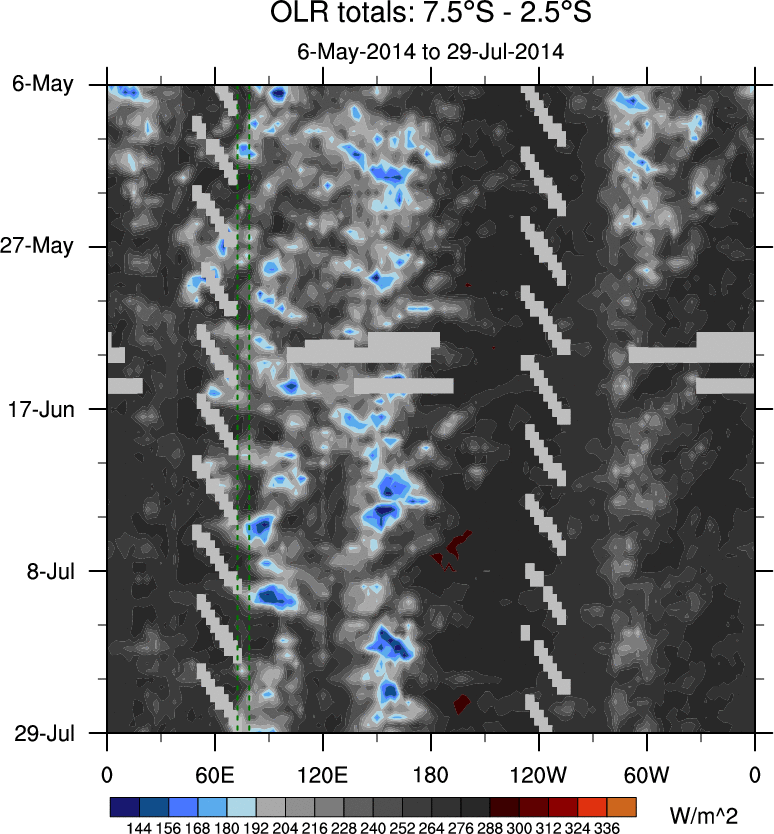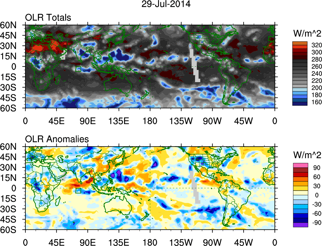 To identify tropical waves in near real-time, the OLR and UTWV data are filtered following Wheeler & Weickmann (2001 MWR). The daily anomalies are calculated using the first 3 harmonics of the seasonal cycle for 1979–2009. Missing values are then filled using linear interpolation in space and time. The most recent 365 days of anomalies are padded with 659 days of zeroes, and the result is filtered for each wave type.