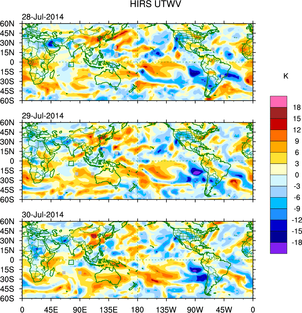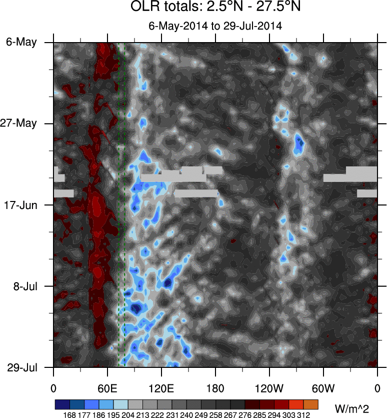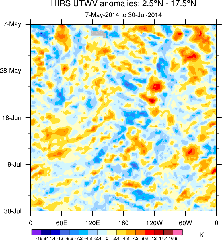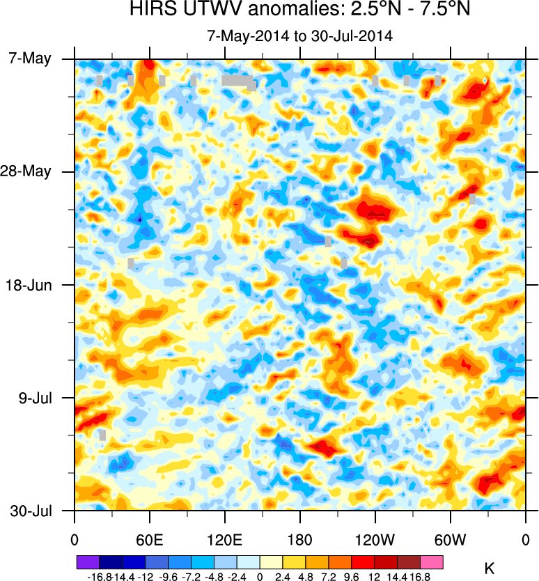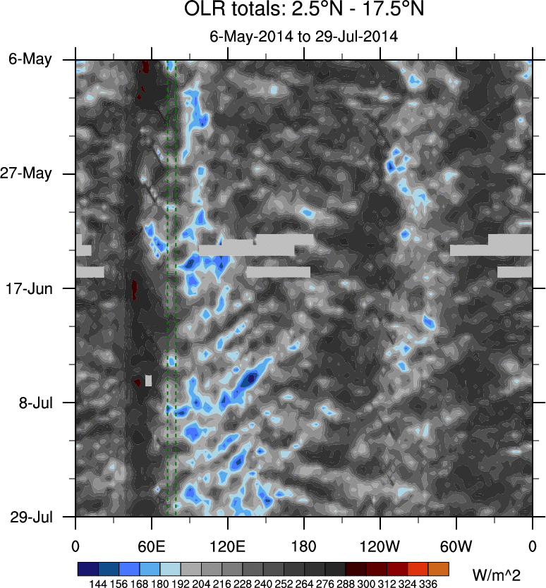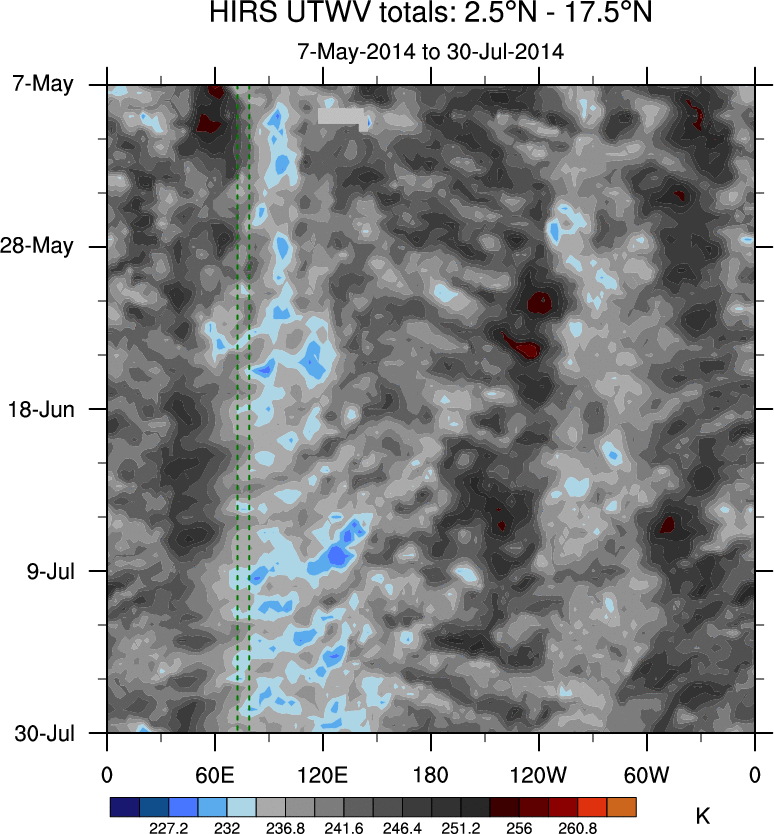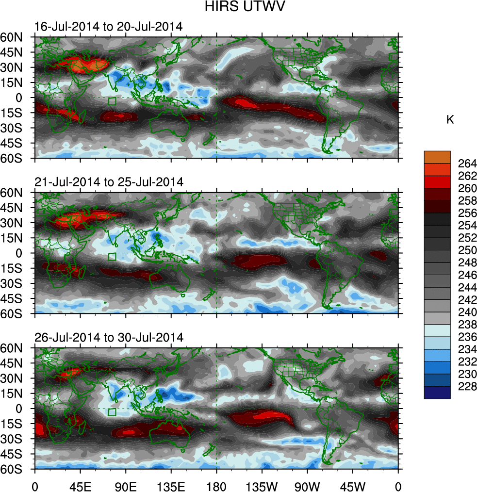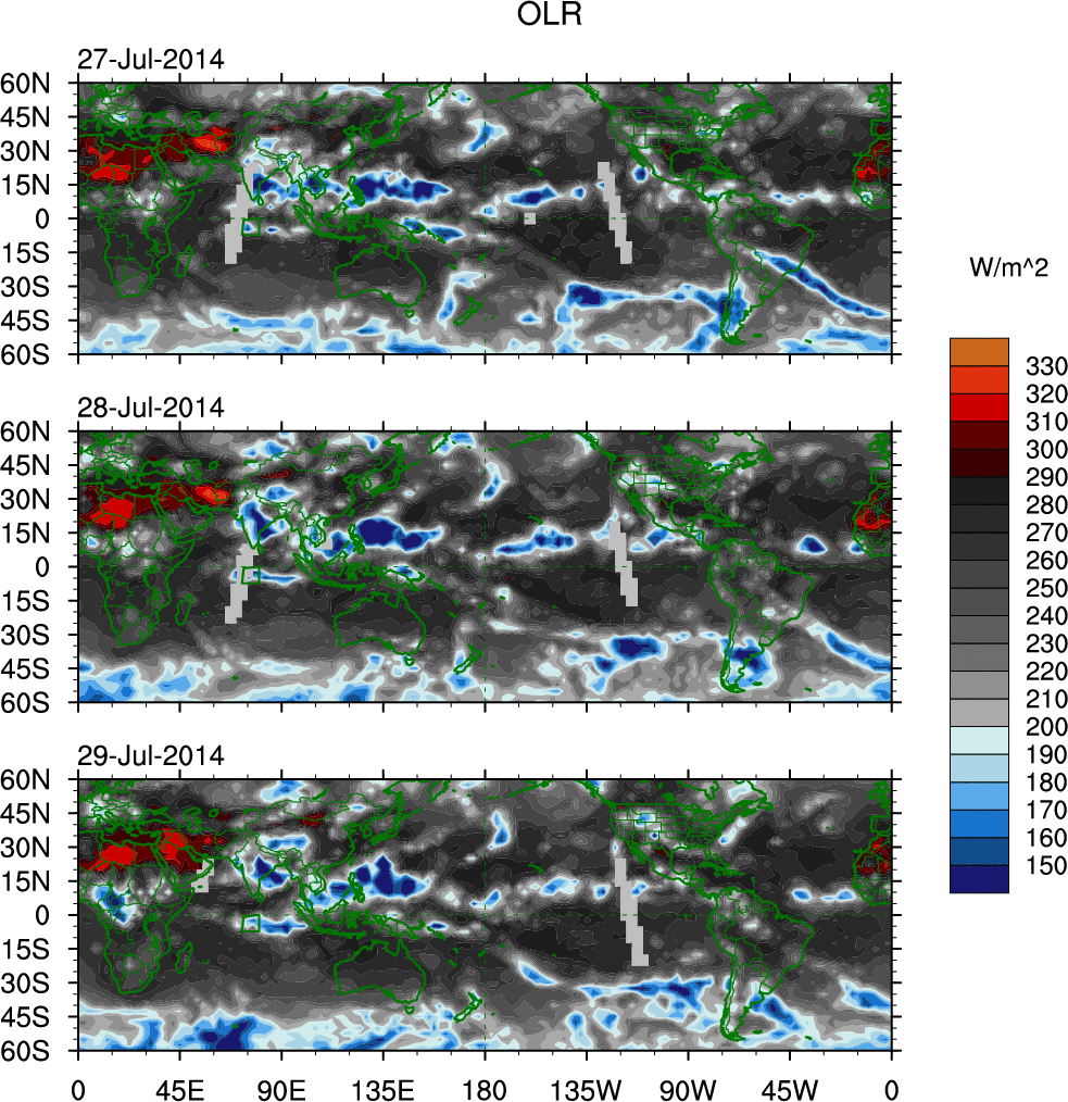 To identify tropical waves in near real-time, the OLR and UTWV data are filtered following Wheeler & Weickmann (2001 MWR). The daily anomalies are calculated using the first 3 harmonics of the seasonal cycle for 1979–2009. Missing values are then filled using linear interpolation in space and time. The most recent 365 days of anomalies are padded with 659 days of zeroes, and the result is filtered for each wave type.