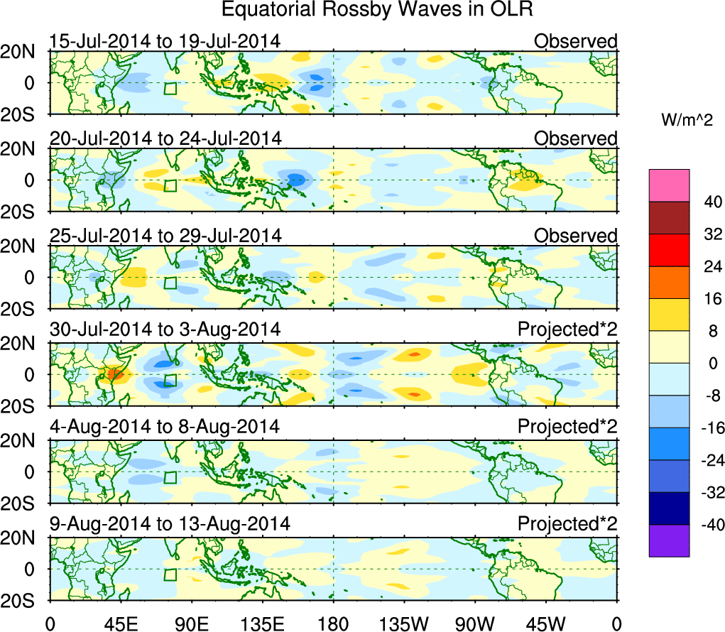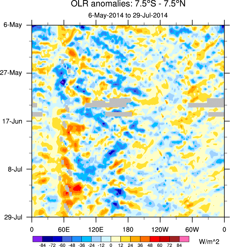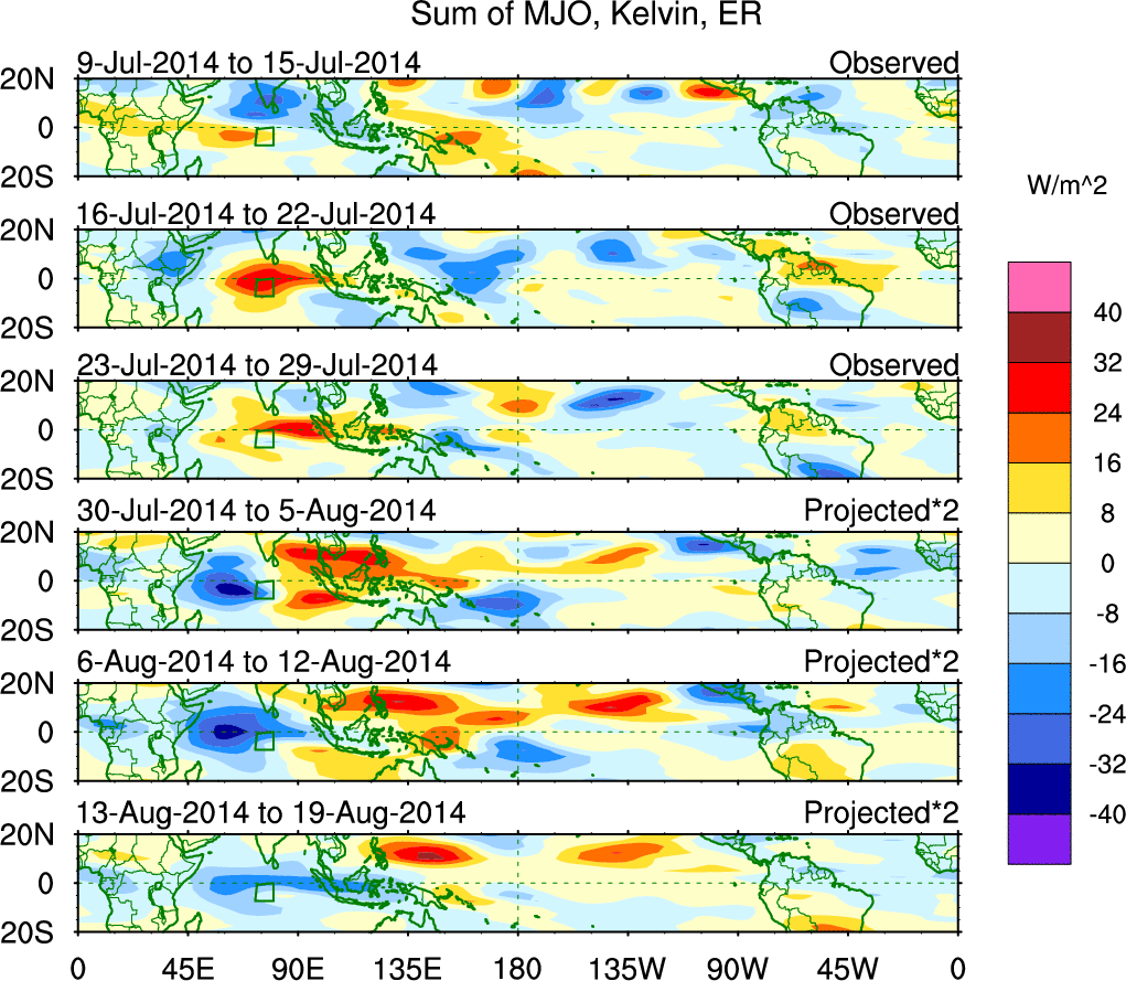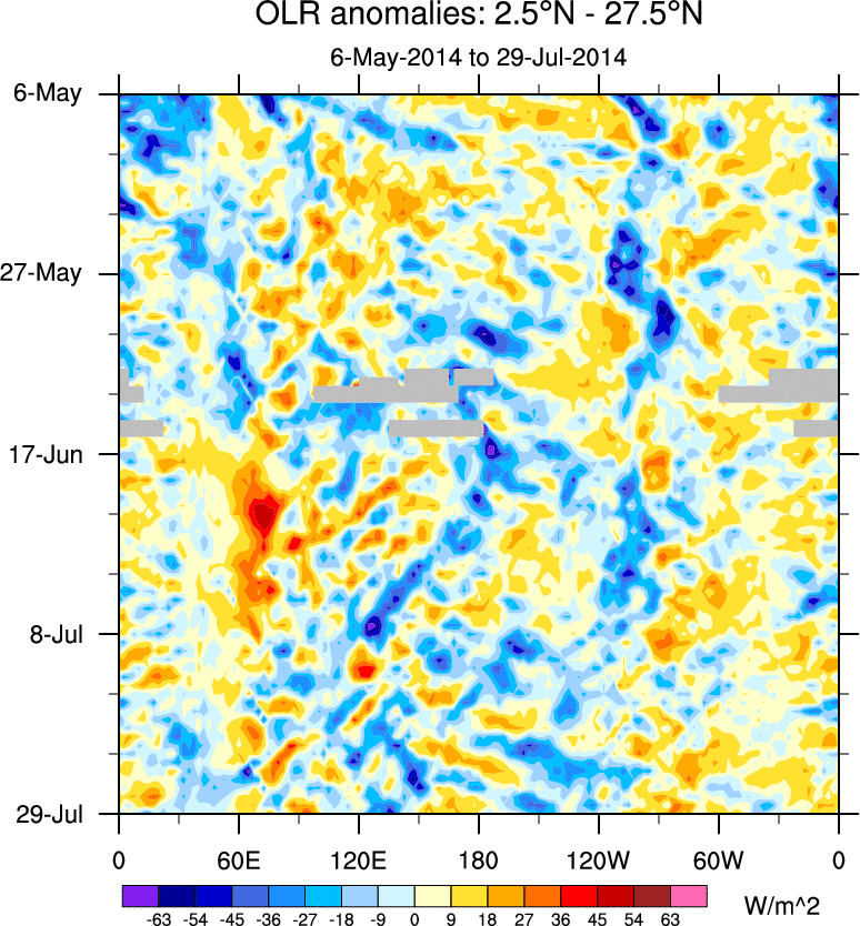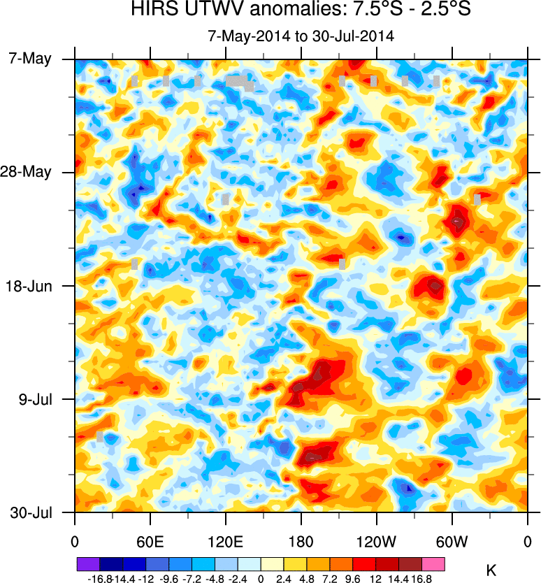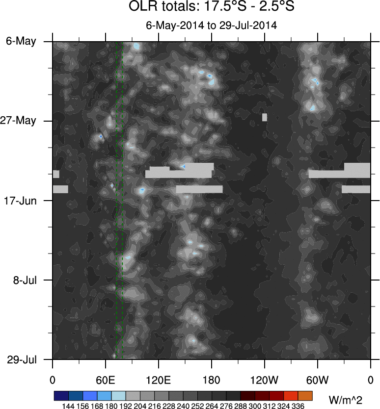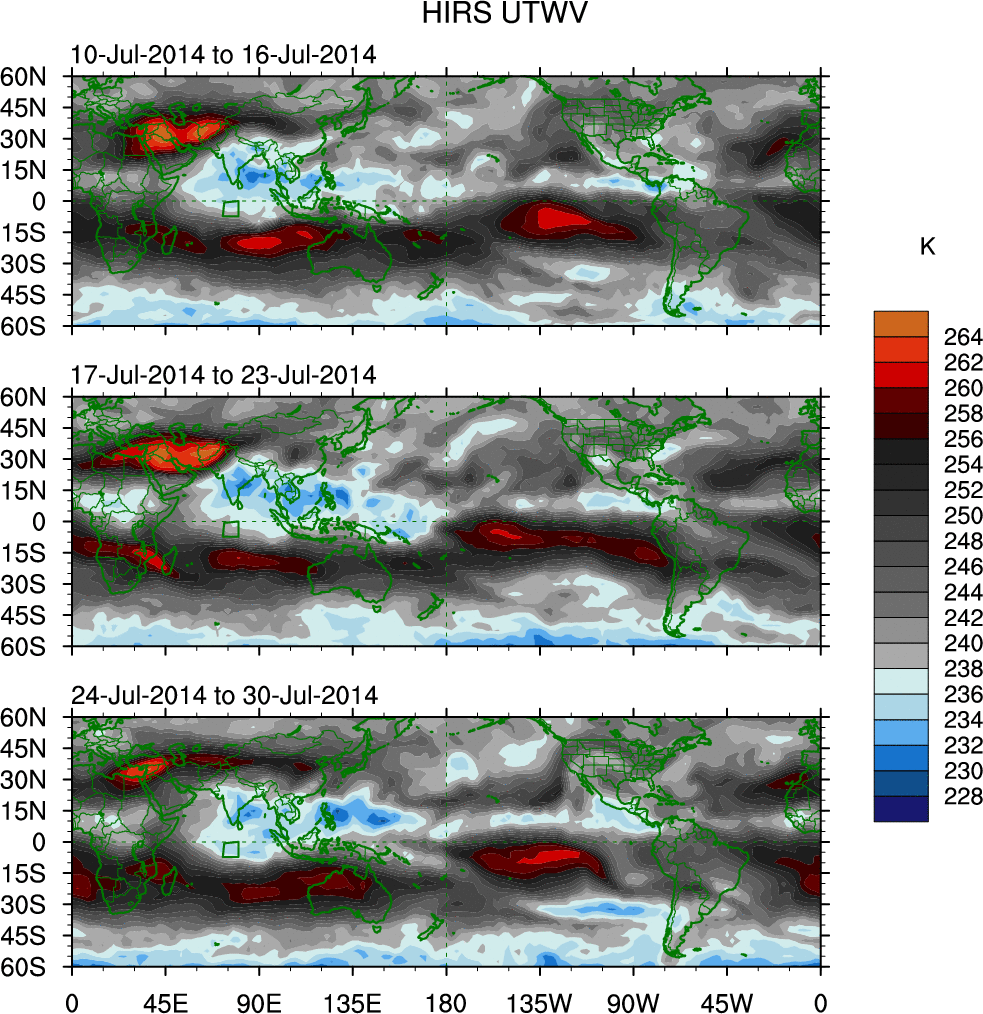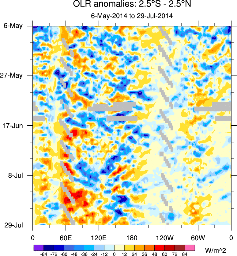 To identify tropical waves in near real-time, the OLR and UTWV data are filtered following Wheeler & Weickmann (2001 MWR). The daily anomalies are calculated using the first 3 harmonics of the seasonal cycle for 1979–2009. Missing values are then filled using linear interpolation in space and time. The most recent 365 days of anomalies are padded with 659 days of zeroes, and the result is filtered for each wave type.