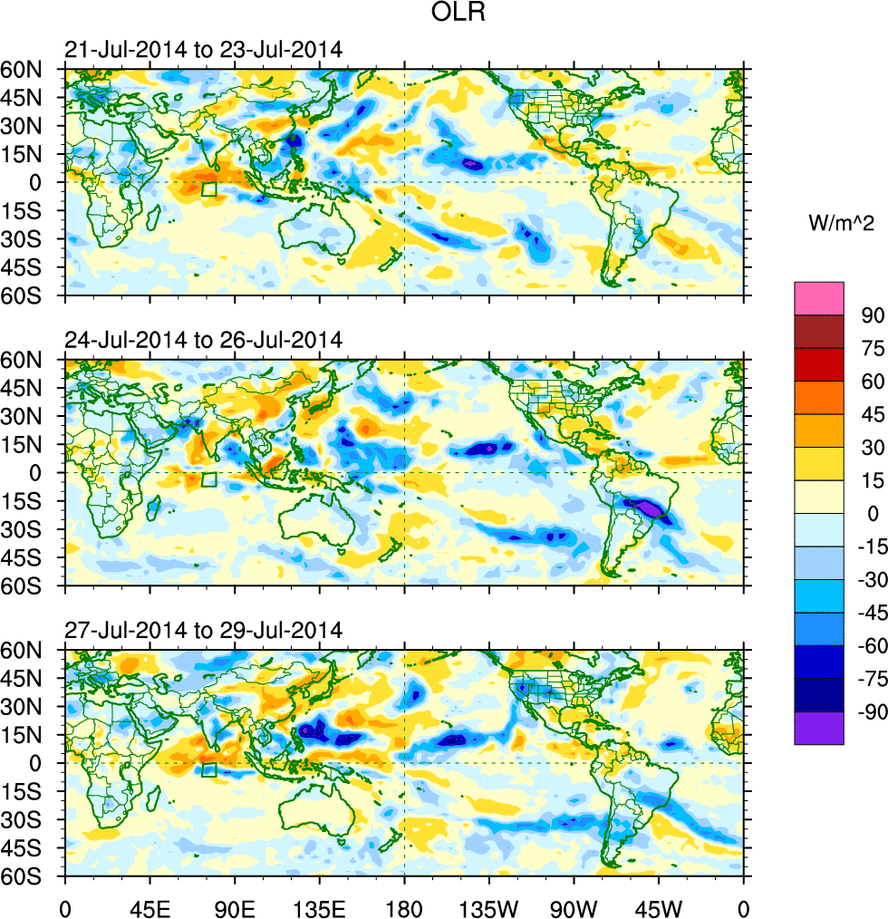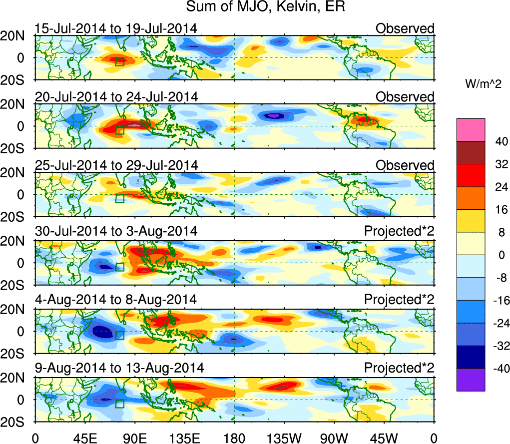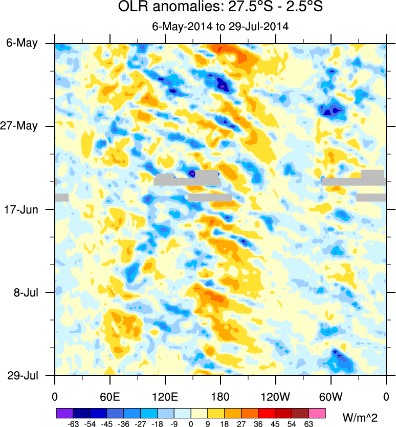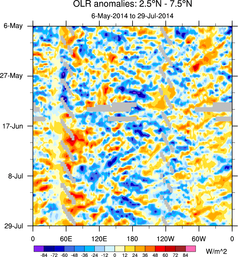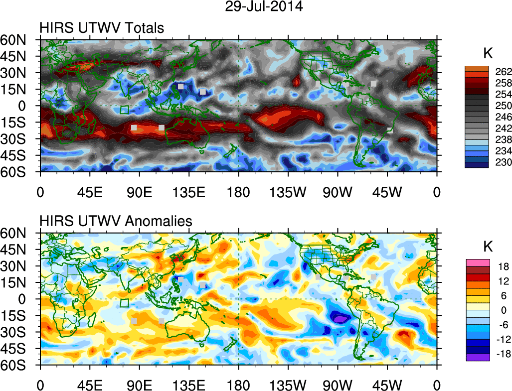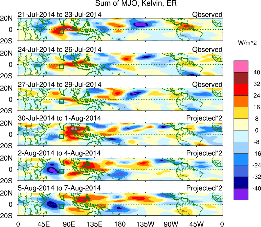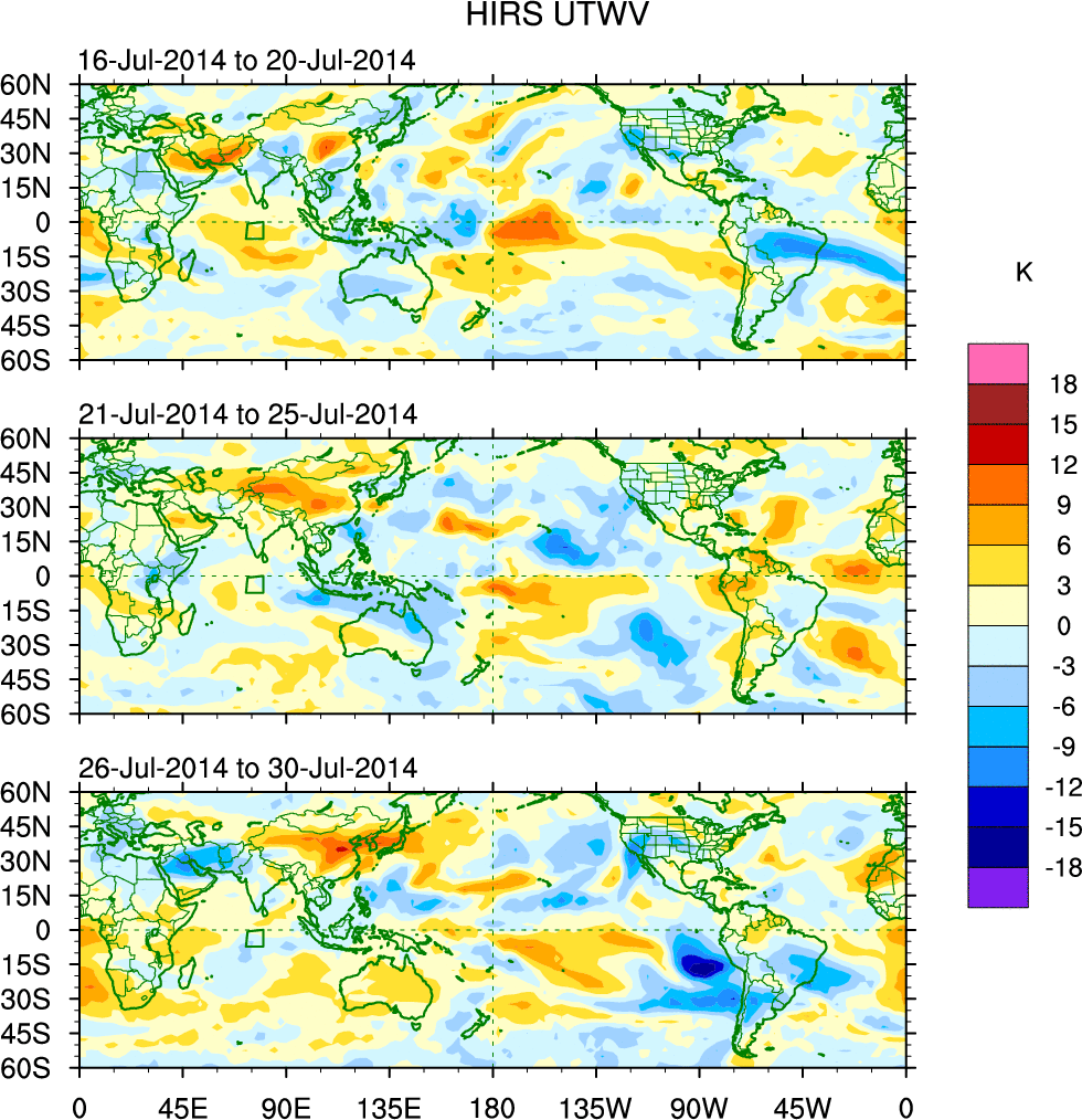 To identify tropical waves in near real-time, the OLR and UTWV data are filtered following Wheeler & Weickmann (2001 MWR). The daily anomalies are calculated using the first 3 harmonics of the seasonal cycle for 1979–2009. Missing values are then filled using linear interpolation in space and time. The most recent 365 days of anomalies are padded with 659 days of zeroes, and the result is filtered for each wave type.