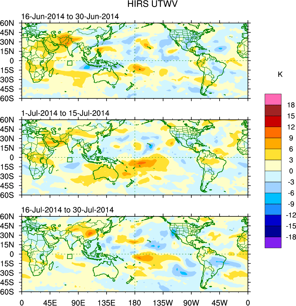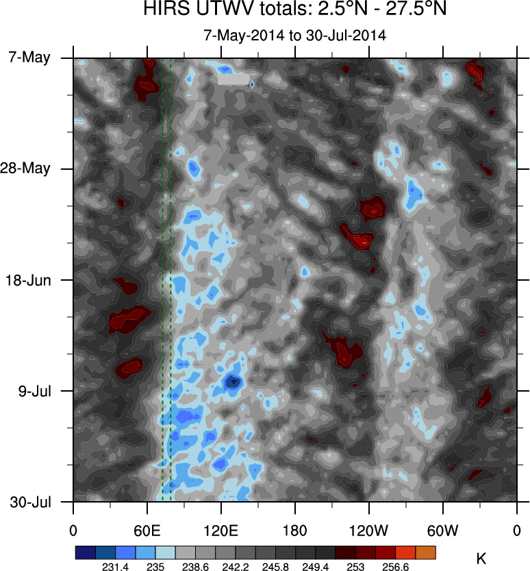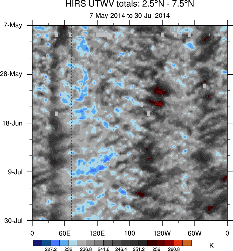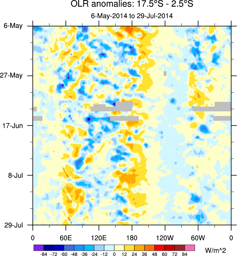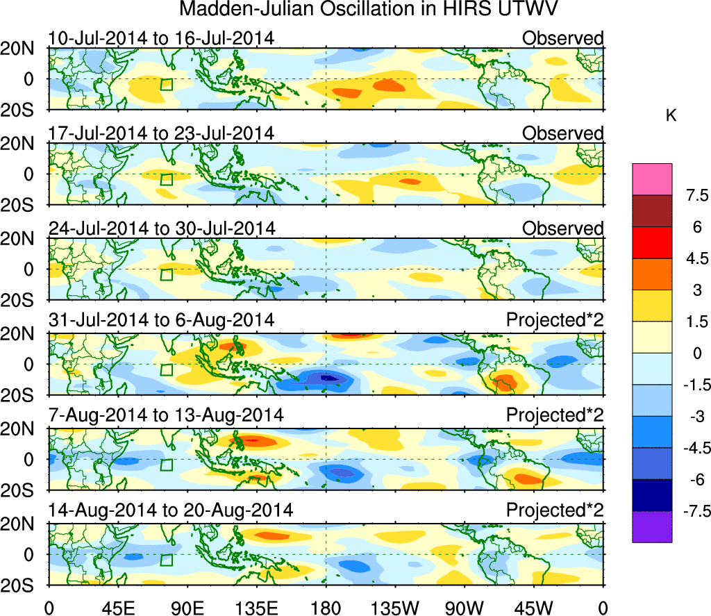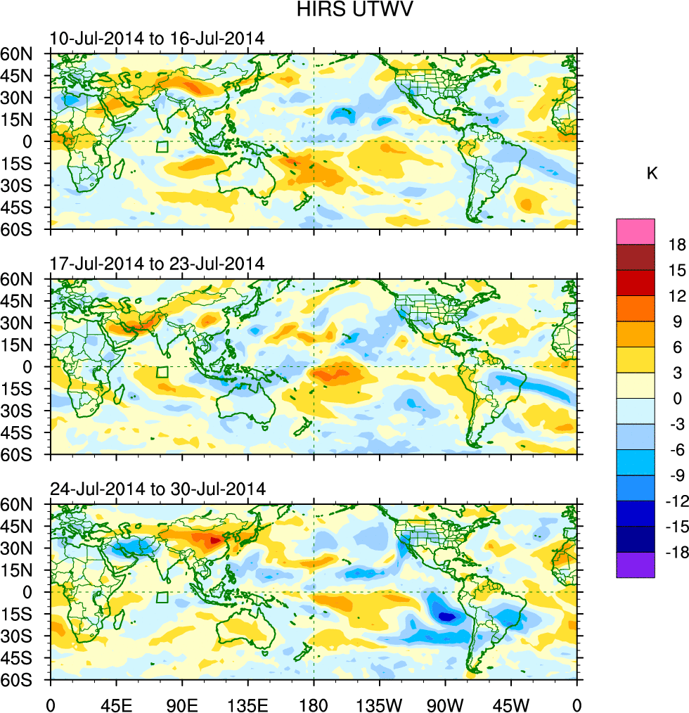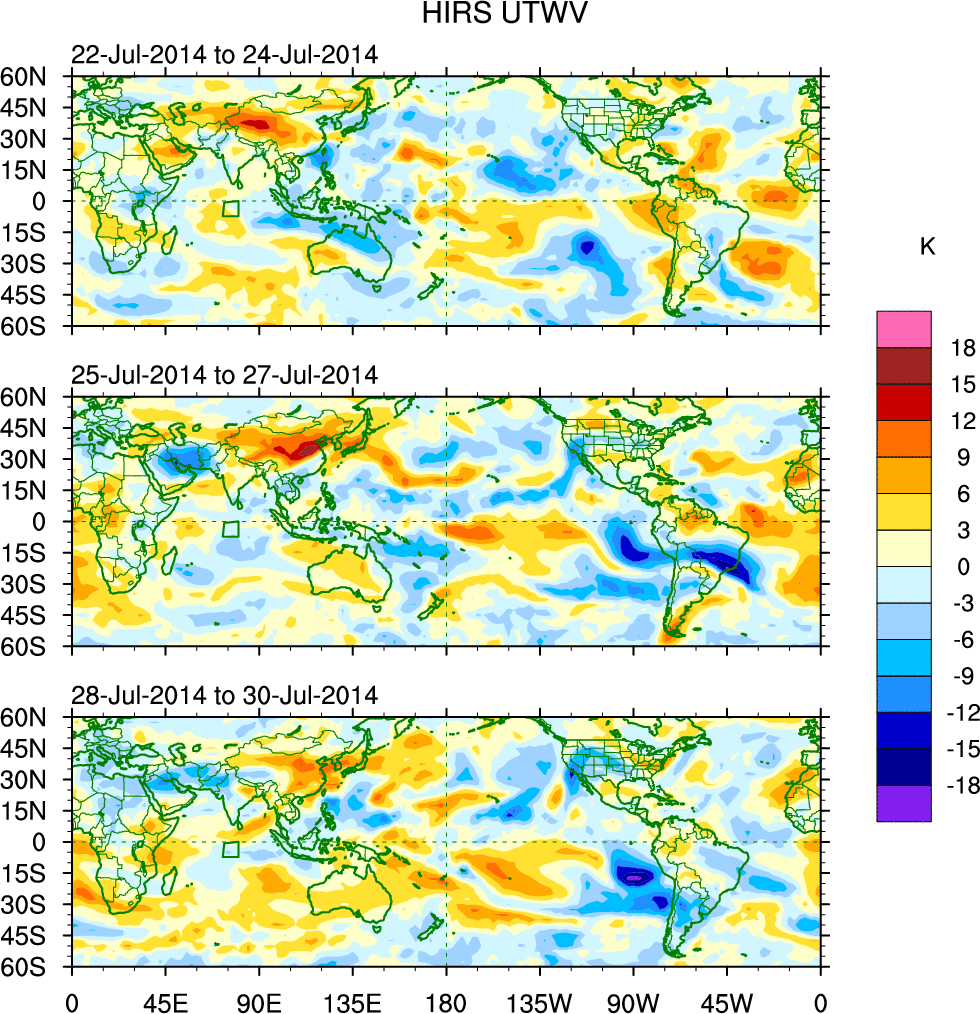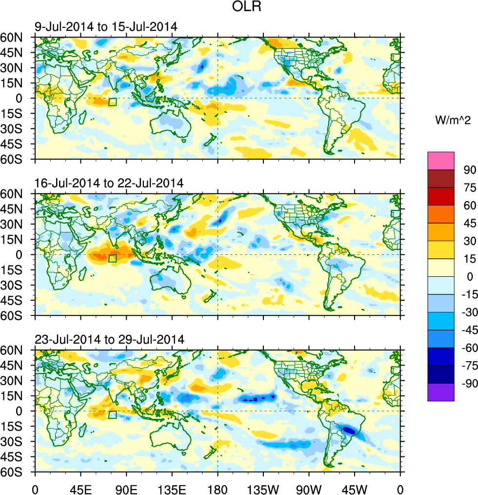 To identify tropical waves in near real-time, the OLR and UTWV data are filtered following Wheeler & Weickmann (2001 MWR). The daily anomalies are calculated using the first 3 harmonics of the seasonal cycle for 1979–2009. Missing values are then filled using linear interpolation in space and time. The most recent 365 days of anomalies are padded with 659 days of zeroes, and the result is filtered for each wave type.