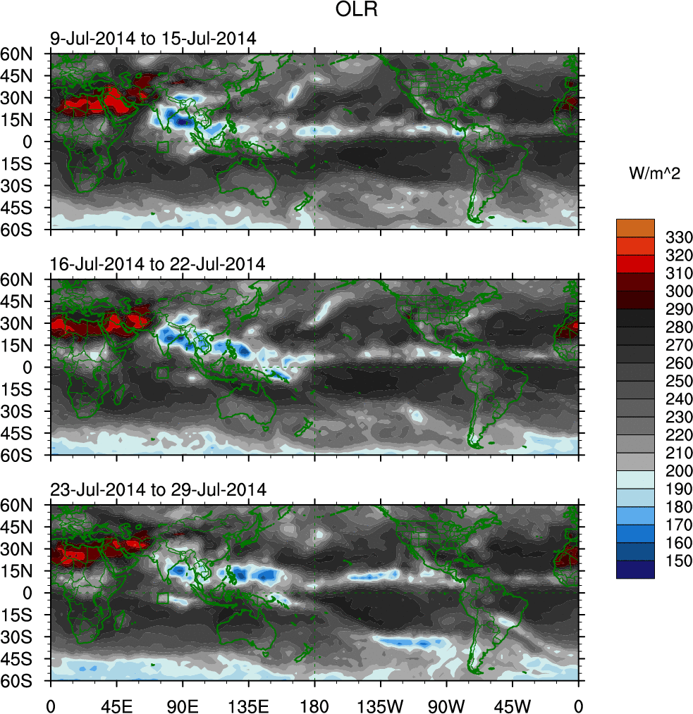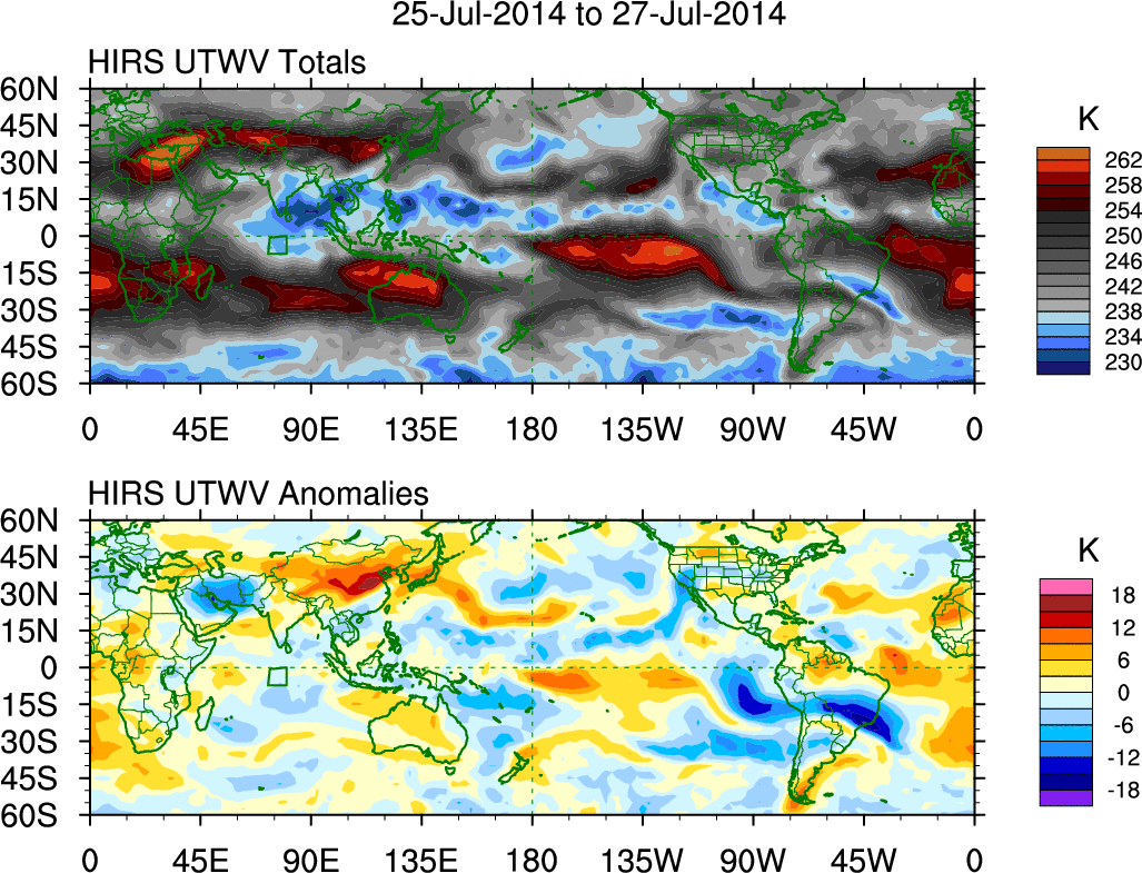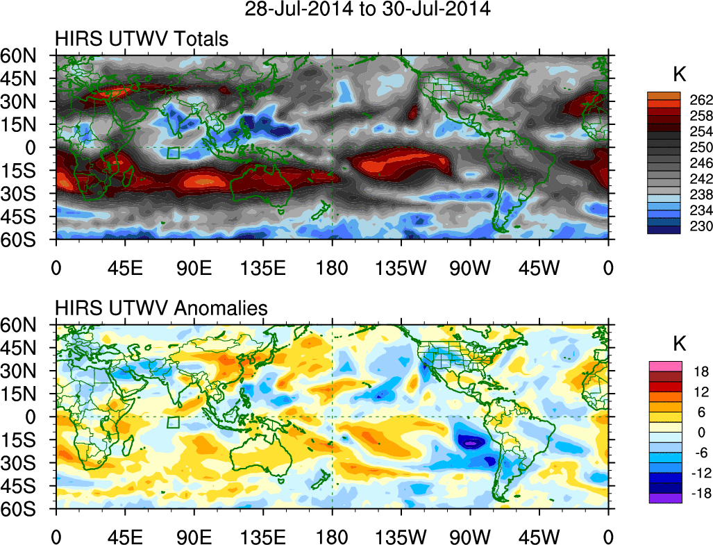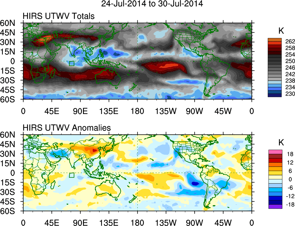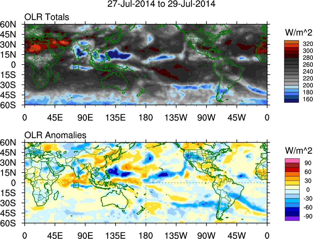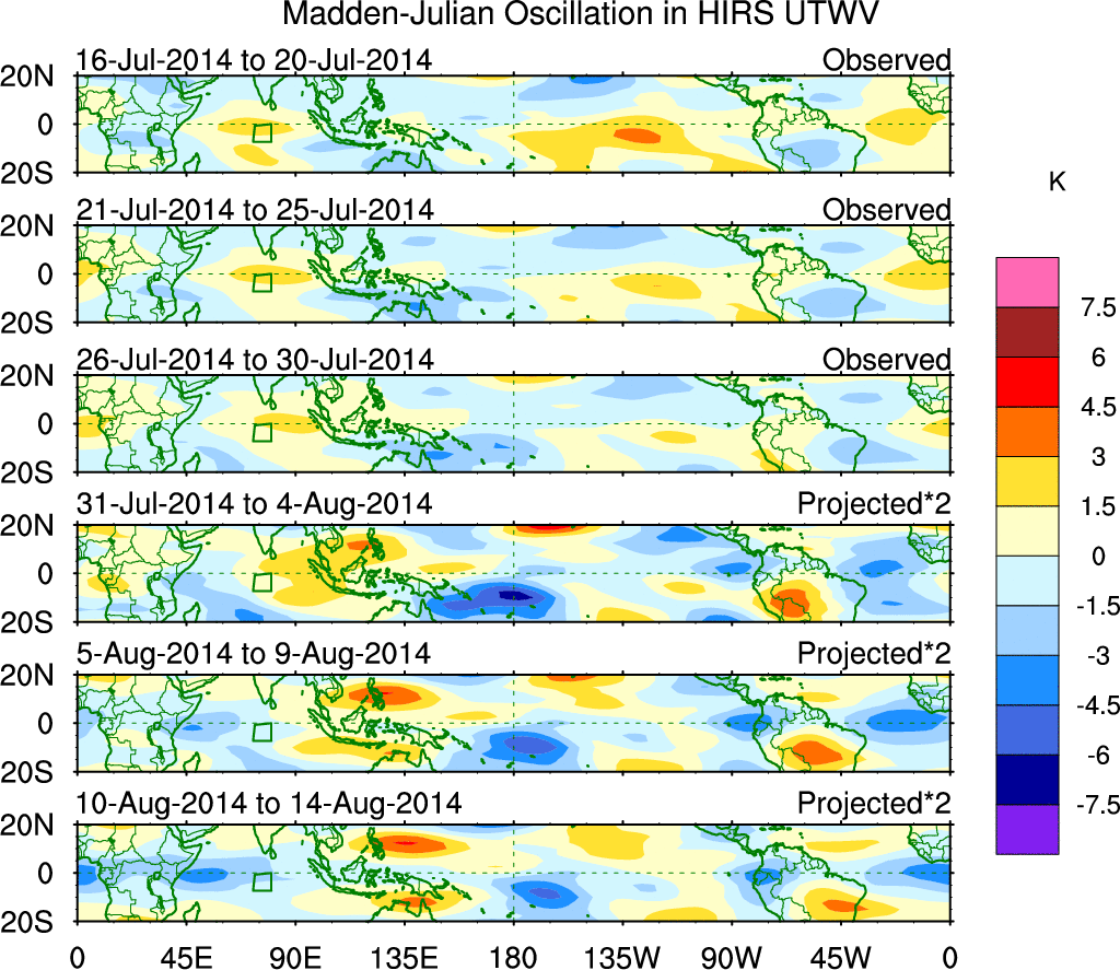 To identify tropical waves in near real-time, the OLR and UTWV data are filtered following Wheeler & Weickmann (2001 MWR). The daily anomalies are calculated using the first 3 harmonics of the seasonal cycle for 1979–2009. Missing values are then filled using linear interpolation in space and time. The most recent 365 days of anomalies are padded with 659 days of zeroes, and the result is filtered for each wave type.