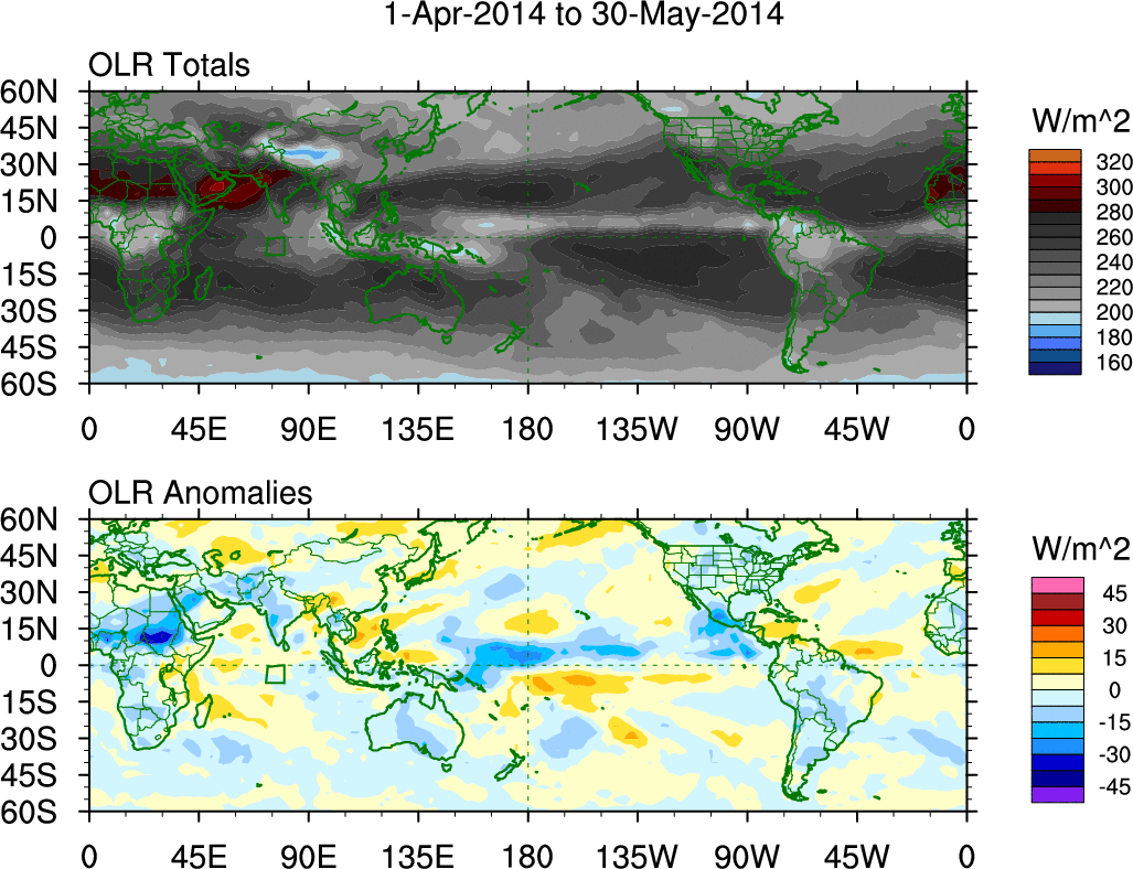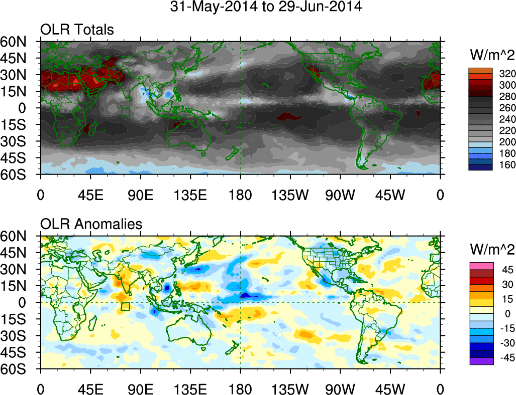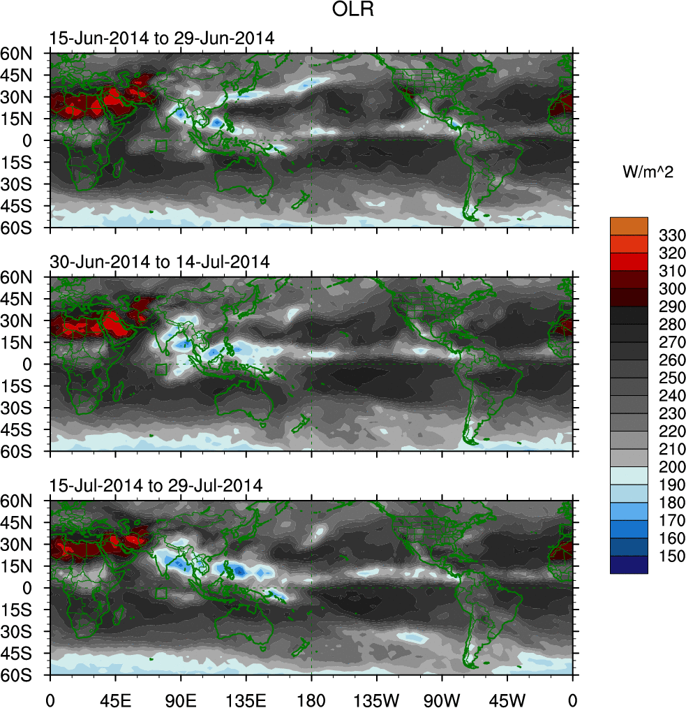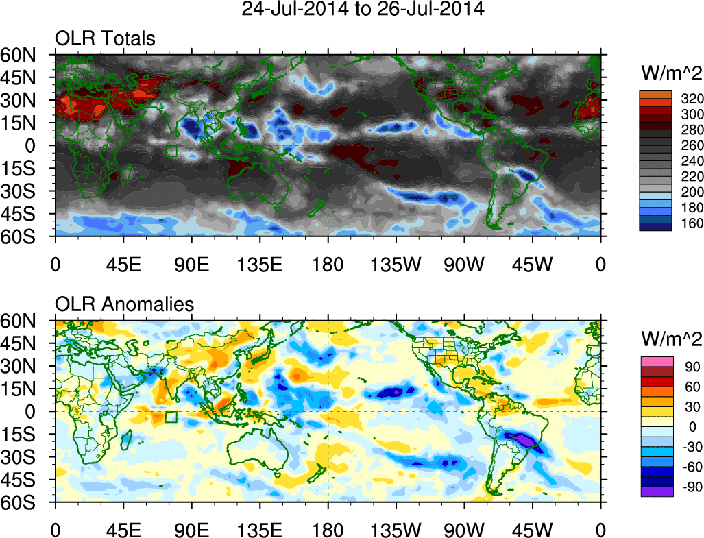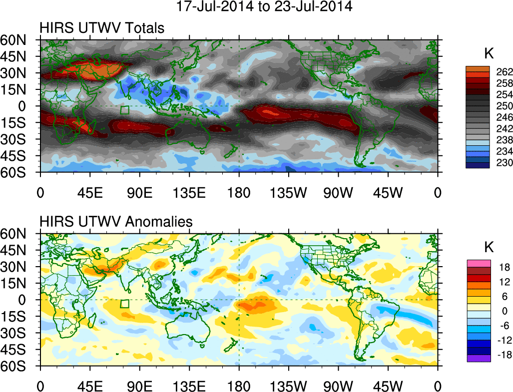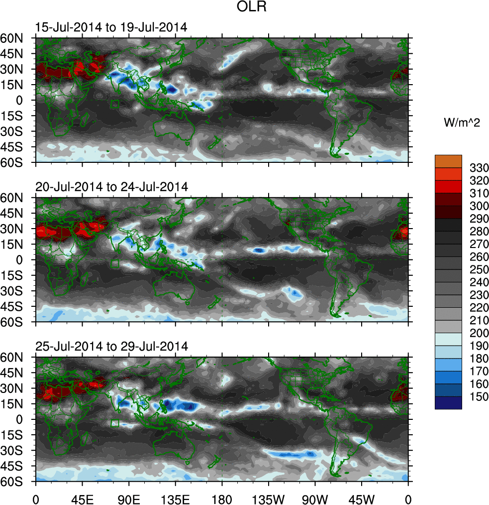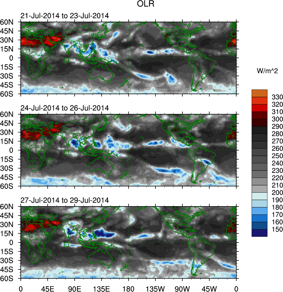 To identify tropical waves in near real-time, the OLR and UTWV data are filtered following Wheeler & Weickmann (2001 MWR). The daily anomalies are calculated using the first 3 harmonics of the seasonal cycle for 1979–2009. Missing values are then filled using linear interpolation in space and time. The most recent 365 days of anomalies are padded with 659 days of zeroes, and the result is filtered for each wave type.