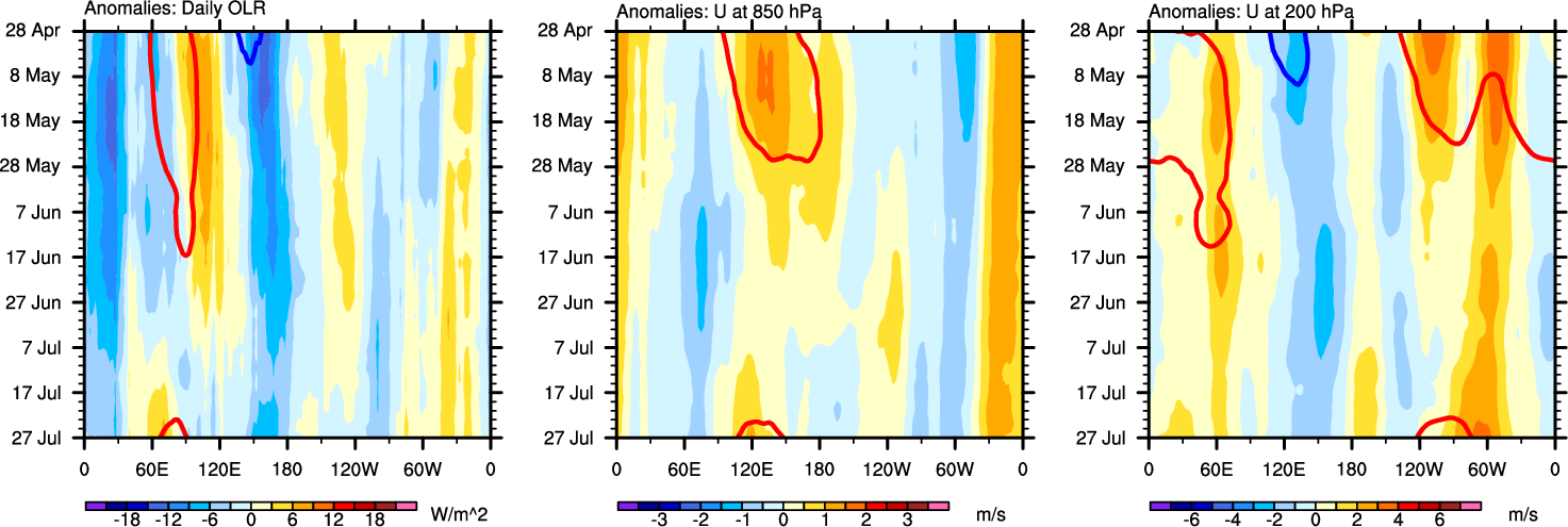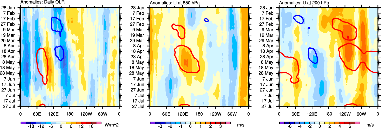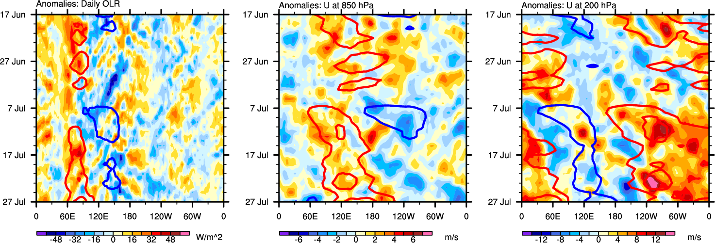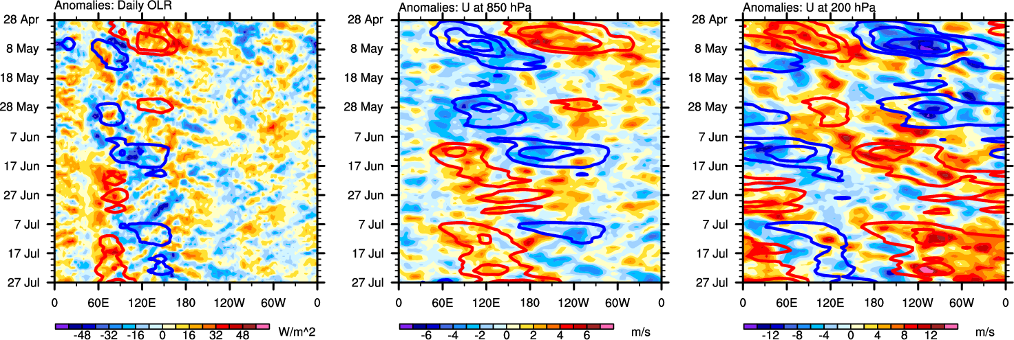 The Hovmöllers show longitude-time plots for OLR, U-850, and U-200. The shading indicates the observed anomalies, while the contours are the projection of those anomalies onto the RMM EOFs.