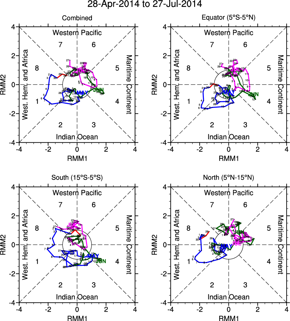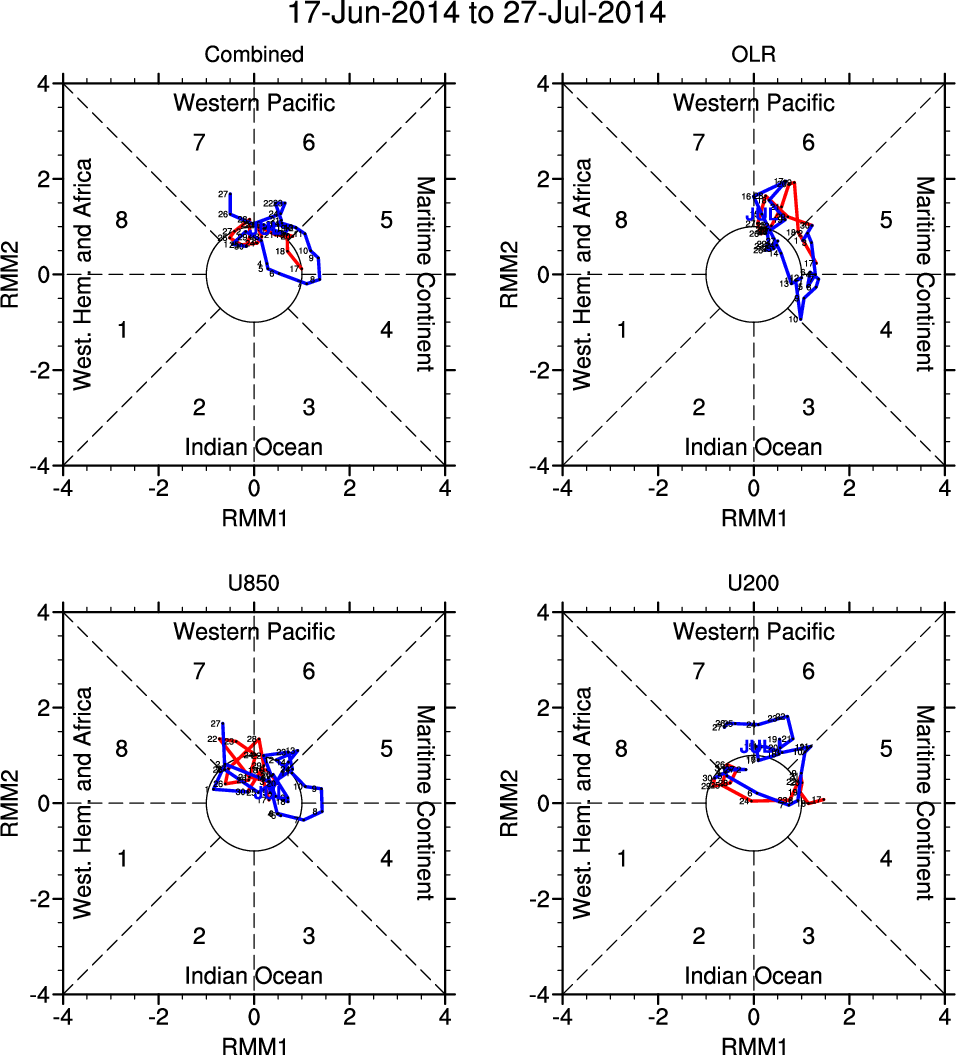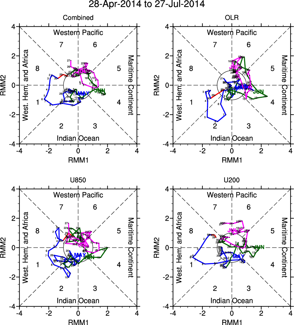 Wheeler and Hendon (2004) constructed the RMM index for monitoring the MJO. This index consists of the first two principal components (PCs) of OLR, 850-hPa zonal wind, and 200-hPa zonal wind averaged 15S-15N.