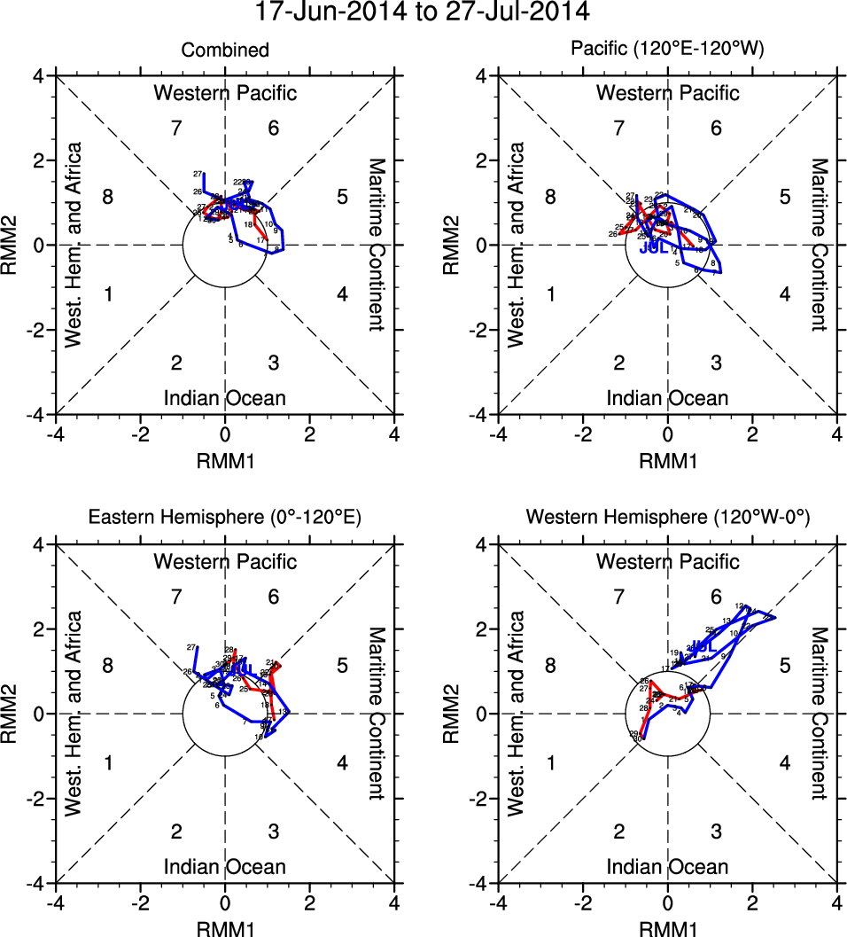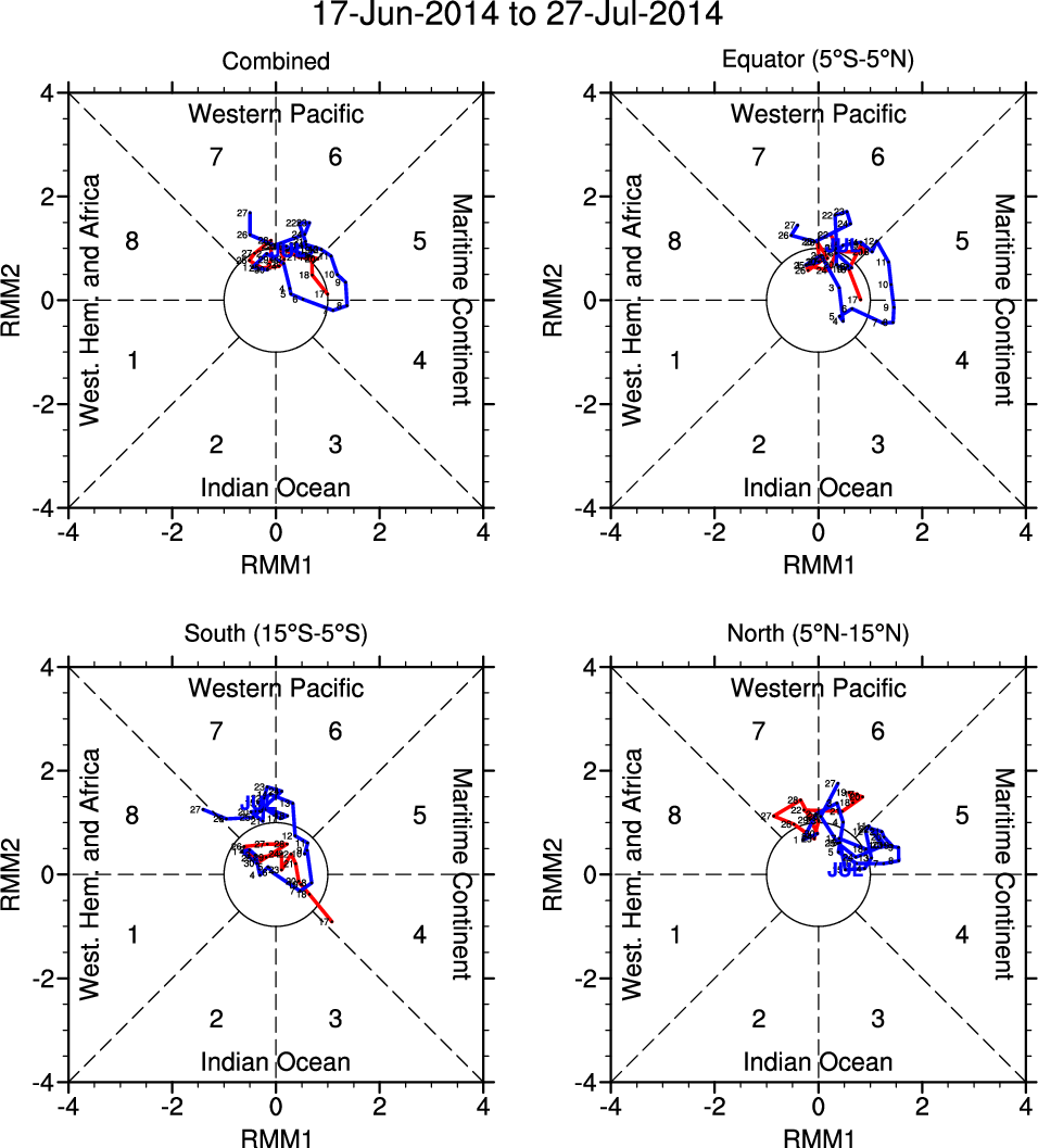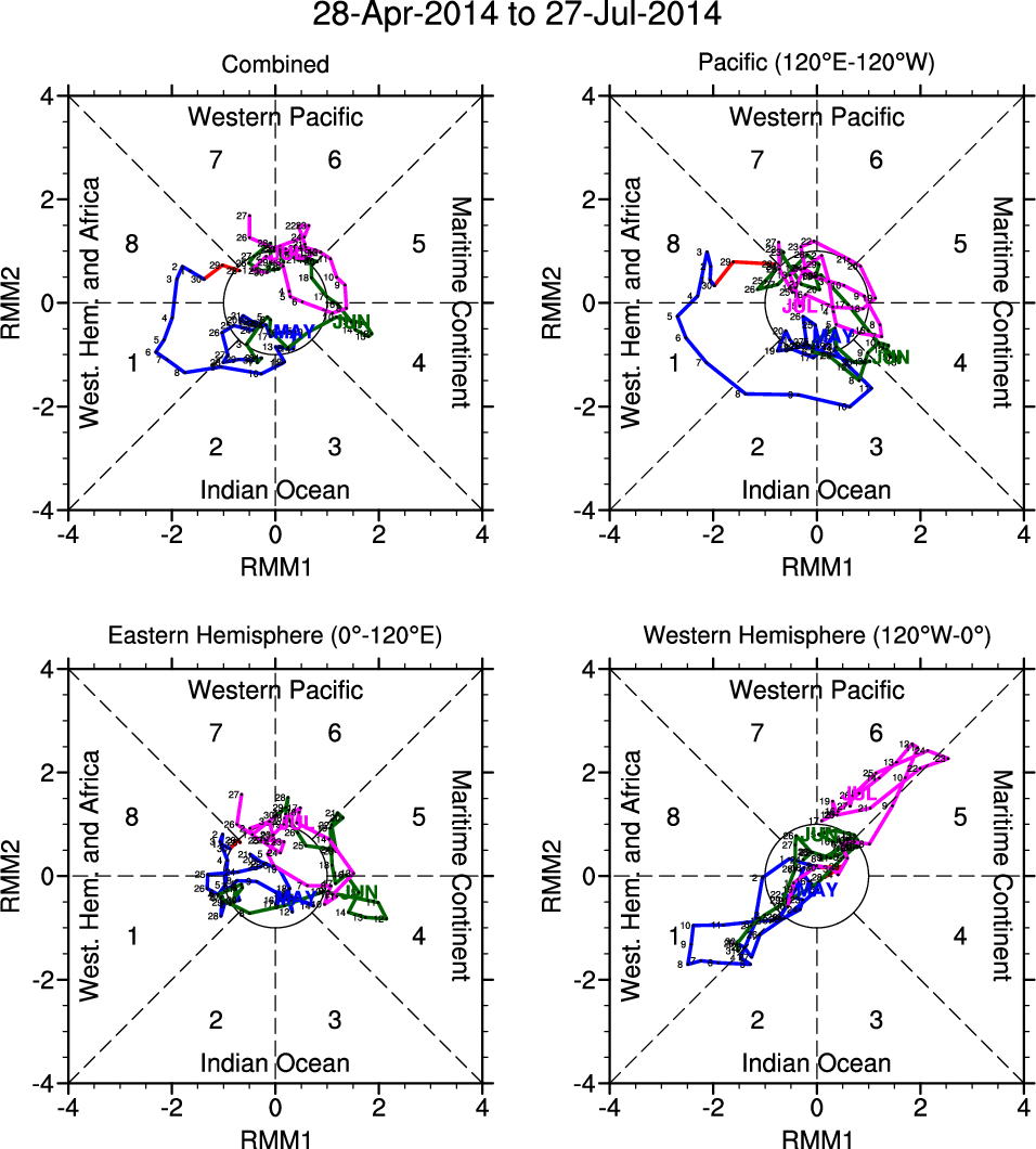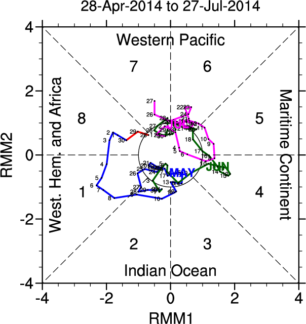 Wheeler and Hendon (2004) constructed the RMM index for monitoring the MJO. This index consists of the first two principal components (PCs) of OLR, 850-hPa zonal wind, and 200-hPa zonal wind averaged 15S-15N.