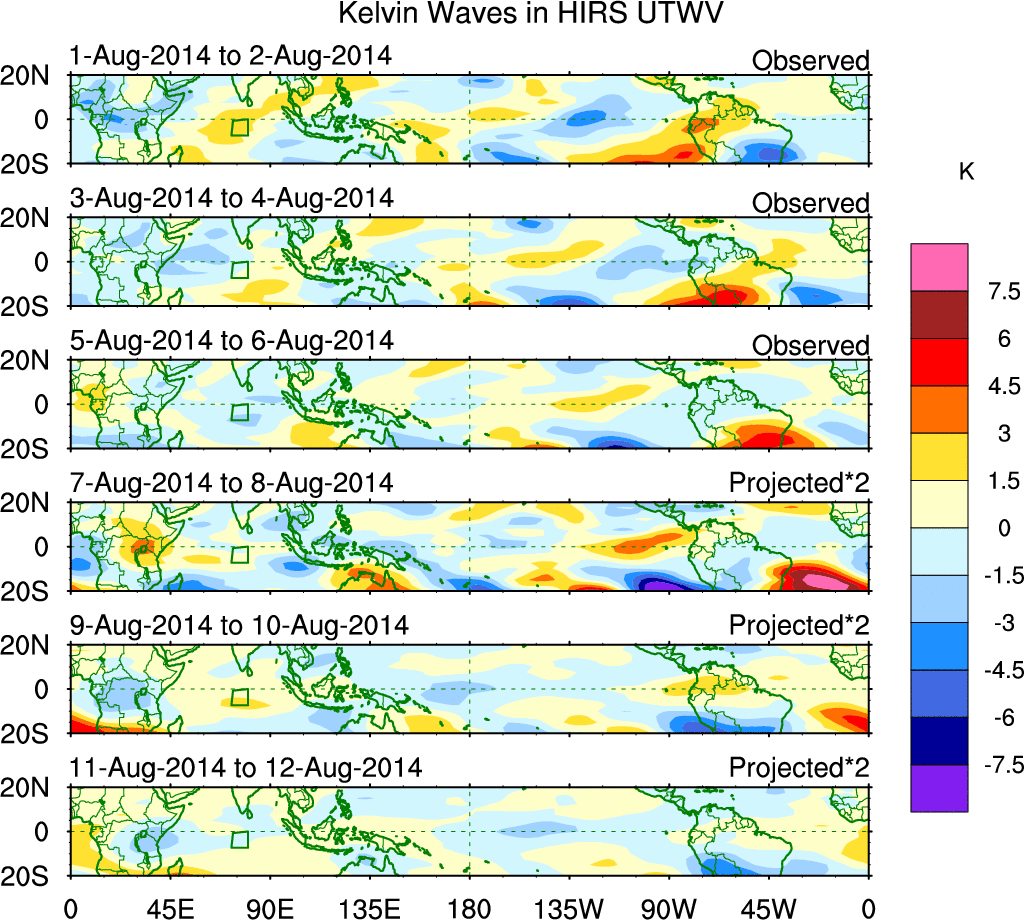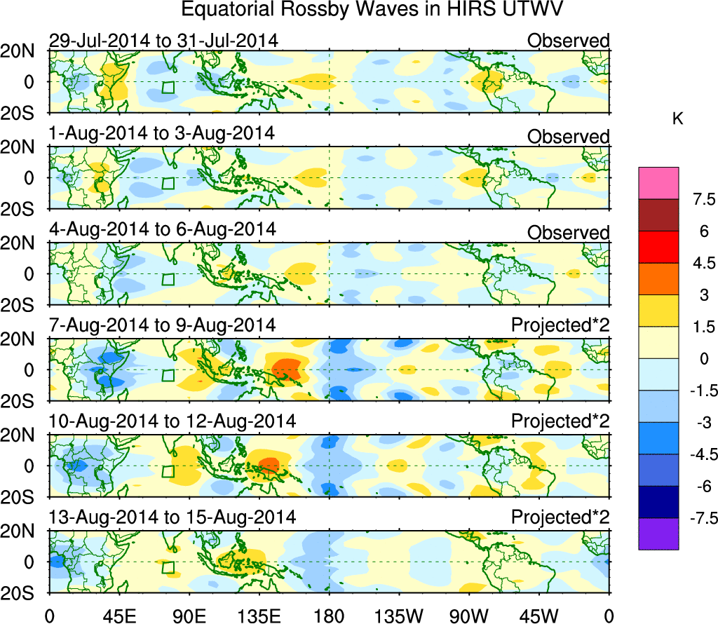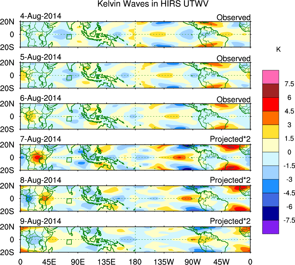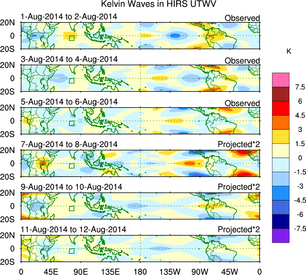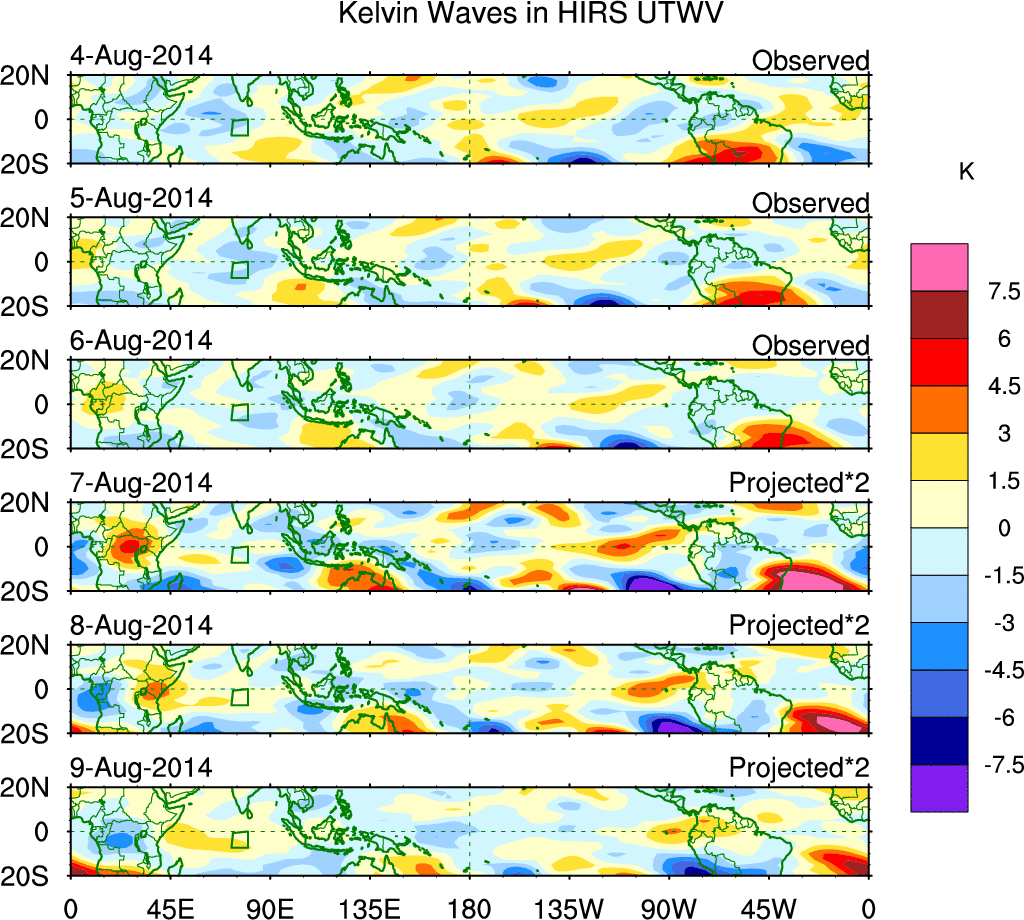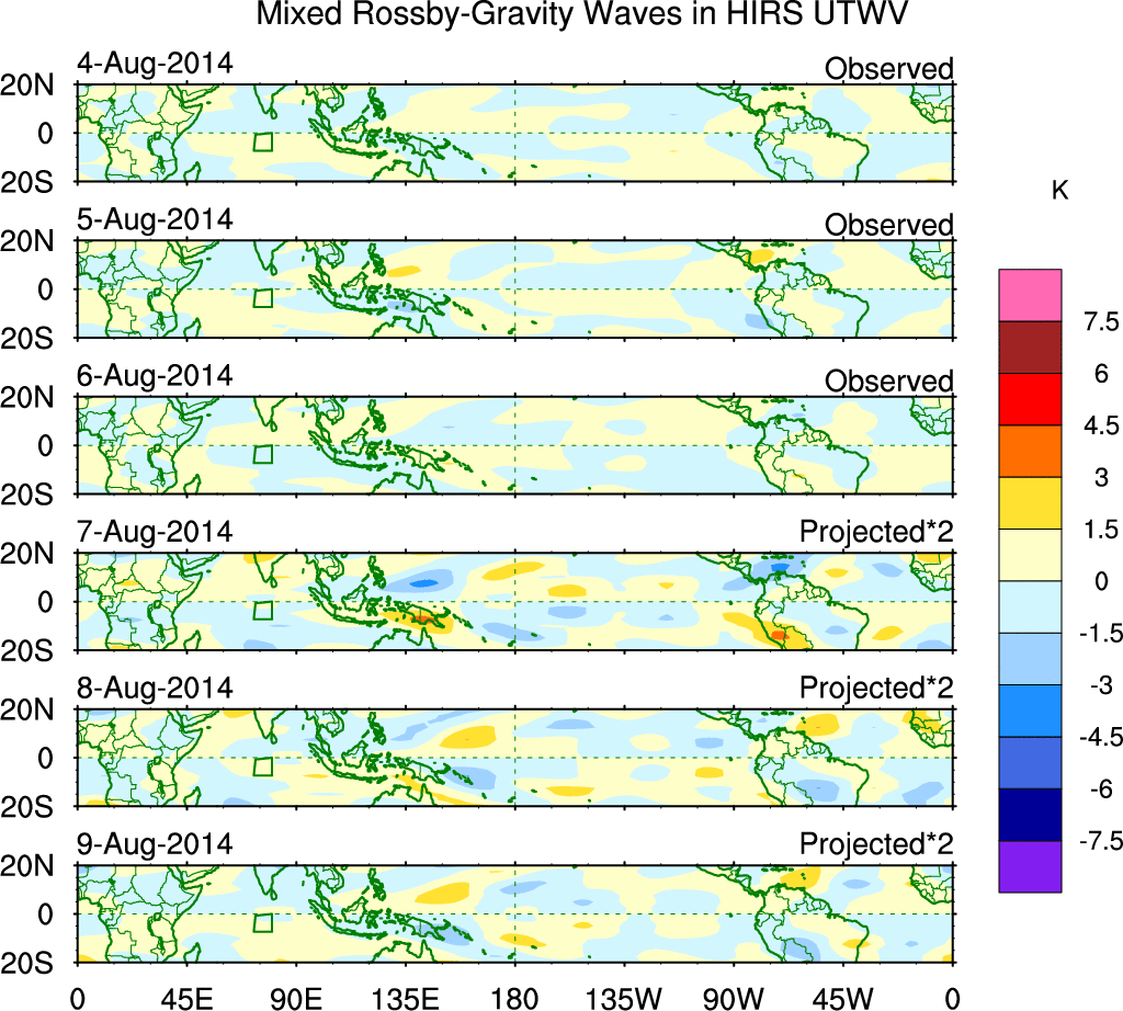 To identify tropical waves in near real-time, the OLR and UTWV data are filtered following Wheeler & Weickmann (2001 MWR). The daily anomalies are calculated using the first 3 harmonics of the seasonal cycle for 1979–2009. Missing values are then filled using linear interpolation in space and time. The most recent 365 days of anomalies are padded with 659 days of zeroes, and the result is filtered for each wave type.