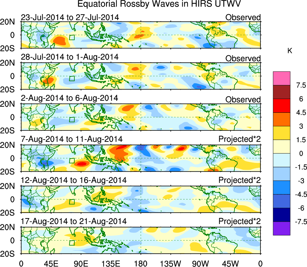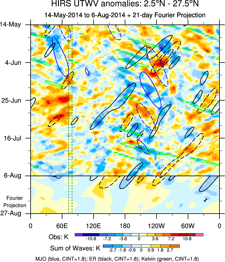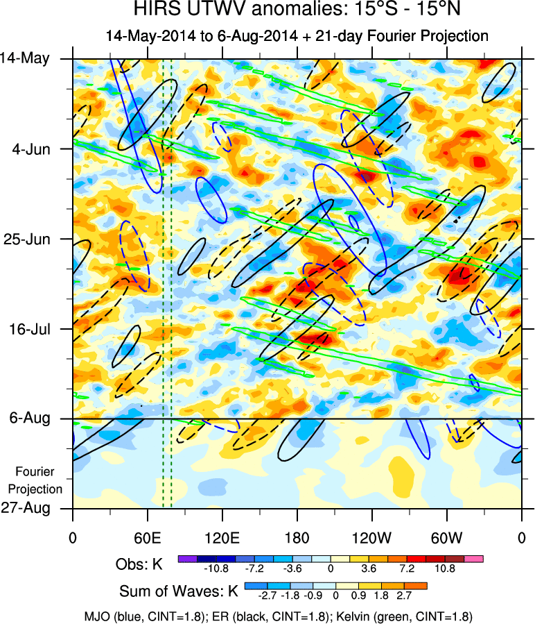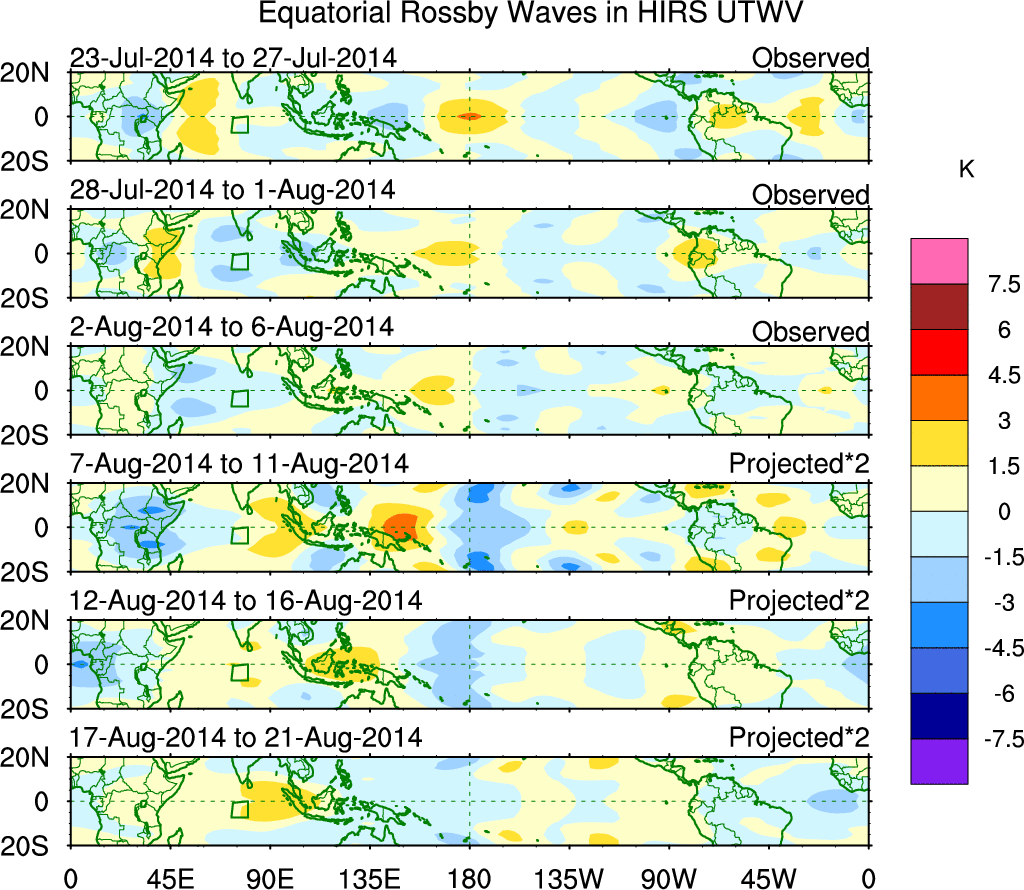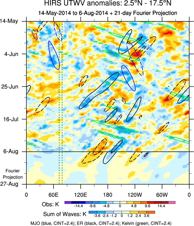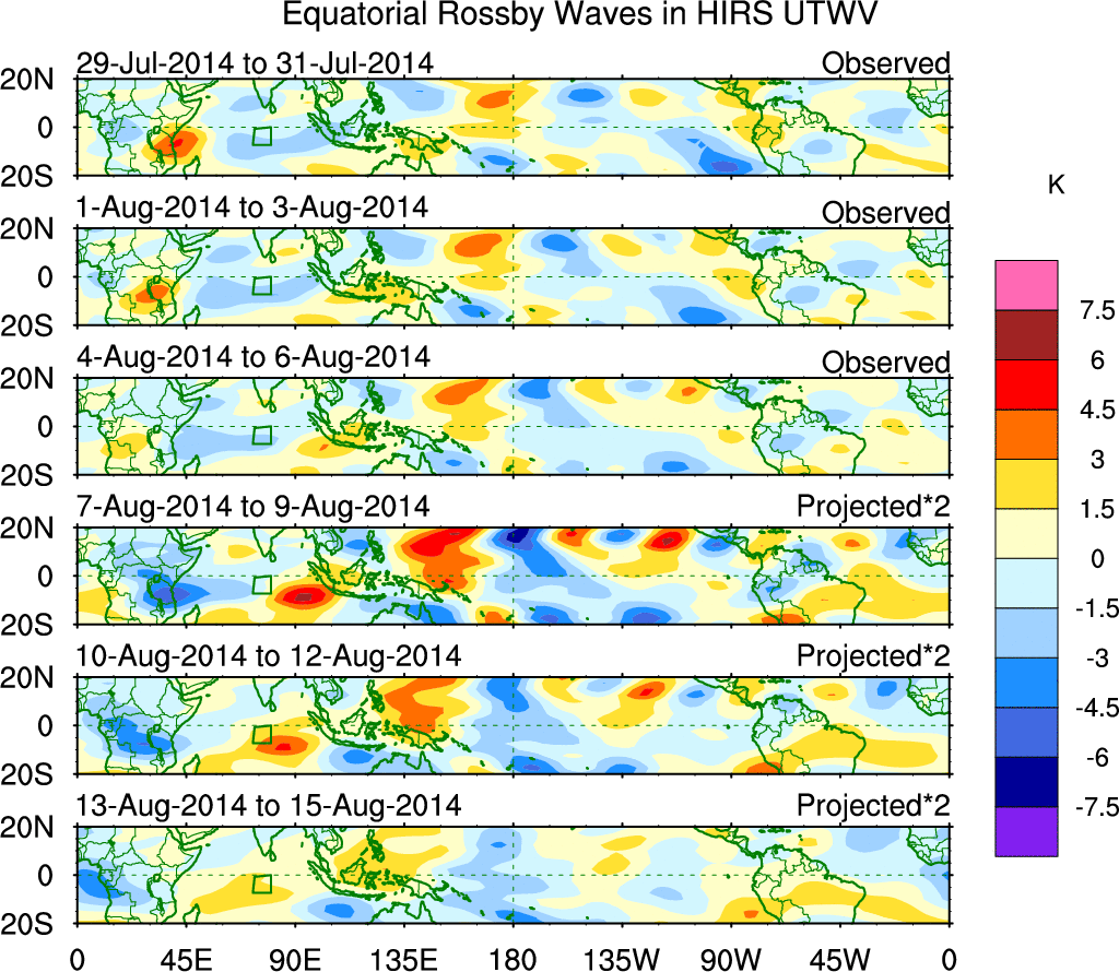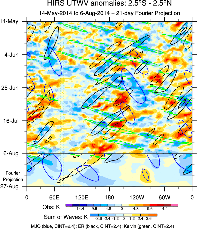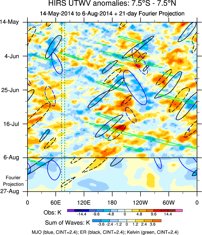 To identify tropical waves in near real-time, the OLR and UTWV data are filtered following Wheeler & Weickmann (2001 MWR). The daily anomalies are calculated using the first 3 harmonics of the seasonal cycle for 1979–2009. Missing values are then filled using linear interpolation in space and time. The most recent 365 days of anomalies are padded with 659 days of zeroes, and the result is filtered for each wave type.