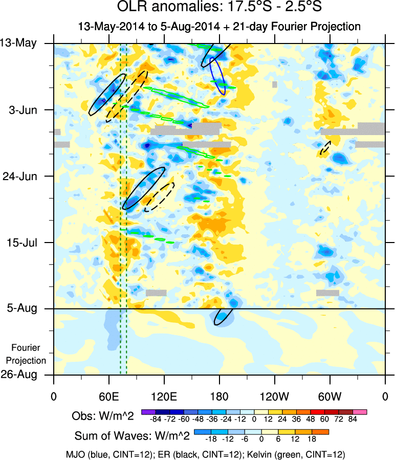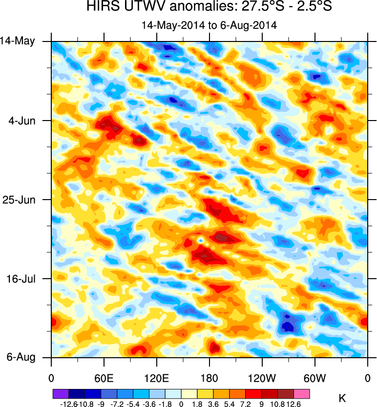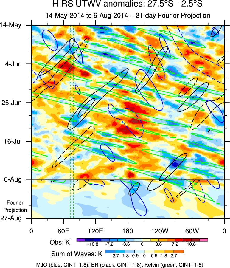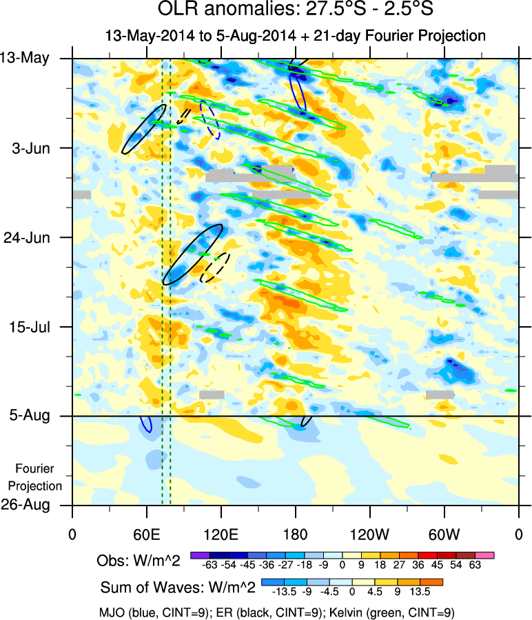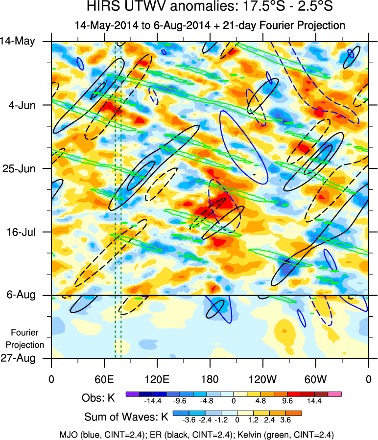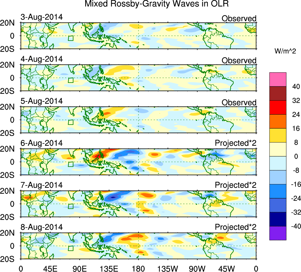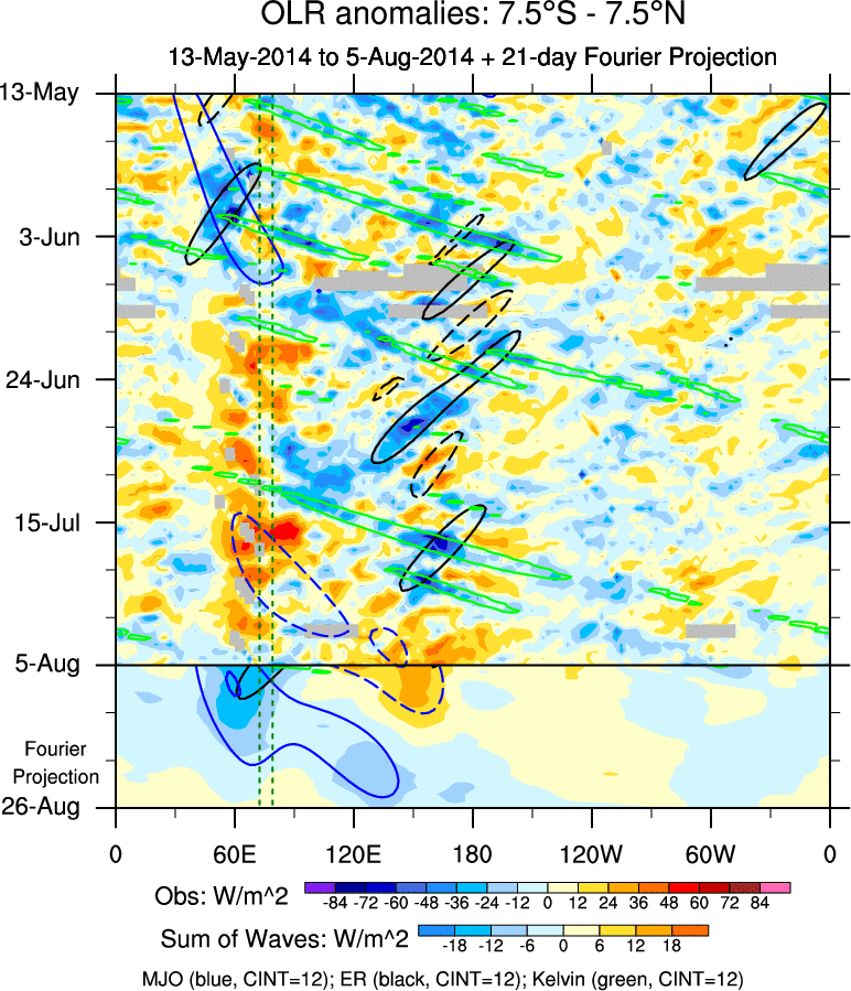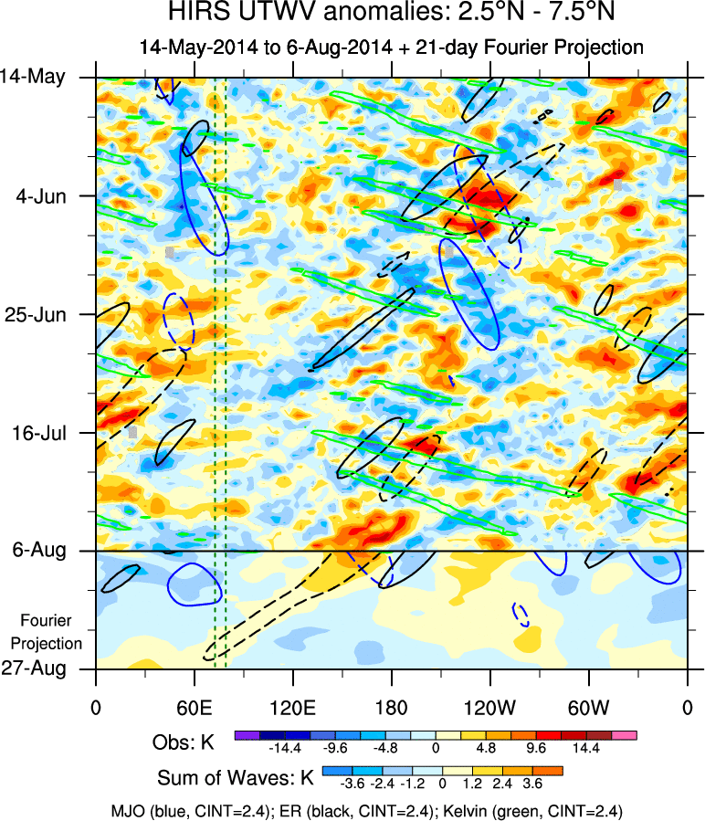 To identify tropical waves in near real-time, the OLR and UTWV data are filtered following Wheeler & Weickmann (2001 MWR). The daily anomalies are calculated using the first 3 harmonics of the seasonal cycle for 1979–2009. Missing values are then filled using linear interpolation in space and time. The most recent 365 days of anomalies are padded with 659 days of zeroes, and the result is filtered for each wave type.