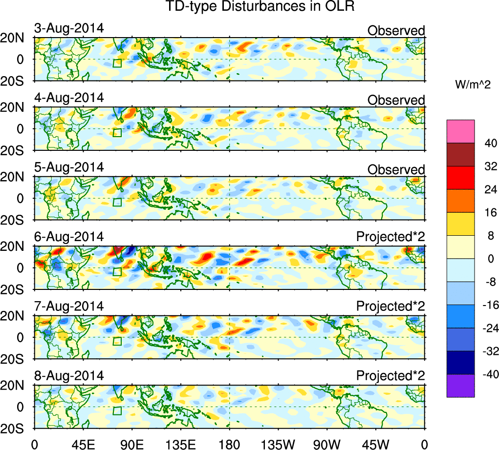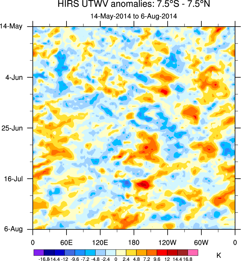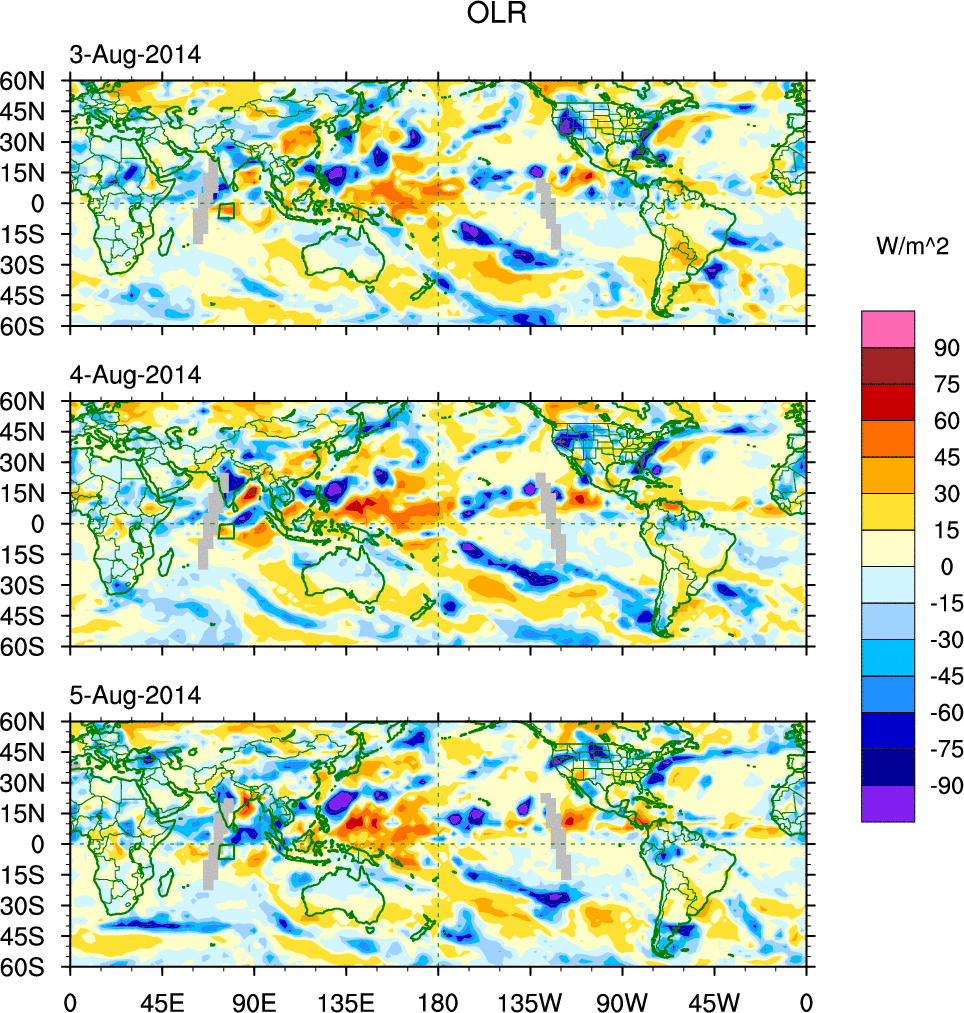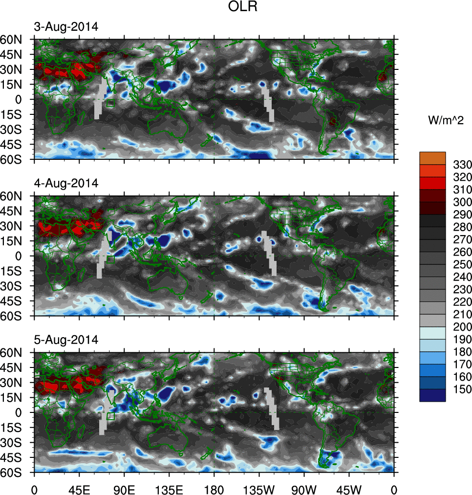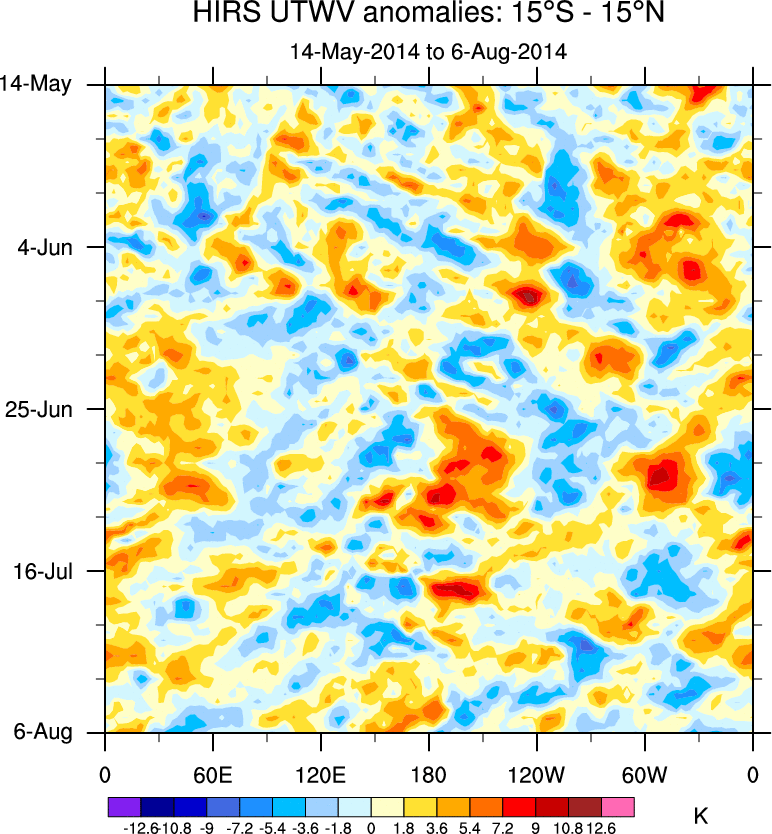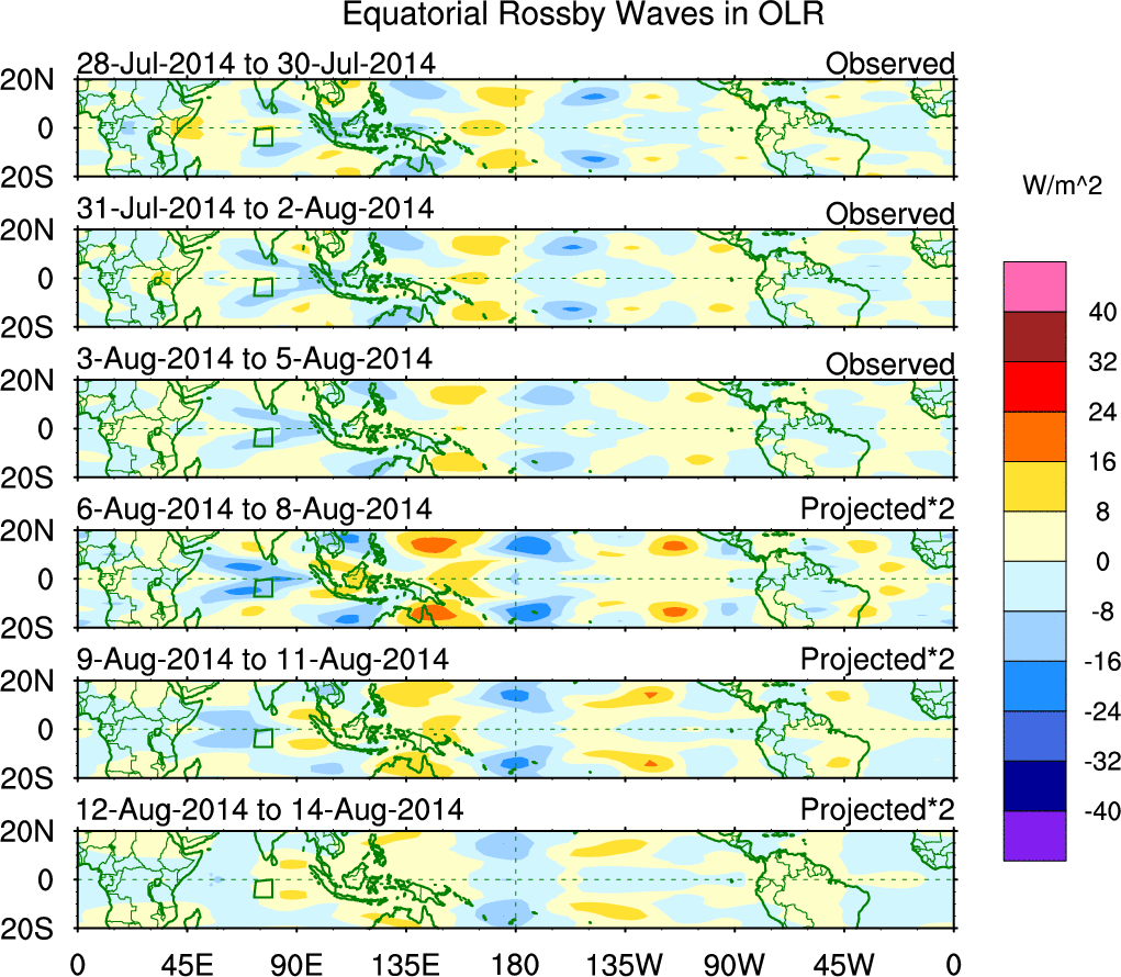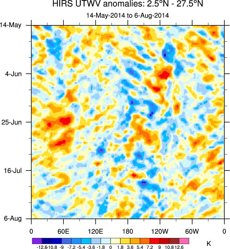 To identify tropical waves in near real-time, the OLR and UTWV data are filtered following Wheeler & Weickmann (2001 MWR). The daily anomalies are calculated using the first 3 harmonics of the seasonal cycle for 1979–2009. Missing values are then filled using linear interpolation in space and time. The most recent 365 days of anomalies are padded with 659 days of zeroes, and the result is filtered for each wave type.