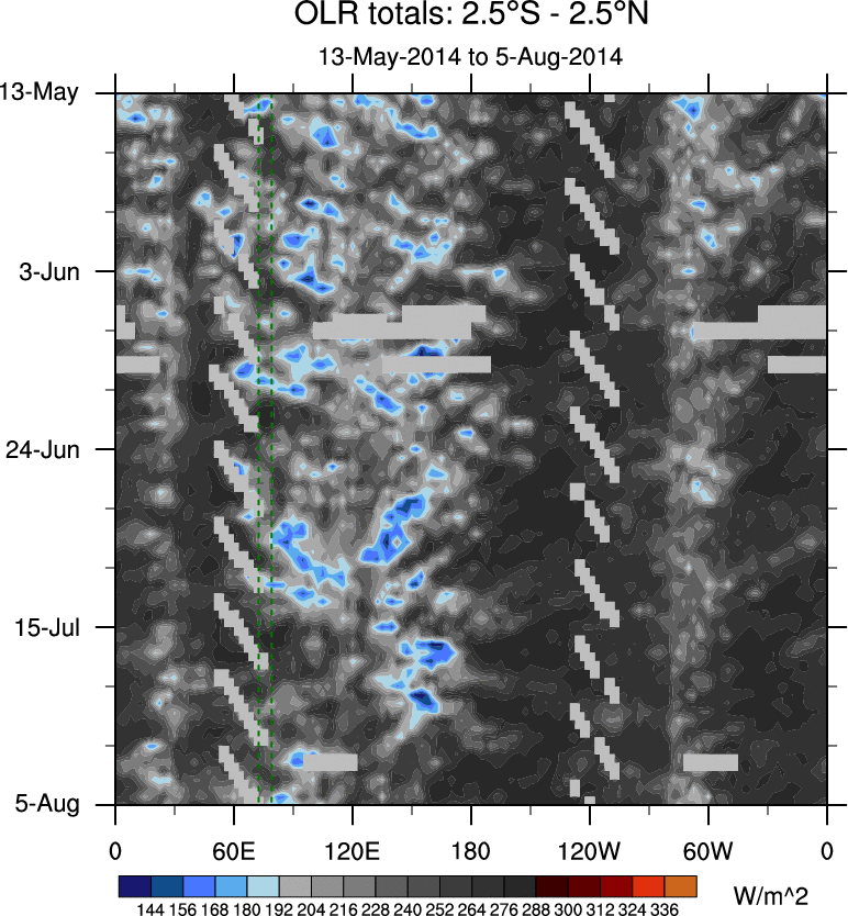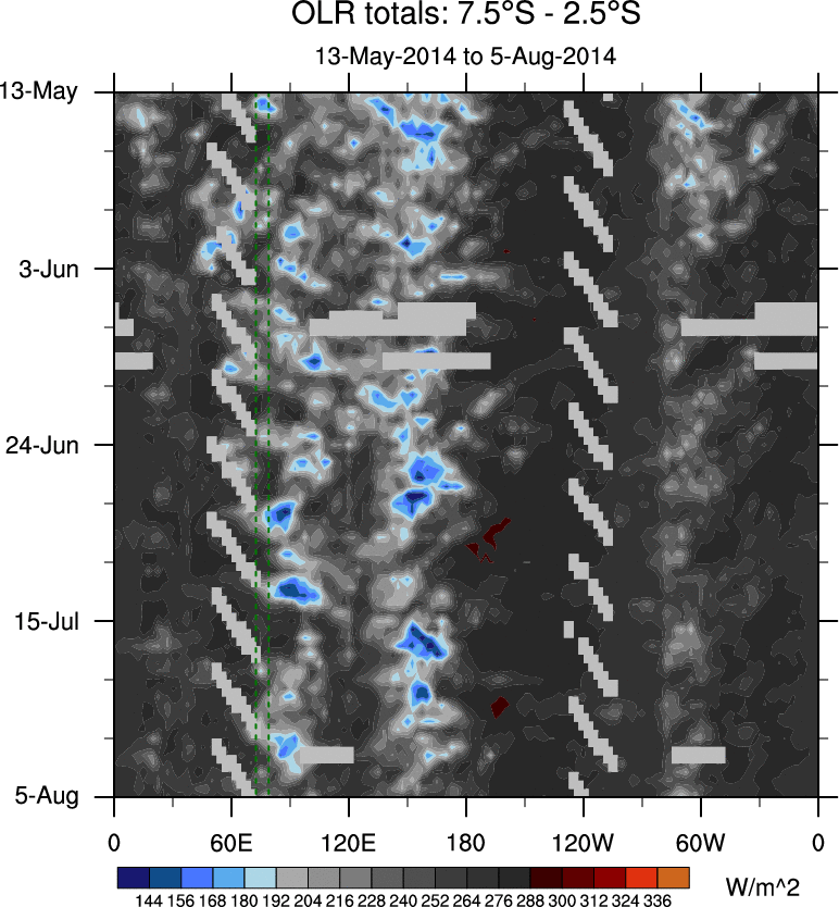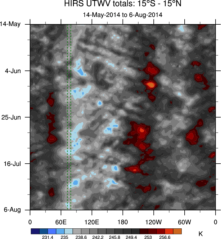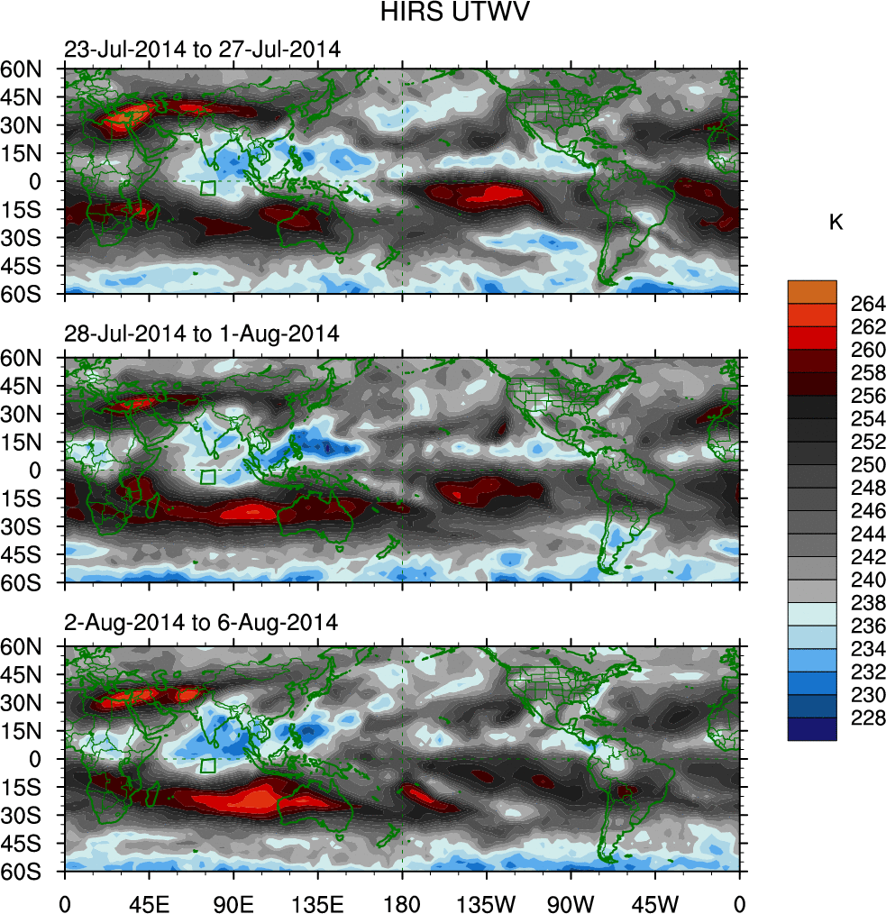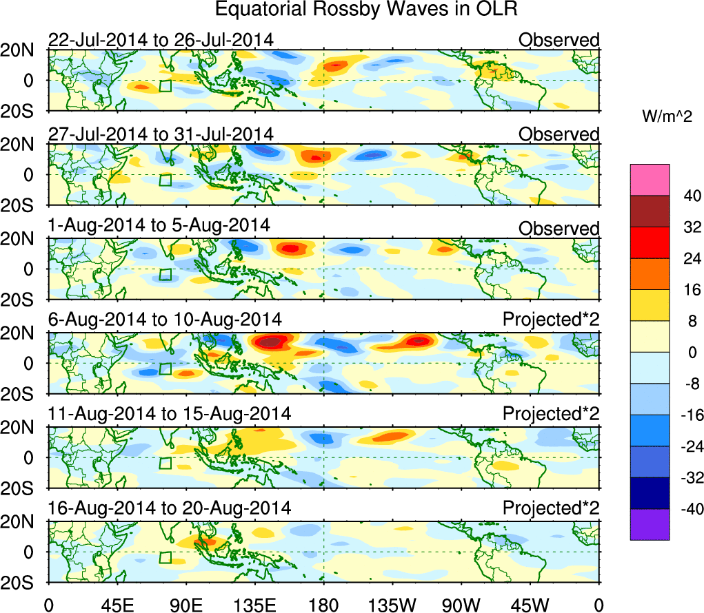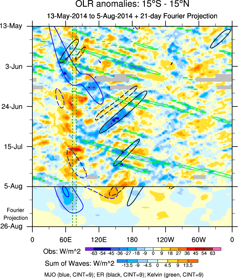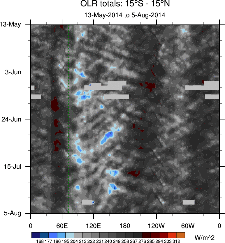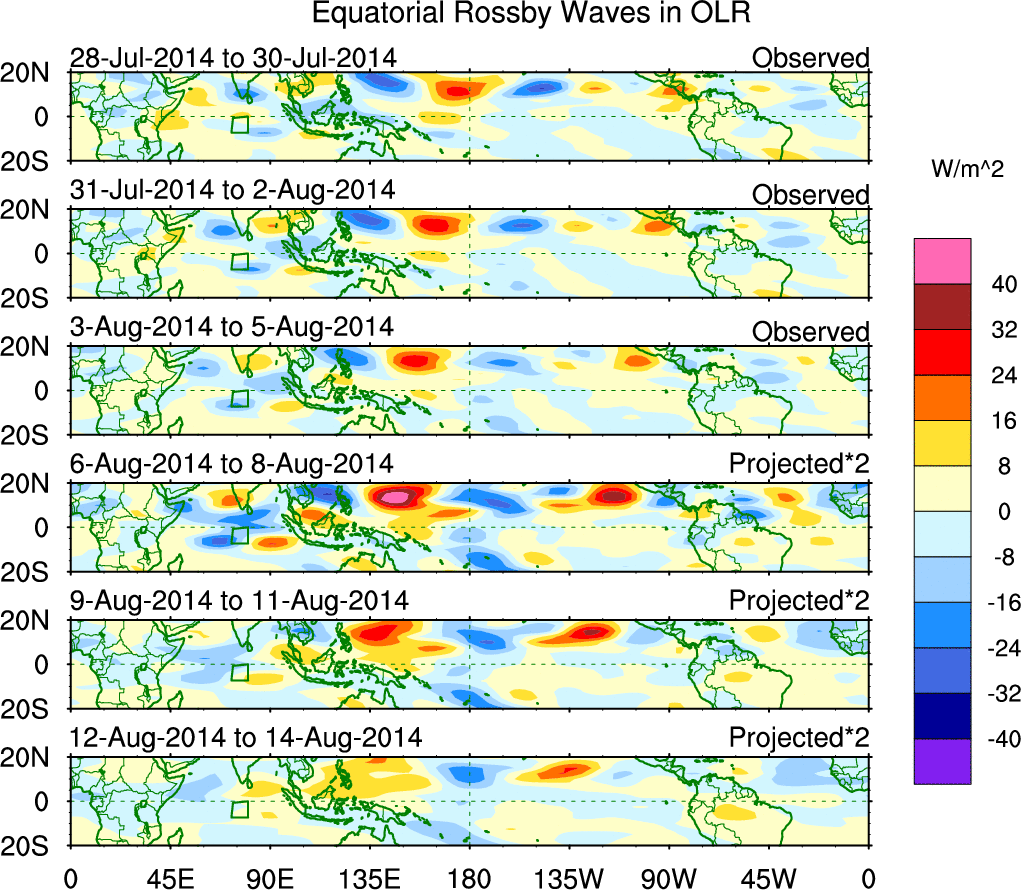 To identify tropical waves in near real-time, the OLR and UTWV data are filtered following Wheeler & Weickmann (2001 MWR). The daily anomalies are calculated using the first 3 harmonics of the seasonal cycle for 1979–2009. Missing values are then filled using linear interpolation in space and time. The most recent 365 days of anomalies are padded with 659 days of zeroes, and the result is filtered for each wave type.