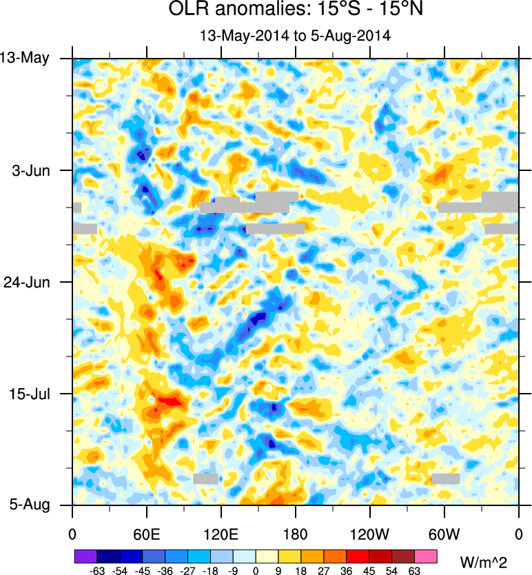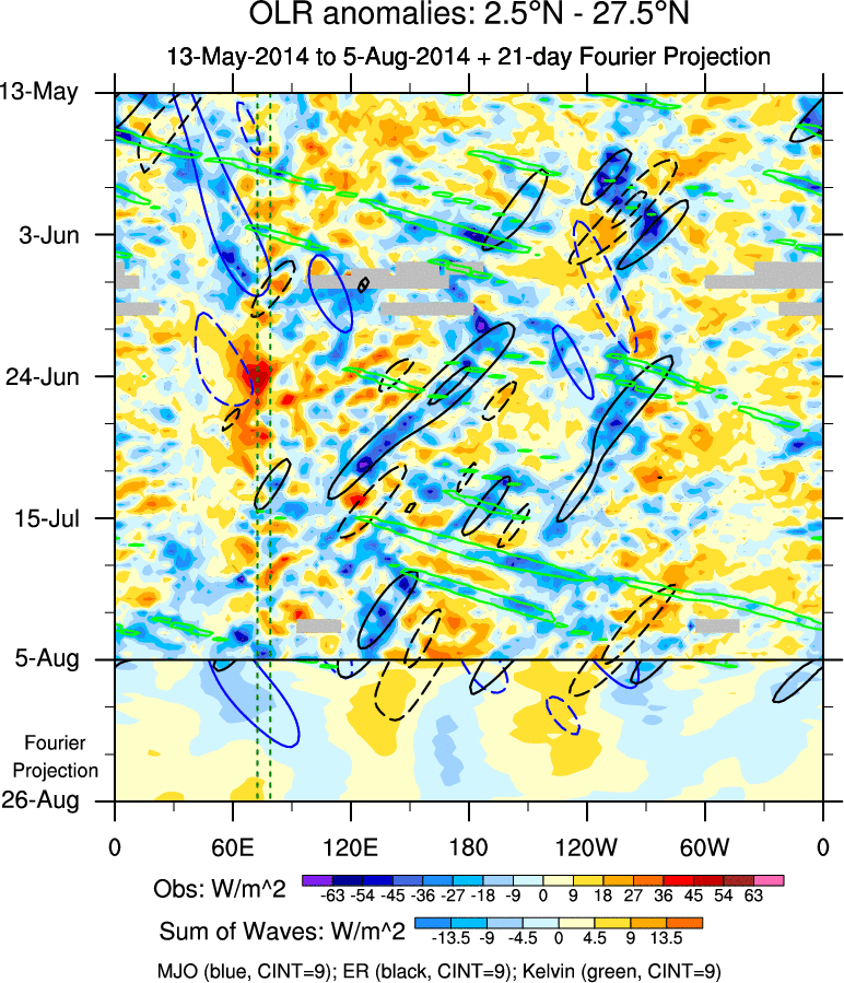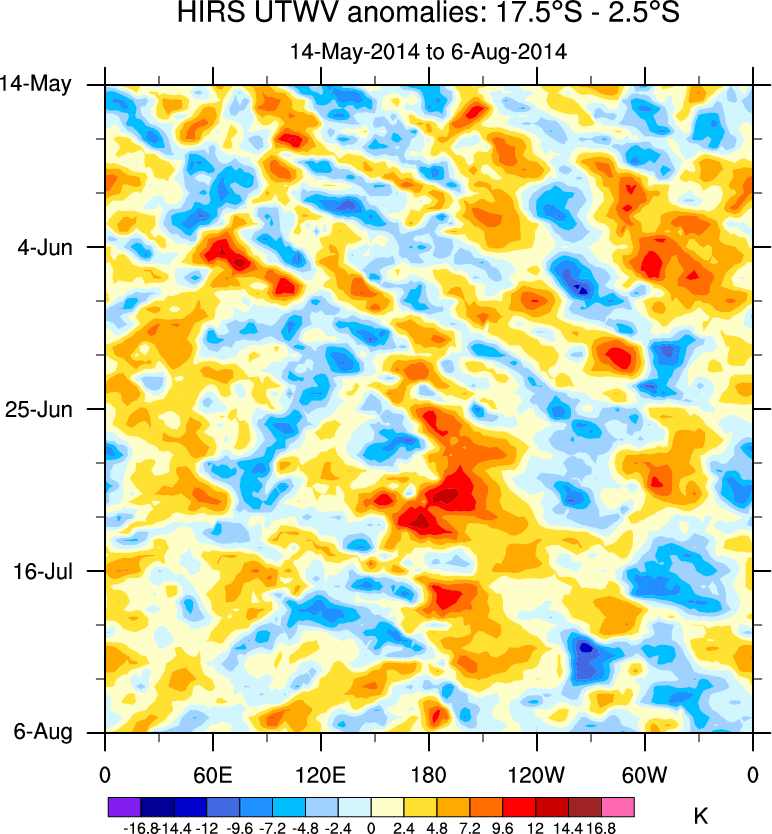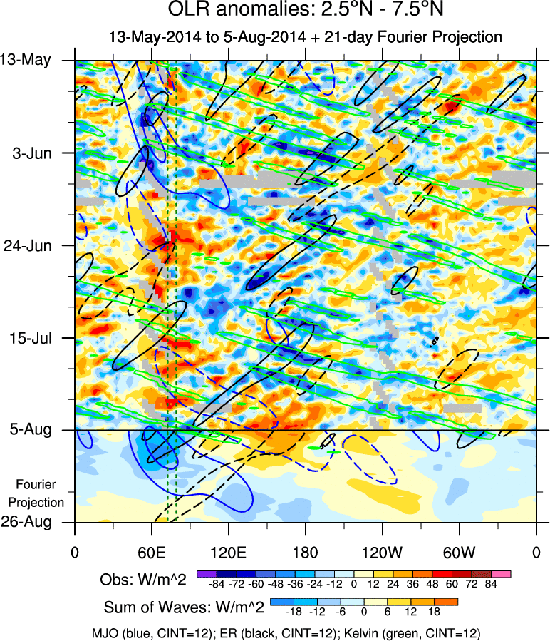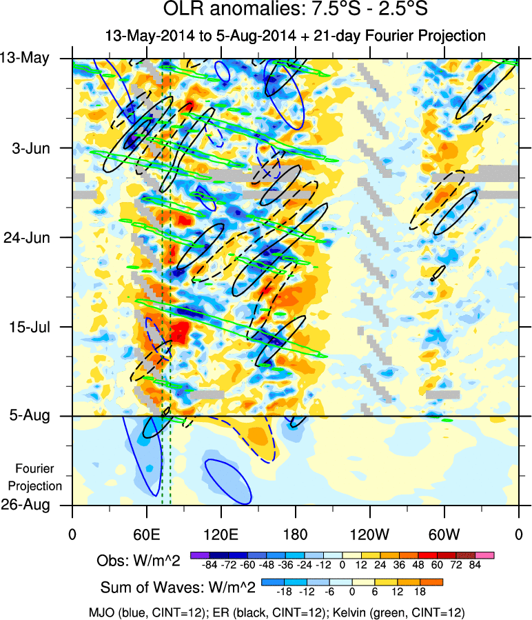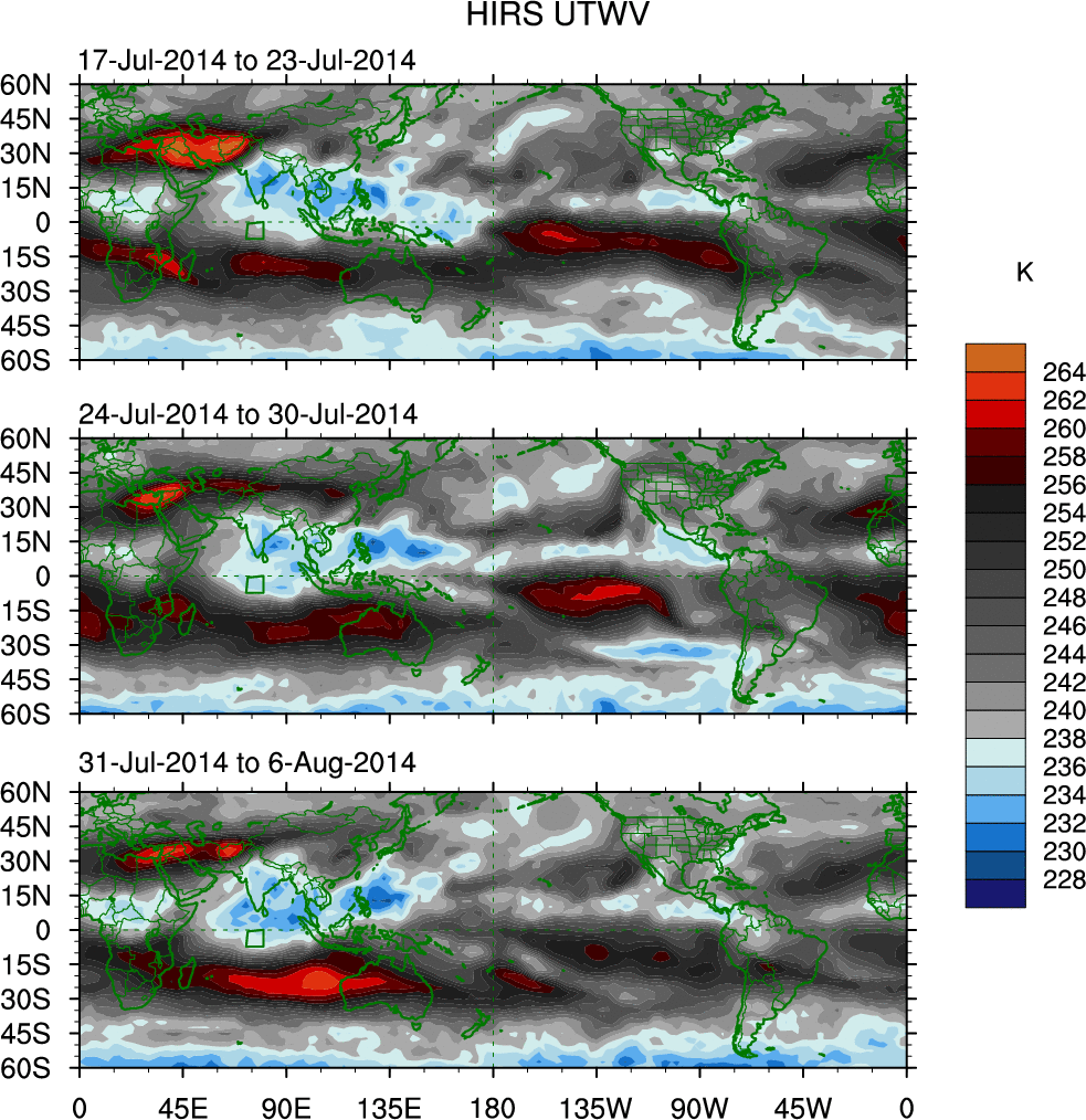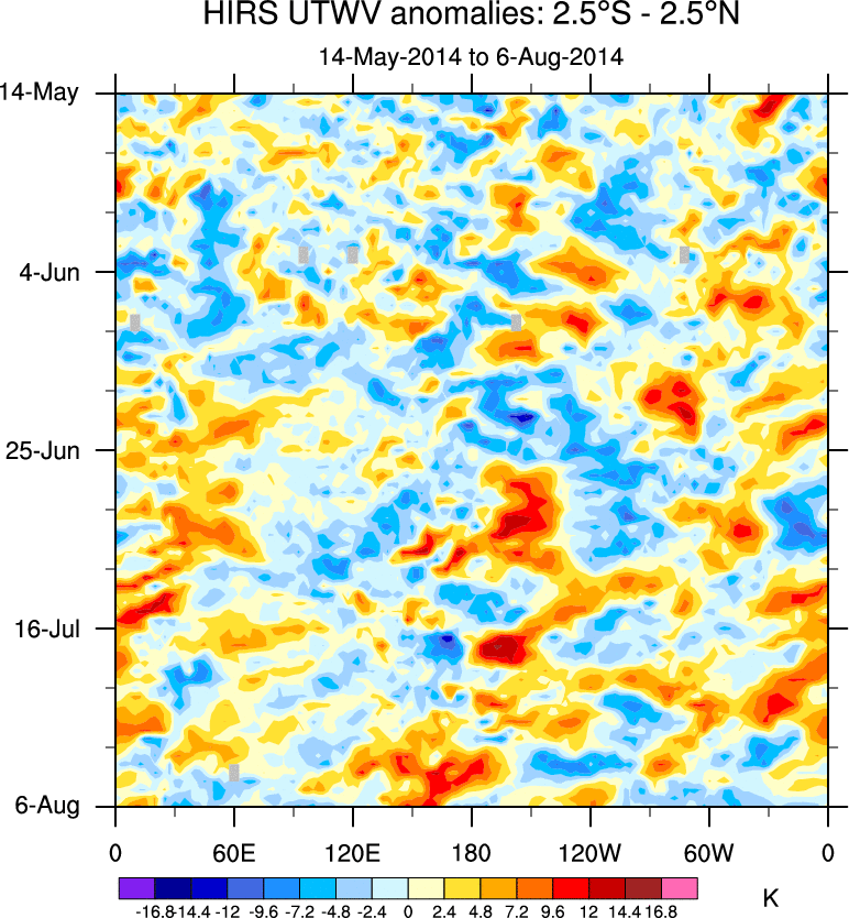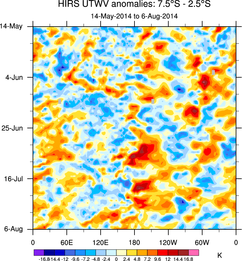 To identify tropical waves in near real-time, the OLR and UTWV data are filtered following Wheeler & Weickmann (2001 MWR). The daily anomalies are calculated using the first 3 harmonics of the seasonal cycle for 1979–2009. Missing values are then filled using linear interpolation in space and time. The most recent 365 days of anomalies are padded with 659 days of zeroes, and the result is filtered for each wave type.