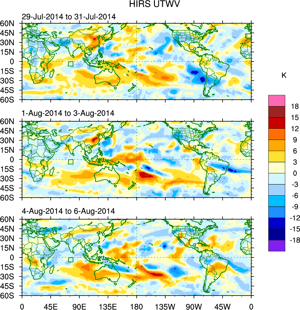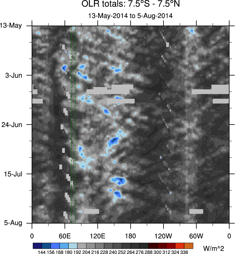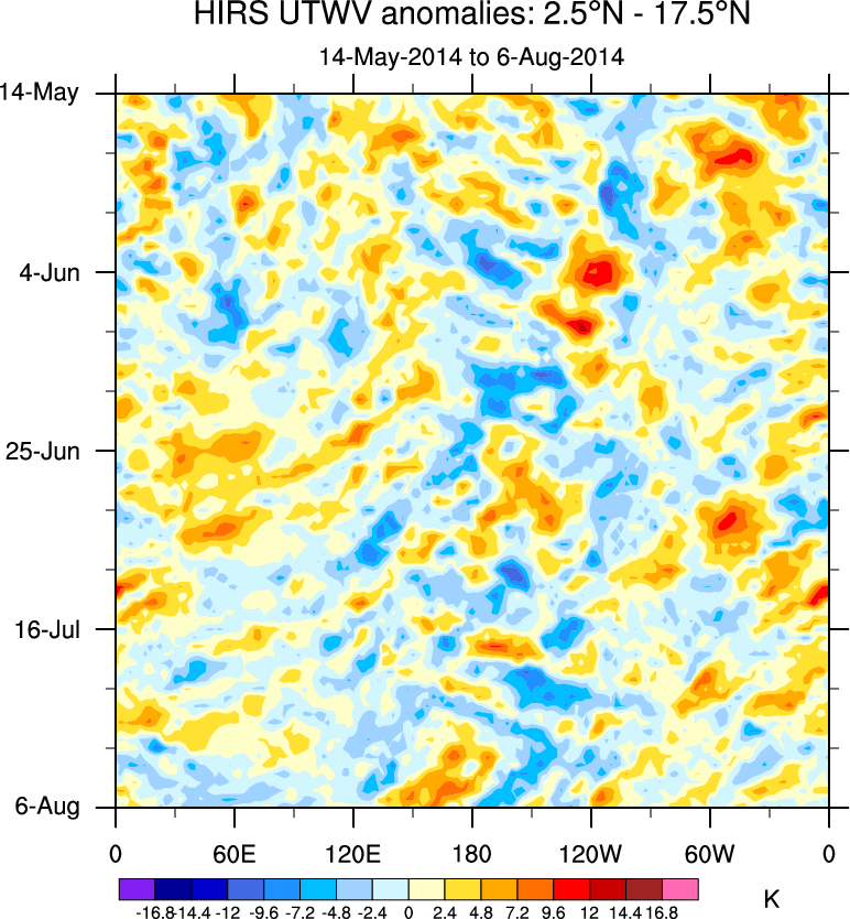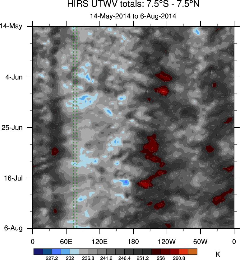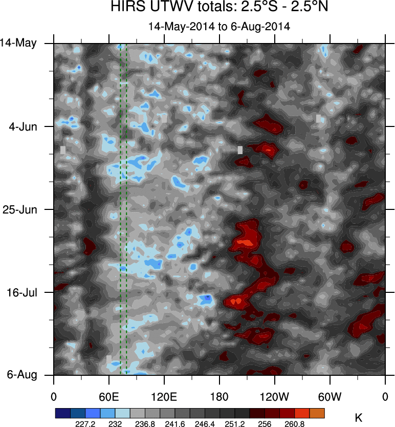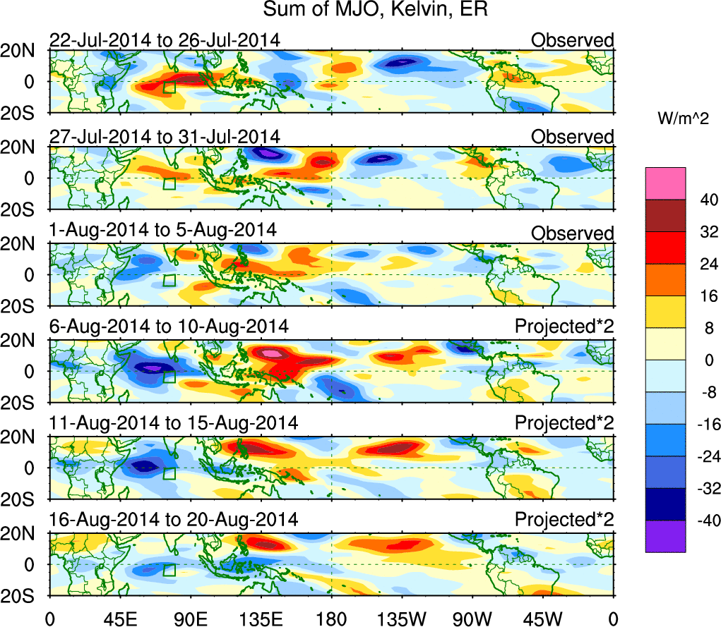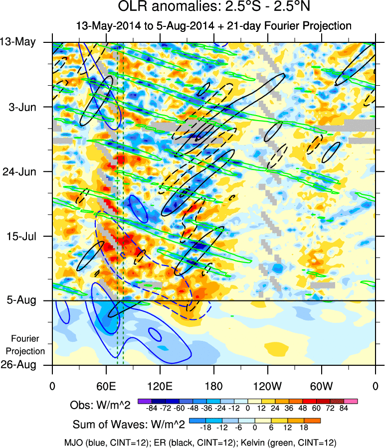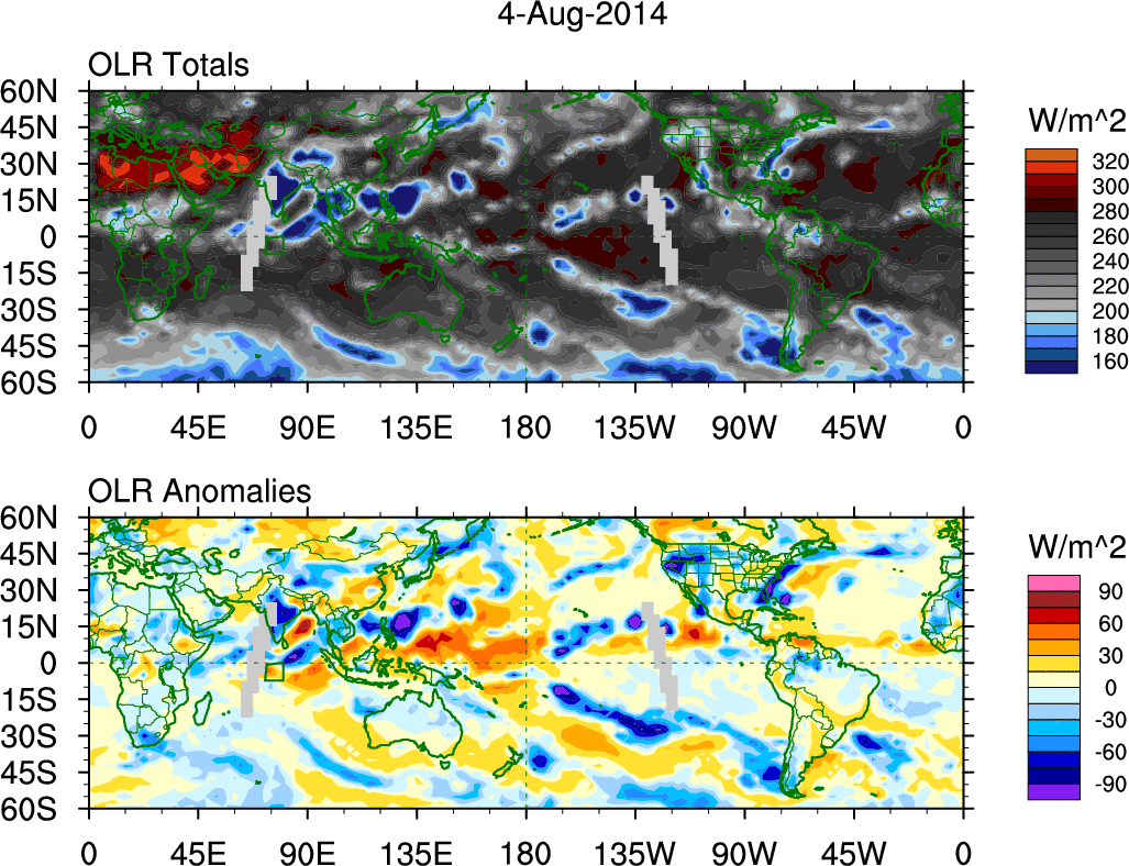 To identify tropical waves in near real-time, the OLR and UTWV data are filtered following Wheeler & Weickmann (2001 MWR). The daily anomalies are calculated using the first 3 harmonics of the seasonal cycle for 1979–2009. Missing values are then filled using linear interpolation in space and time. The most recent 365 days of anomalies are padded with 659 days of zeroes, and the result is filtered for each wave type.