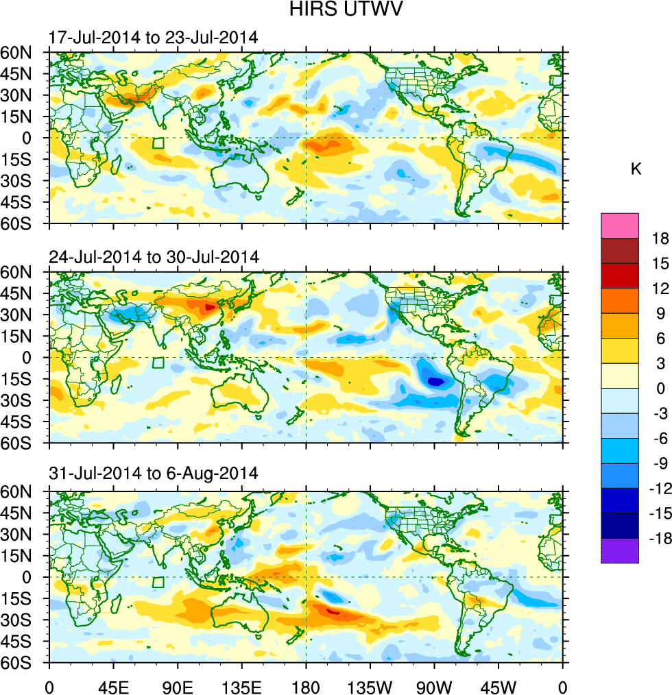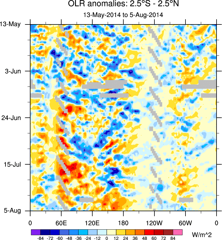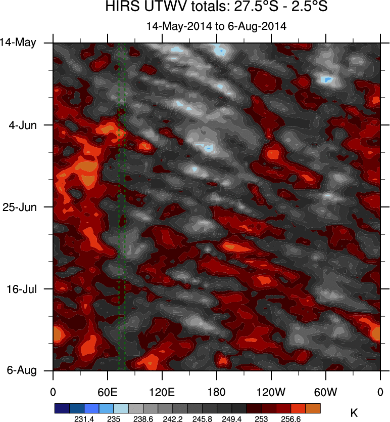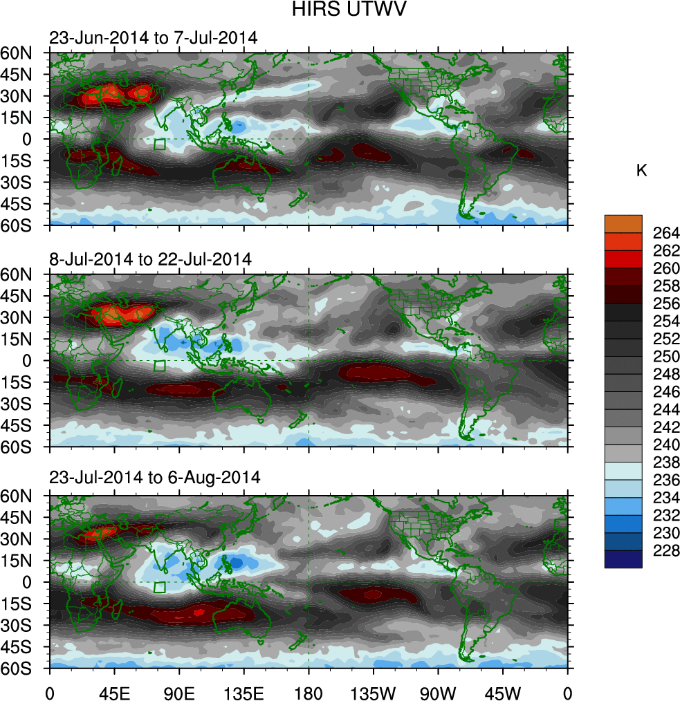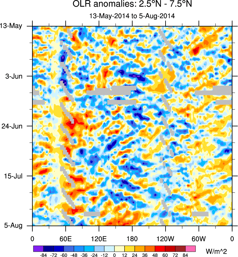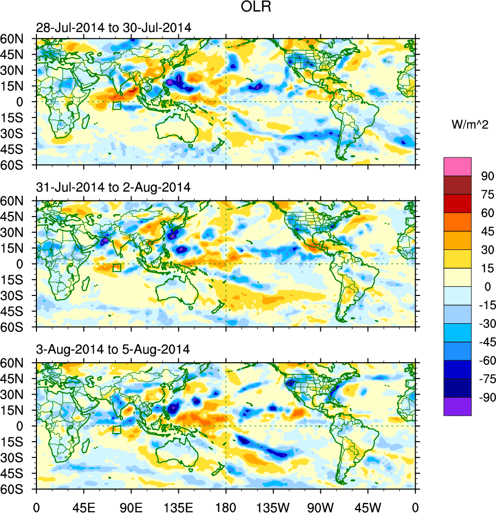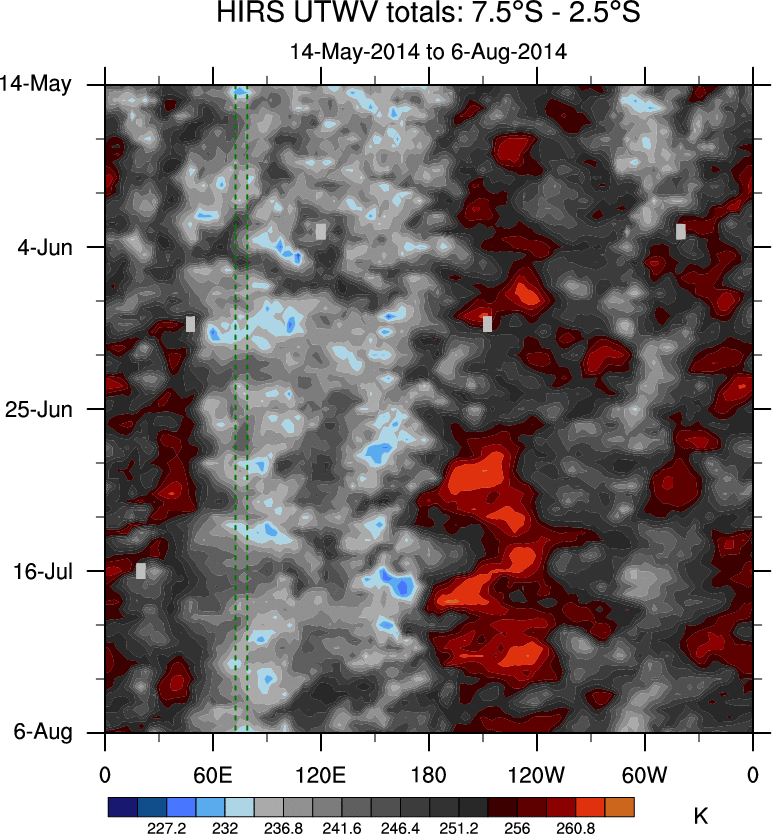 To identify tropical waves in near real-time, the OLR and UTWV data are filtered following Wheeler & Weickmann (2001 MWR). The daily anomalies are calculated using the first 3 harmonics of the seasonal cycle for 1979–2009. Missing values are then filled using linear interpolation in space and time. The most recent 365 days of anomalies are padded with 659 days of zeroes, and the result is filtered for each wave type.
