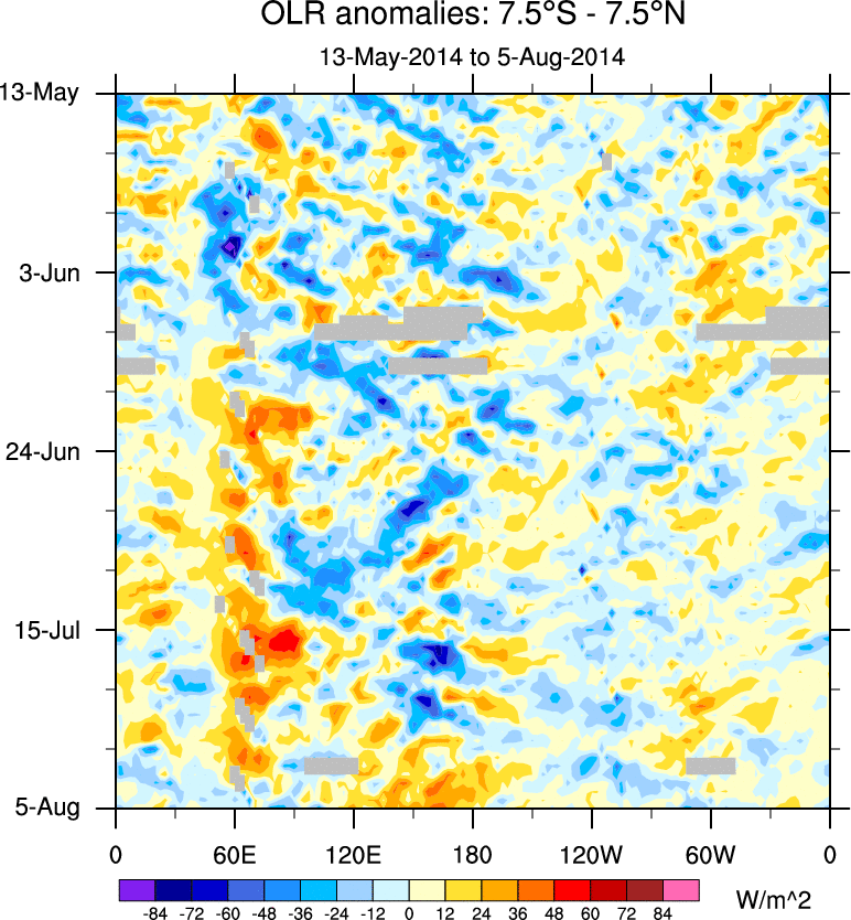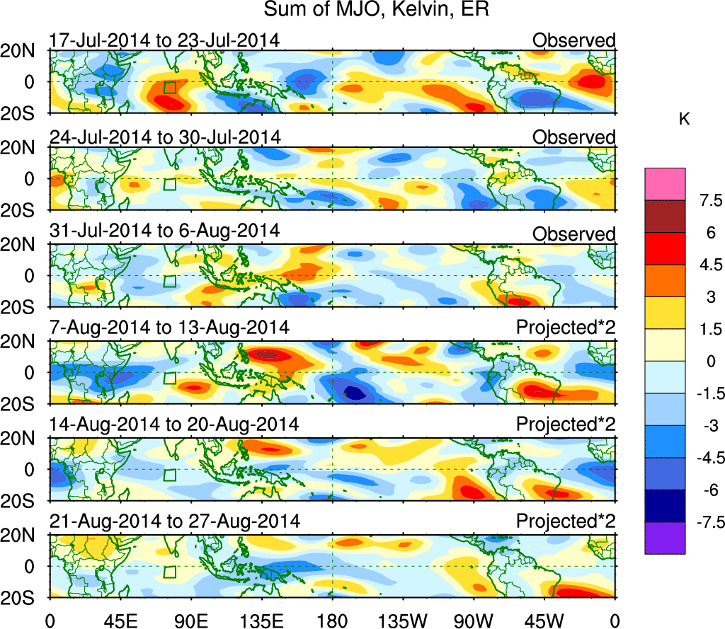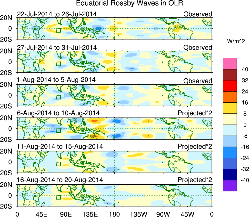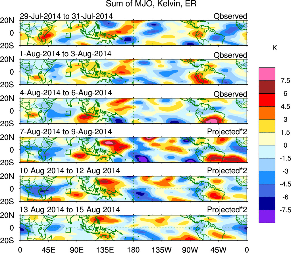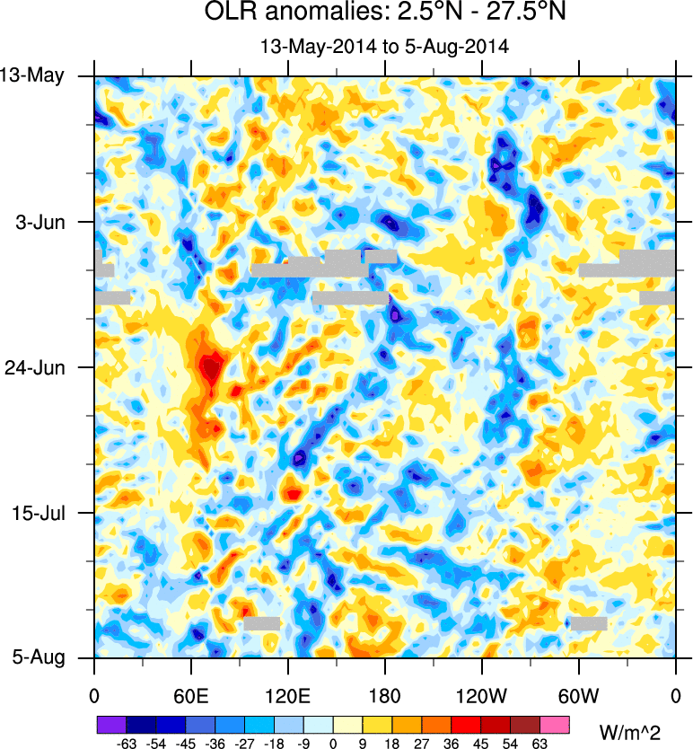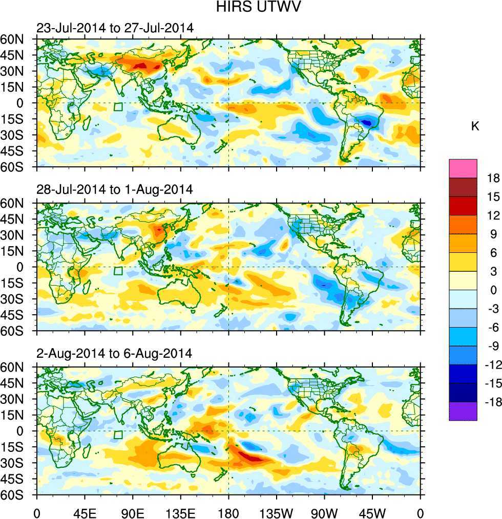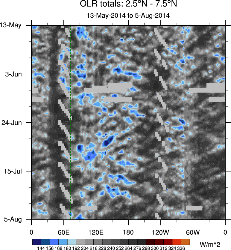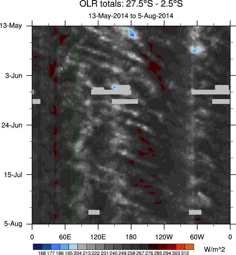 To identify tropical waves in near real-time, the OLR and UTWV data are filtered following Wheeler & Weickmann (2001 MWR). The daily anomalies are calculated using the first 3 harmonics of the seasonal cycle for 1979–2009. Missing values are then filled using linear interpolation in space and time. The most recent 365 days of anomalies are padded with 659 days of zeroes, and the result is filtered for each wave type.