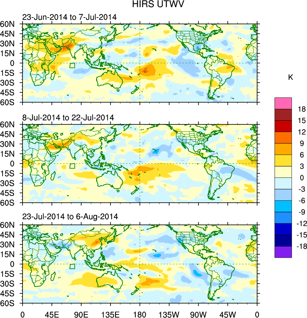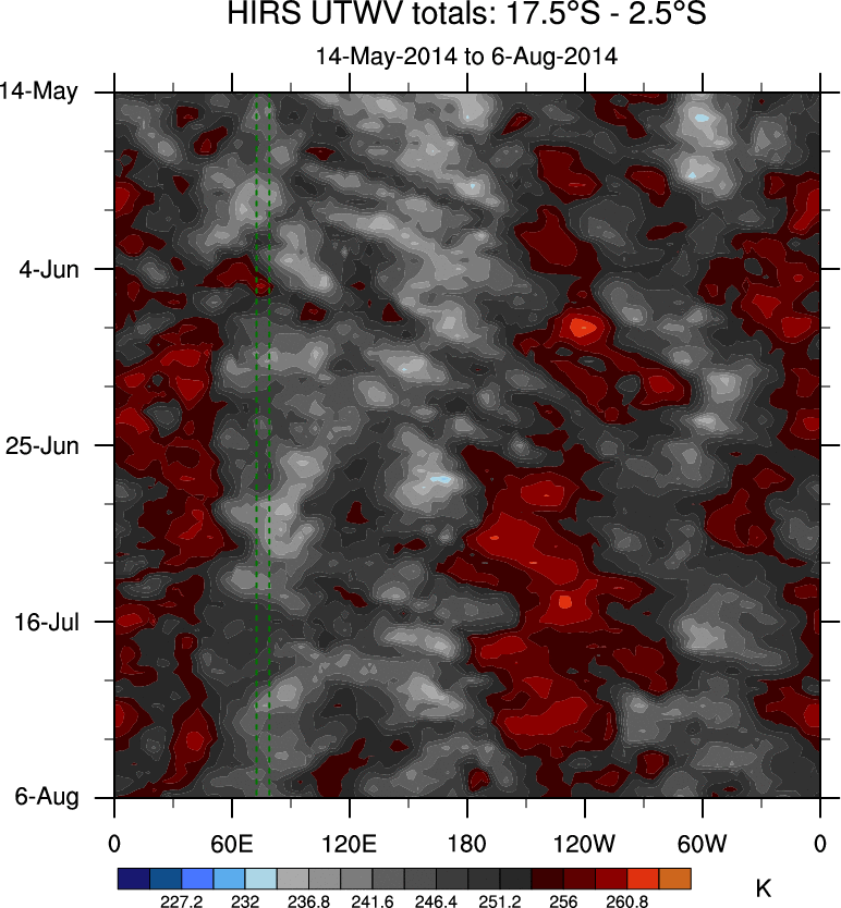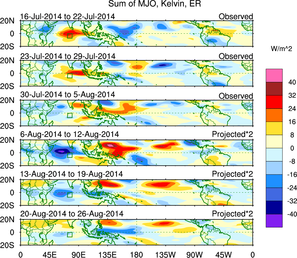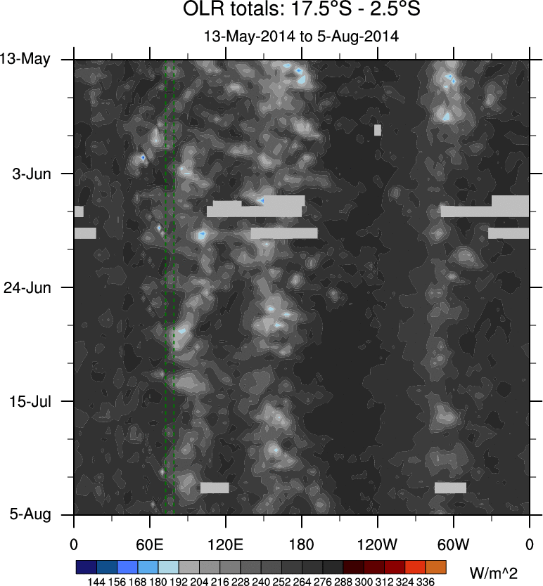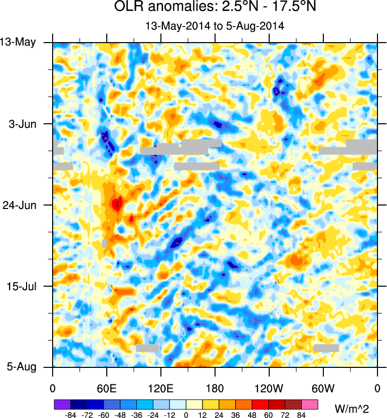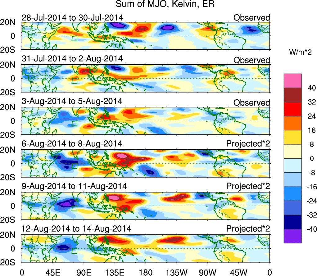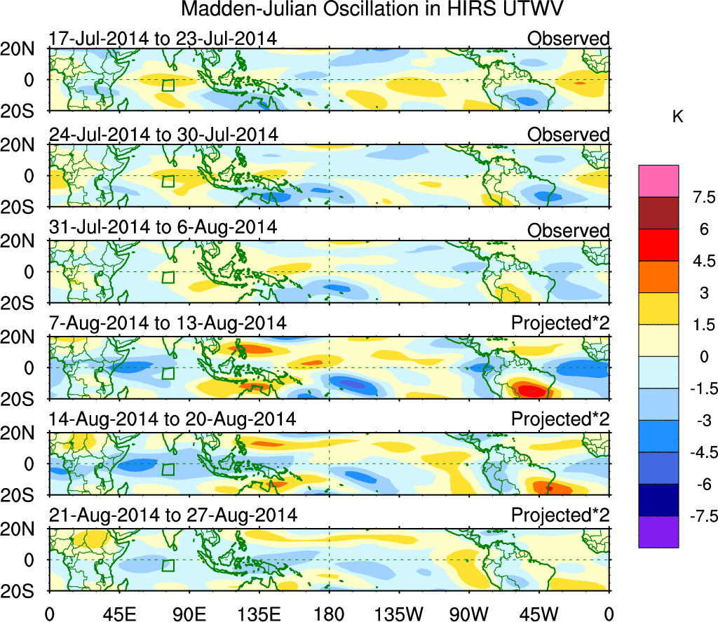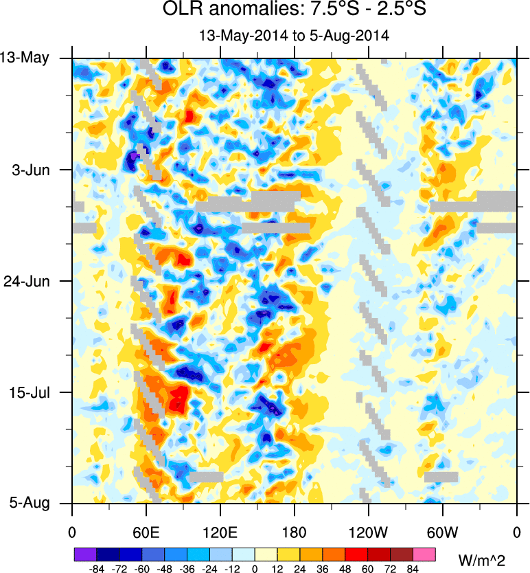 To identify tropical waves in near real-time, the OLR and UTWV data are filtered following Wheeler & Weickmann (2001 MWR). The daily anomalies are calculated using the first 3 harmonics of the seasonal cycle for 1979–2009. Missing values are then filled using linear interpolation in space and time. The most recent 365 days of anomalies are padded with 659 days of zeroes, and the result is filtered for each wave type.