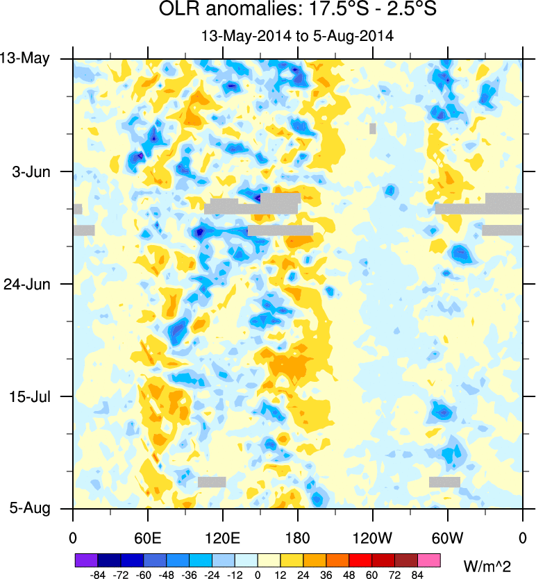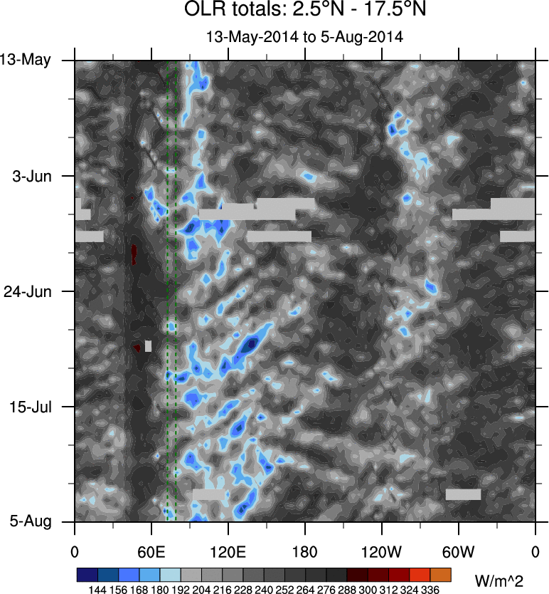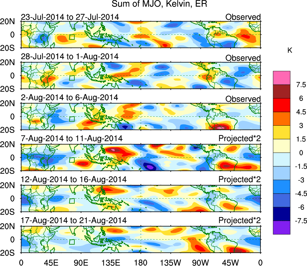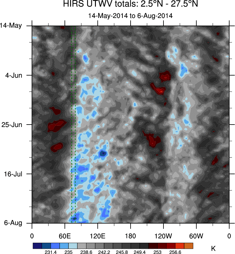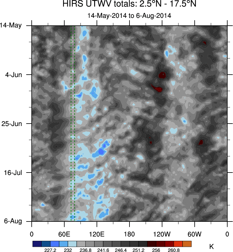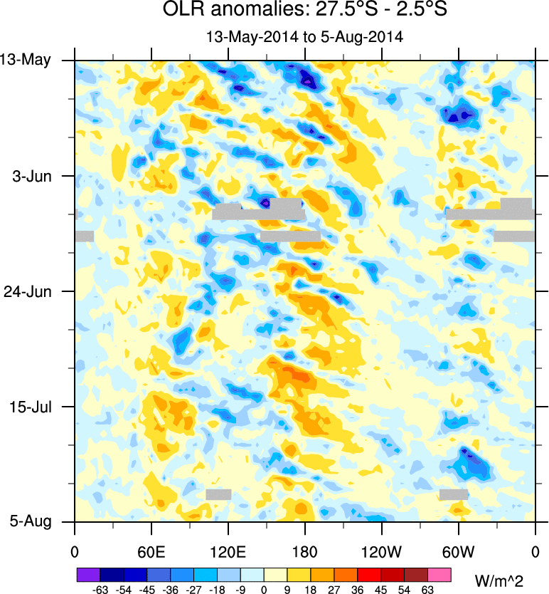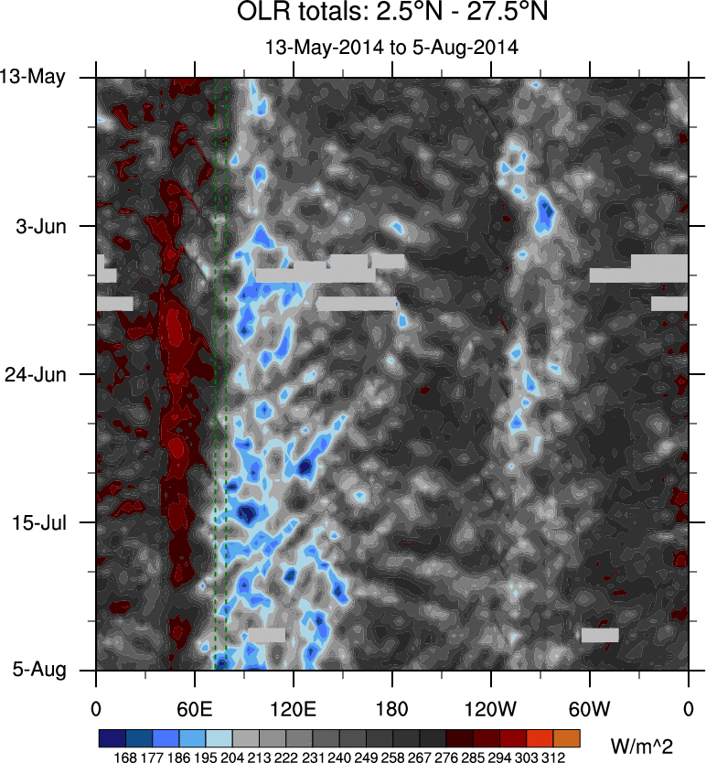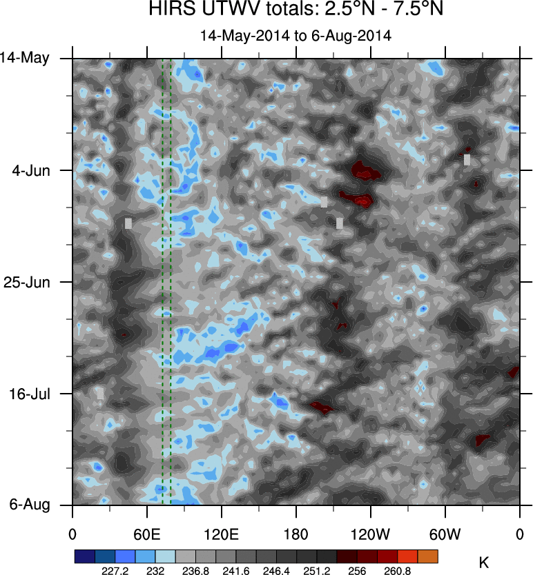 To identify tropical waves in near real-time, the OLR and UTWV data are filtered following Wheeler & Weickmann (2001 MWR). The daily anomalies are calculated using the first 3 harmonics of the seasonal cycle for 1979–2009. Missing values are then filled using linear interpolation in space and time. The most recent 365 days of anomalies are padded with 659 days of zeroes, and the result is filtered for each wave type.
