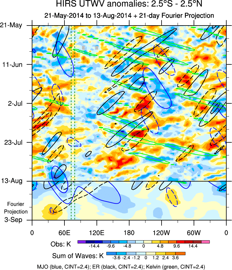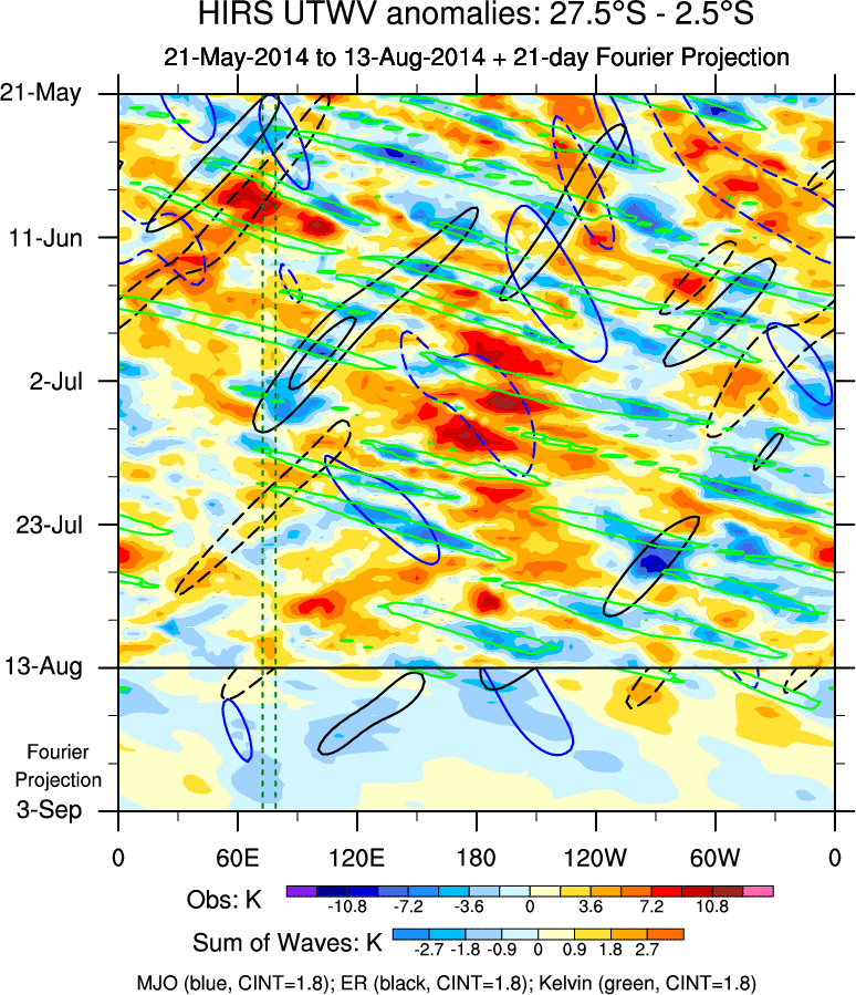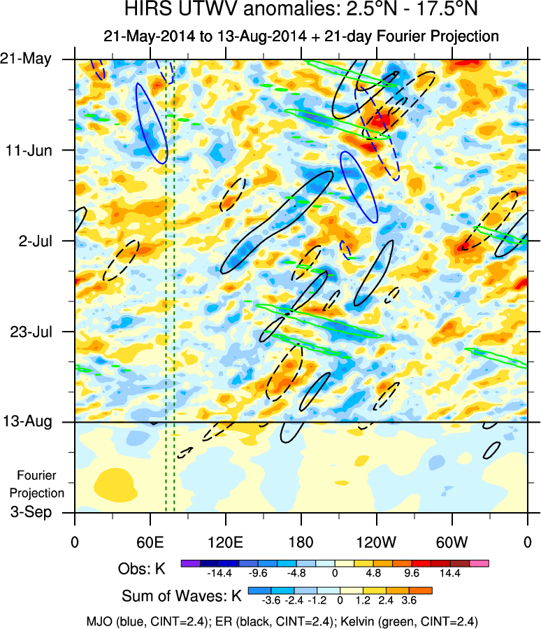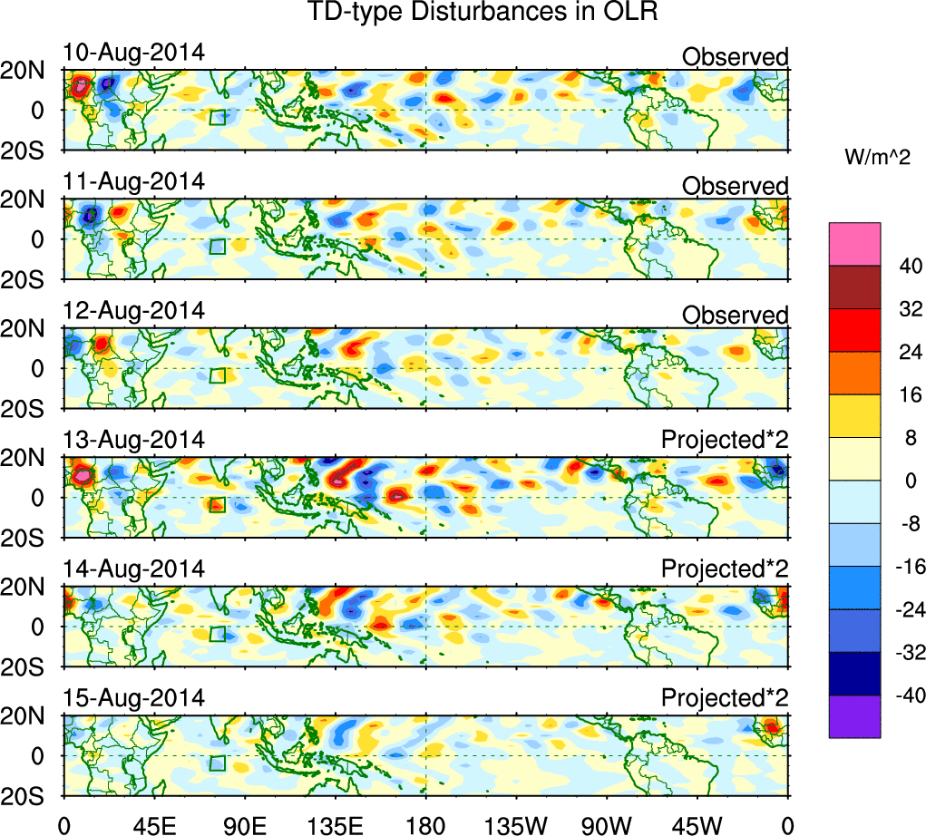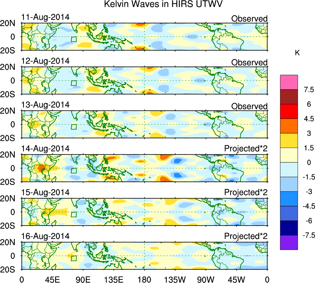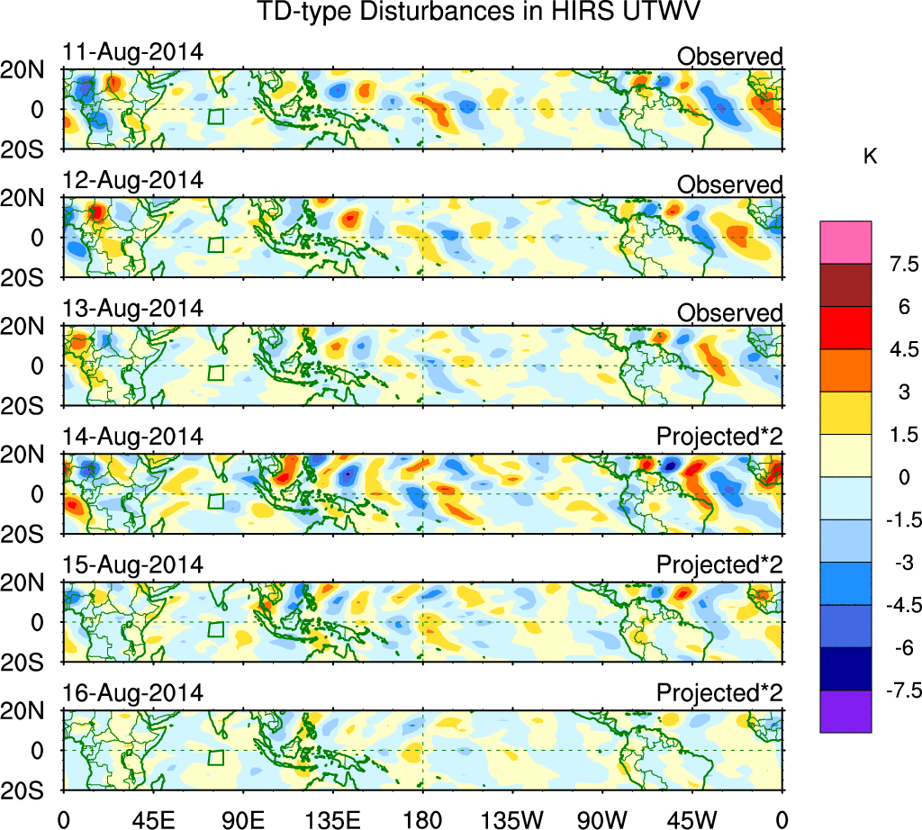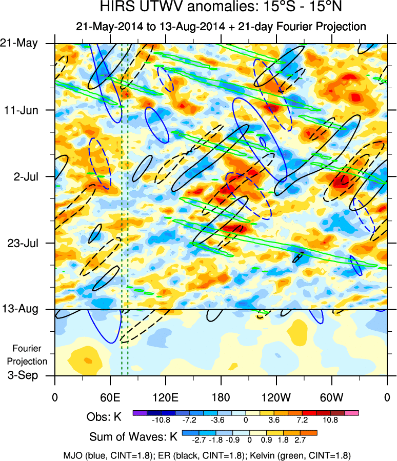 To identify tropical waves in near real-time, the OLR and UTWV data are filtered following Wheeler & Weickmann (2001 MWR). The daily anomalies are calculated using the first 3 harmonics of the seasonal cycle for 1979–2009. Missing values are then filled using linear interpolation in space and time. The most recent 365 days of anomalies are padded with 659 days of zeroes, and the result is filtered for each wave type.