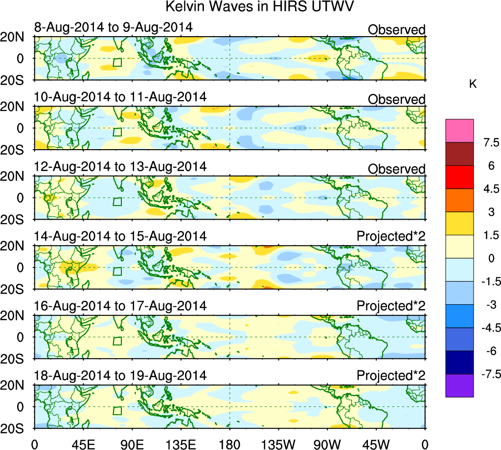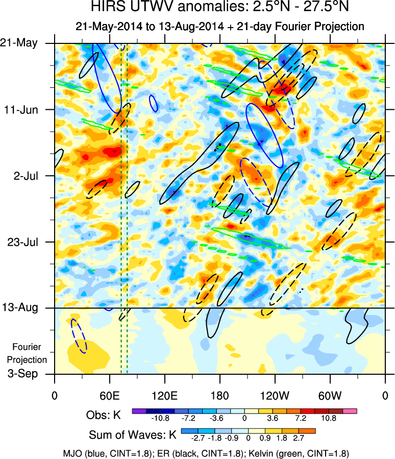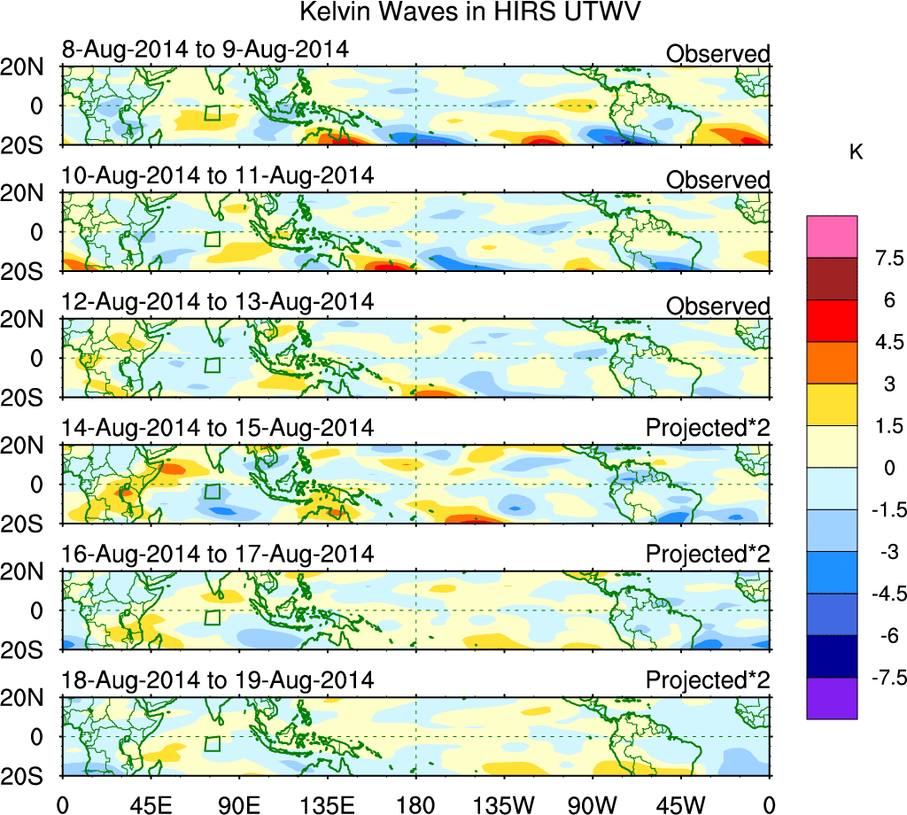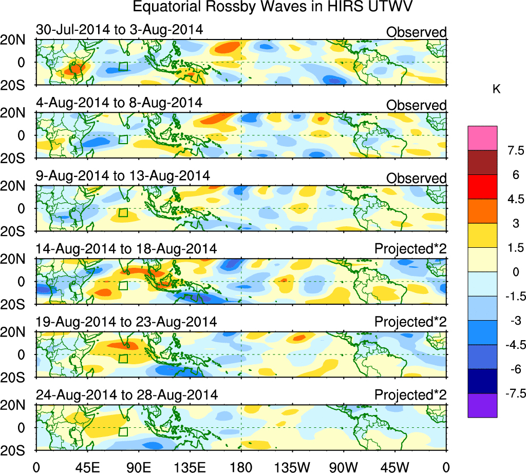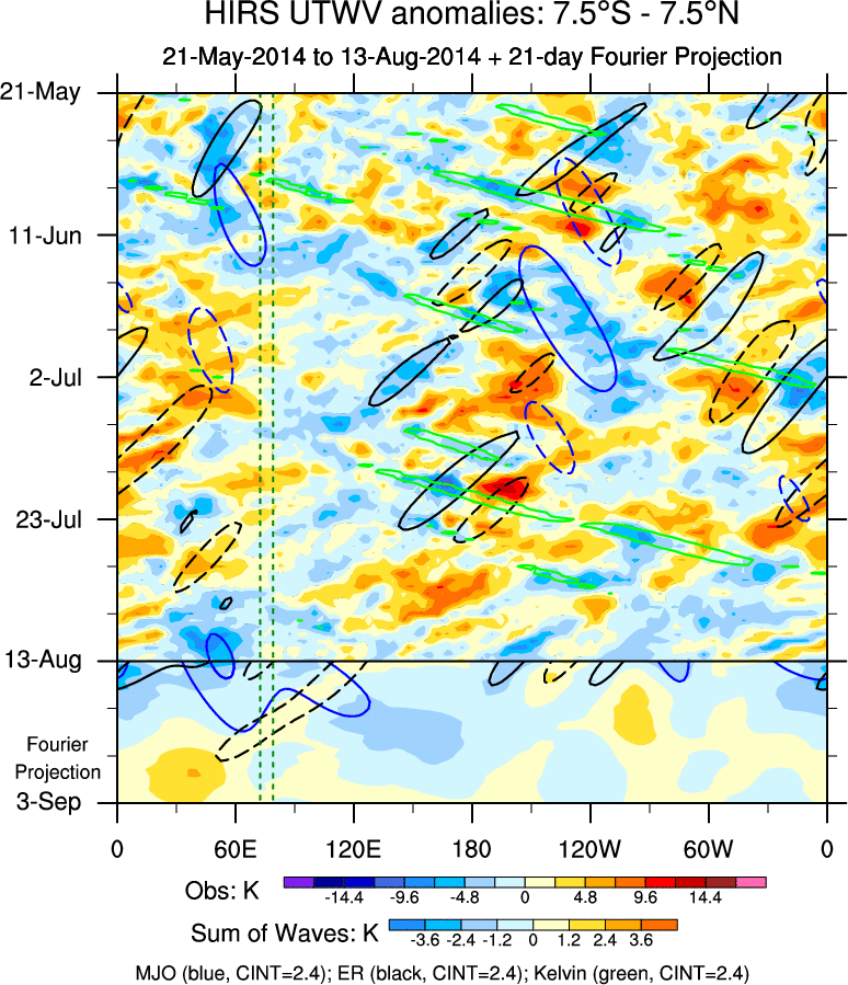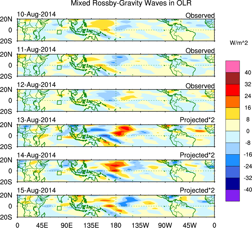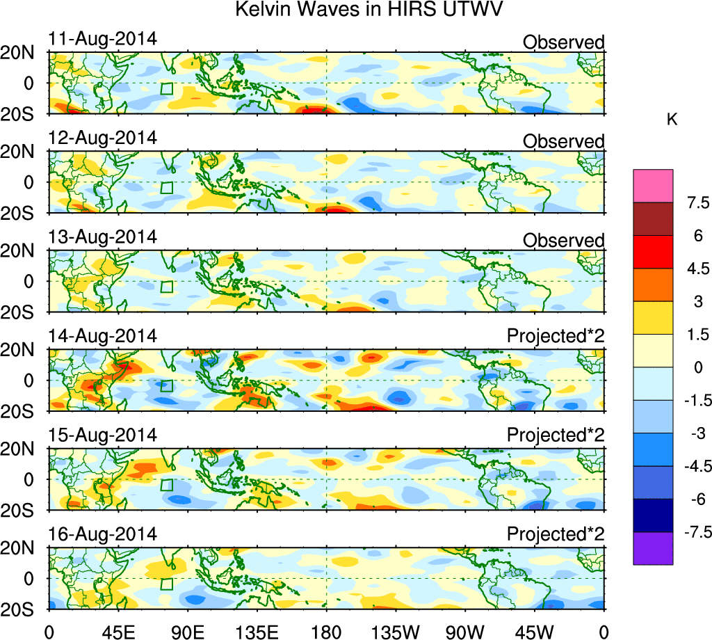 To identify tropical waves in near real-time, the OLR and UTWV data are filtered following Wheeler & Weickmann (2001 MWR). The daily anomalies are calculated using the first 3 harmonics of the seasonal cycle for 1979–2009. Missing values are then filled using linear interpolation in space and time. The most recent 365 days of anomalies are padded with 659 days of zeroes, and the result is filtered for each wave type.