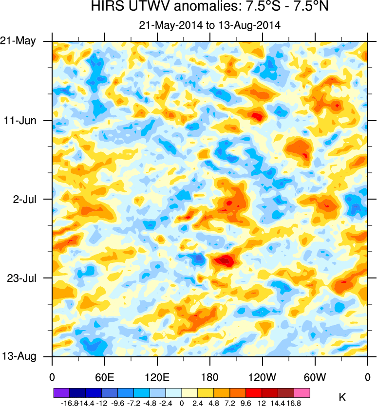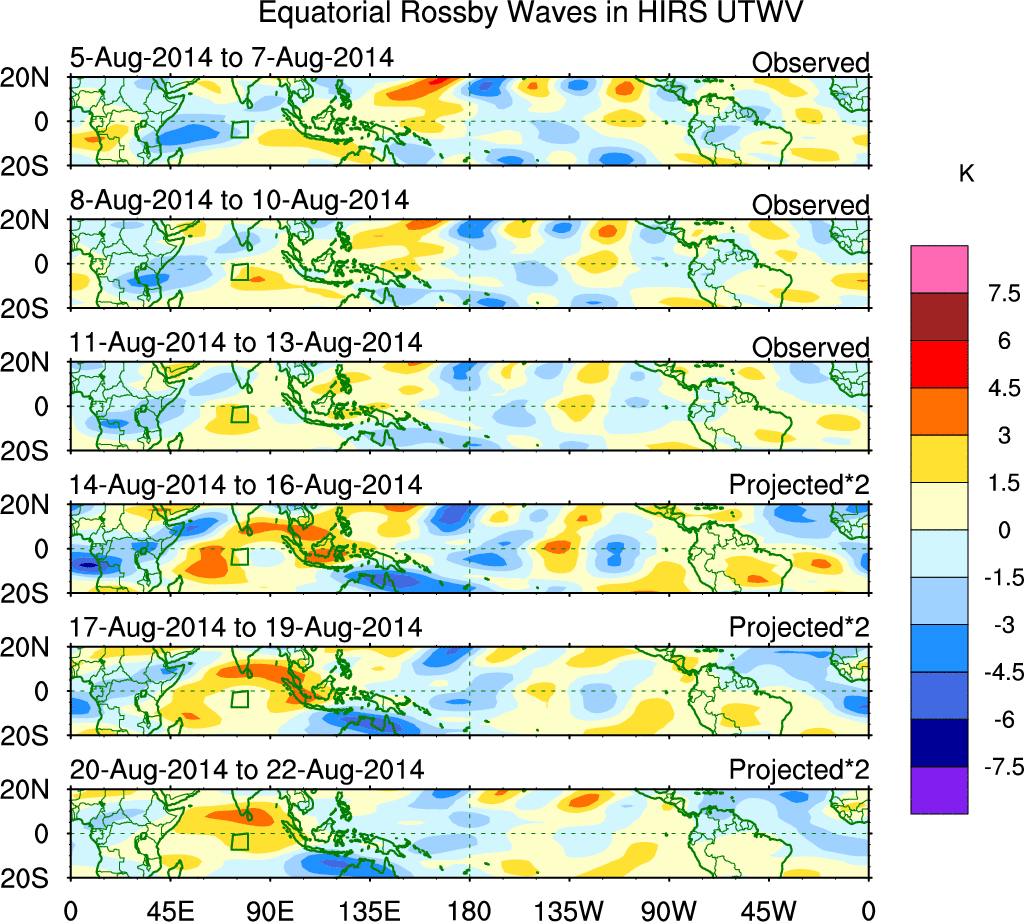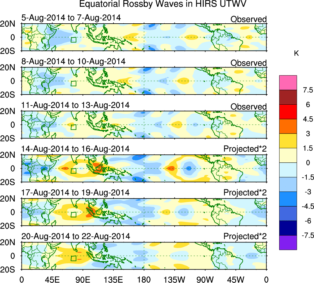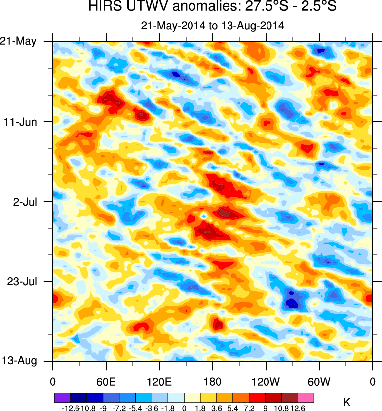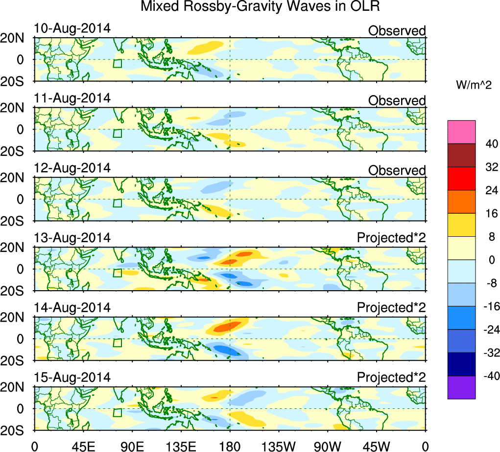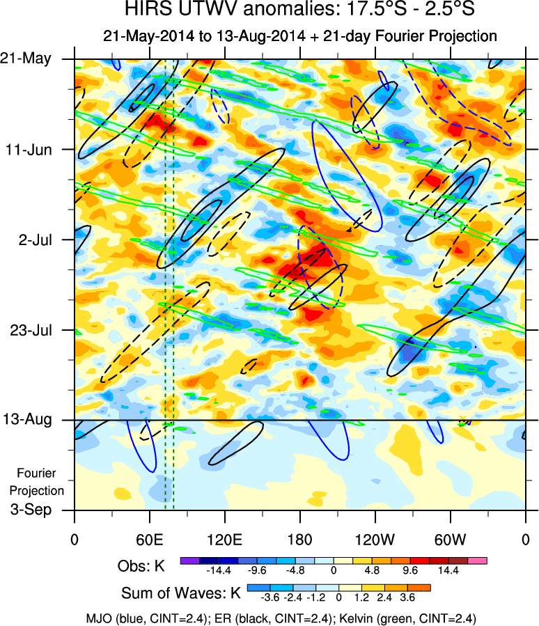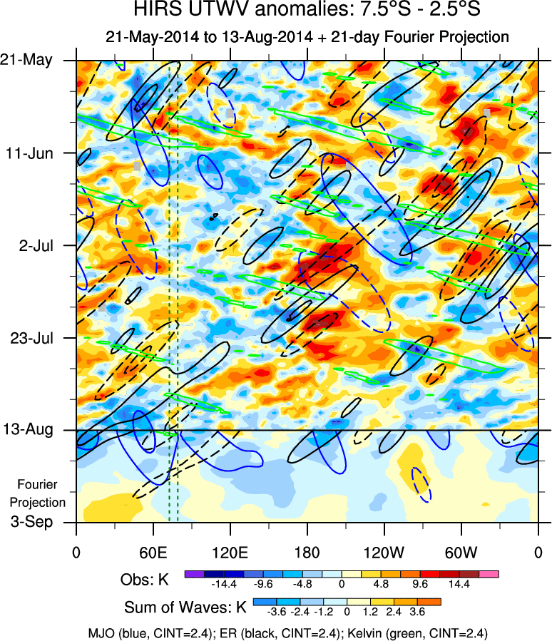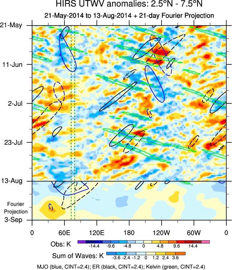 To identify tropical waves in near real-time, the OLR and UTWV data are filtered following Wheeler & Weickmann (2001 MWR). The daily anomalies are calculated using the first 3 harmonics of the seasonal cycle for 1979–2009. Missing values are then filled using linear interpolation in space and time. The most recent 365 days of anomalies are padded with 659 days of zeroes, and the result is filtered for each wave type.