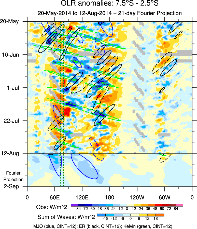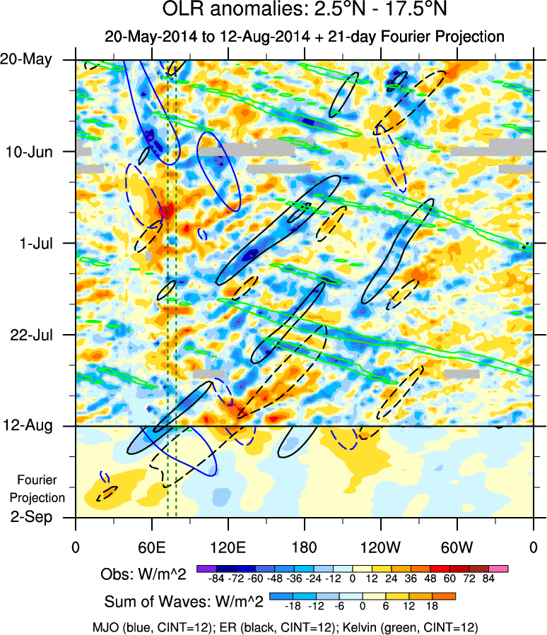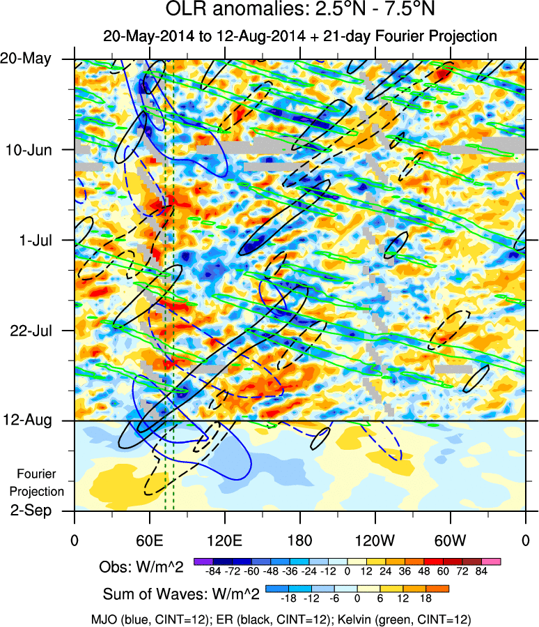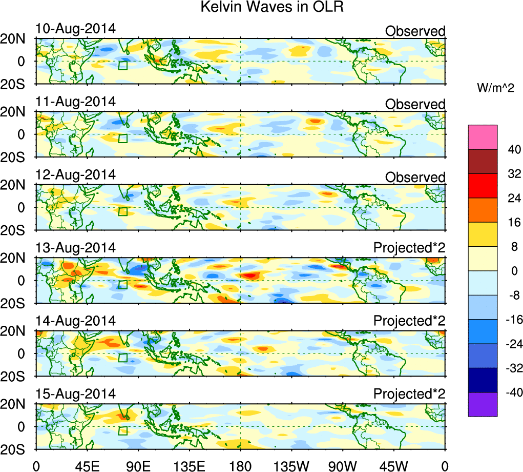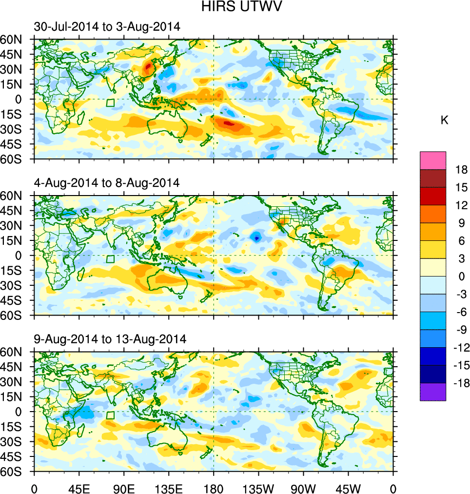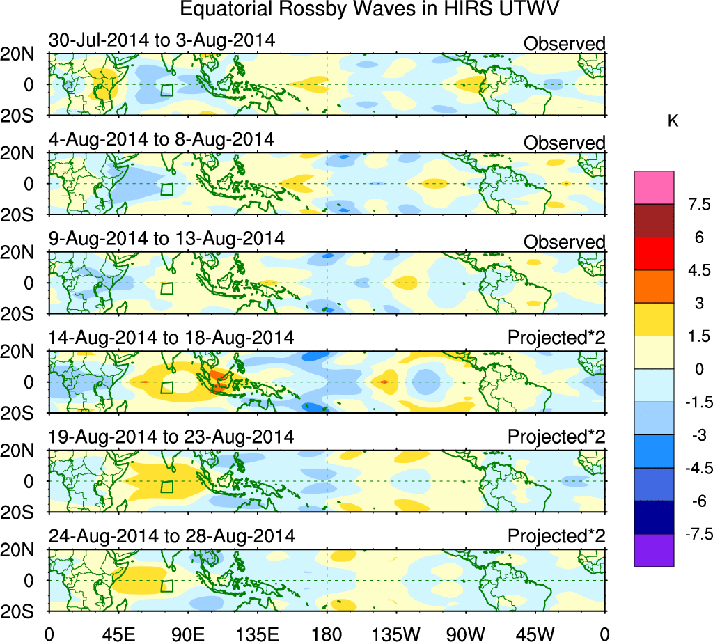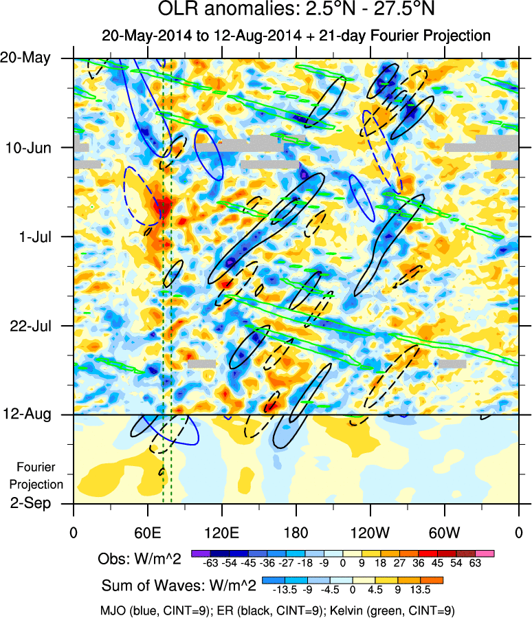 To identify tropical waves in near real-time, the OLR and UTWV data are filtered following Wheeler & Weickmann (2001 MWR). The daily anomalies are calculated using the first 3 harmonics of the seasonal cycle for 1979–2009. Missing values are then filled using linear interpolation in space and time. The most recent 365 days of anomalies are padded with 659 days of zeroes, and the result is filtered for each wave type.