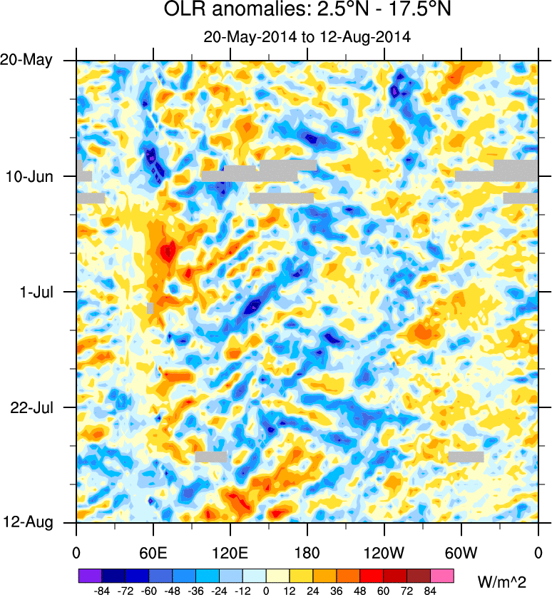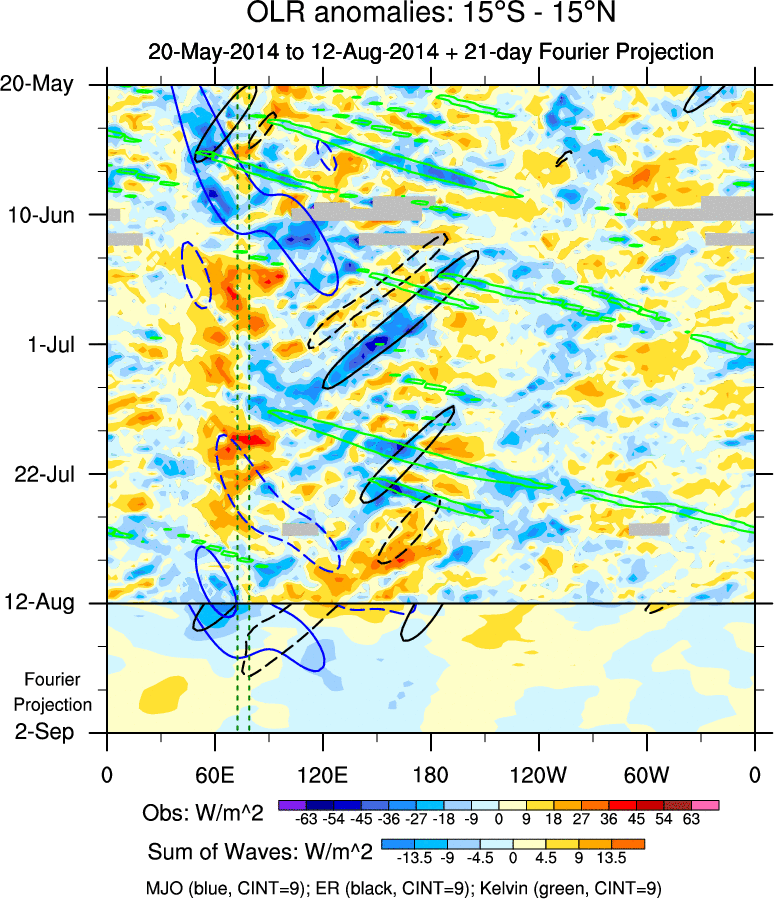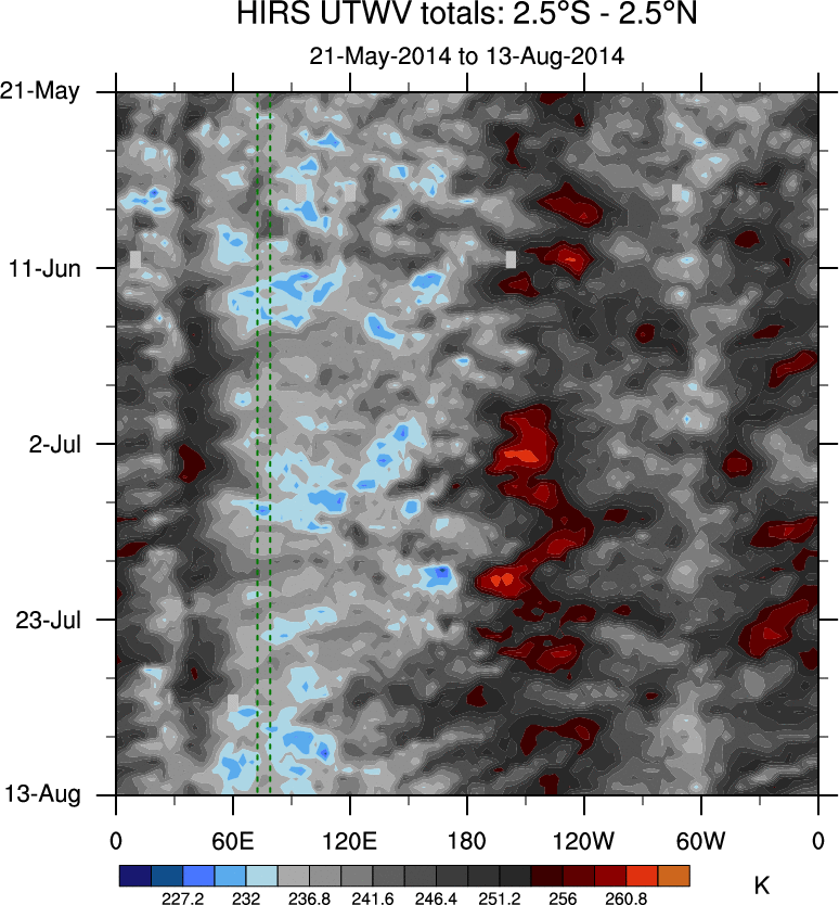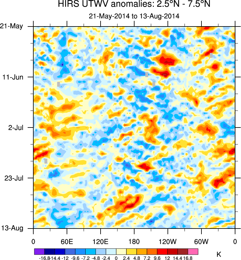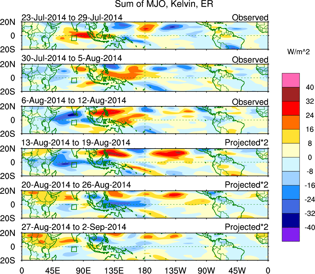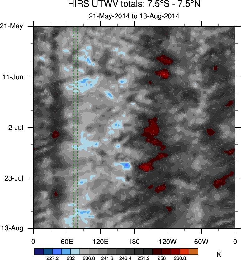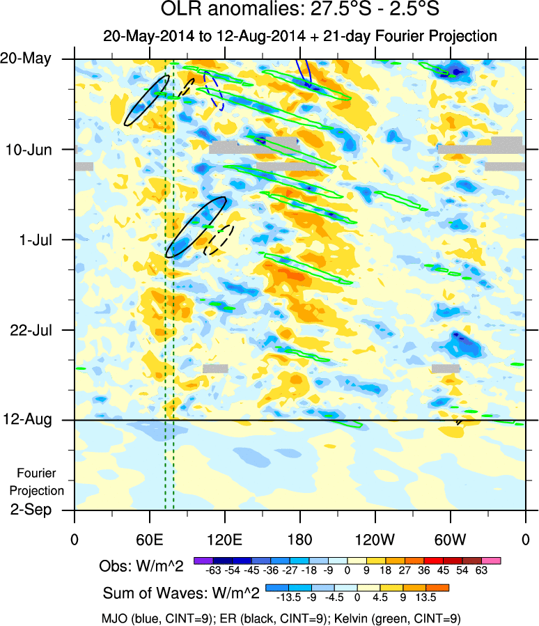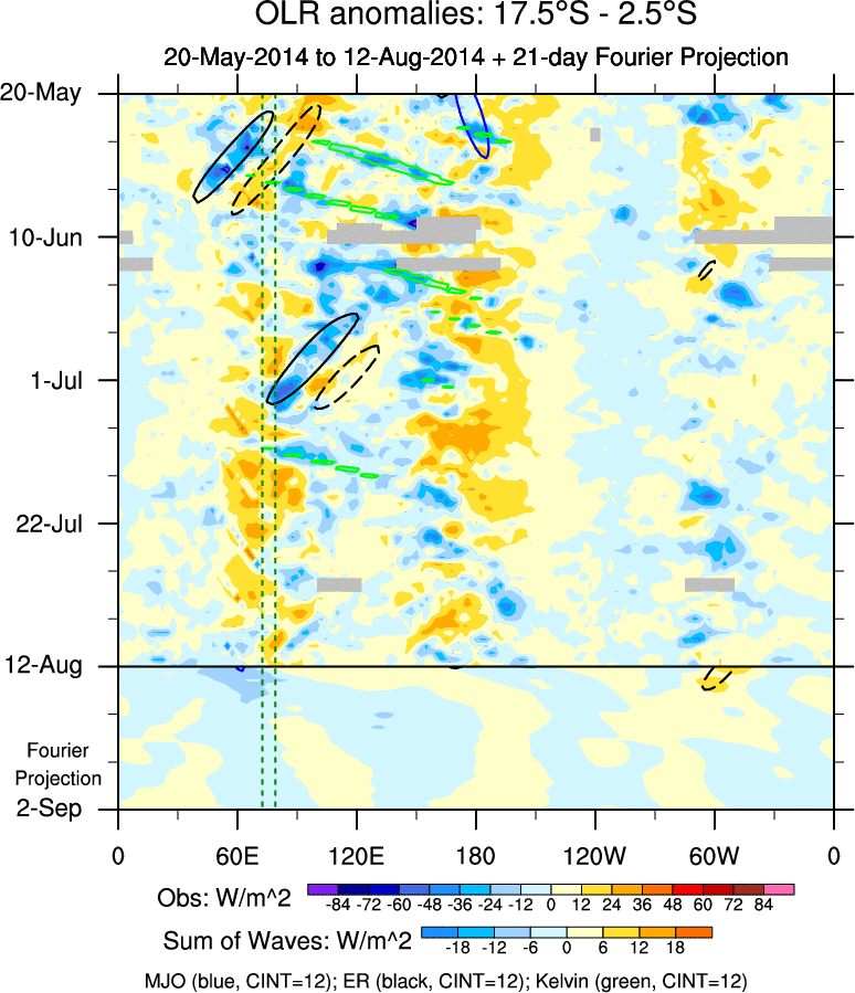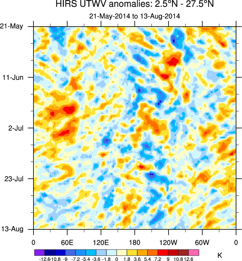 To identify tropical waves in near real-time, the OLR and UTWV data are filtered following Wheeler & Weickmann (2001 MWR). The daily anomalies are calculated using the first 3 harmonics of the seasonal cycle for 1979–2009. Missing values are then filled using linear interpolation in space and time. The most recent 365 days of anomalies are padded with 659 days of zeroes, and the result is filtered for each wave type.