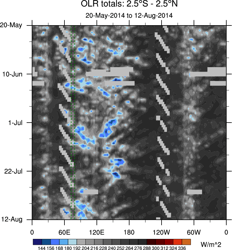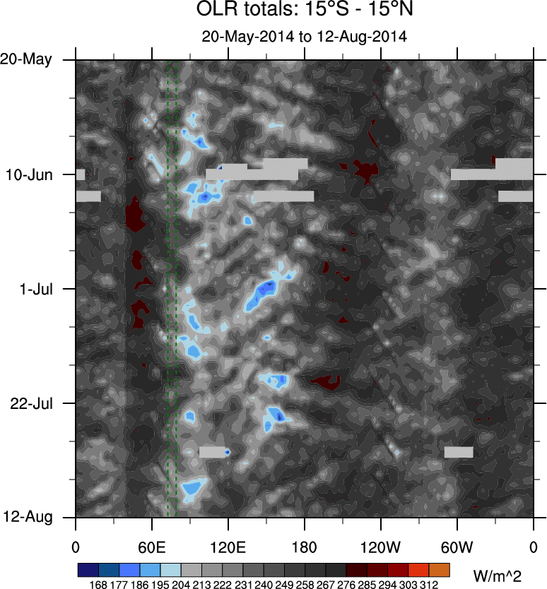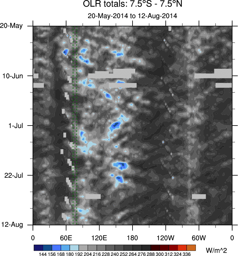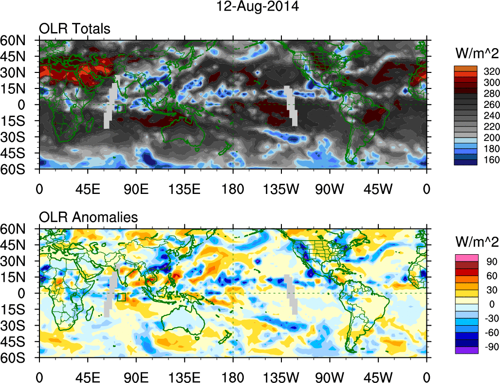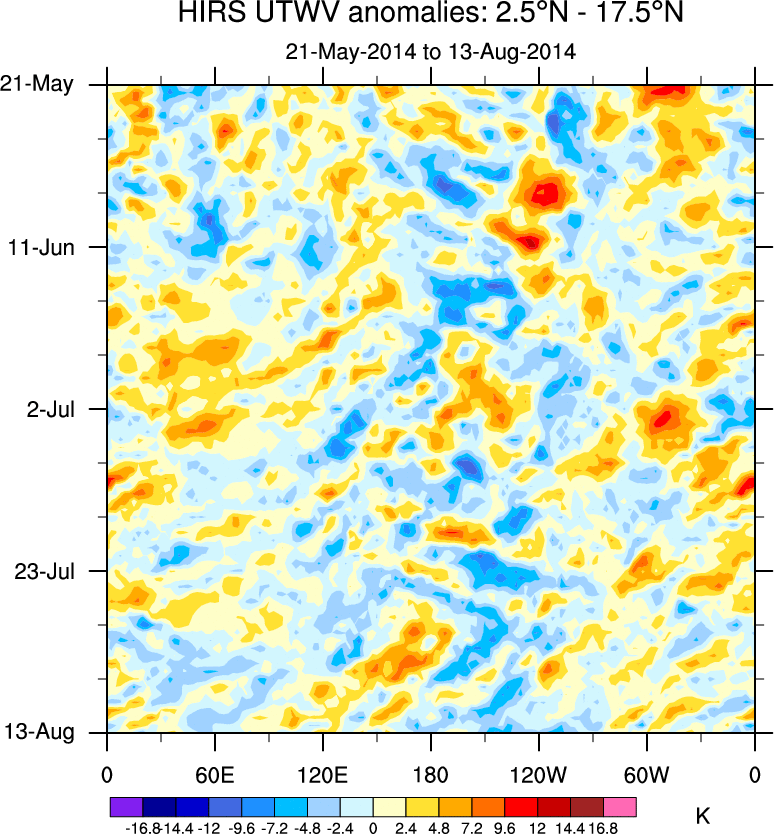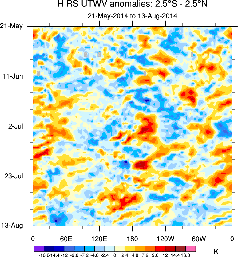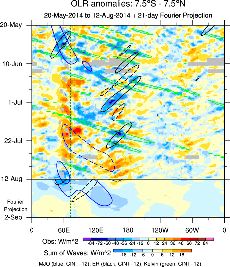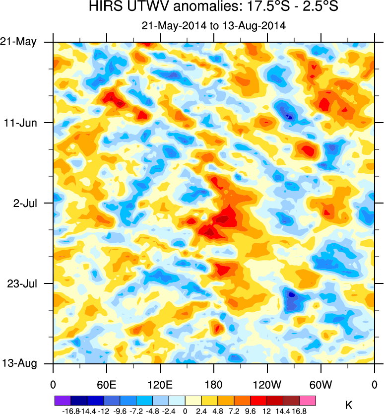 To identify tropical waves in near real-time, the OLR and UTWV data are filtered following Wheeler & Weickmann (2001 MWR). The daily anomalies are calculated using the first 3 harmonics of the seasonal cycle for 1979–2009. Missing values are then filled using linear interpolation in space and time. The most recent 365 days of anomalies are padded with 659 days of zeroes, and the result is filtered for each wave type.