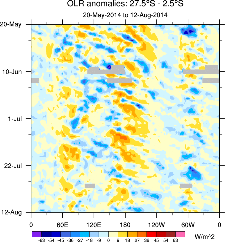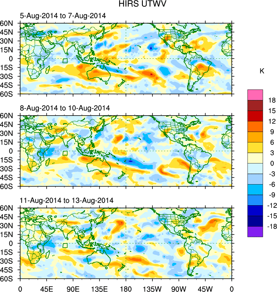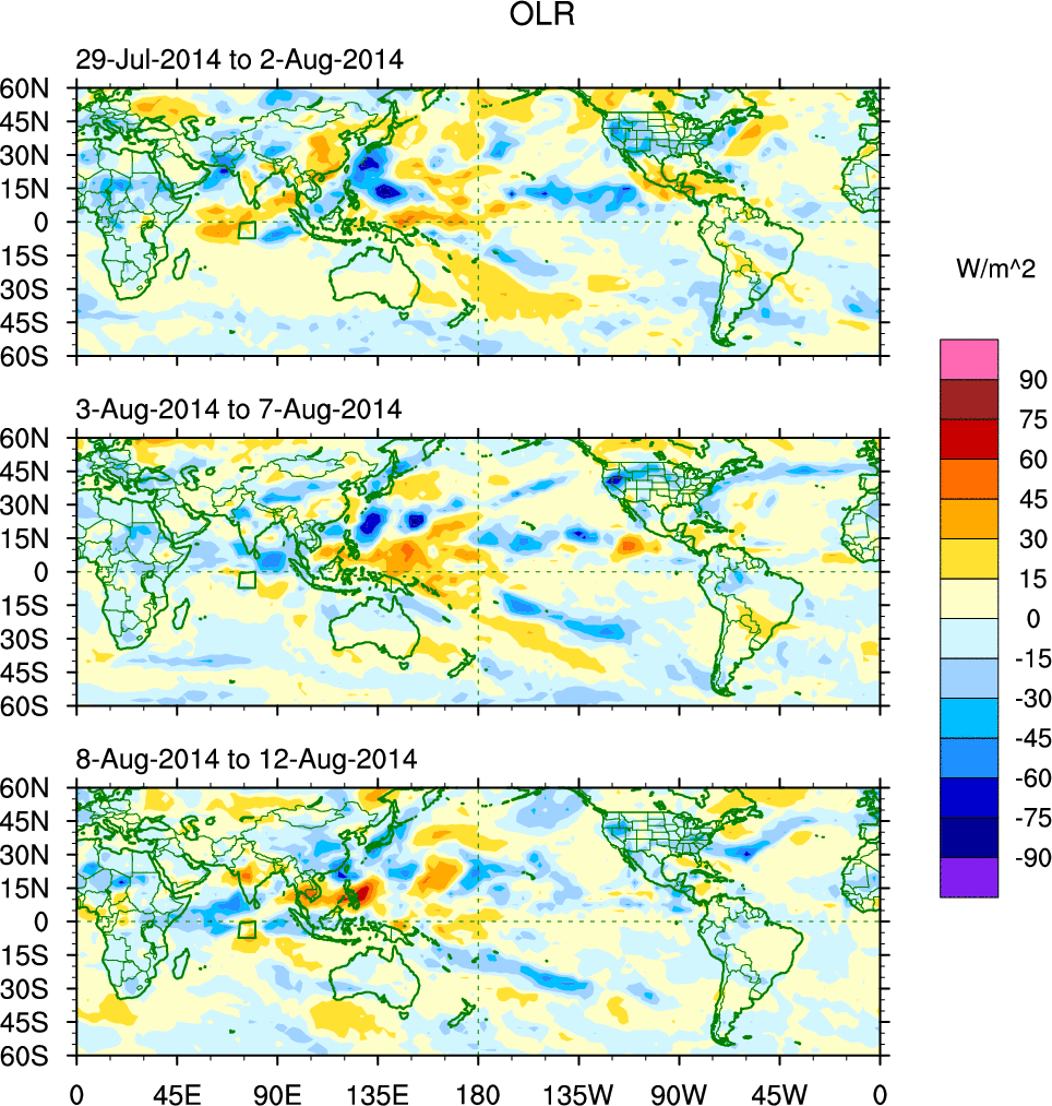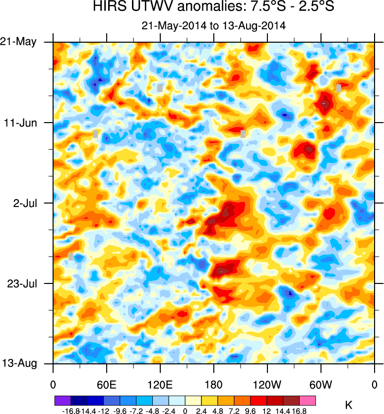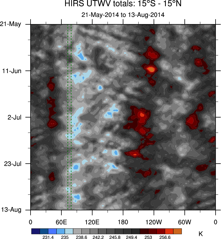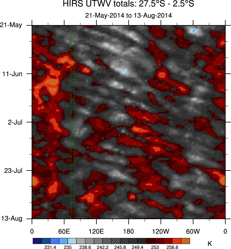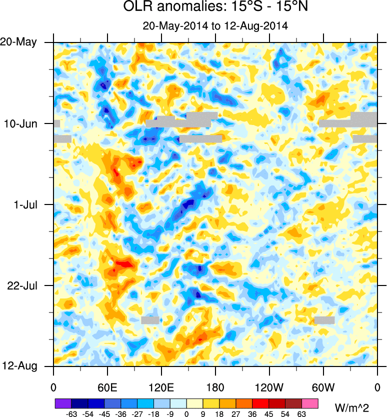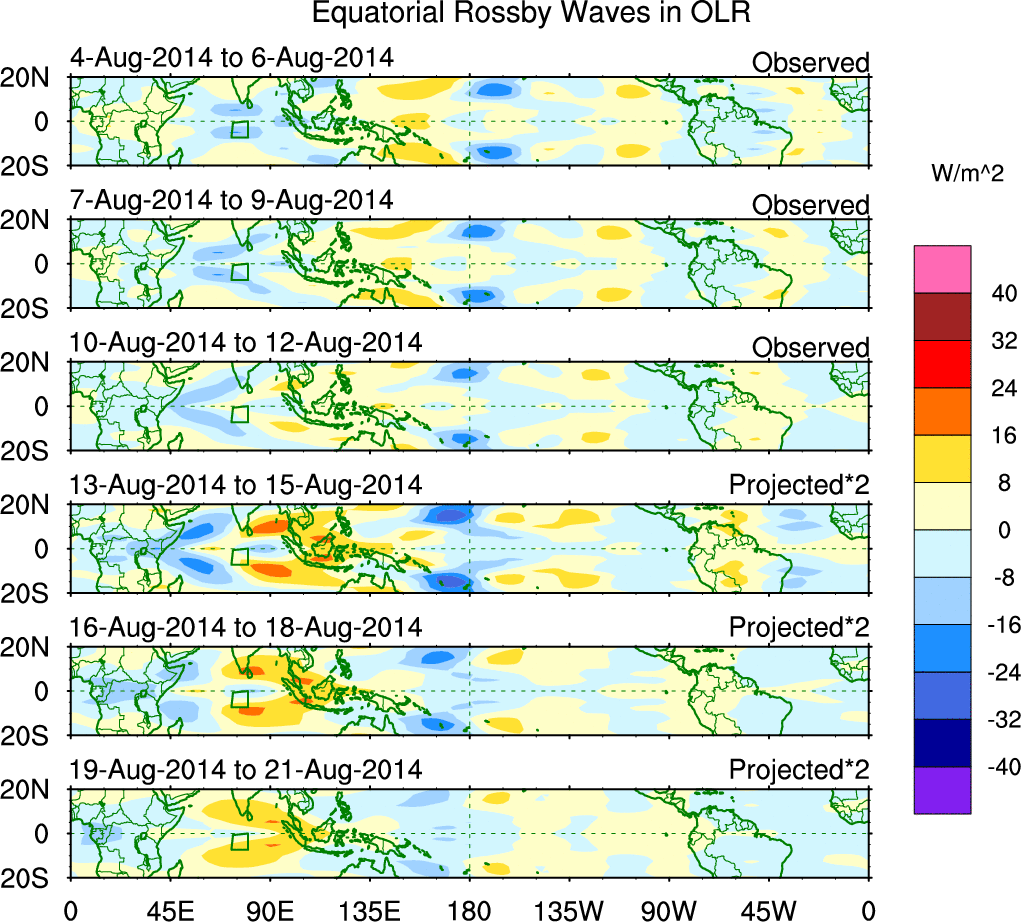To identify tropical waves in near real-time, the OLR and UTWV data are filtered following Wheeler & Weickmann (2001 MWR). The daily anomalies are calculated using the first 3 harmonics of the seasonal cycle for 1979–2009. Missing values are then filled using linear interpolation in space and time. The most recent 365 days of anomalies are padded with 659 days of zeroes, and the result is filtered for each wave type.