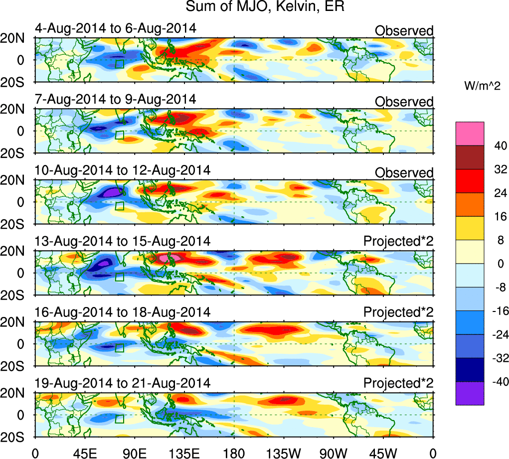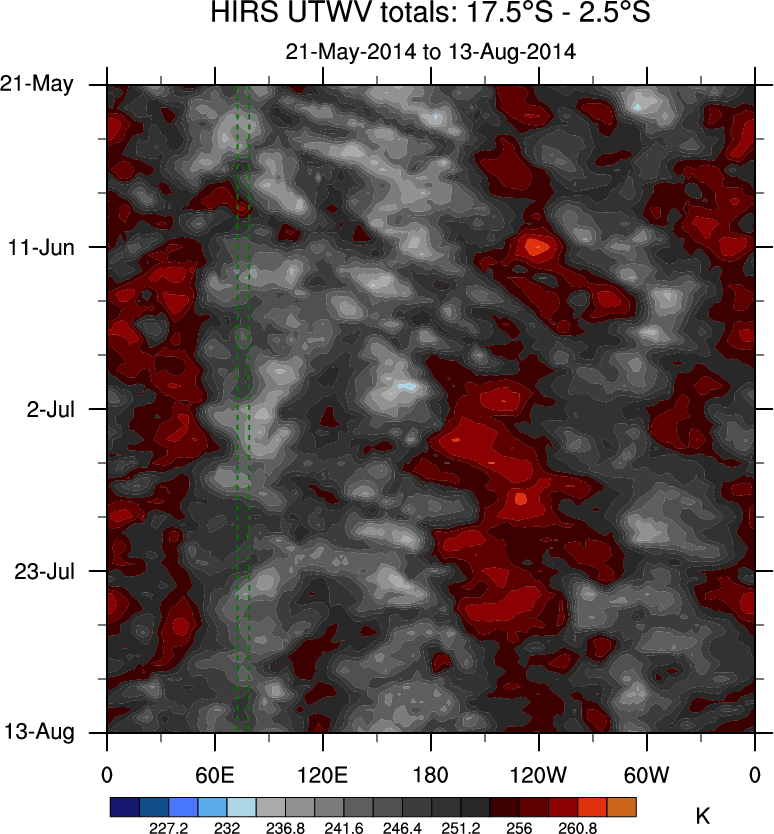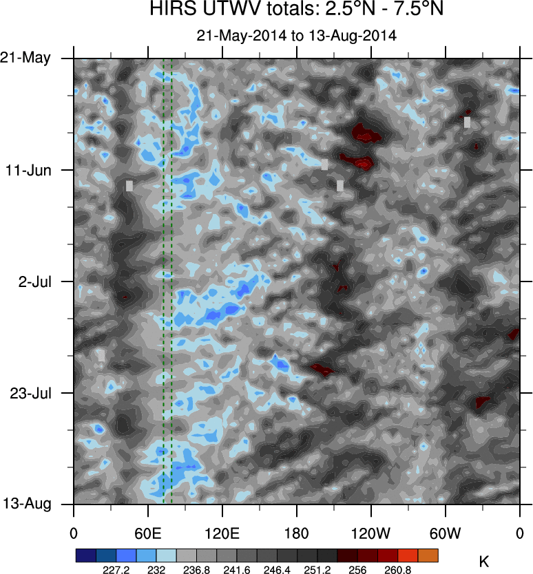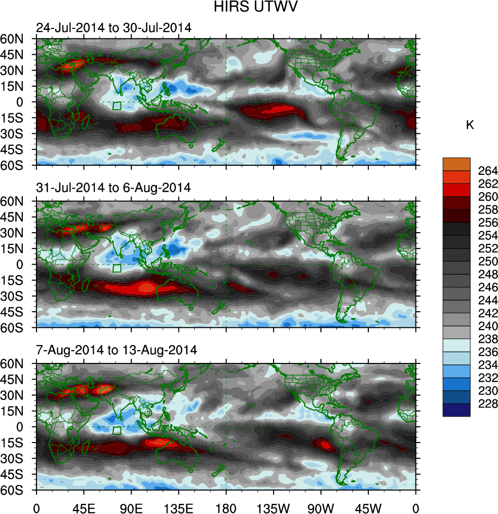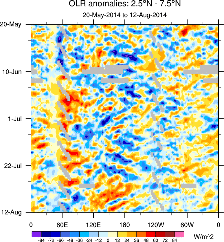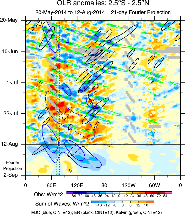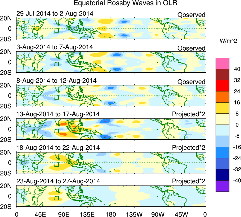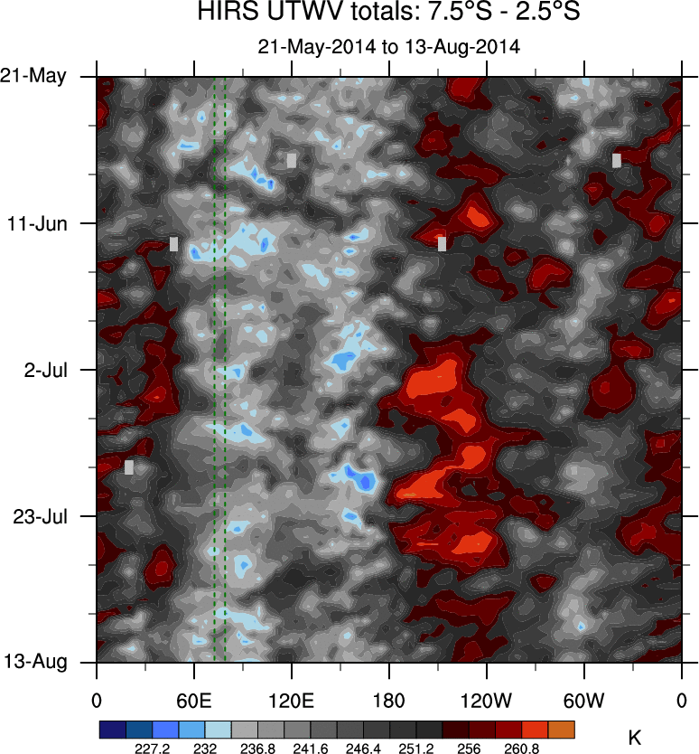 To identify tropical waves in near real-time, the OLR and UTWV data are filtered following Wheeler & Weickmann (2001 MWR). The daily anomalies are calculated using the first 3 harmonics of the seasonal cycle for 1979–2009. Missing values are then filled using linear interpolation in space and time. The most recent 365 days of anomalies are padded with 659 days of zeroes, and the result is filtered for each wave type.