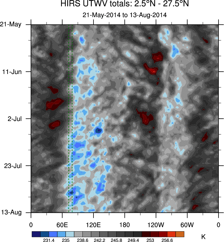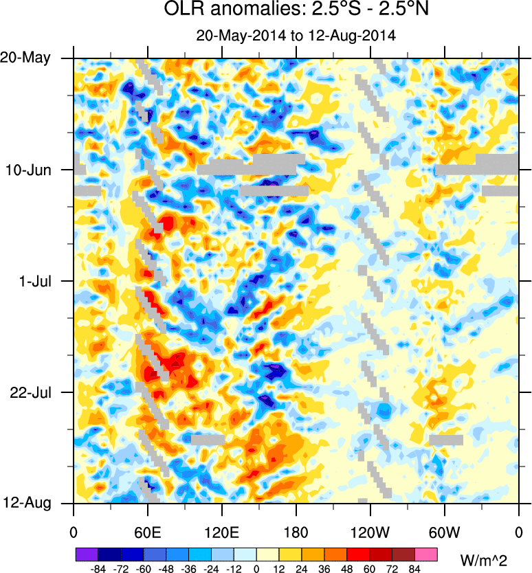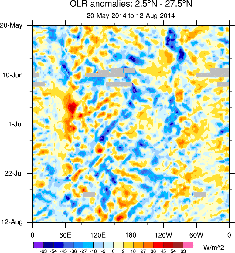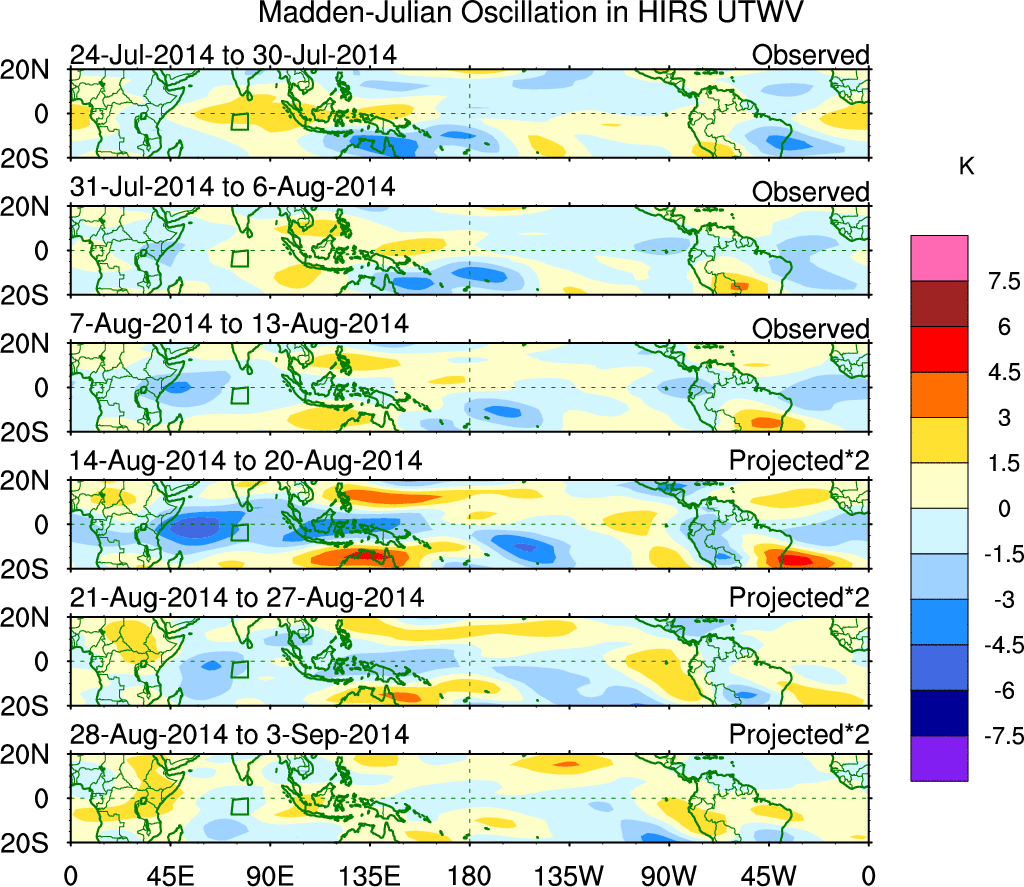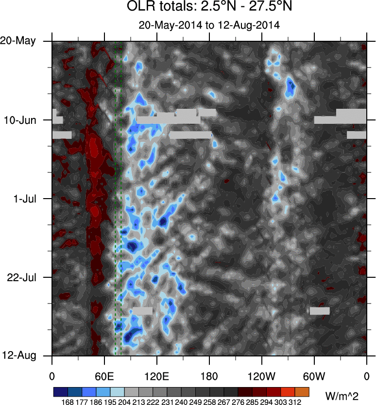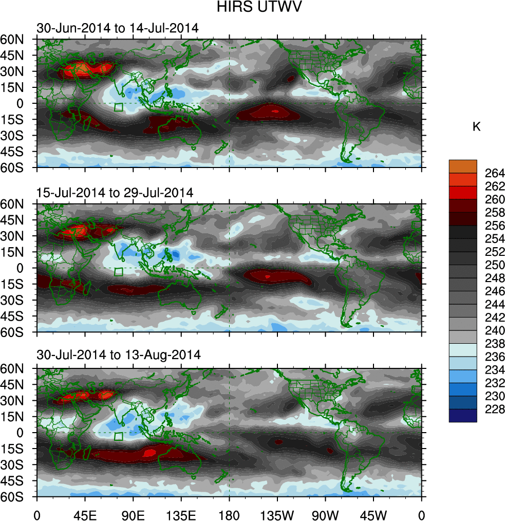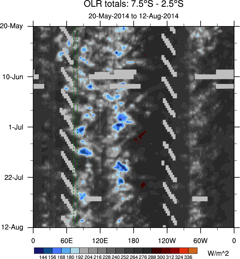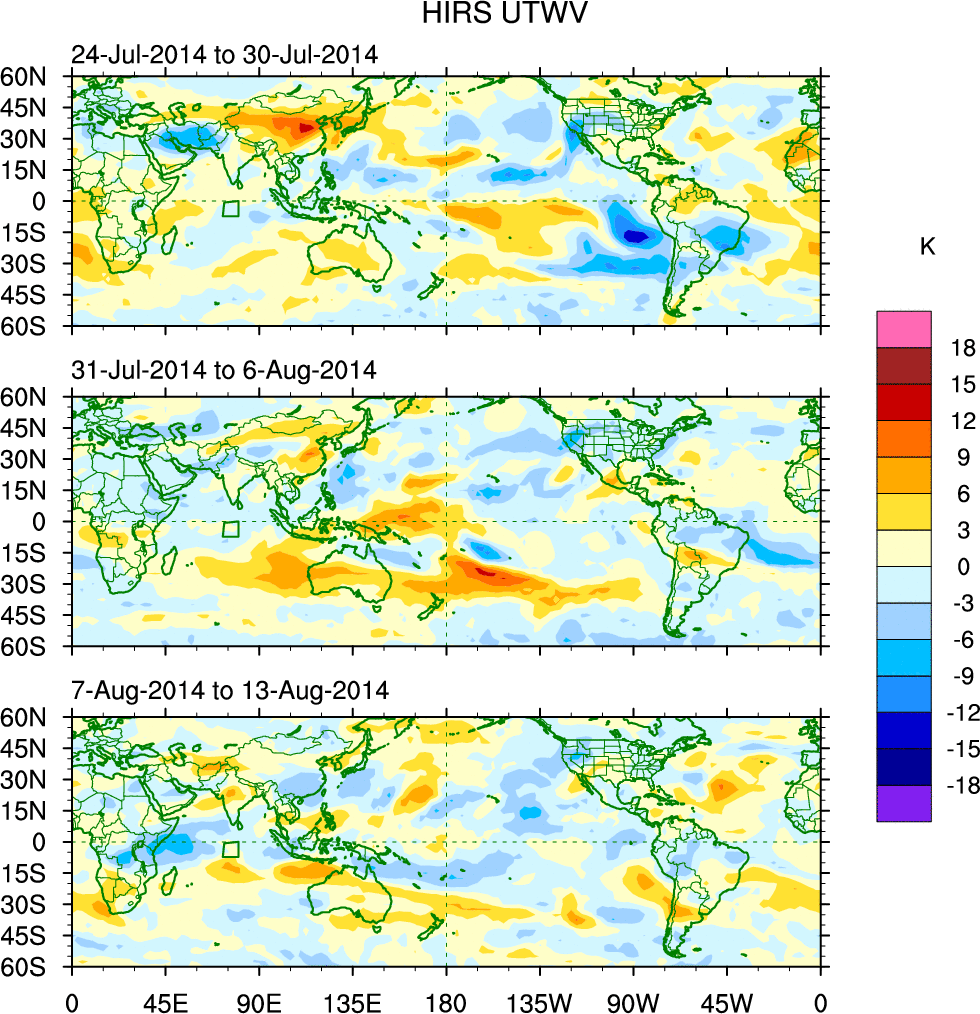 To identify tropical waves in near real-time, the OLR and UTWV data are filtered following Wheeler & Weickmann (2001 MWR). The daily anomalies are calculated using the first 3 harmonics of the seasonal cycle for 1979–2009. Missing values are then filled using linear interpolation in space and time. The most recent 365 days of anomalies are padded with 659 days of zeroes, and the result is filtered for each wave type.