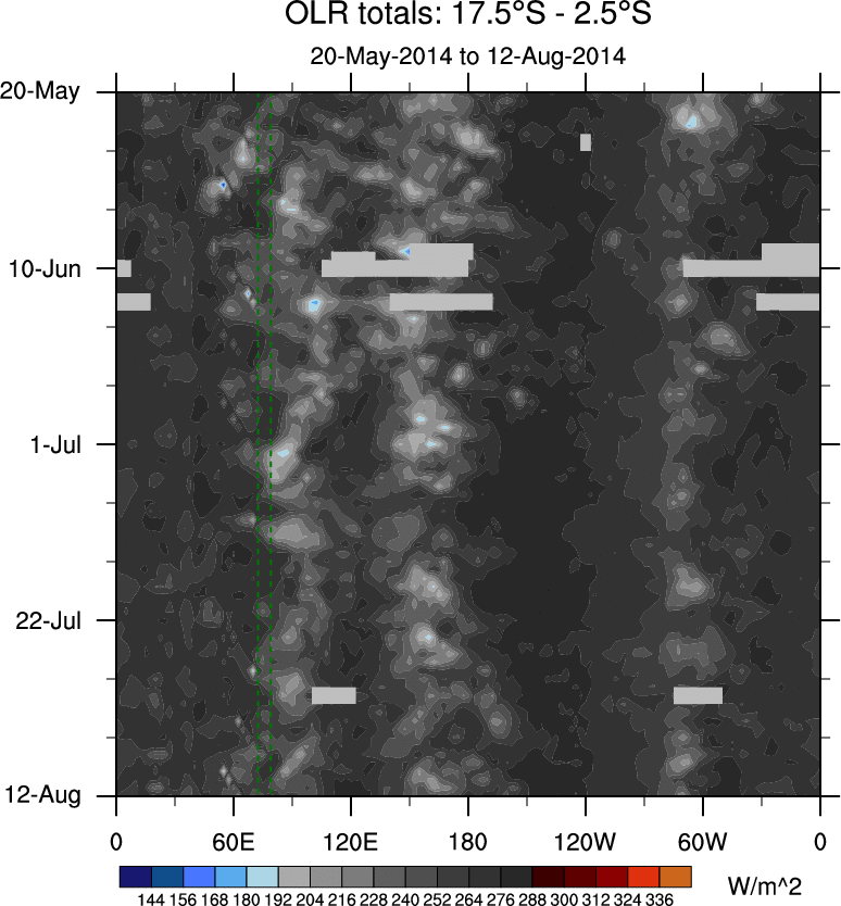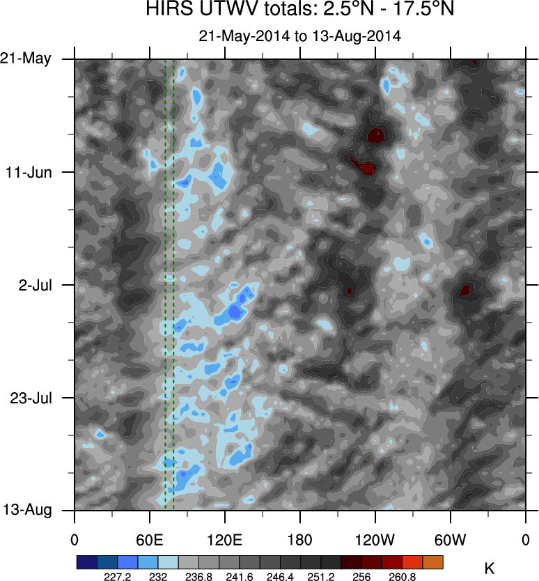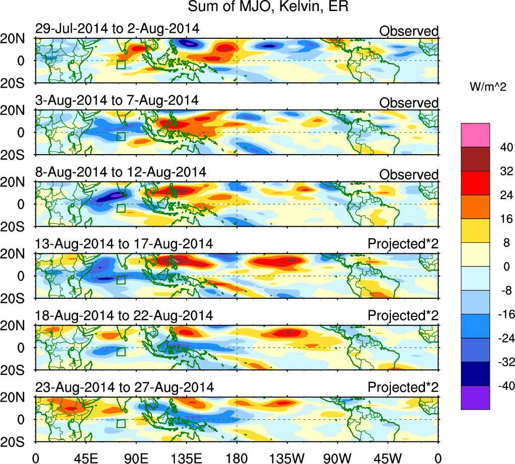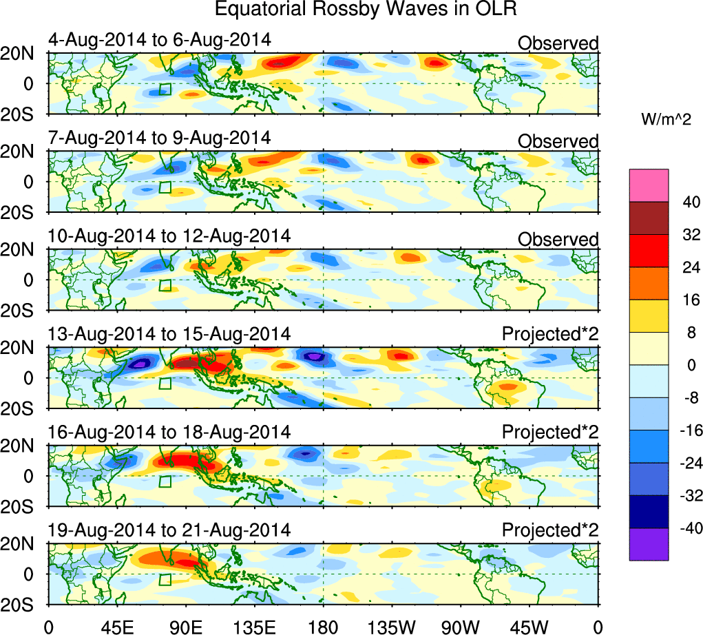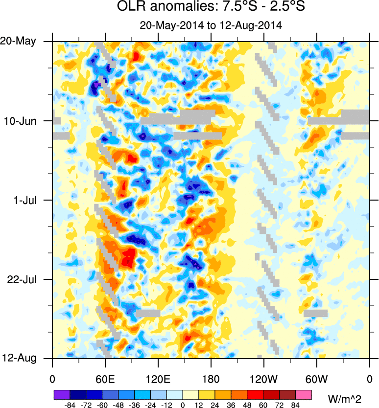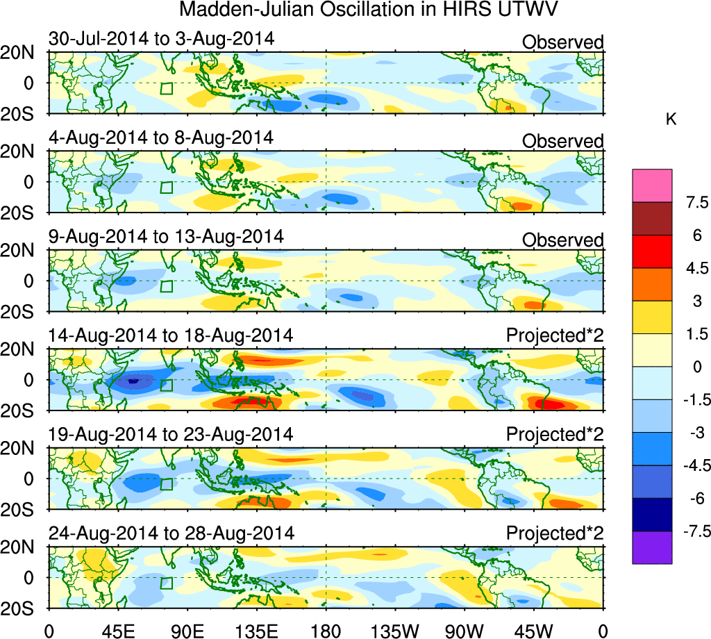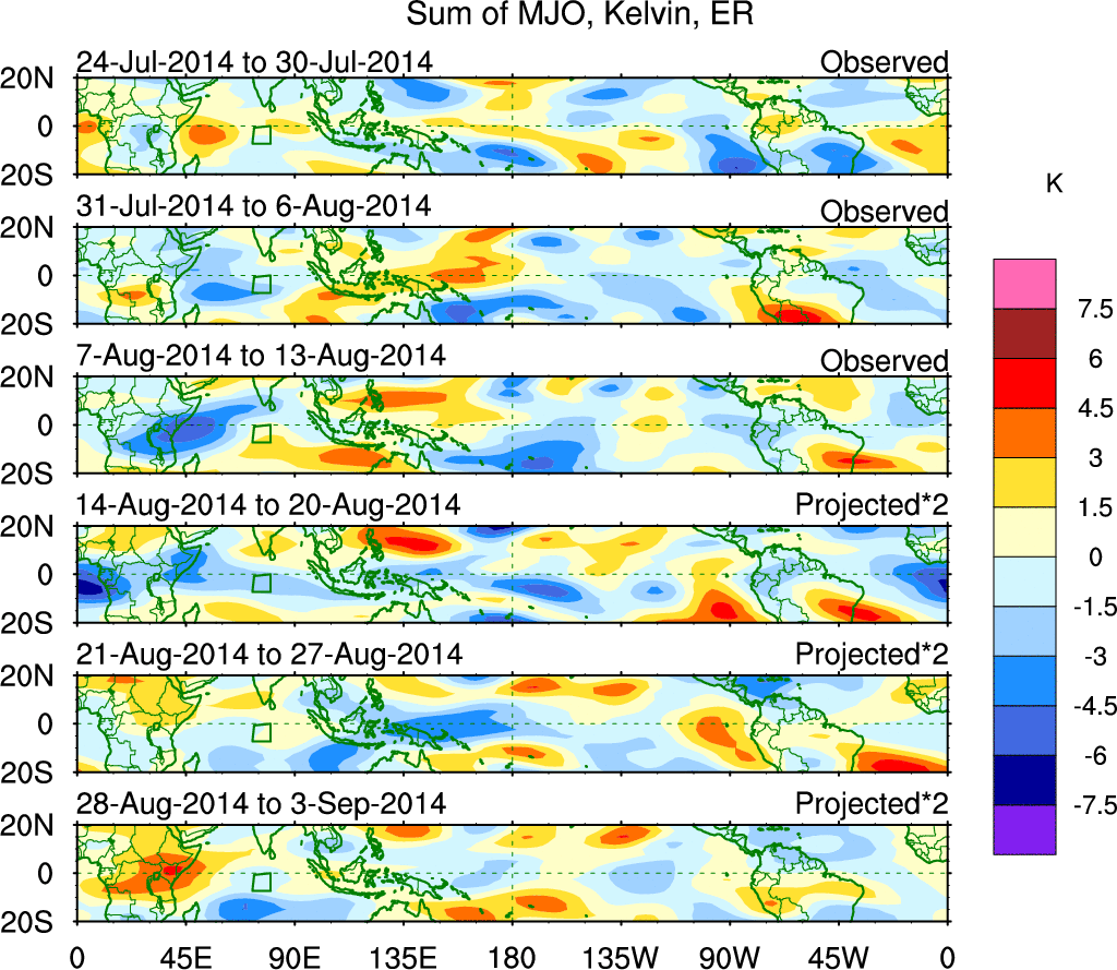 To identify tropical waves in near real-time, the OLR and UTWV data are filtered following Wheeler & Weickmann (2001 MWR). The daily anomalies are calculated using the first 3 harmonics of the seasonal cycle for 1979–2009. Missing values are then filled using linear interpolation in space and time. The most recent 365 days of anomalies are padded with 659 days of zeroes, and the result is filtered for each wave type.