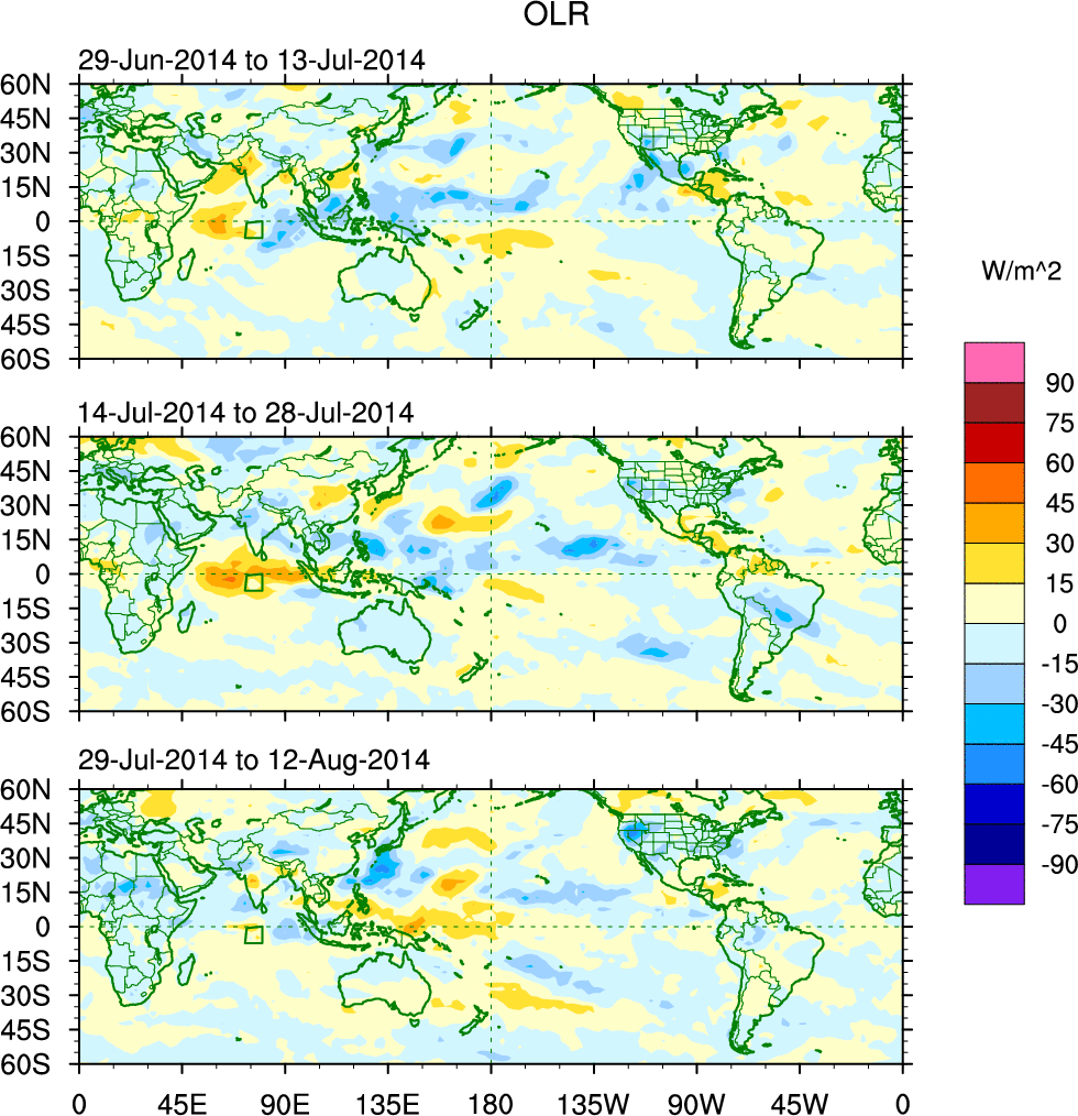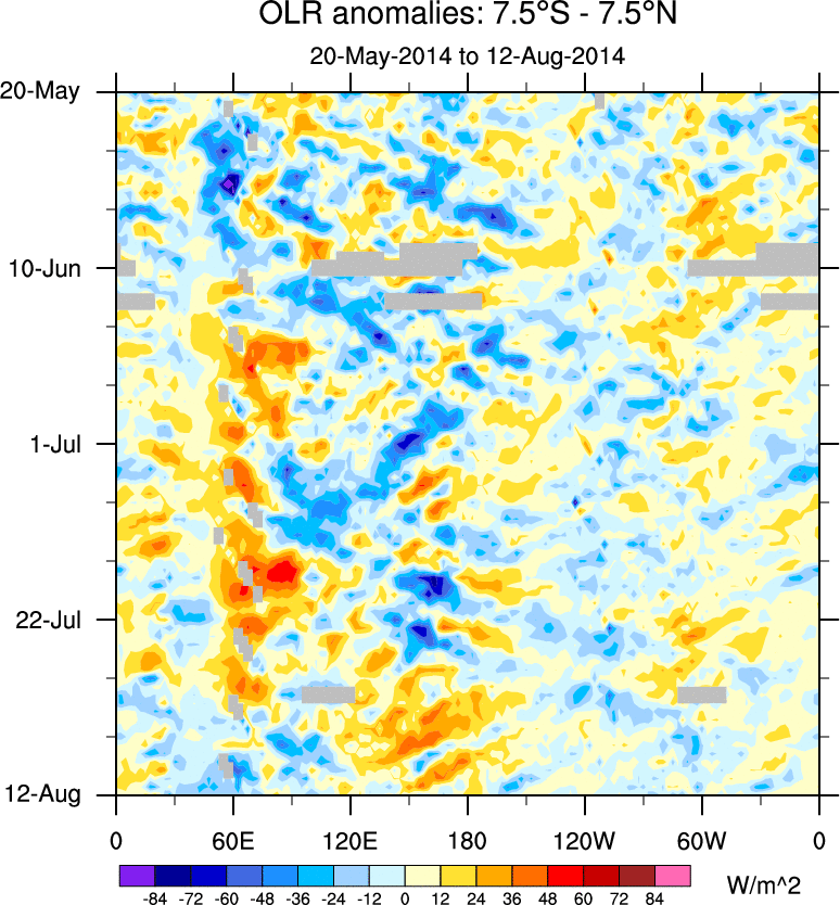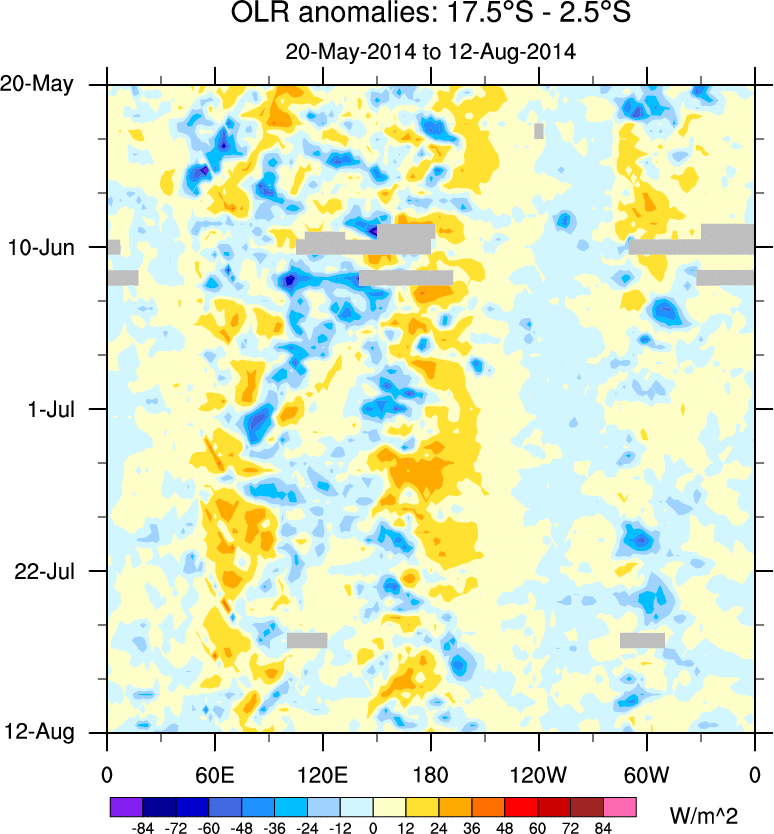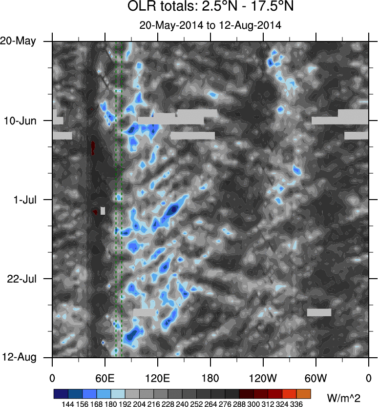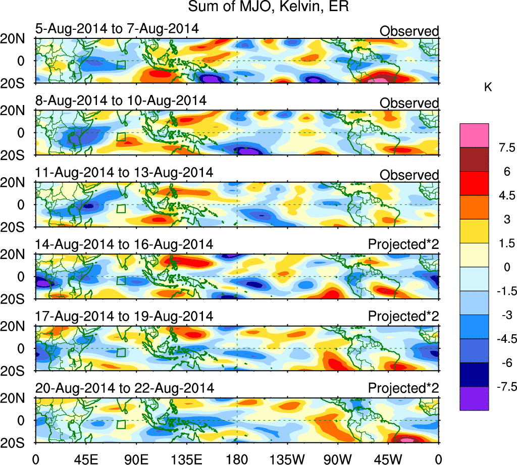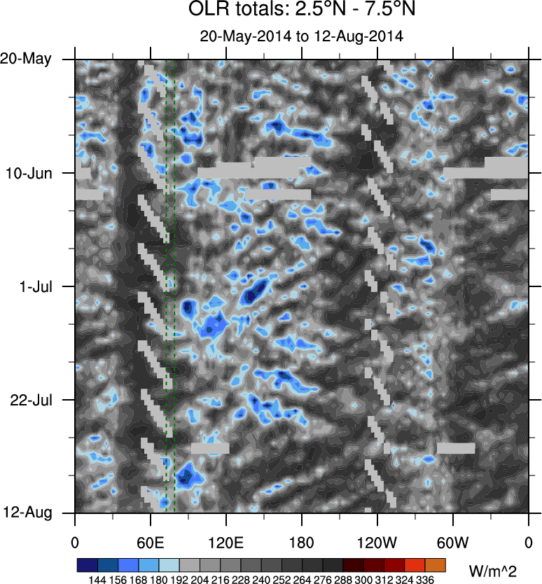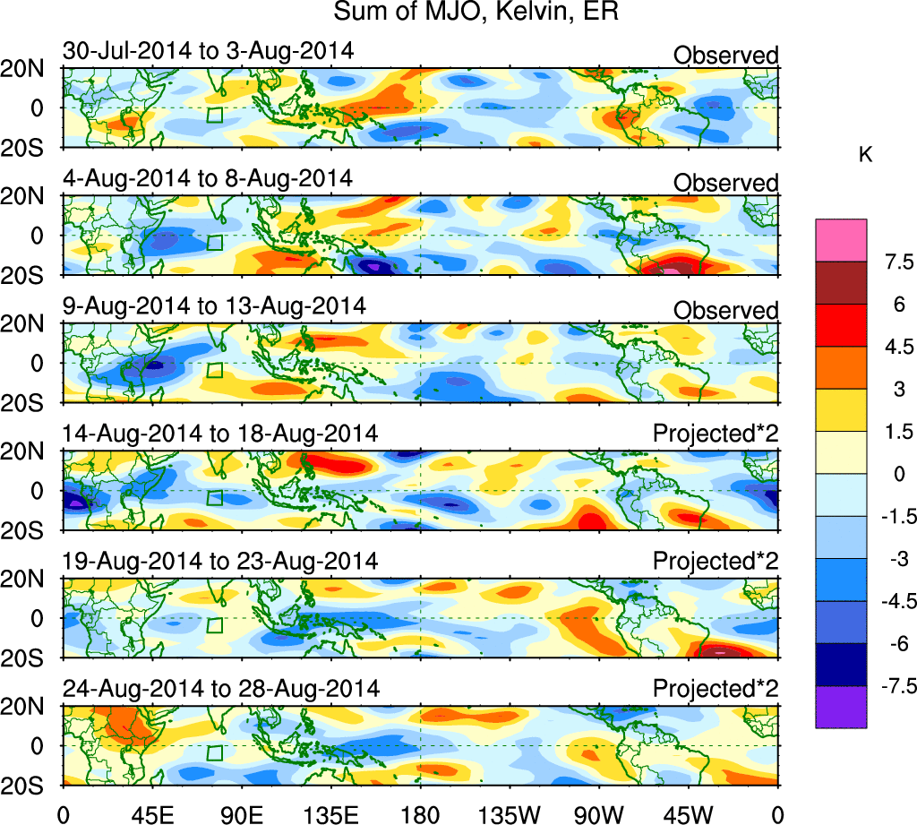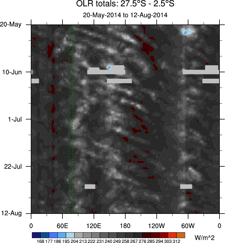 To identify tropical waves in near real-time, the OLR and UTWV data are filtered following Wheeler & Weickmann (2001 MWR). The daily anomalies are calculated using the first 3 harmonics of the seasonal cycle for 1979–2009. Missing values are then filled using linear interpolation in space and time. The most recent 365 days of anomalies are padded with 659 days of zeroes, and the result is filtered for each wave type.