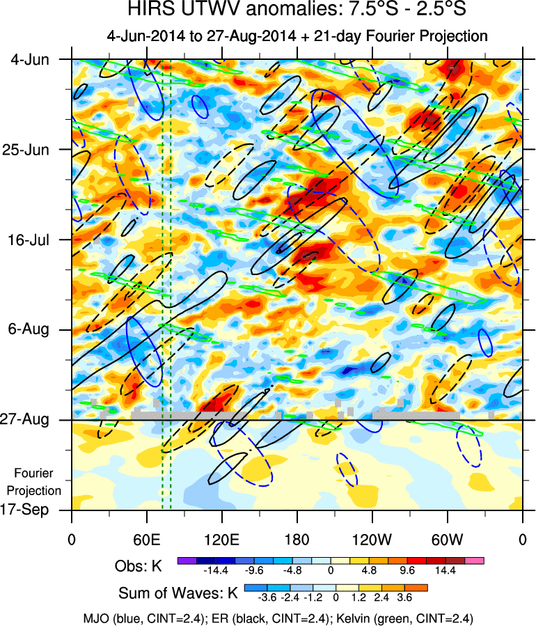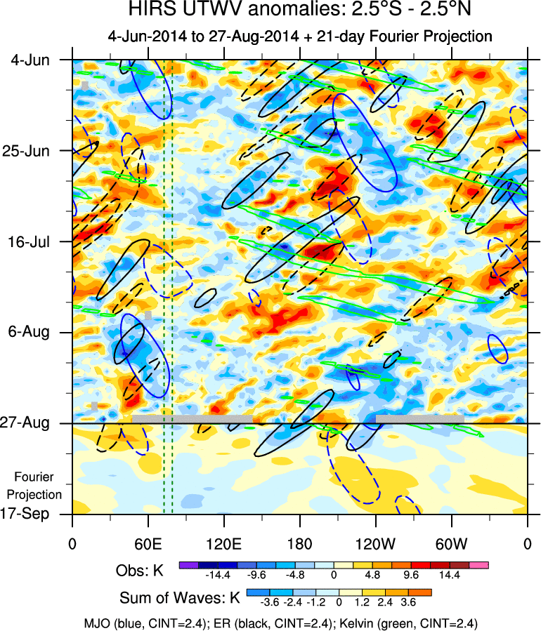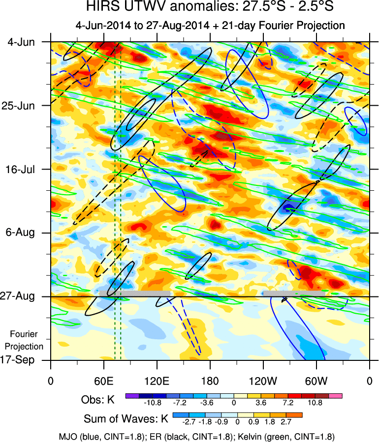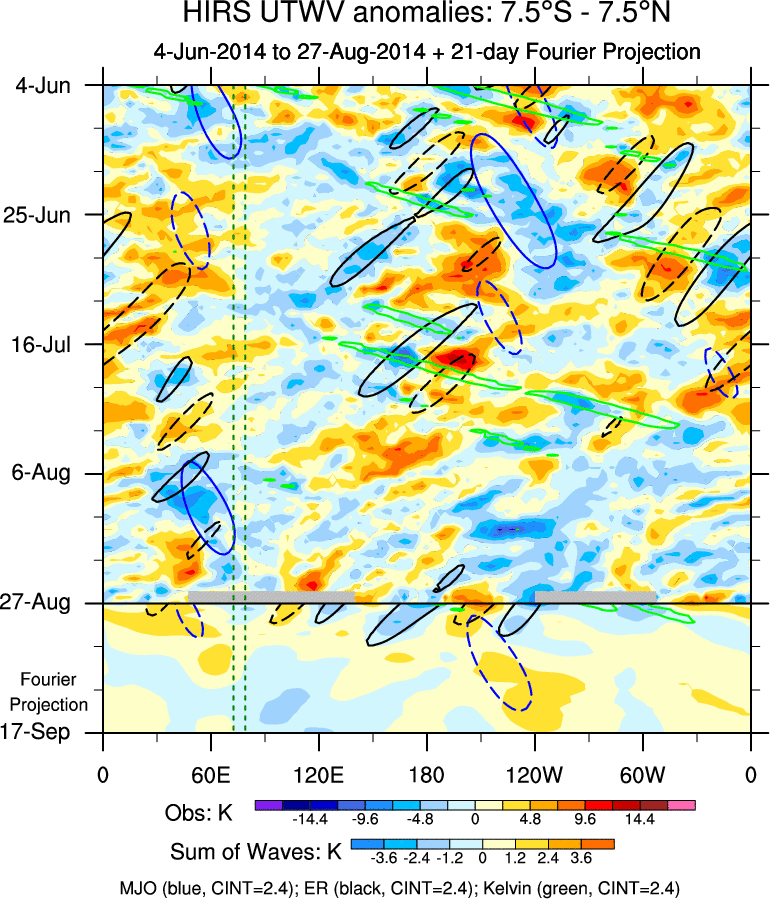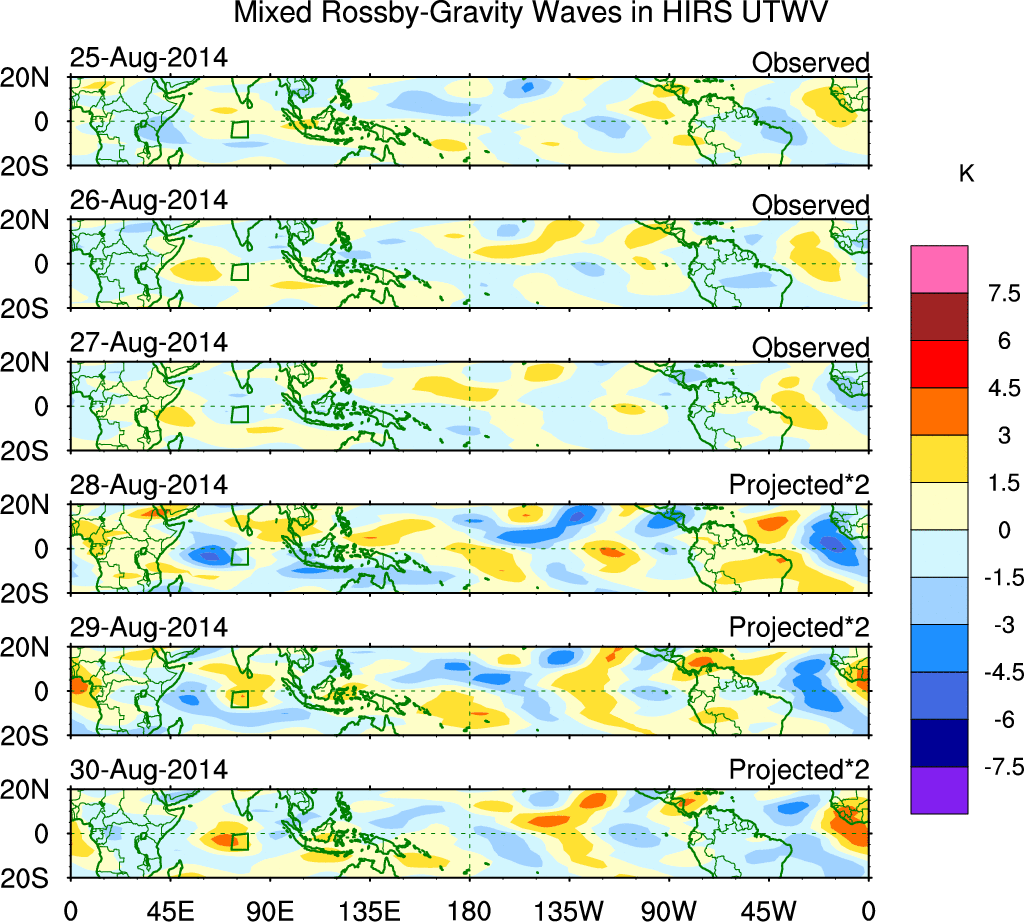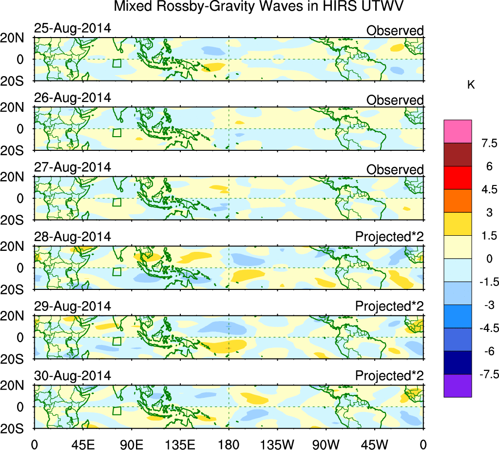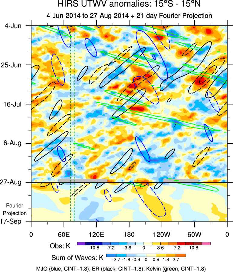 To identify tropical waves in near real-time, the OLR and UTWV data are filtered following Wheeler & Weickmann (2001 MWR). The daily anomalies are calculated using the first 3 harmonics of the seasonal cycle for 1979–2009. Missing values are then filled using linear interpolation in space and time. The most recent 365 days of anomalies are padded with 659 days of zeroes, and the result is filtered for each wave type.