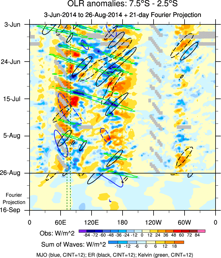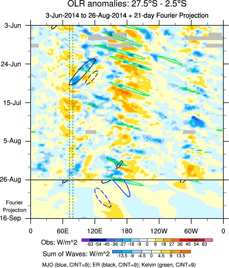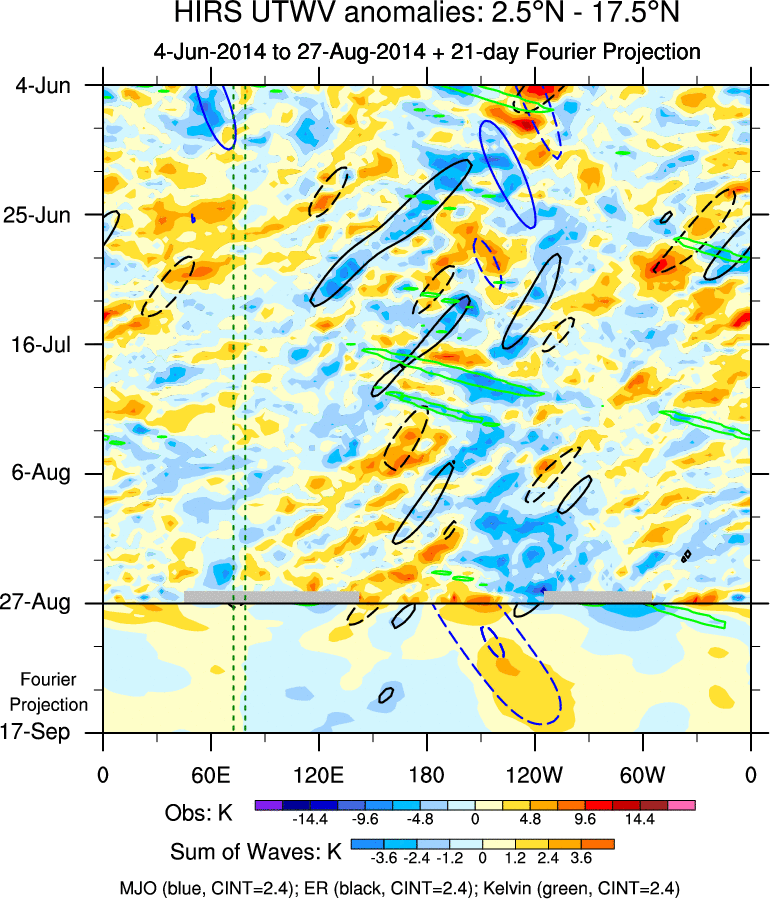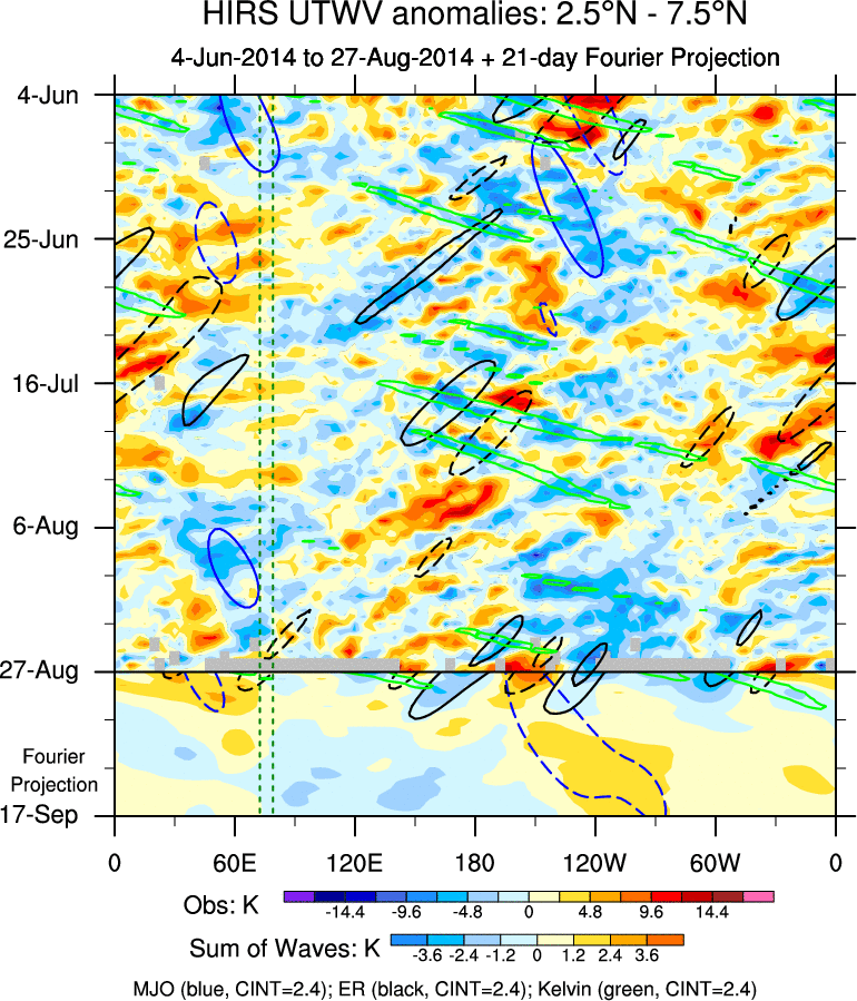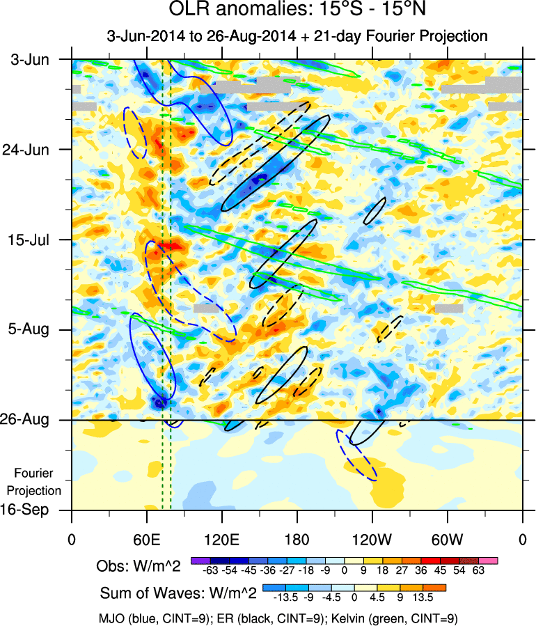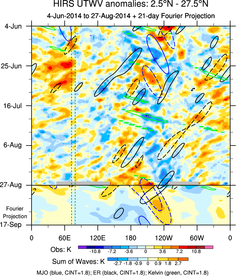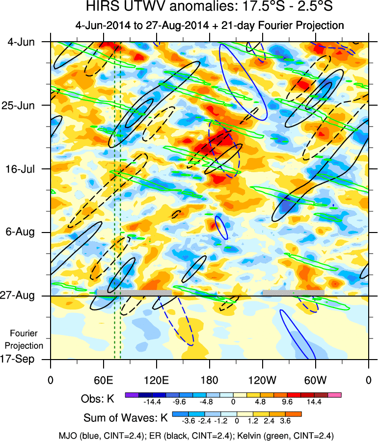To identify tropical waves in near real-time, the OLR and UTWV data are filtered following Wheeler & Weickmann (2001 MWR). The daily anomalies are calculated using the first 3 harmonics of the seasonal cycle for 1979–2009. Missing values are then filled using linear interpolation in space and time. The most recent 365 days of anomalies are padded with 659 days of zeroes, and the result is filtered for each wave type.