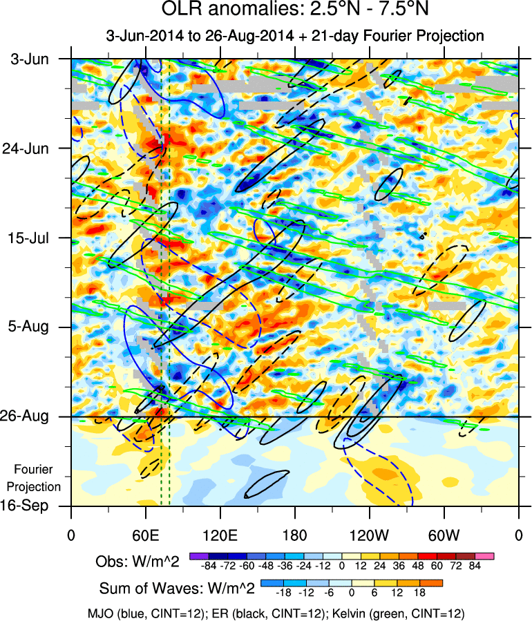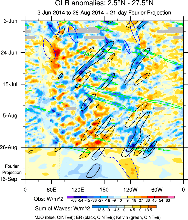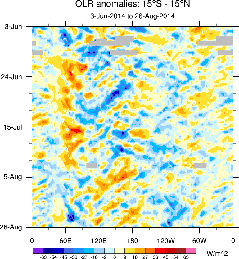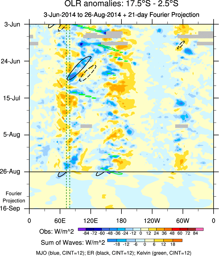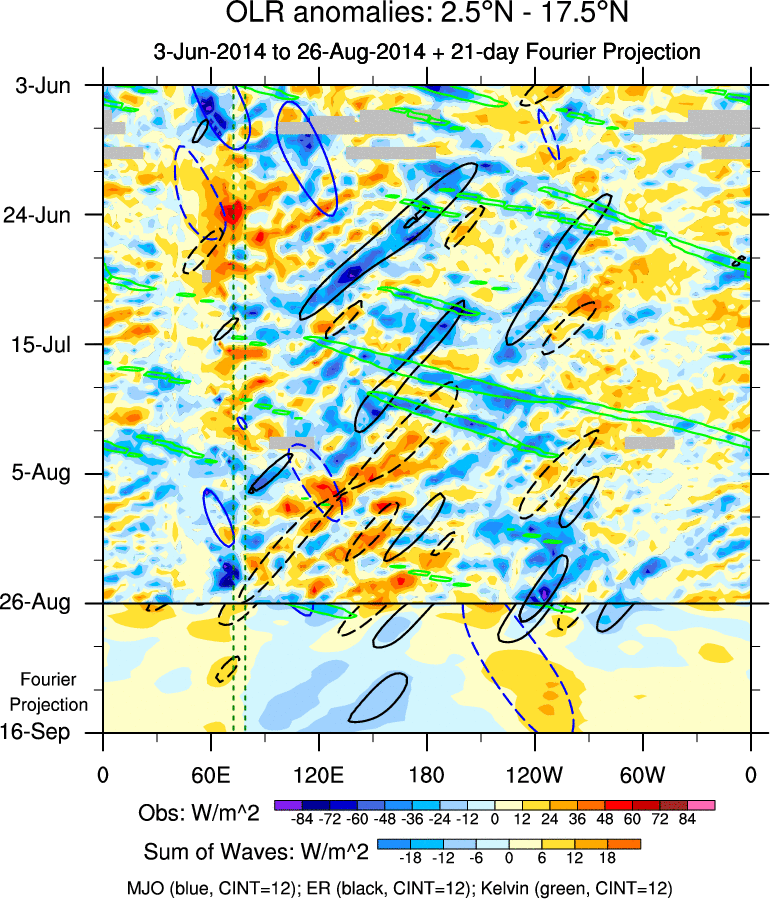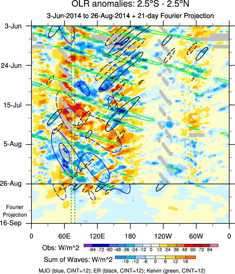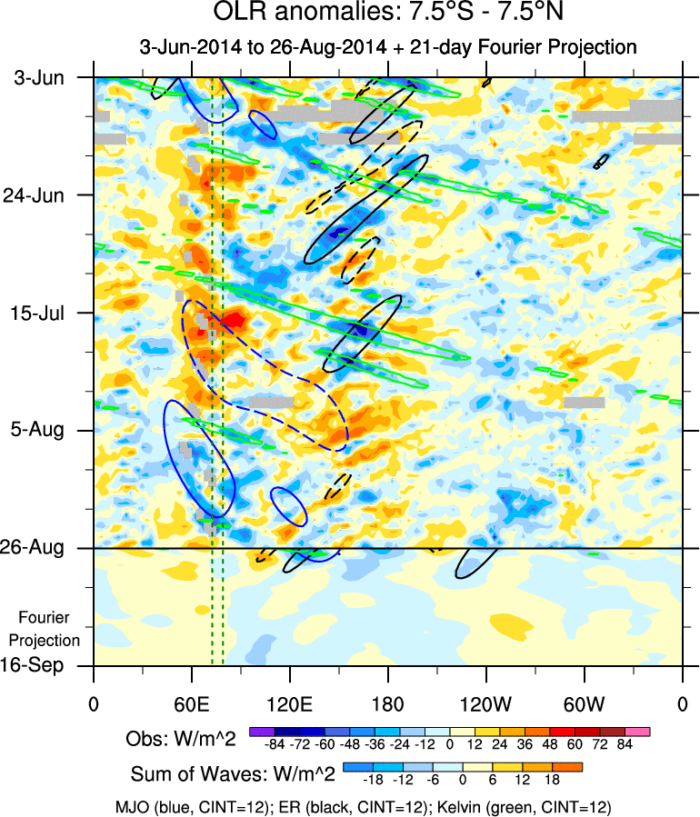 To identify tropical waves in near real-time, the OLR and UTWV data are filtered following Wheeler & Weickmann (2001 MWR). The daily anomalies are calculated using the first 3 harmonics of the seasonal cycle for 1979–2009. Missing values are then filled using linear interpolation in space and time. The most recent 365 days of anomalies are padded with 659 days of zeroes, and the result is filtered for each wave type.