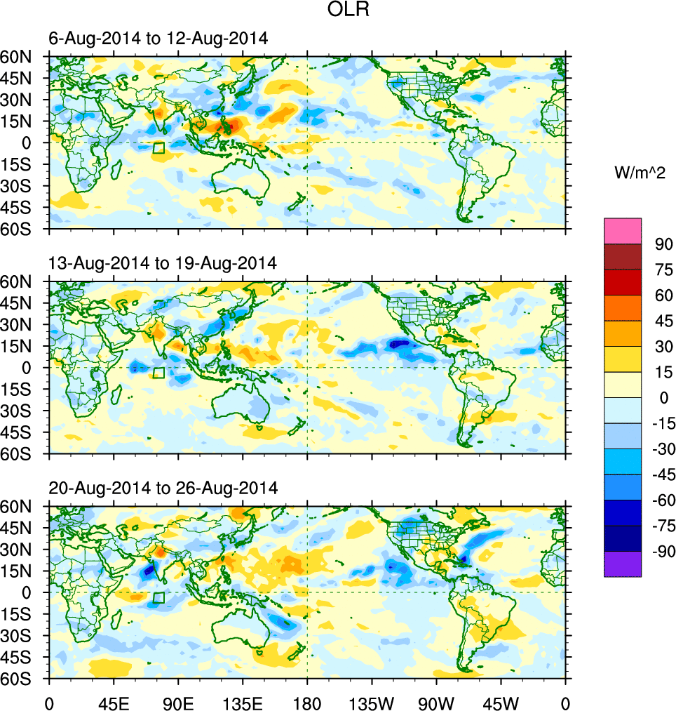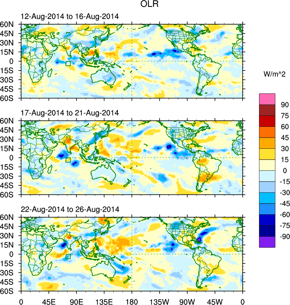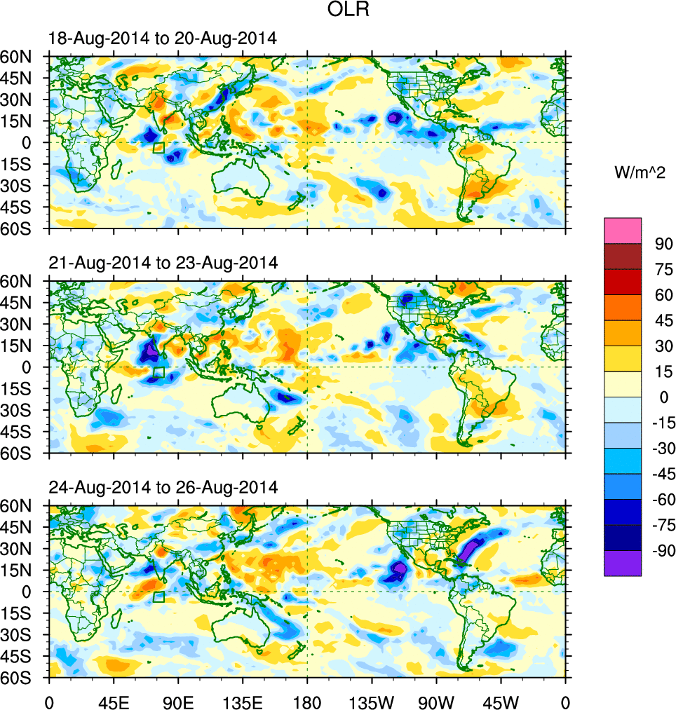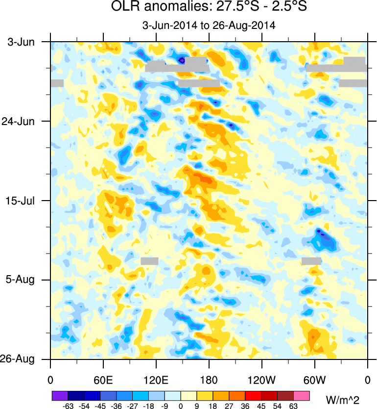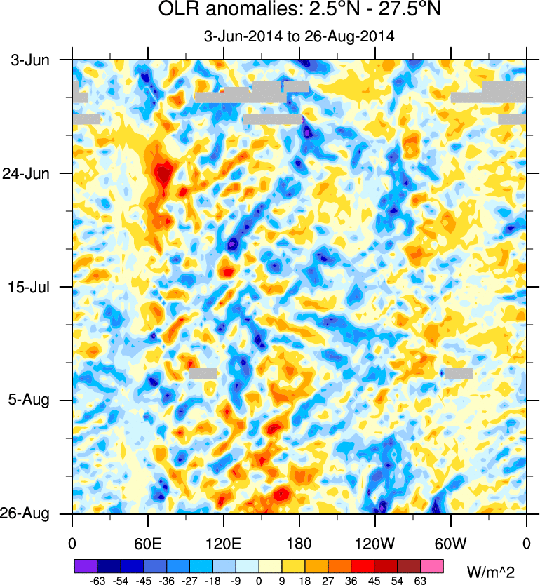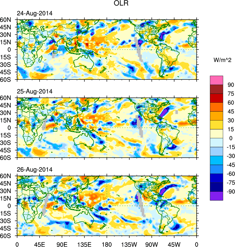 To identify tropical waves in near real-time, the OLR and UTWV data are filtered following Wheeler & Weickmann (2001 MWR). The daily anomalies are calculated using the first 3 harmonics of the seasonal cycle for 1979–2009. Missing values are then filled using linear interpolation in space and time. The most recent 365 days of anomalies are padded with 659 days of zeroes, and the result is filtered for each wave type.
