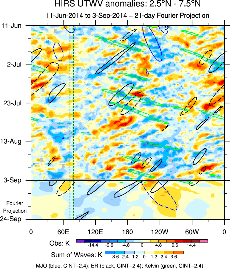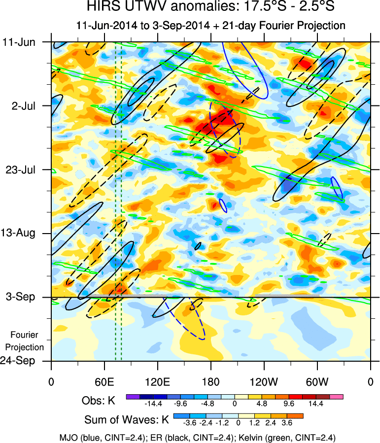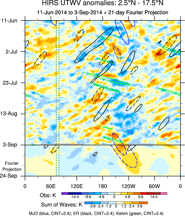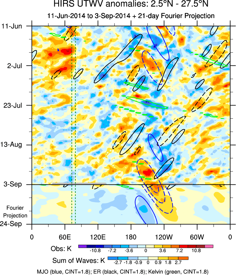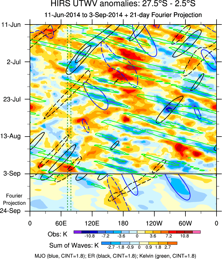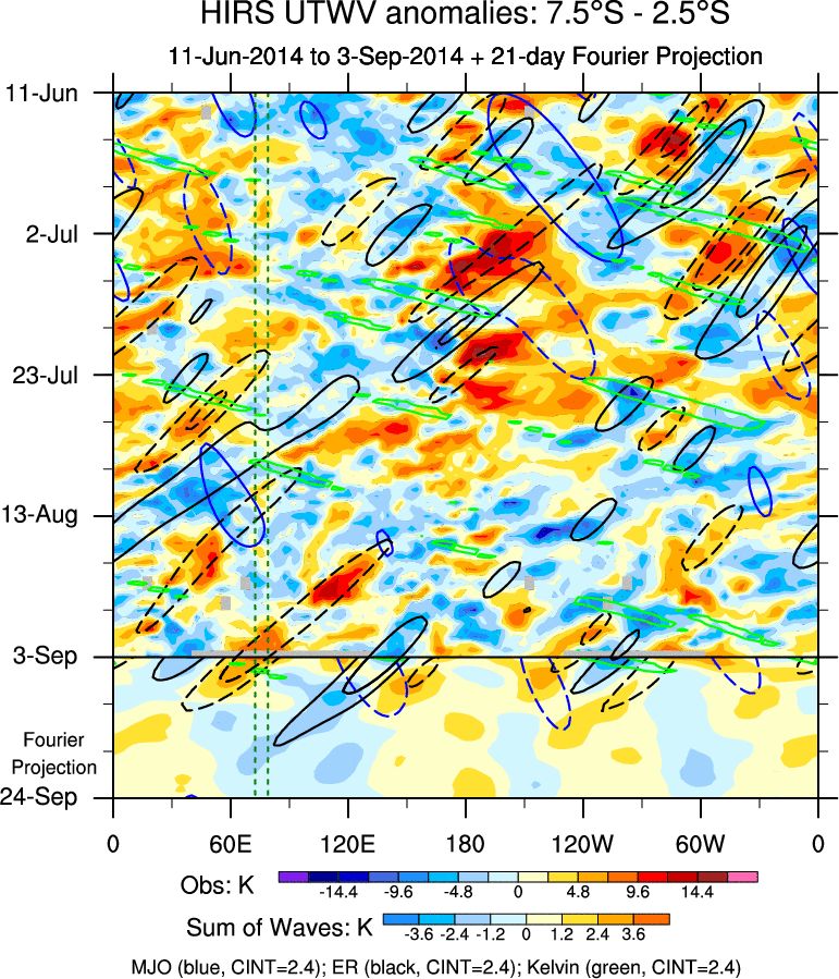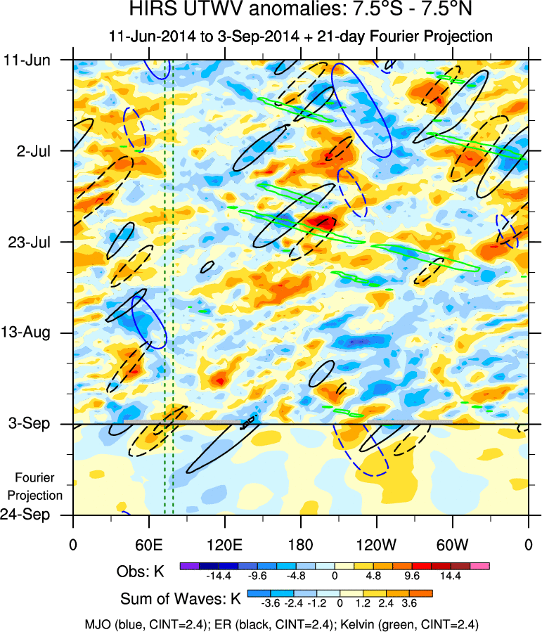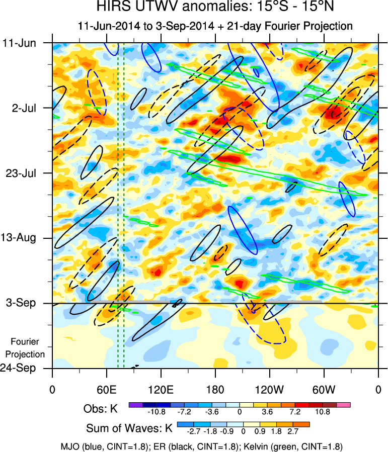 To identify tropical waves in near real-time, the OLR and UTWV data are filtered following Wheeler & Weickmann (2001 MWR). The daily anomalies are calculated using the first 3 harmonics of the seasonal cycle for 1979–2009. Missing values are then filled using linear interpolation in space and time. The most recent 365 days of anomalies are padded with 659 days of zeroes, and the result is filtered for each wave type.