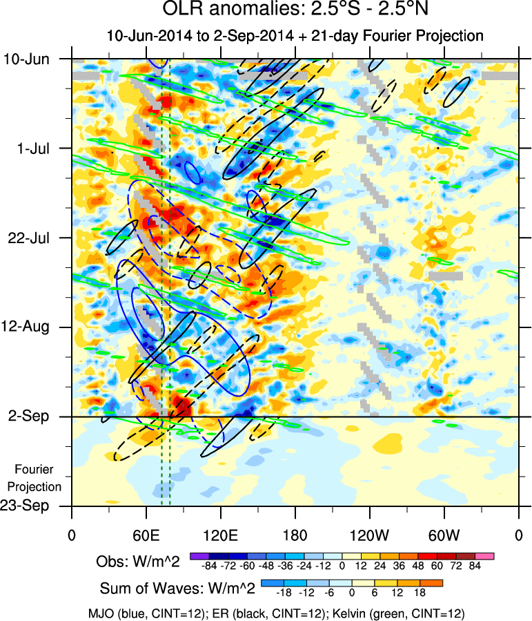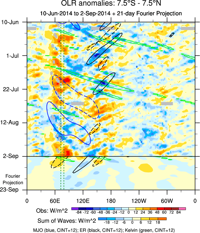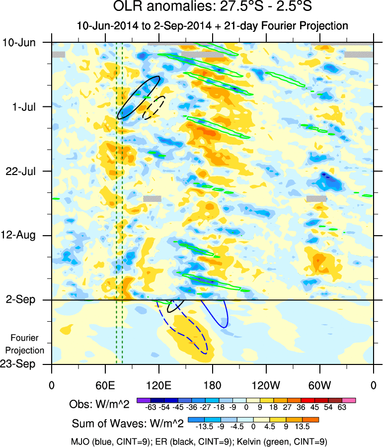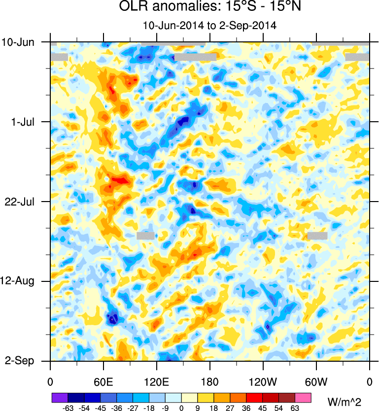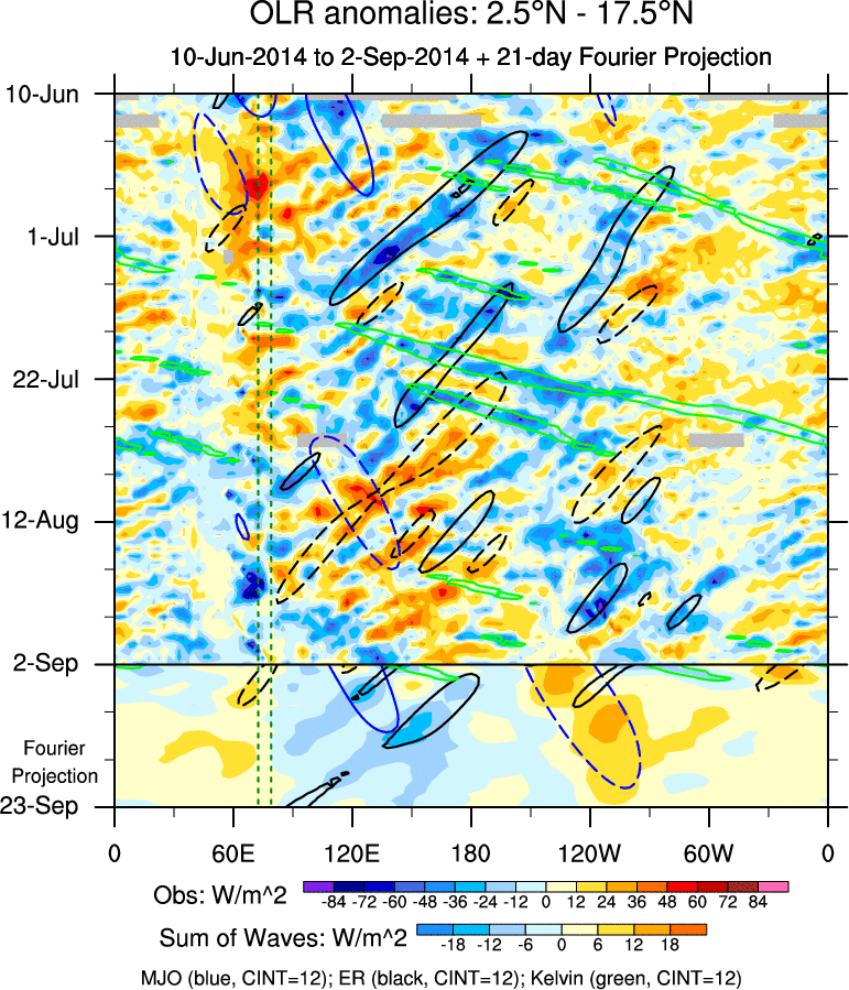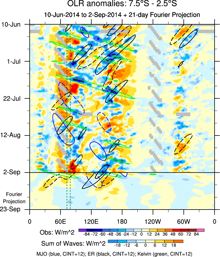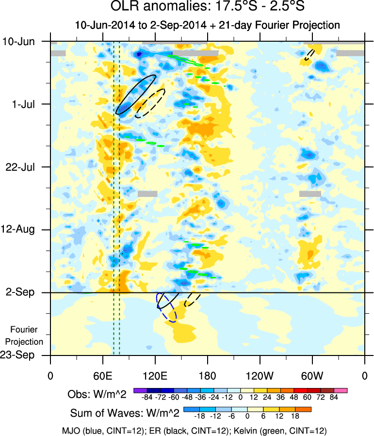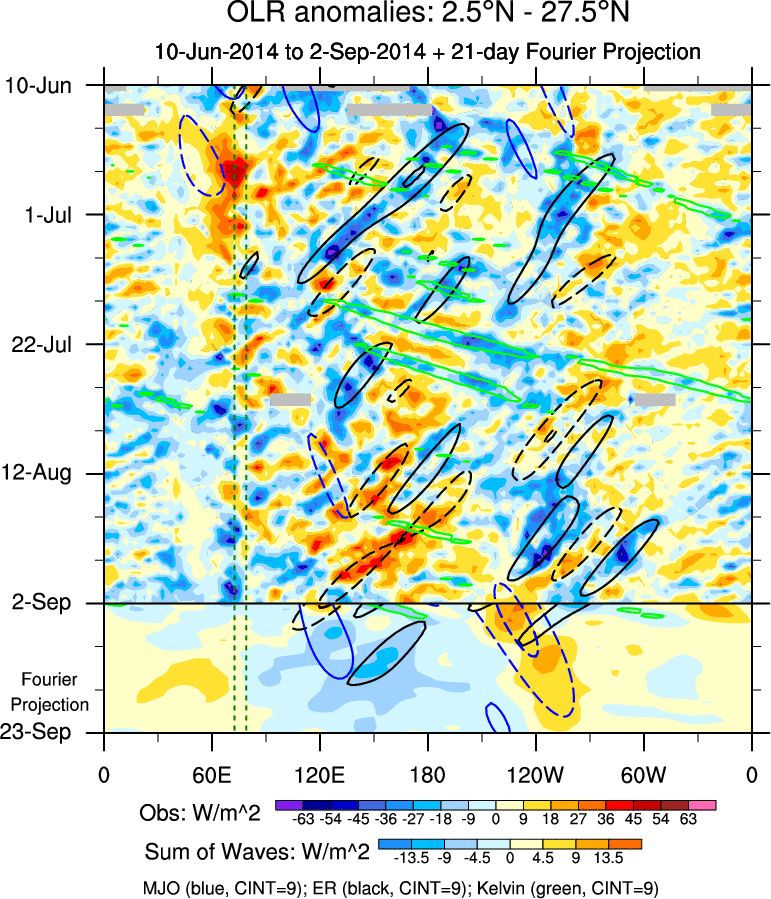 To identify tropical waves in near real-time, the OLR and UTWV data are filtered following Wheeler & Weickmann (2001 MWR). The daily anomalies are calculated using the first 3 harmonics of the seasonal cycle for 1979–2009. Missing values are then filled using linear interpolation in space and time. The most recent 365 days of anomalies are padded with 659 days of zeroes, and the result is filtered for each wave type.