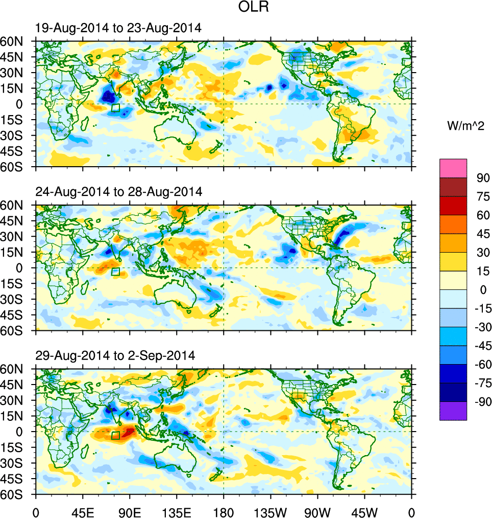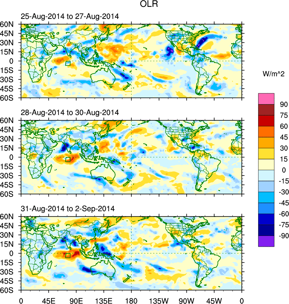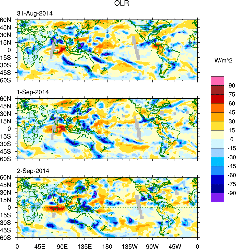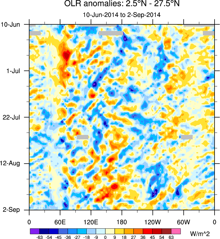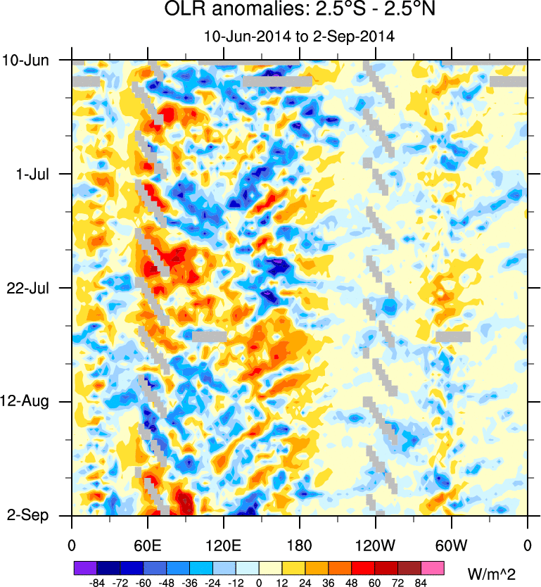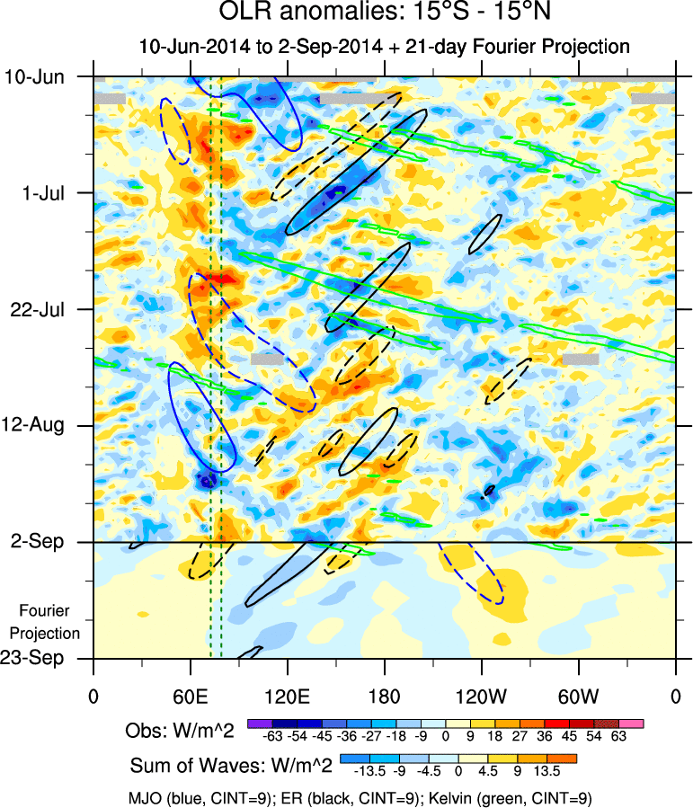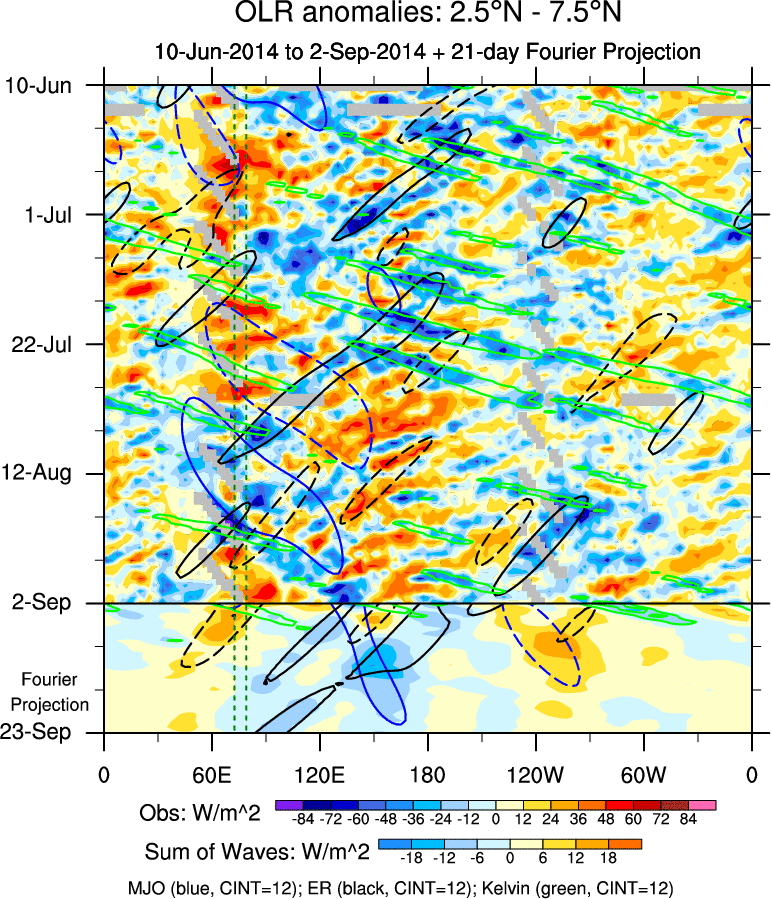 To identify tropical waves in near real-time, the OLR and UTWV data are filtered following Wheeler & Weickmann (2001 MWR). The daily anomalies are calculated using the first 3 harmonics of the seasonal cycle for 1979–2009. Missing values are then filled using linear interpolation in space and time. The most recent 365 days of anomalies are padded with 659 days of zeroes, and the result is filtered for each wave type.